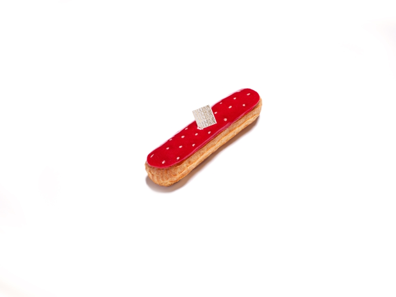 Sous une pâte d’amande incrustée de graines de sésame, la pâte à choux de cet éclair est garnie d’un crémeux de fraises de saison.