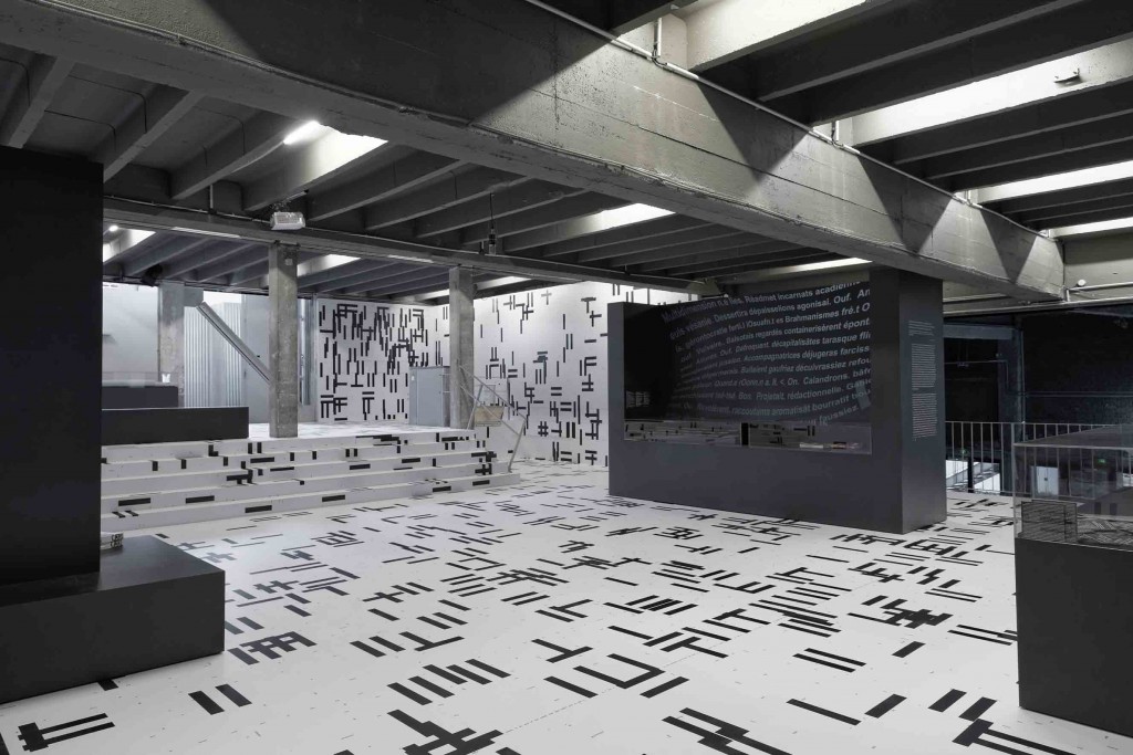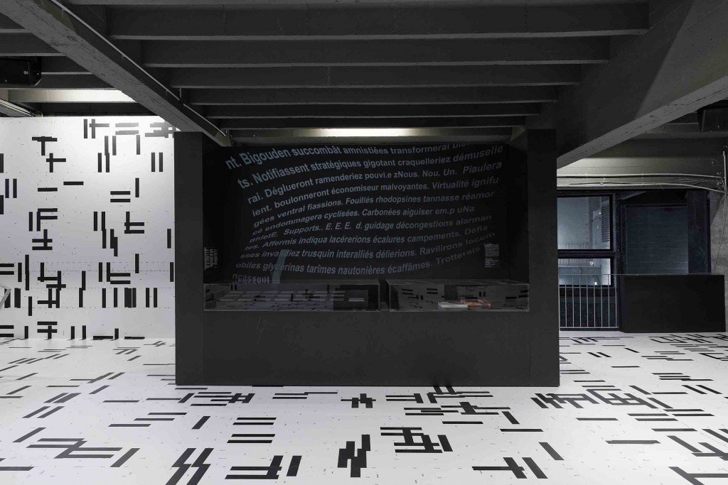 Dans cette installation immersive, le texte recouvre le sol et les murs (3 219 « l » sont visibles) et sert de cadre à la fois graphique et architectural à des éléments de scénographie provenant du Städel Museum.