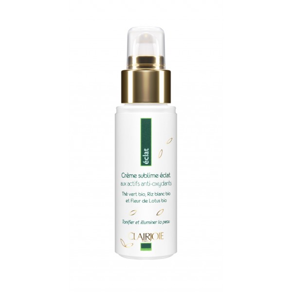 La nouvelle crème Sublime Eclat CLAIRJOIE concentre thé vert , riz blanc et lotus, un trio d’actifs antioxydants entièrement bio dans le but de protéger la peau, conservant éclat et jeunesse.