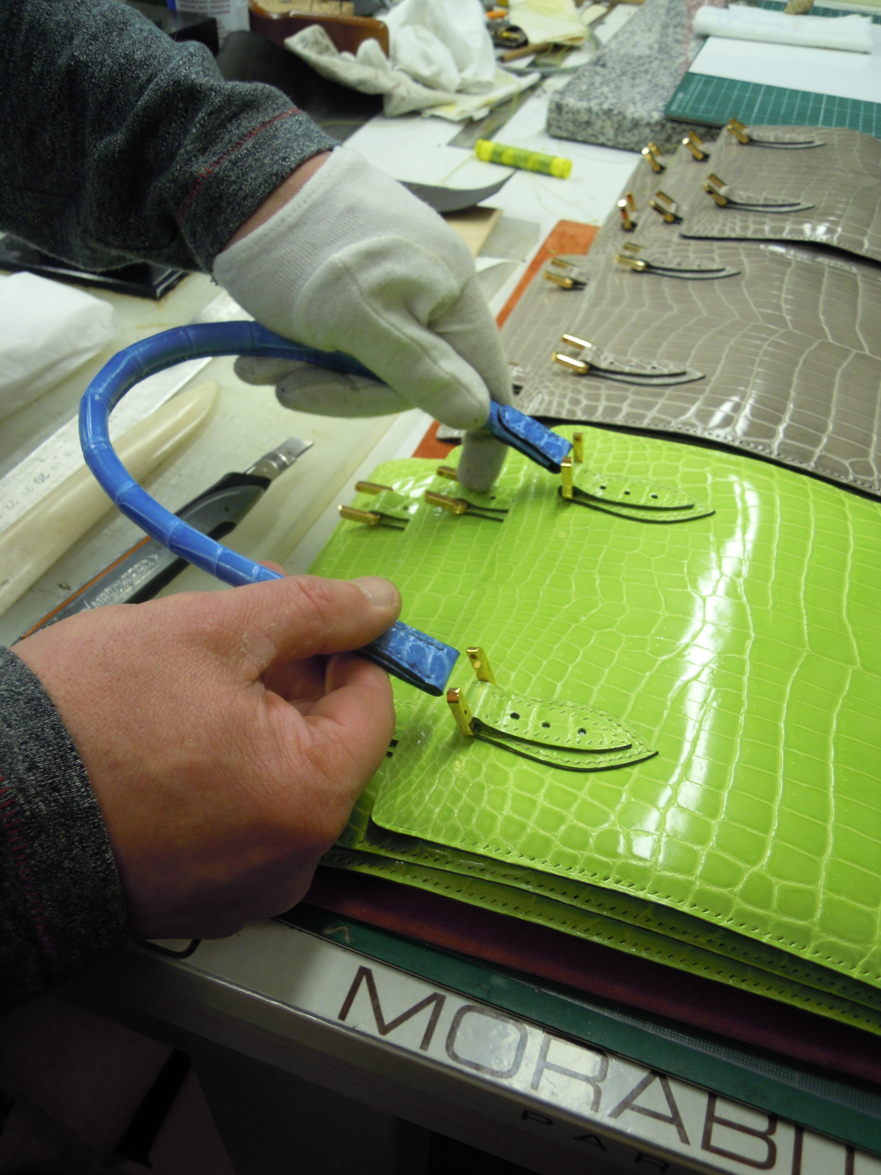 Dans les ateliers de Morabito Paris, Luxsure a pu découvrir les méthodes d’assemblage des sacs de la marque. Le cuir est entièrement coupé à la main selon les patrons disponibles pour chaque modèle. Les pièces sont ensuite cousues ensemble à la main, ce qui a pour effet de rendre chaque point indépendant. Ainsi, si l’un des points est coupé, les autres ne bougeront pas. Chaque sac est entièrement doublé de cuir ; cela représente 25 à 30 heures de travail !