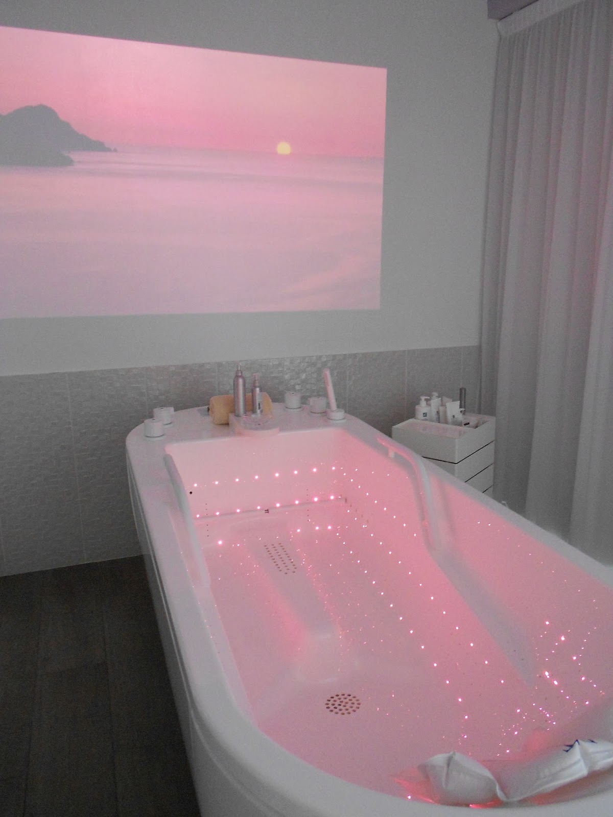 La baignoire peut changer à volonté d’ambiance colorée. Des actifs orientés vers la relaxation, la reminéralisation, l’amincissement etc.. peuvent être ajoutés dans l’eau de mer, décuplant l’efficience de celle-ci. Pour parfaire la détente, un écran est positionné face à la baignoire. Les clichés évoquant les abords du Château incitent à la sérénité. Un peu plus loin, une table de massage, un hammam privé, laissent présager d’agréables instants.. Un peu plus tard, l’enveloppement d’algue, toujours adapté à votre choix d’actifs spécifiques, encouragera la relaxation. Le Hammam privé l’optimisera.