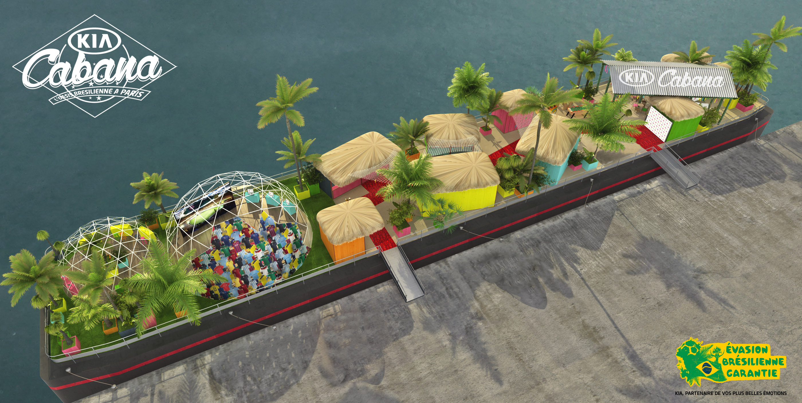 Kia, Partenaire Officiel de la Coupe du Monde au Brésil, crée un lieu éphémère unique à Paris : «Kia Cabana». Cette oasis brésilienne flottante, ouverte à tous, sera sans nul doute « LE » lieu festif incontournable pour vivre toute l’intensité de la Coupe du Monde la FIFA 2014 et ce qui fait, du Brésil, un pays riche en culture et en couleurs. Au programme du 12 juin au 13 juillet, football, musique, gastronomie, mode et culture se mêleront savamment pour tenir la promesse d’une Evasion Brésilienne Garantie, en plein cœur de la capitale !