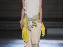 Parmi les matières utilisées on retrouve la soie, le lin, la viscose, le coton et le cuir d’agneau qui accentuent les mouvements du corps tandis que les bleus et les pastels de la collection rappellent les couleurs de Miami à la tombée du jour.