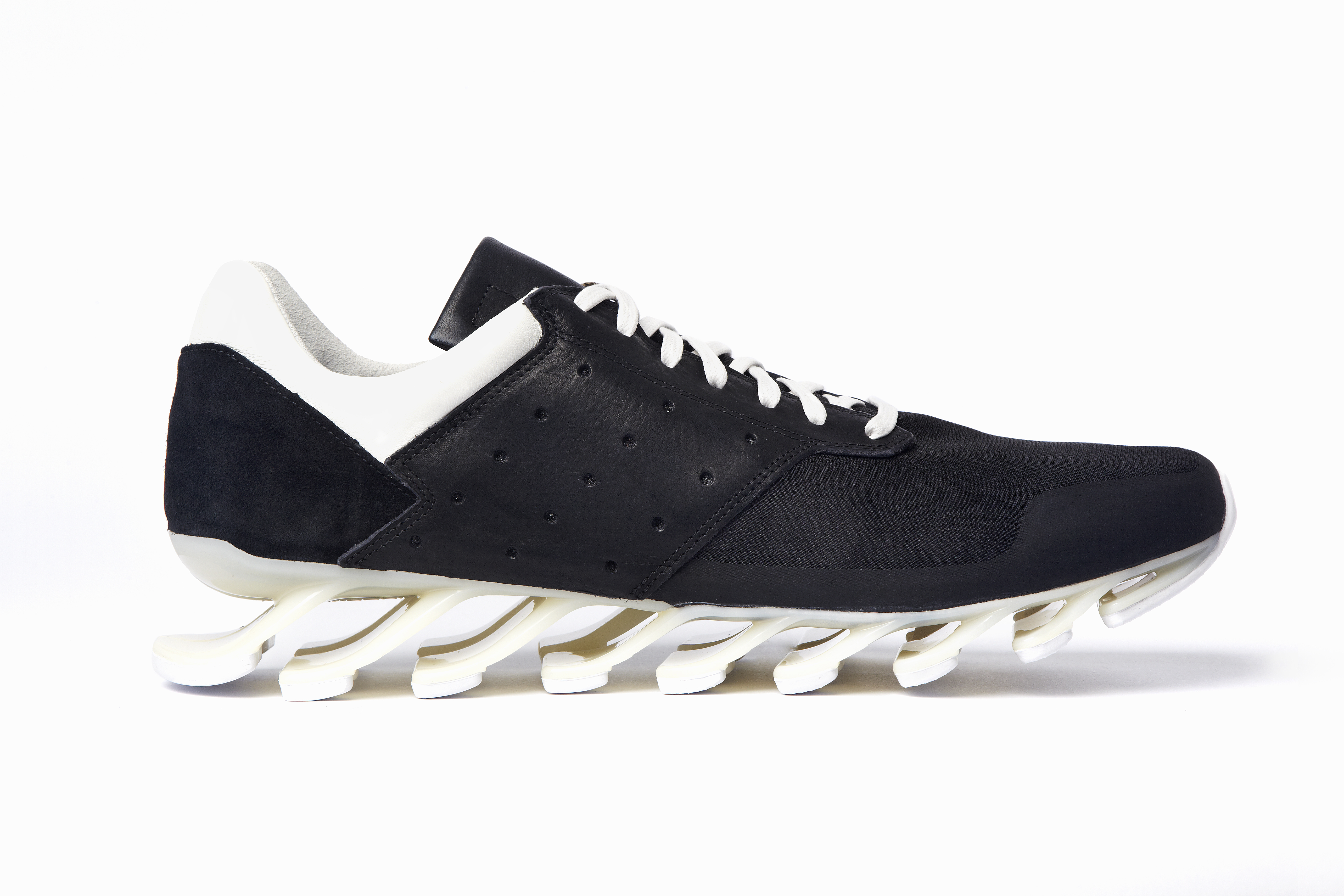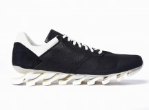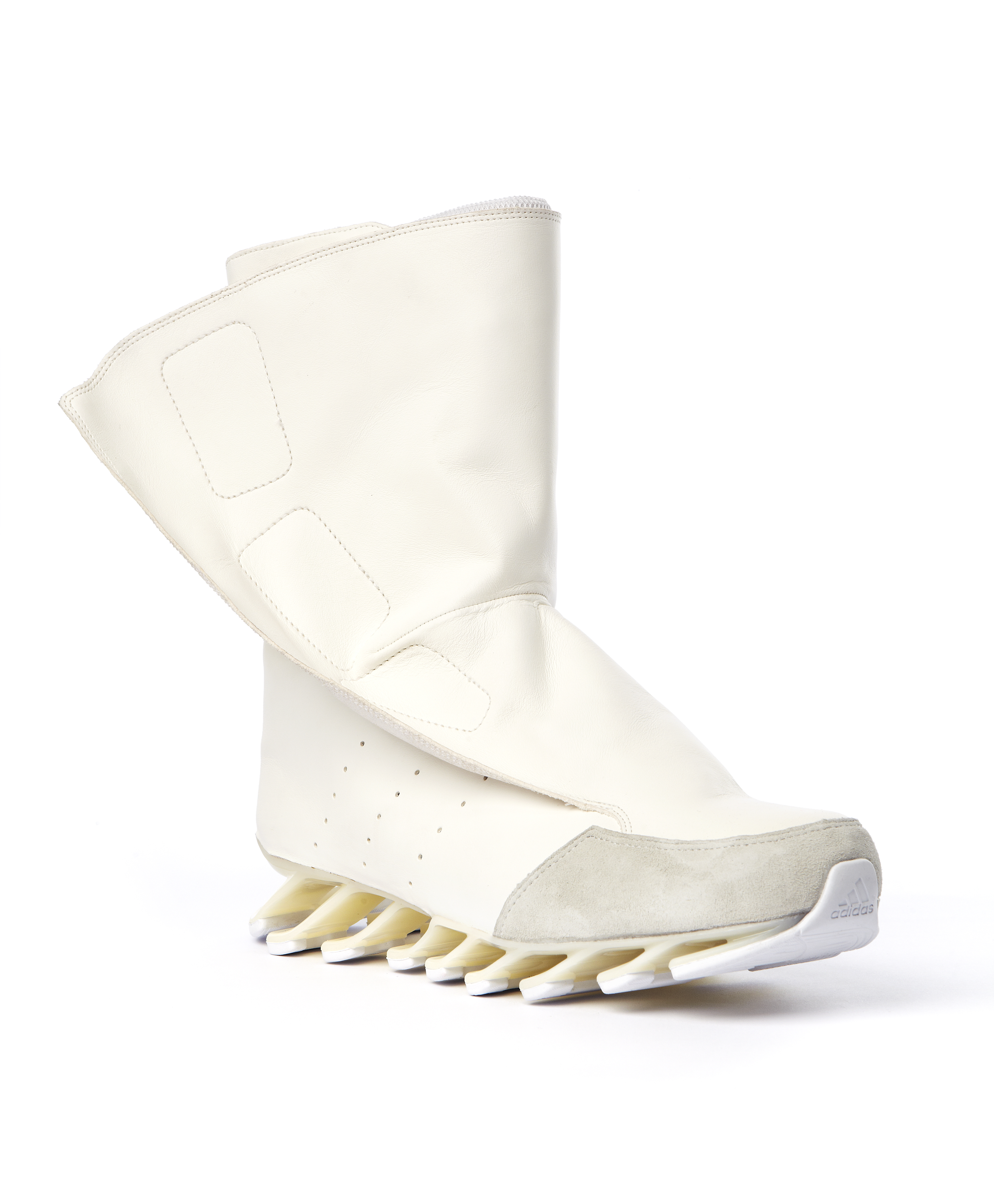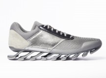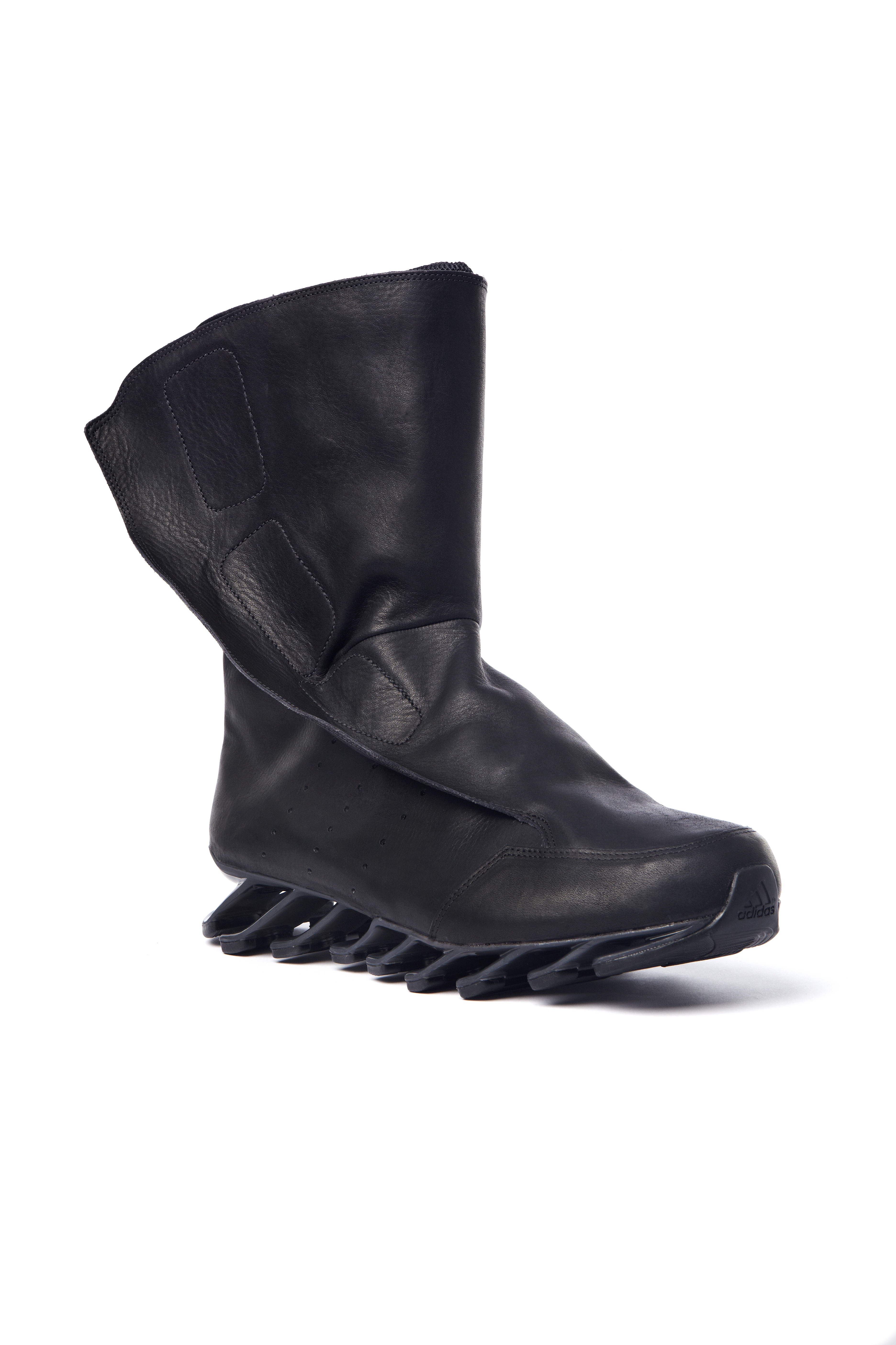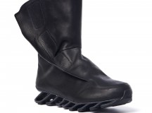 Pour cette nouvelle saison Rick Owens additionne l’identité forte et incomparable de ses designs avec le plus haut niveau d’innovation en utilisant la technologie Adidas Spring Blade. Le premier modèle, la « Blade High » a une silhouette de chaussures de boxe suppléée par l’innovante semelle, les lacets sont couvert par un rabat et les iconiques 3 bandes Adidas apparaissent sous forme de perforations. La « Blade Runner » adopte la forme et la construction d’une chaussette avec des détails sur les côtés accentuant l’esthétique running de la silhouette.