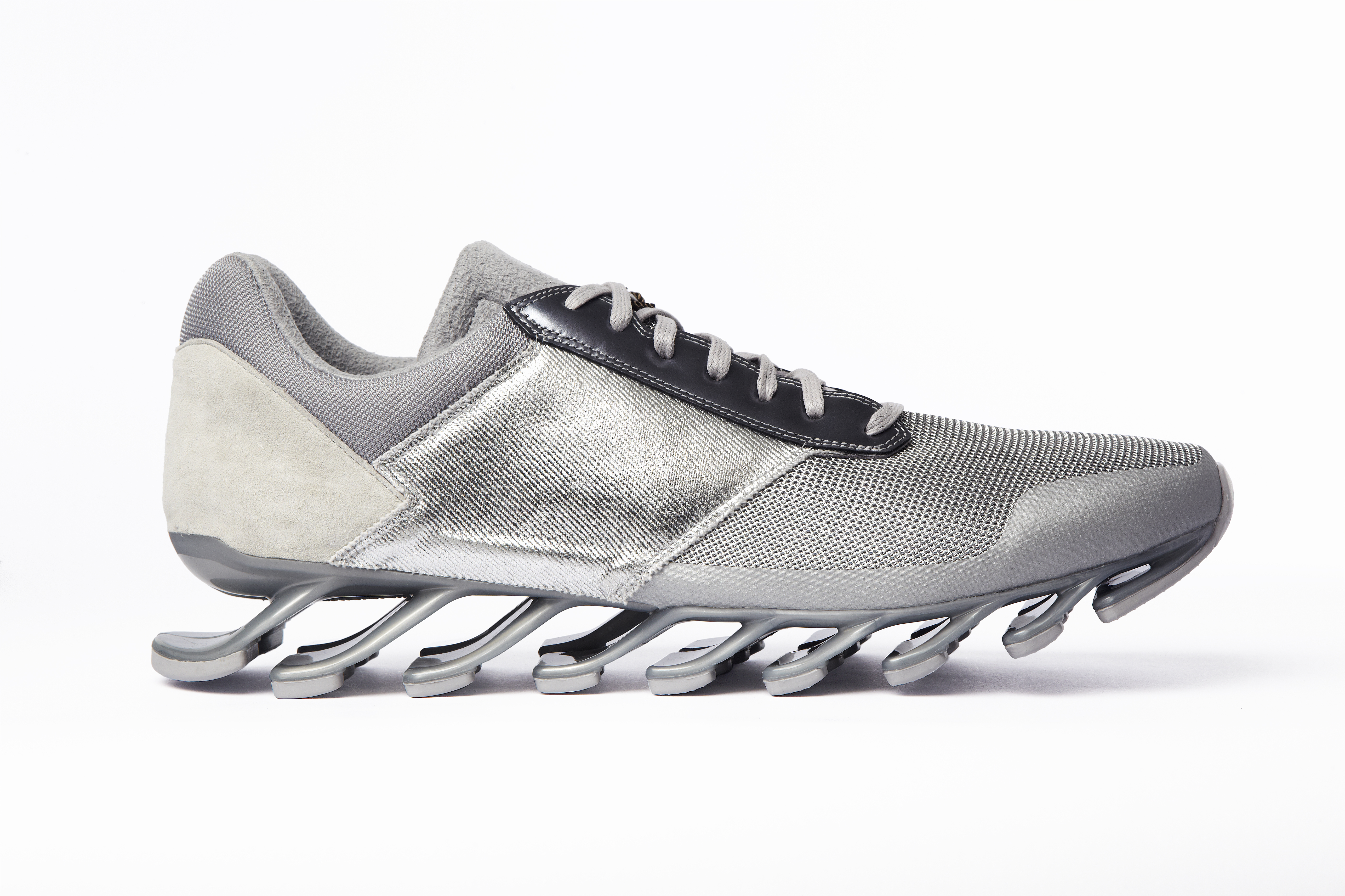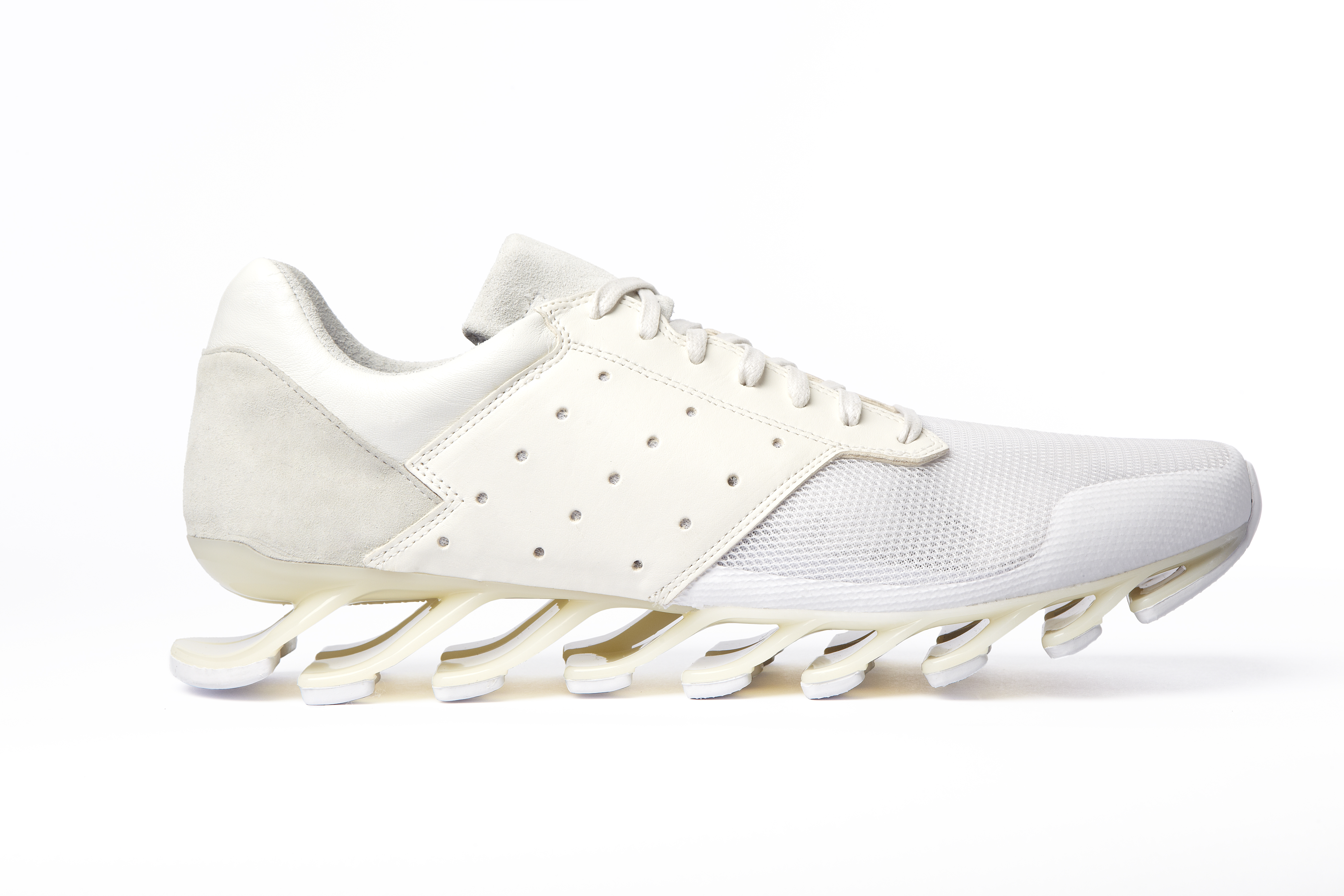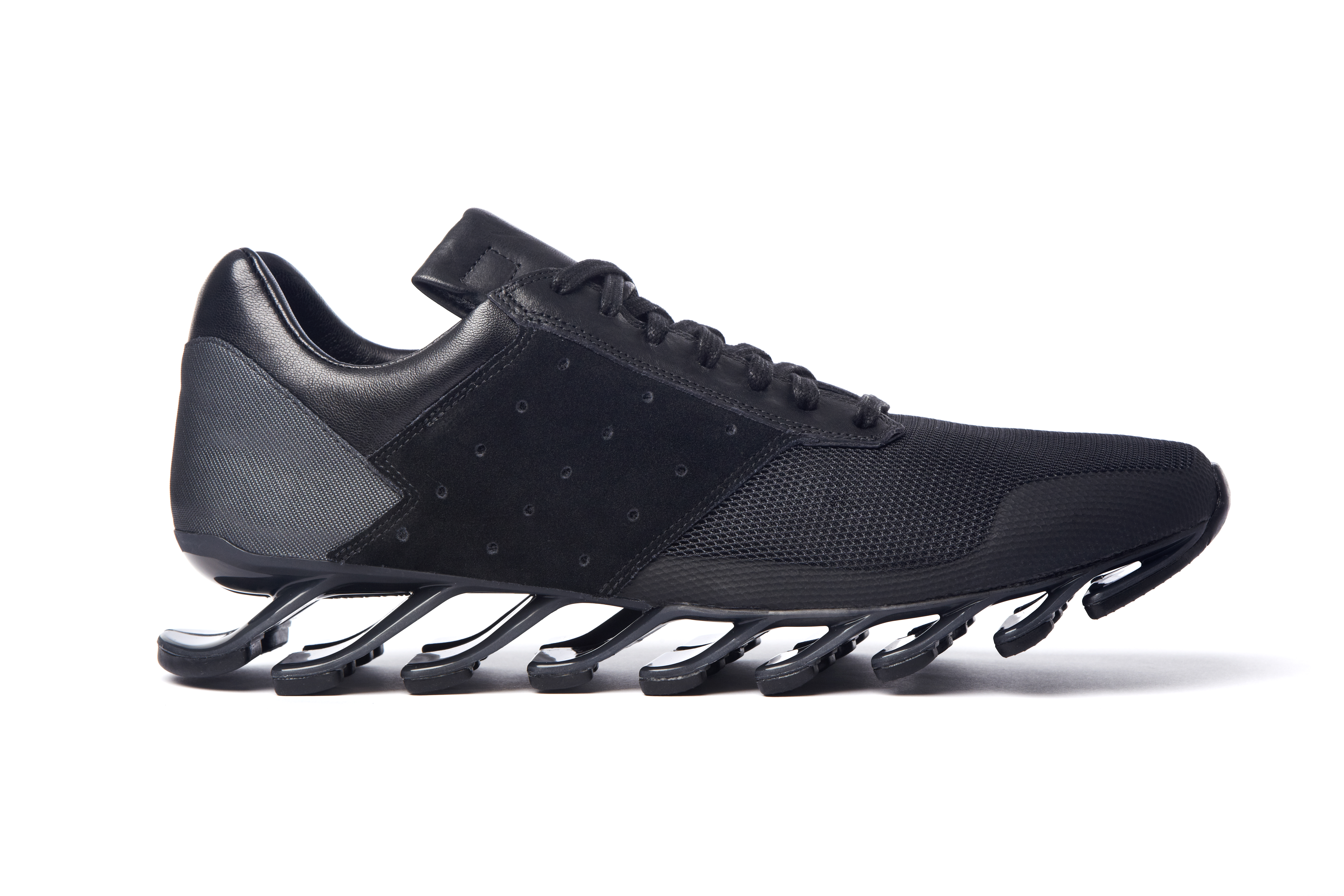 Pour cette nouvelle saison Rick Owens additionne l’identité forte et incomparable de ses designs avec le plus haut niveau d’innovation en utilisant la technologie Adidas Spring Blade. Le premier modèle, la « Blade High » a une silhouette de chaussures de boxe suppléée par l’innovante semelle, les lacets sont couvert par un rabat et les iconiques 3 bandes Adidas apparaissent sous forme de perforations. La « Blade Runner » adopte la forme et la construction d’une chaussette avec des détails sur les côtés accentuant l’esthétique running de la silhouette.