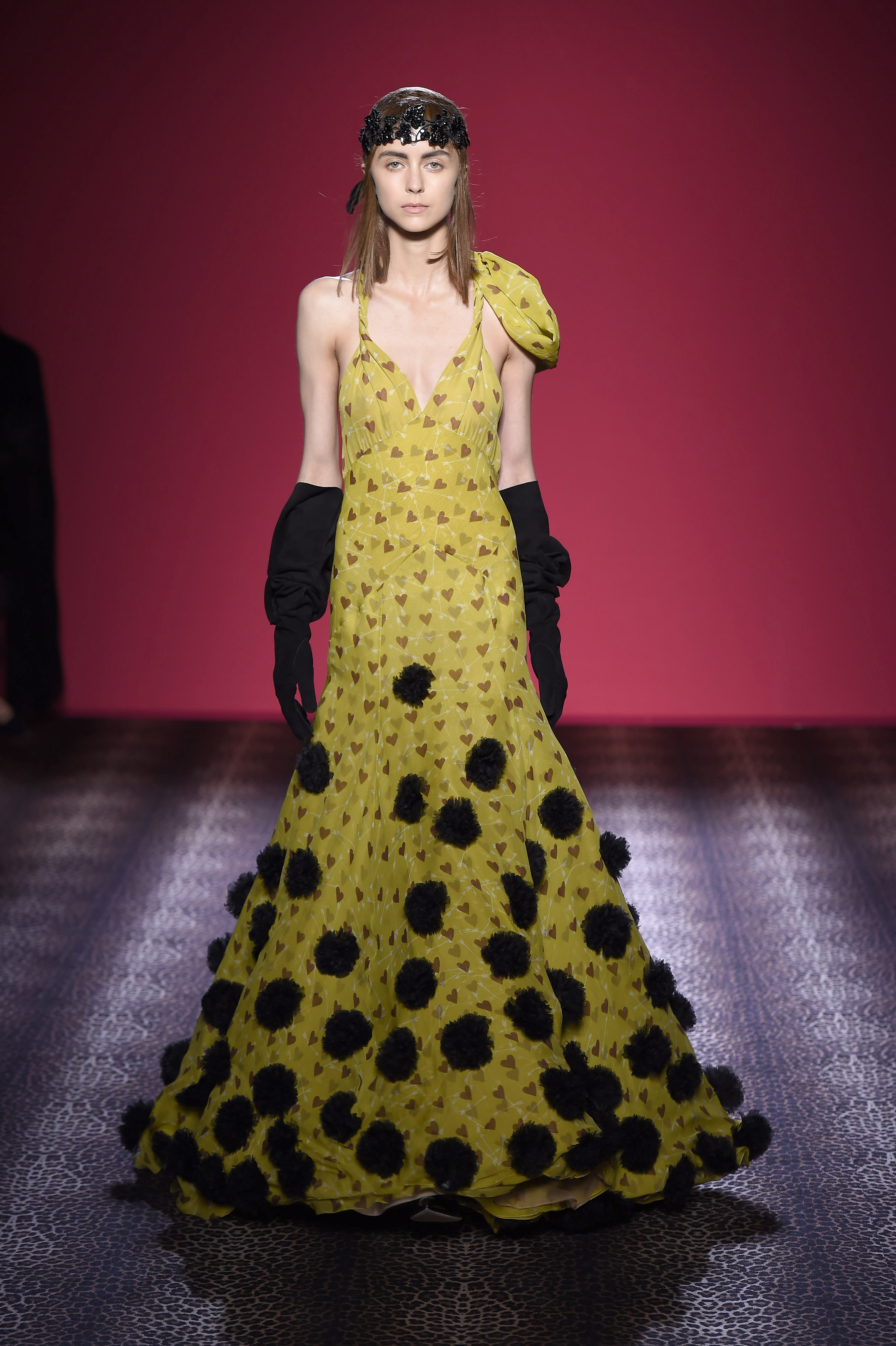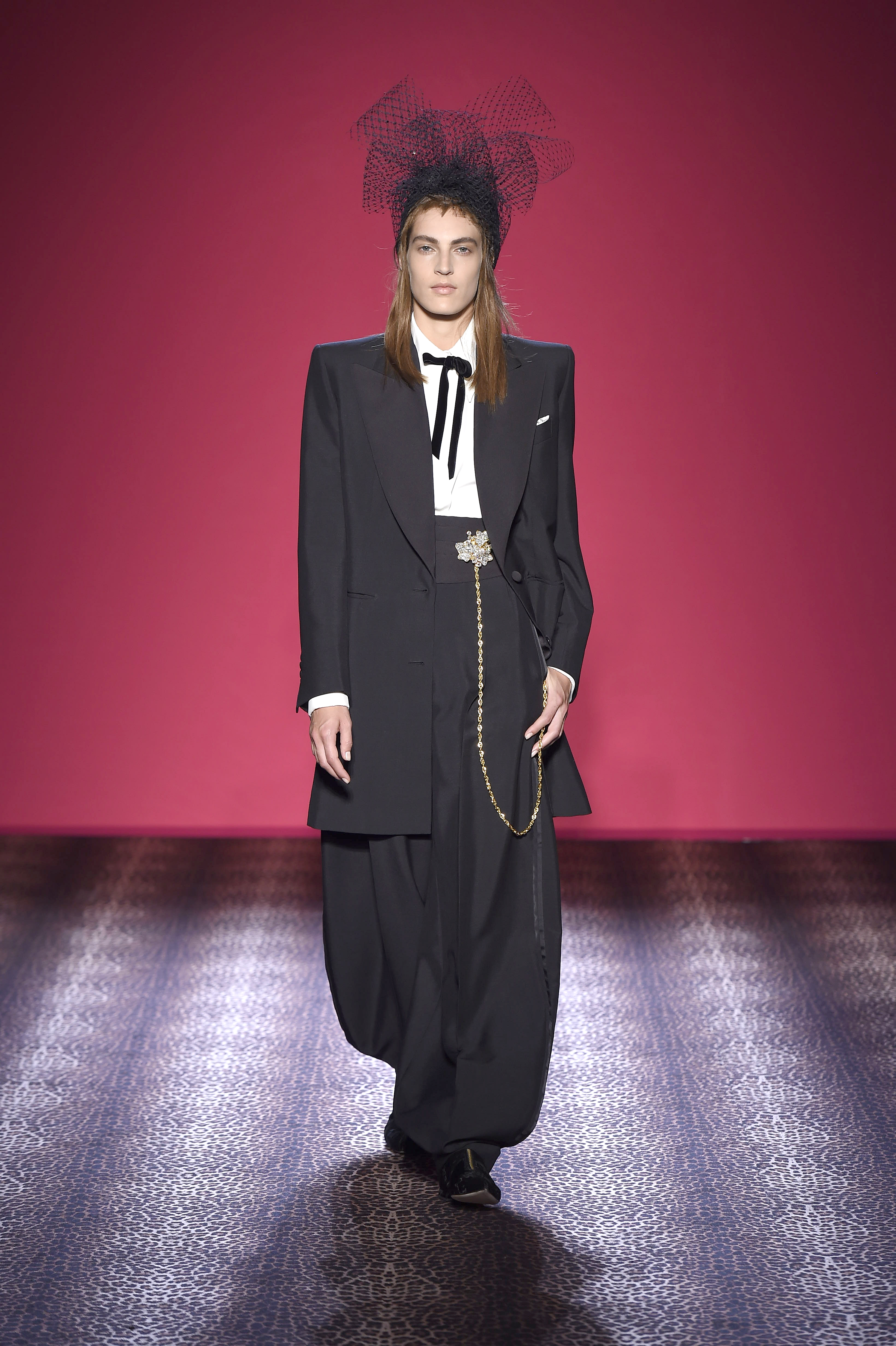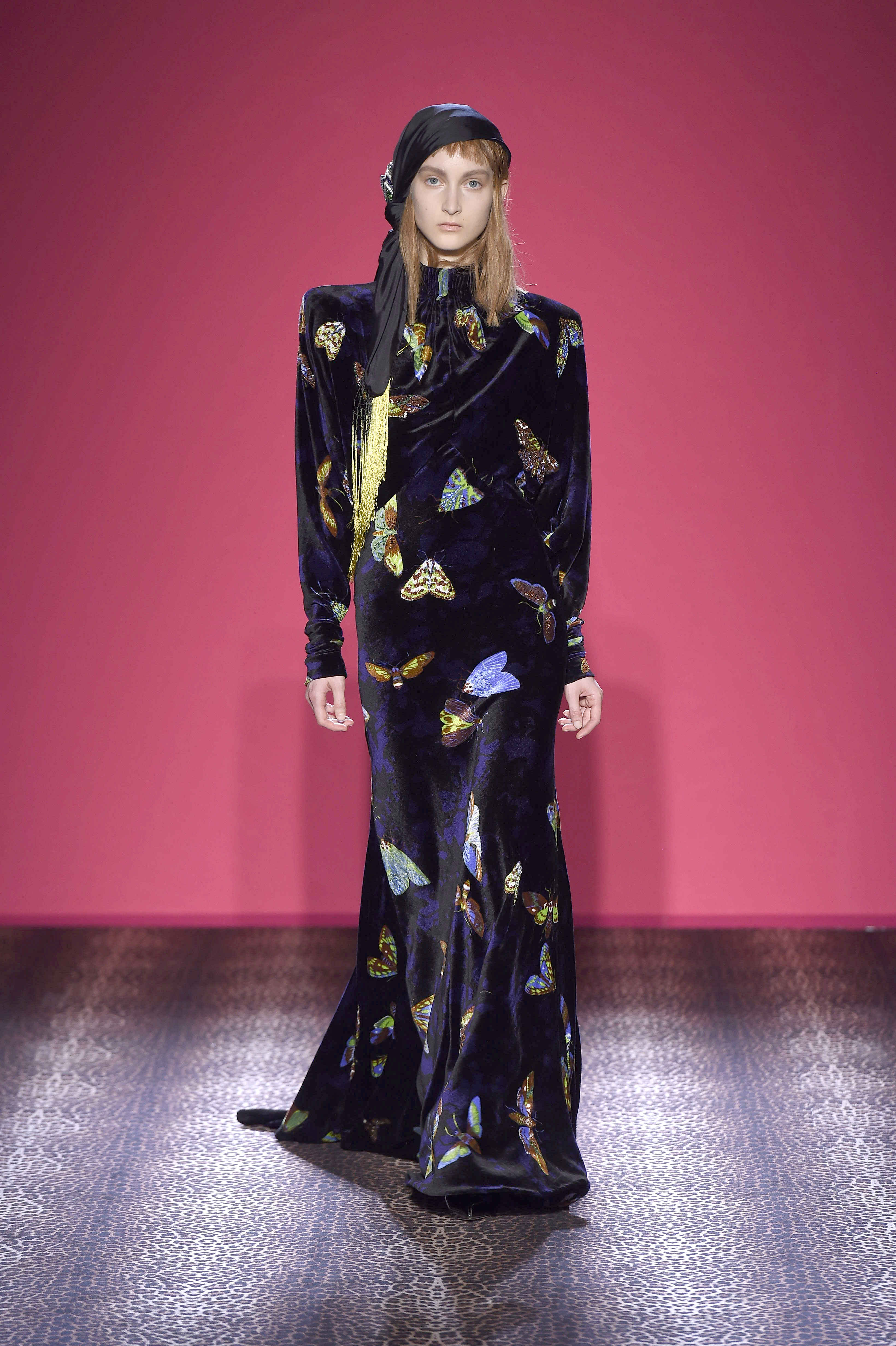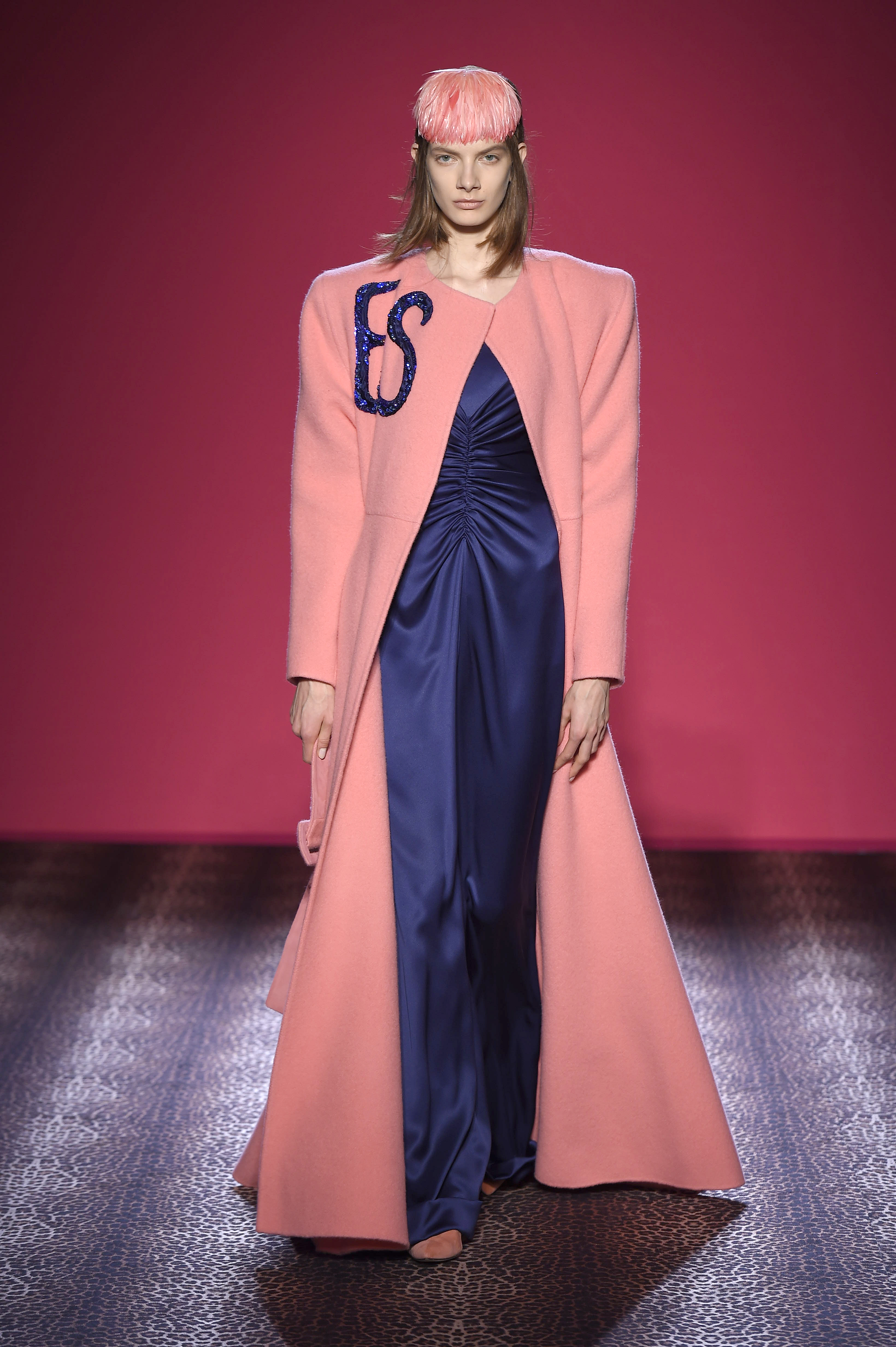 Oscillant entre femme fatale et hard chic, chaque pièce est un enchantement de prouesses artisanales. Les plumes d’autruche noires d’un boléro sont glycérinées pour ressembler à de la fourrure de singe. Associant le beau et le commun, essence même du style Schiaparelli, la préciosité de l’alligator (façonné à la main tel de la mousseline) contraste avec des franges synthétiques lamées multicolores. Les robes longues alternent panne de velours noir en jacquard Balade nocturne (esquissant des rats des villes) et velours de soie rose shocking – la seule nuance de rose qui soit aussi vibrante que le rouge.