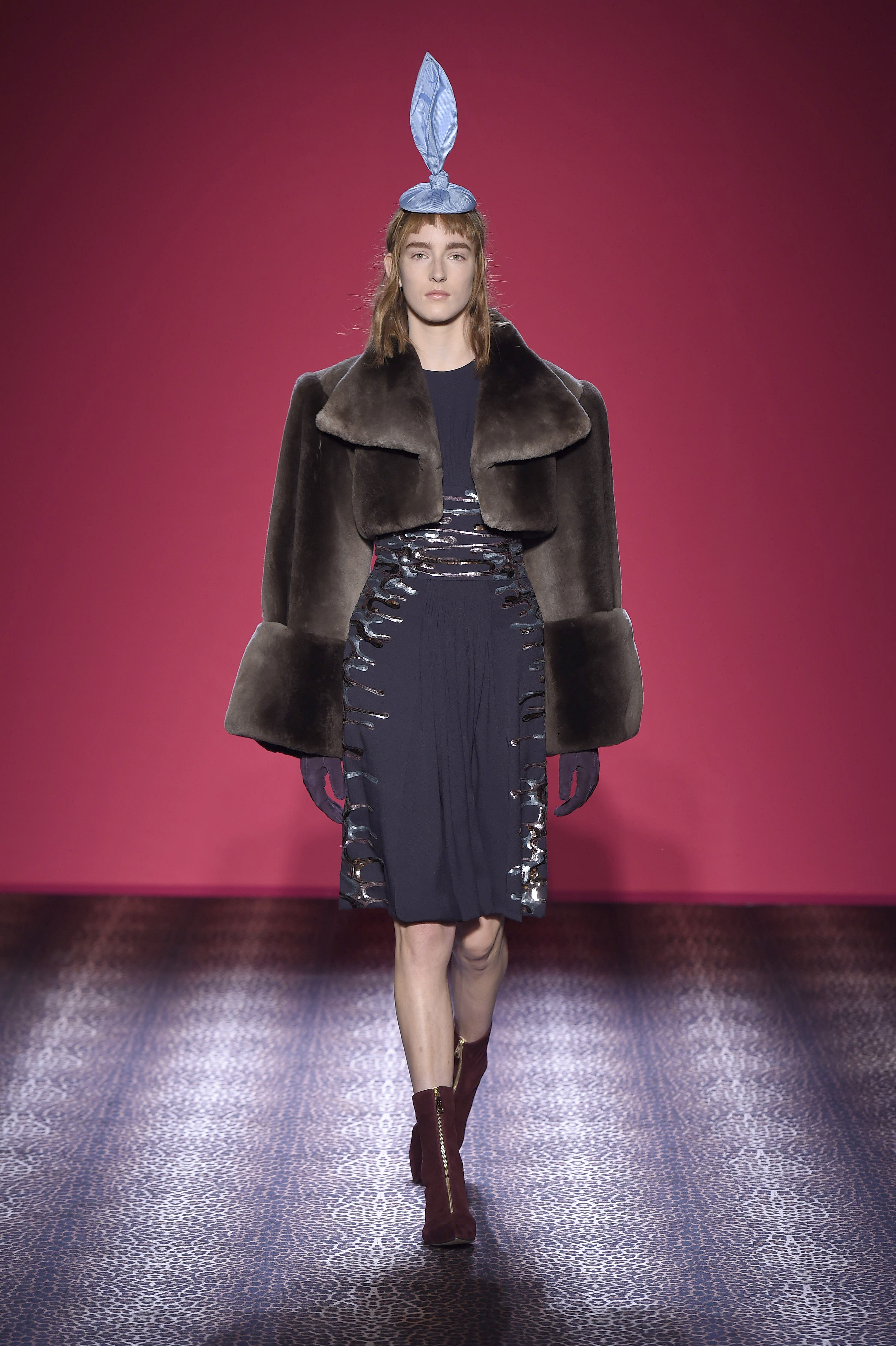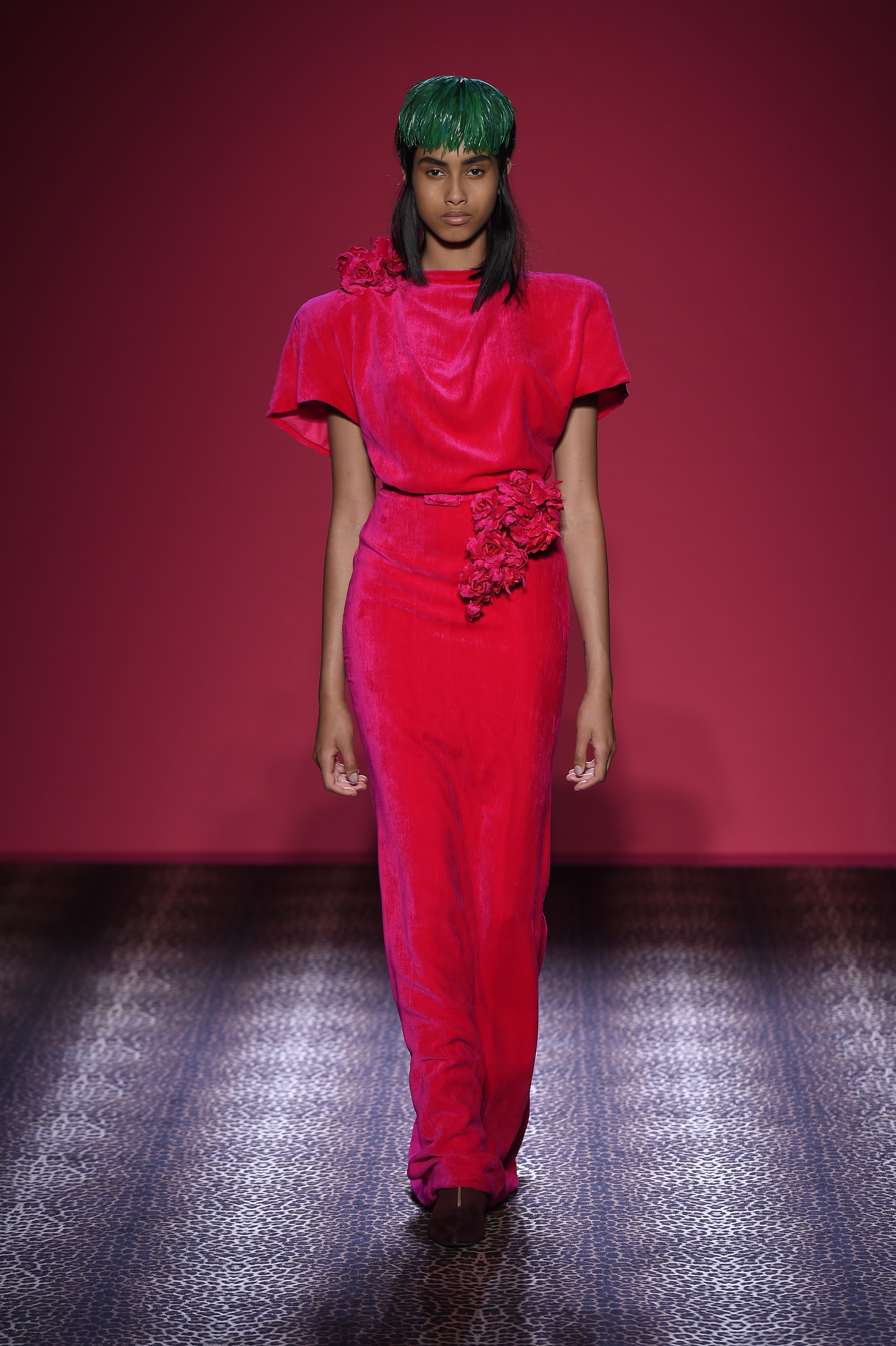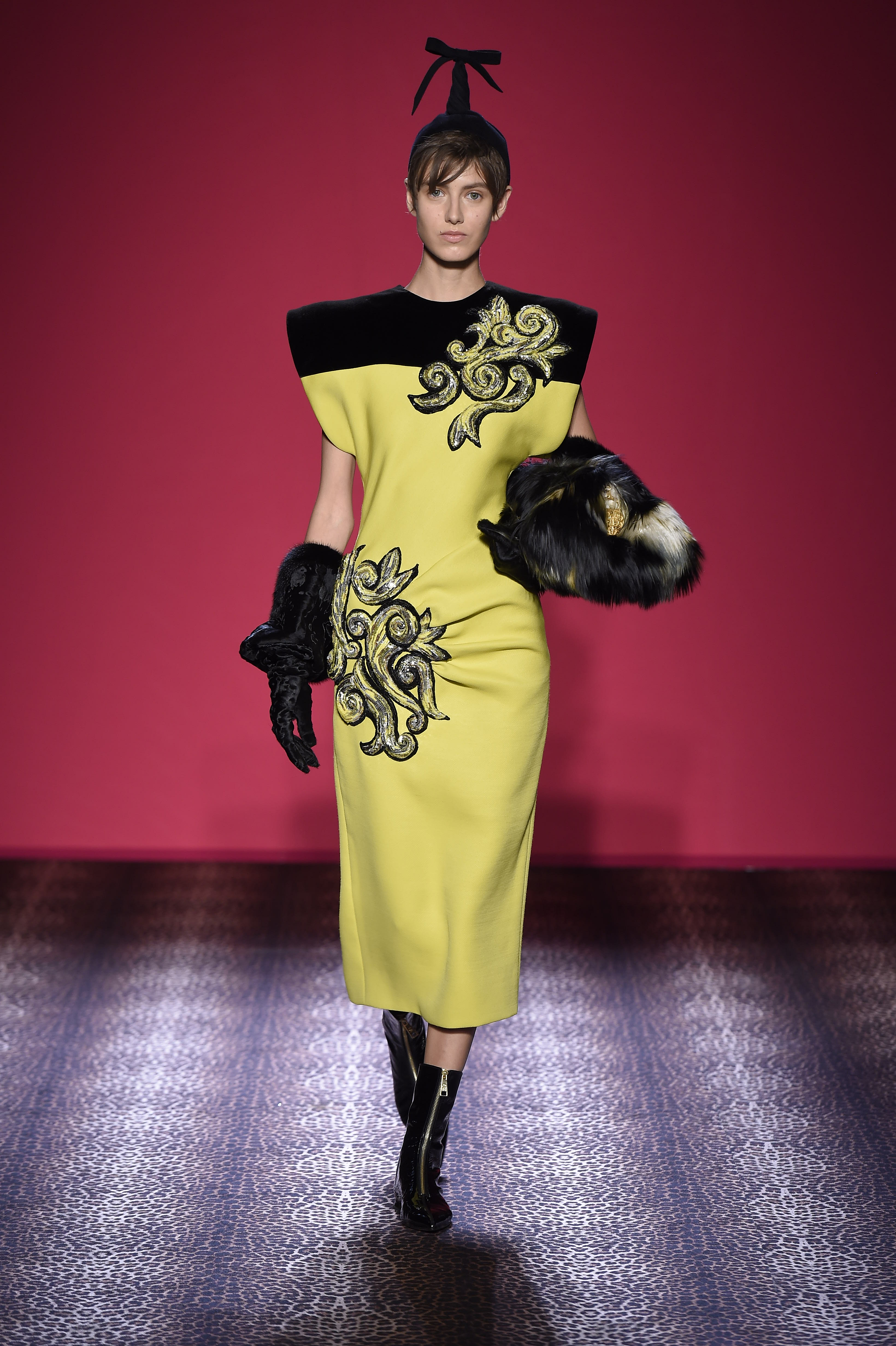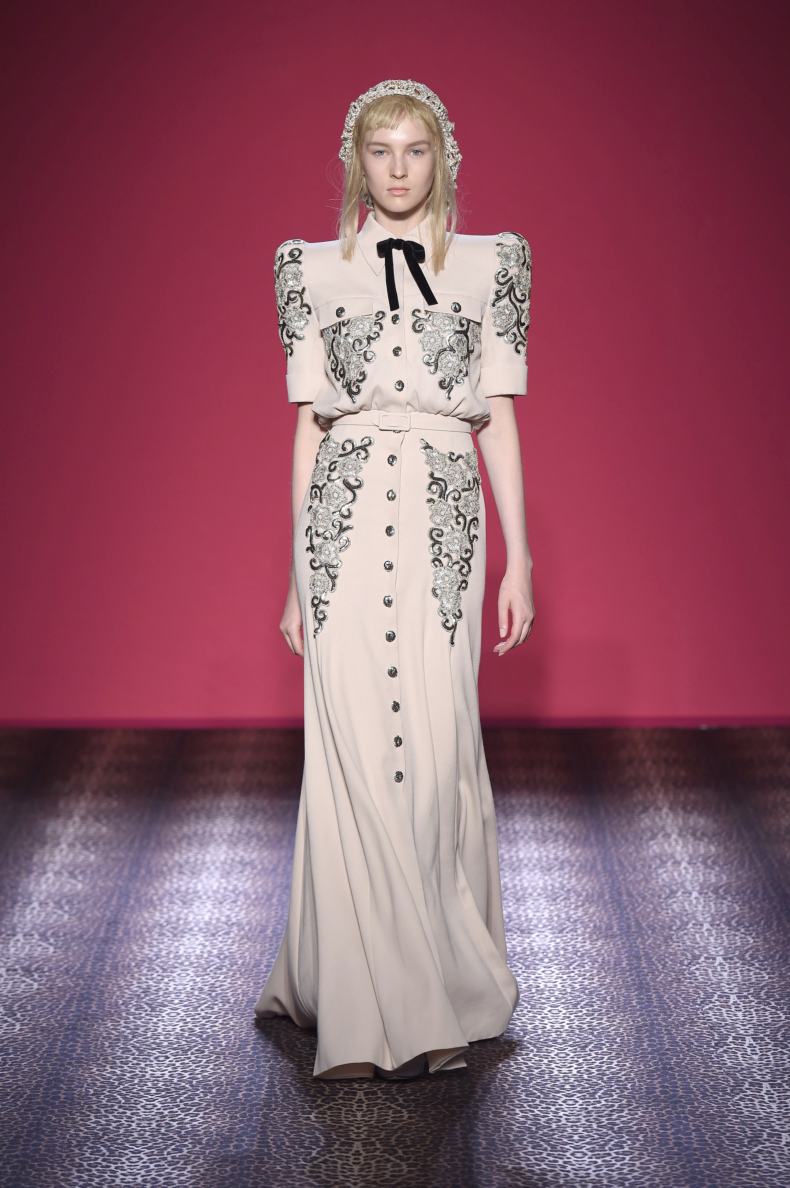 Oscillant entre femme fatale et hard chic, chaque pièce est un enchantement de prouesses artisanales. Les plumes d’autruche noires d’un boléro sont glycérinées pour ressembler à de la fourrure de singe. Associant le beau et le commun, essence même du style Schiaparelli, la préciosité de l’alligator (façonné à la main tel de la mousseline) contraste avec des franges synthétiques lamées multicolores. Les robes longues alternent panne de velours noir en jacquard Balade nocturne (esquissant des rats des villes) et velours de soie rose shocking – la seule nuance de rose qui soit aussi vibrante que le rouge.