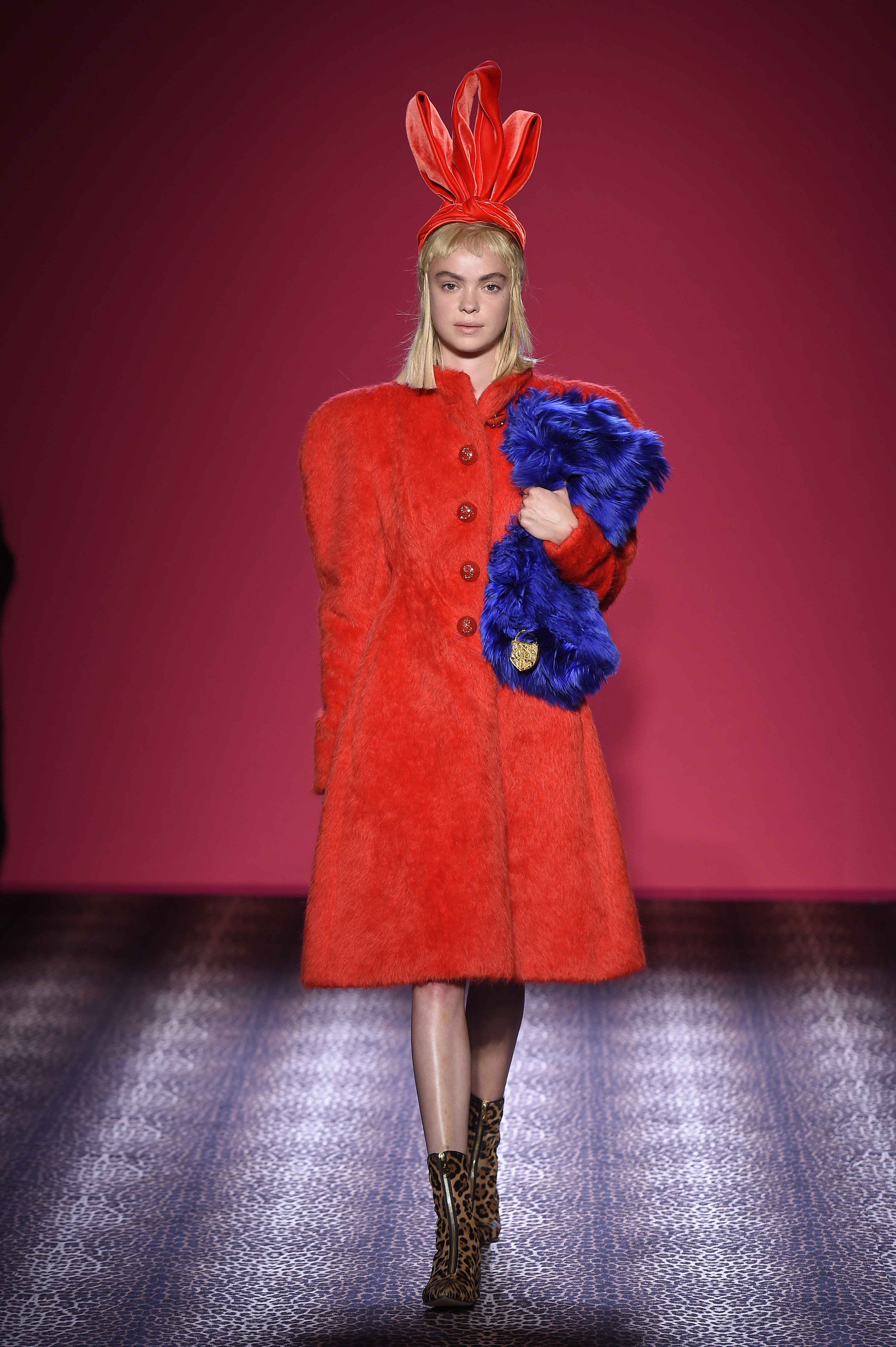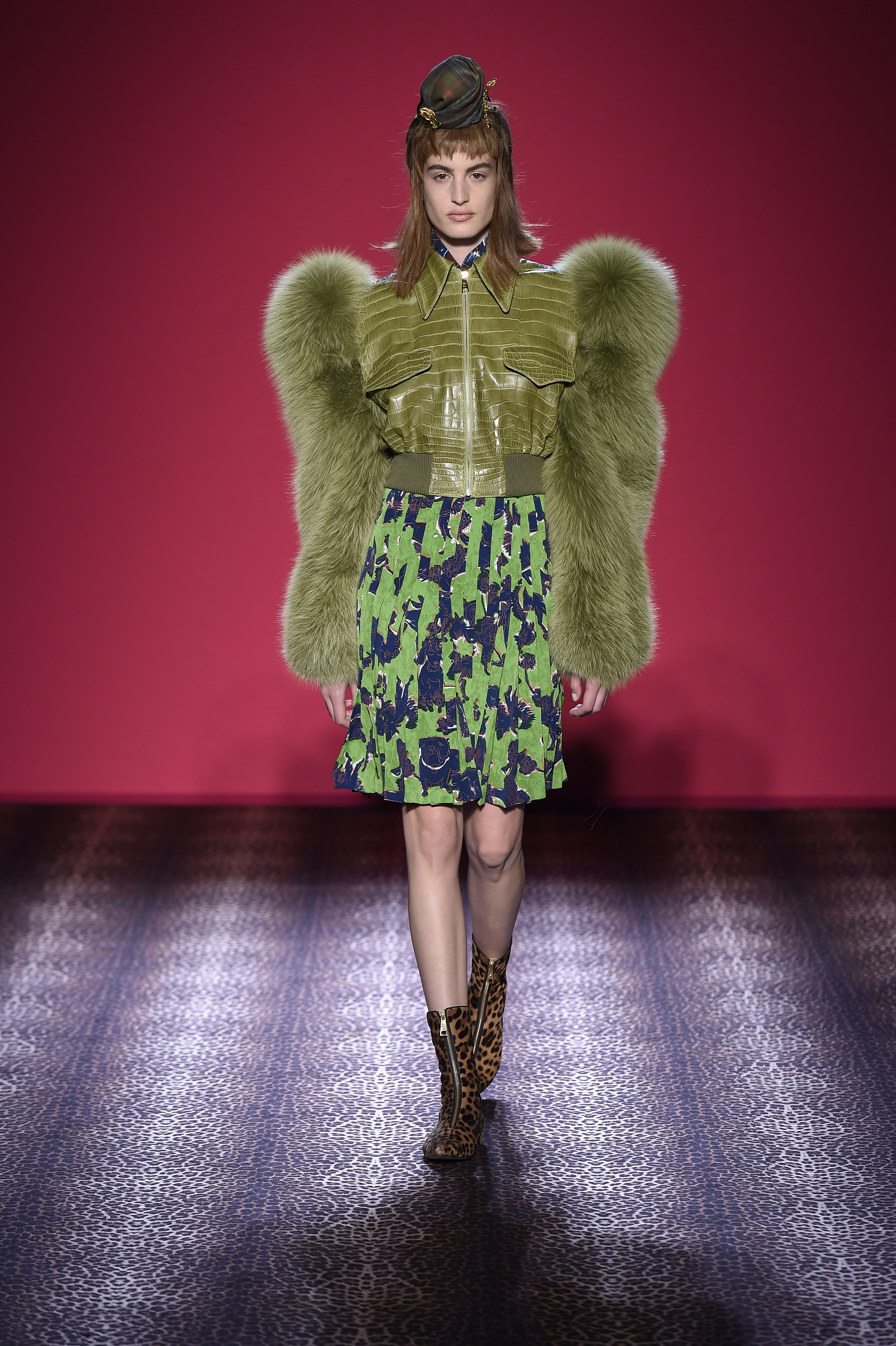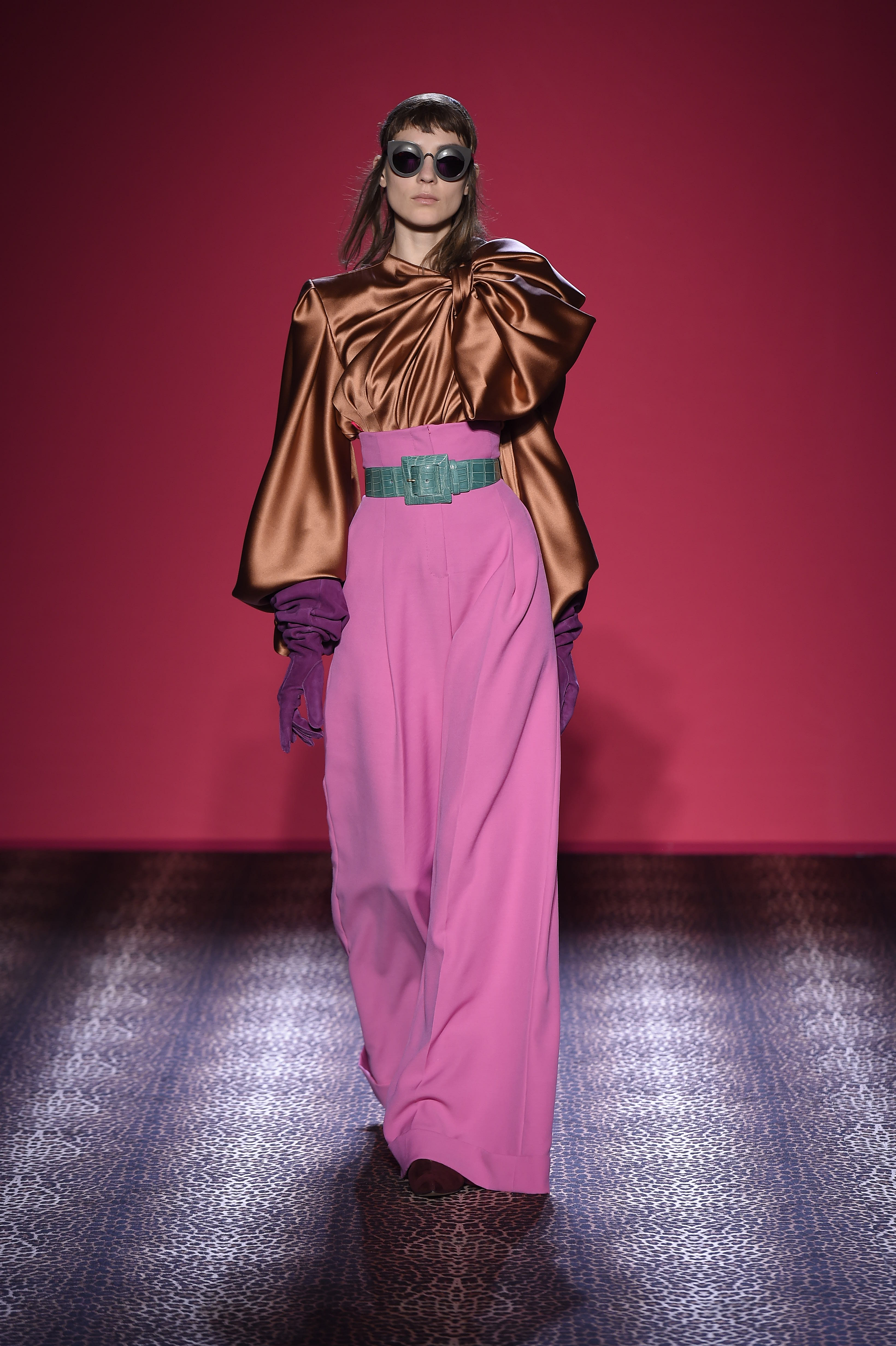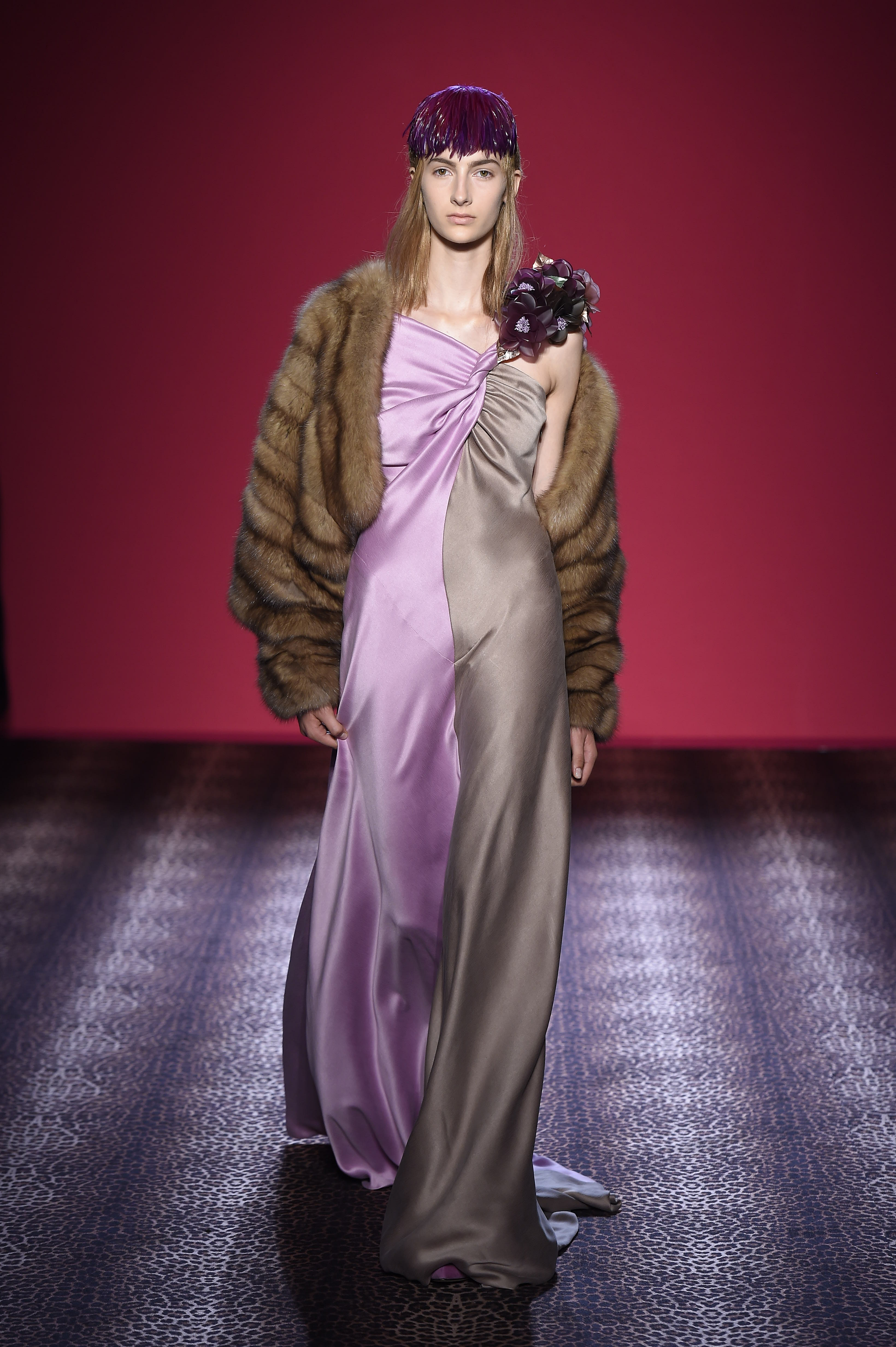 Oscillant entre femme fatale et hard chic, chaque pièce est un enchantement de prouesses artisanales. Les plumes d’autruche noires d’un boléro sont glycérinées pour ressembler à de la fourrure de singe. Associant le beau et le commun, essence même du style Schiaparelli, la préciosité de l’alligator (façonné à la main tel de la mousseline) contraste avec des franges synthétiques lamées multicolores. Les robes longues alternent panne de velours noir en jacquard Balade nocturne (esquissant des rats des villes) et velours de soie rose shocking – la seule nuance de rose qui soit aussi vibrante que le rouge.