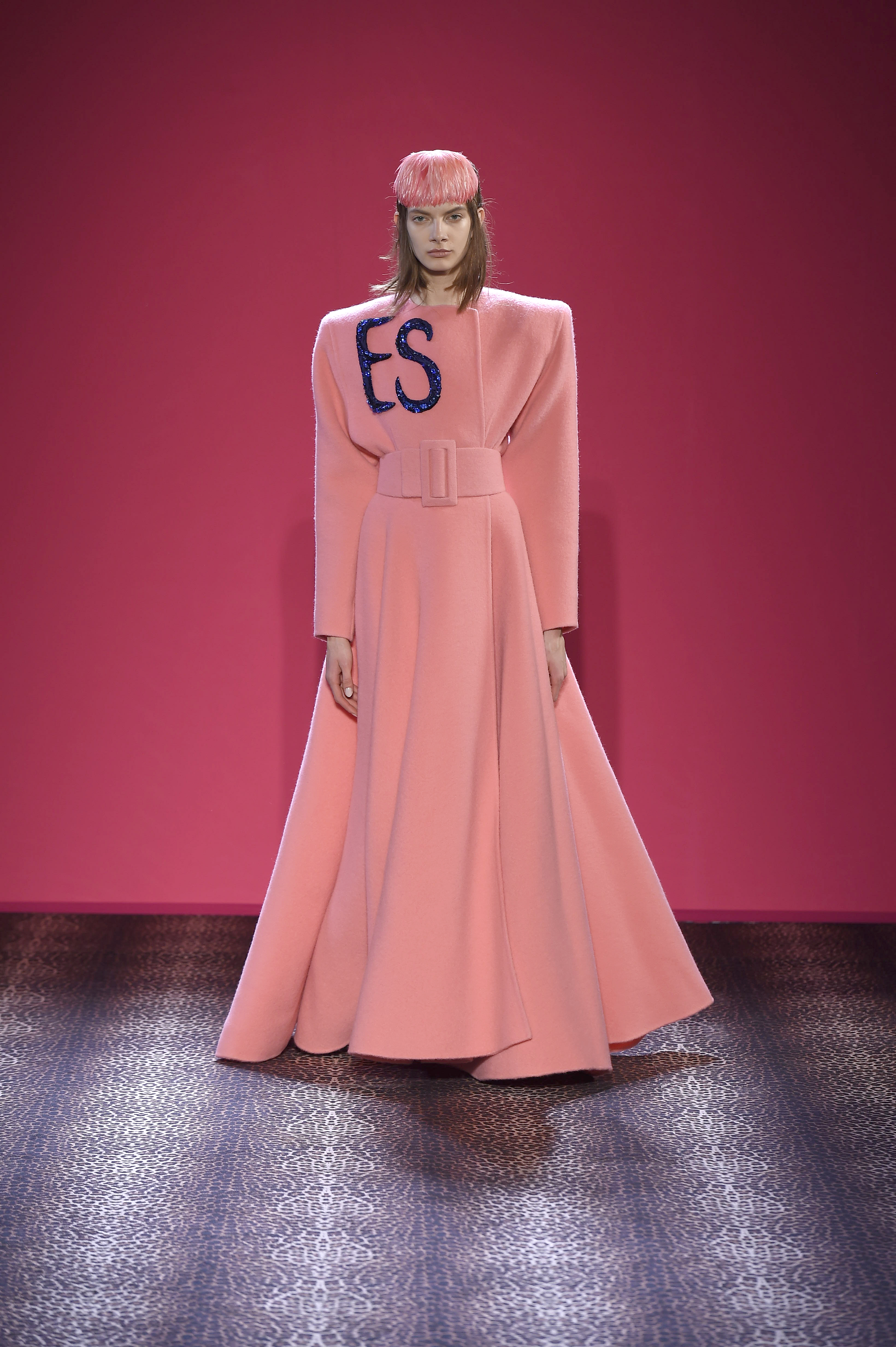 Féminité exaltée et élégance sophistiquée suscitent une véritable surprise. Confiante en elle, la femme Schiaparelli ose et assume fièrement sa fantaisie. Sa présence est une affirmation, celle d’une allure résolument parisienne. Sa forte personnalité se traduit par des couleurs intenses très Hollywood en Kodachrome, des imprimés impertinents, des broderies étincelantes, des tailleurs à la coupe architecturale et un flou glamour. La verticalité de la silhouette dessine une taille clepsydre et une ligne d’épaule marquée.