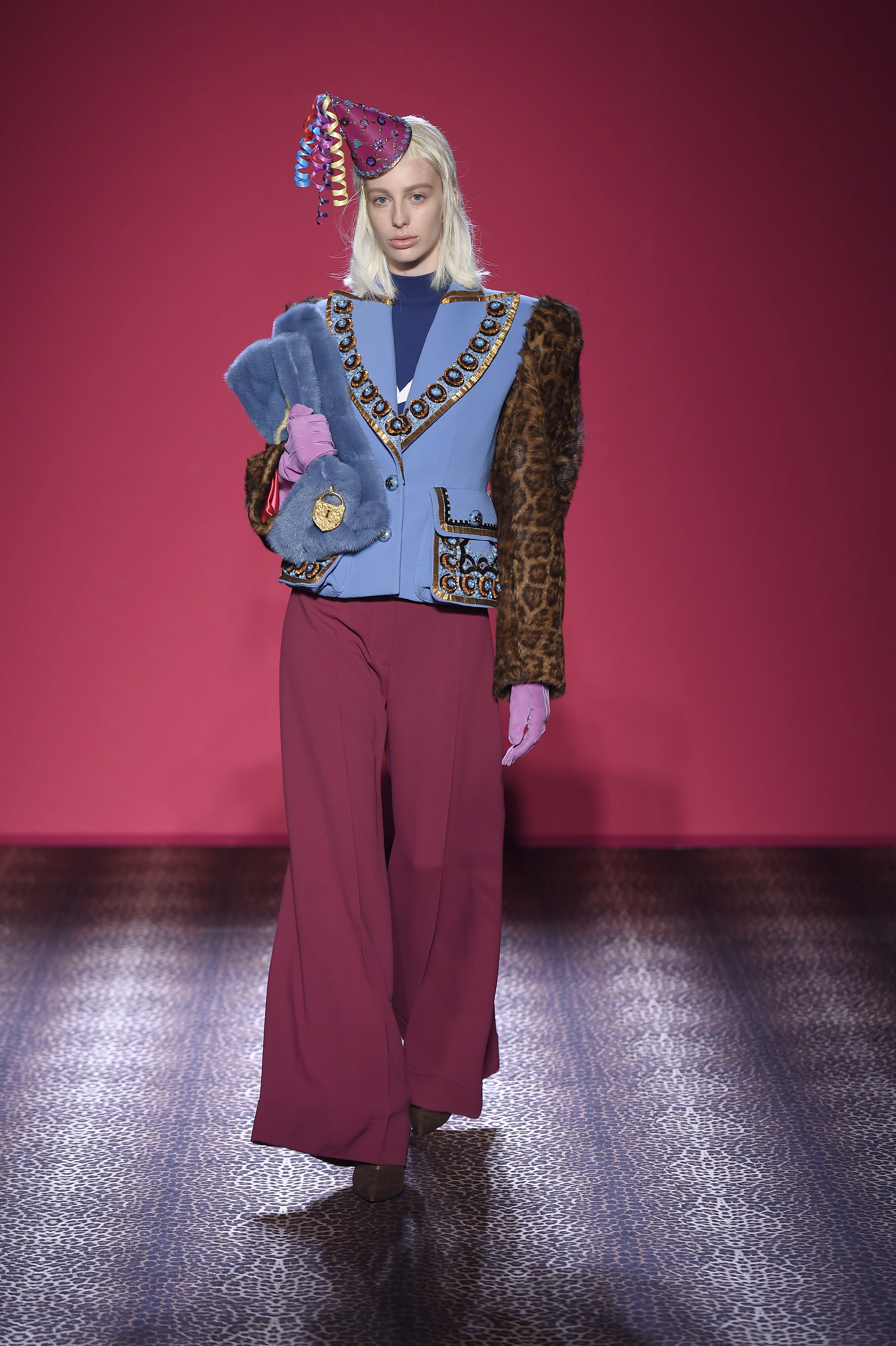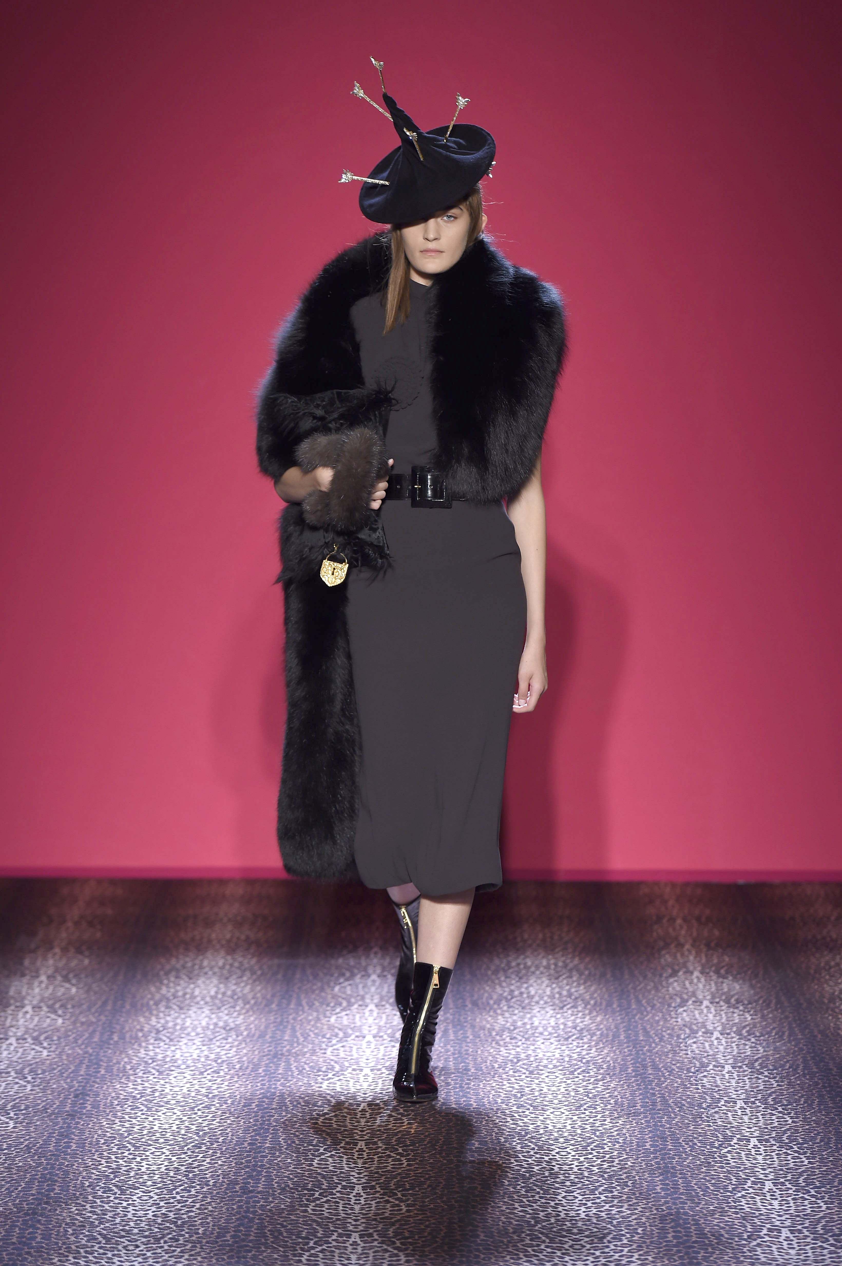 Les bijoux en forme de feuilles de lierre, de papillons de nuit et de cœurs percés de flèches renvoient à des motifs chers à Elsa. En pâte de verre, cristal, laiton et cuivre, ils font écho aux boutons-bijoux façonnés main. L’opulence nonchalante des passages est poussée à son comble avec le sac du soir Suite N.7 en alpaga, breitschwanz ou vison arlequin orné d’un cadenas inspiré d’une broderie Schiaparelli de 1938.
