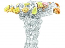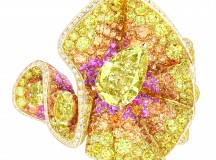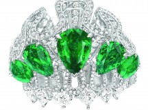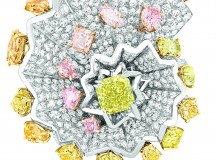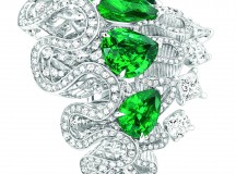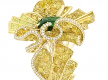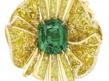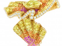 Les bijoux inspirés de la ligne Corolle apparaissent tout en volutes de diamants et d’émeraudes, puis en superpositions de jupes roses. La manchette et la bague Bar, précieux hommage au tailleur iconique de la Maison. Viennent ensuite les exubérants volumes aux incroyables dégradés de couleurs de la ligne Ailée, le drapé piqué d’un diamant jaune de la bague Envol, le tourbillon de pierres multicolores de la ligne Trompe-l’oeil et les lignes géométriques complexes des bijoux Zig-Zag. Victoire de Castellane opère la transmutation du tissu en pierre précieuses, et de la Haute Couture en Haute Joaillerie.