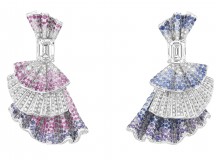 Chaque pièce de la collection emprunte ainsi le nom d’une ligne ou d’une robe iconique, adaptant le mouvement particulier des étoffes au langage de la joaillerie. Les plissés précieux offrent au regard leur silhouette ceinturée de pierreries; l’une dévoile au passage un ruban de diamants, une autre tournoie légèrement pour laisser entrevoir les volants d’un jupon de rubis.