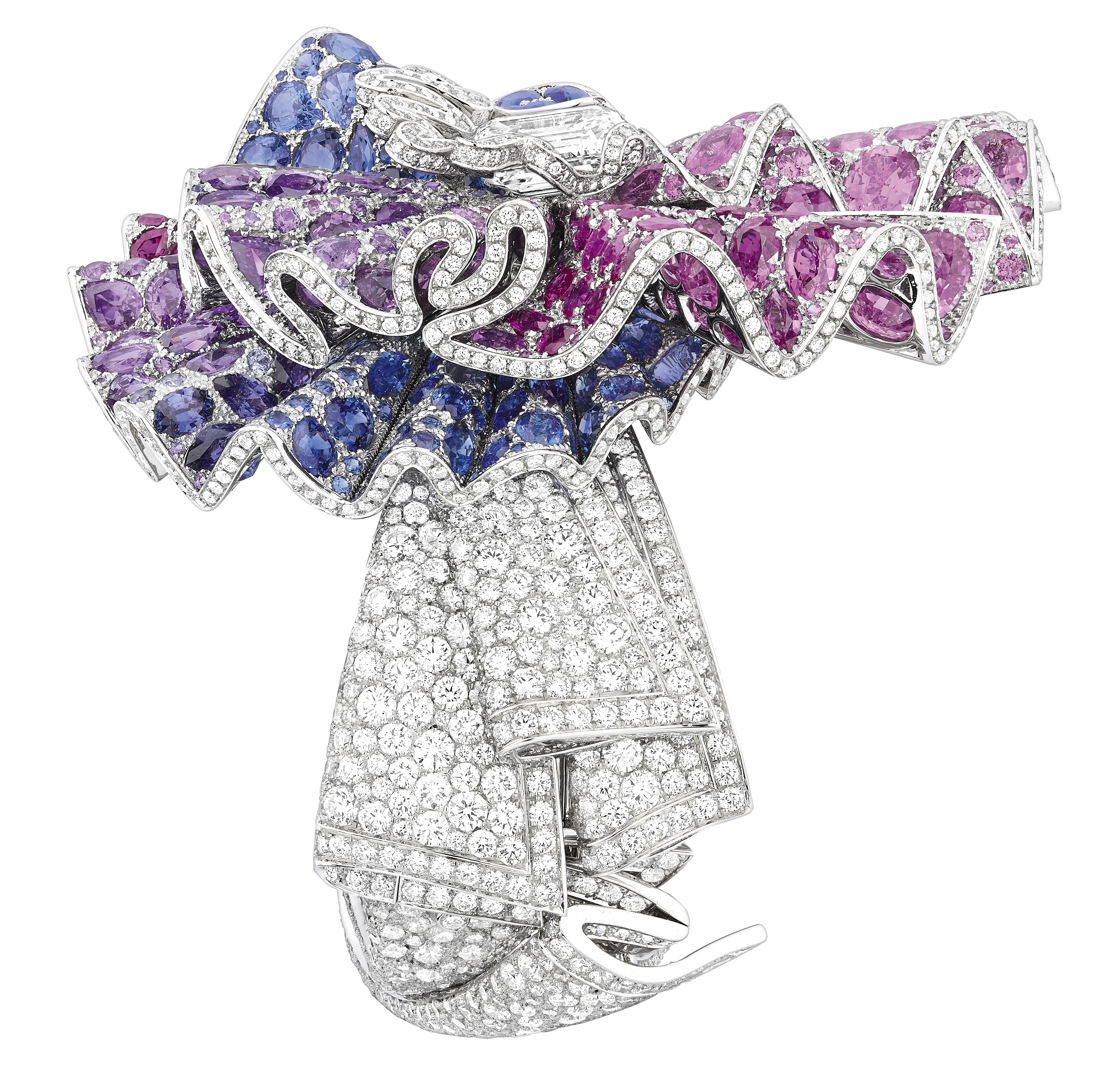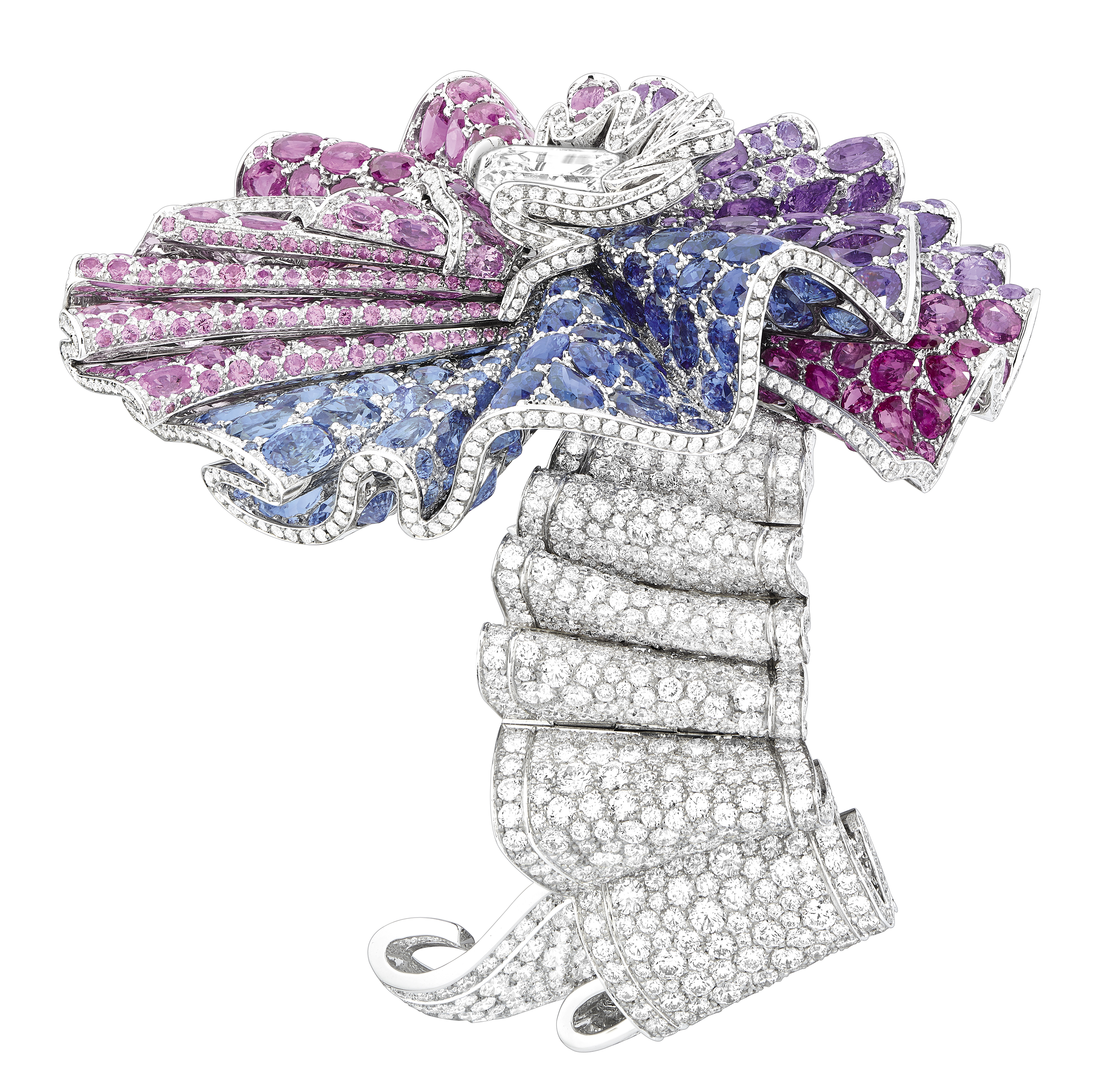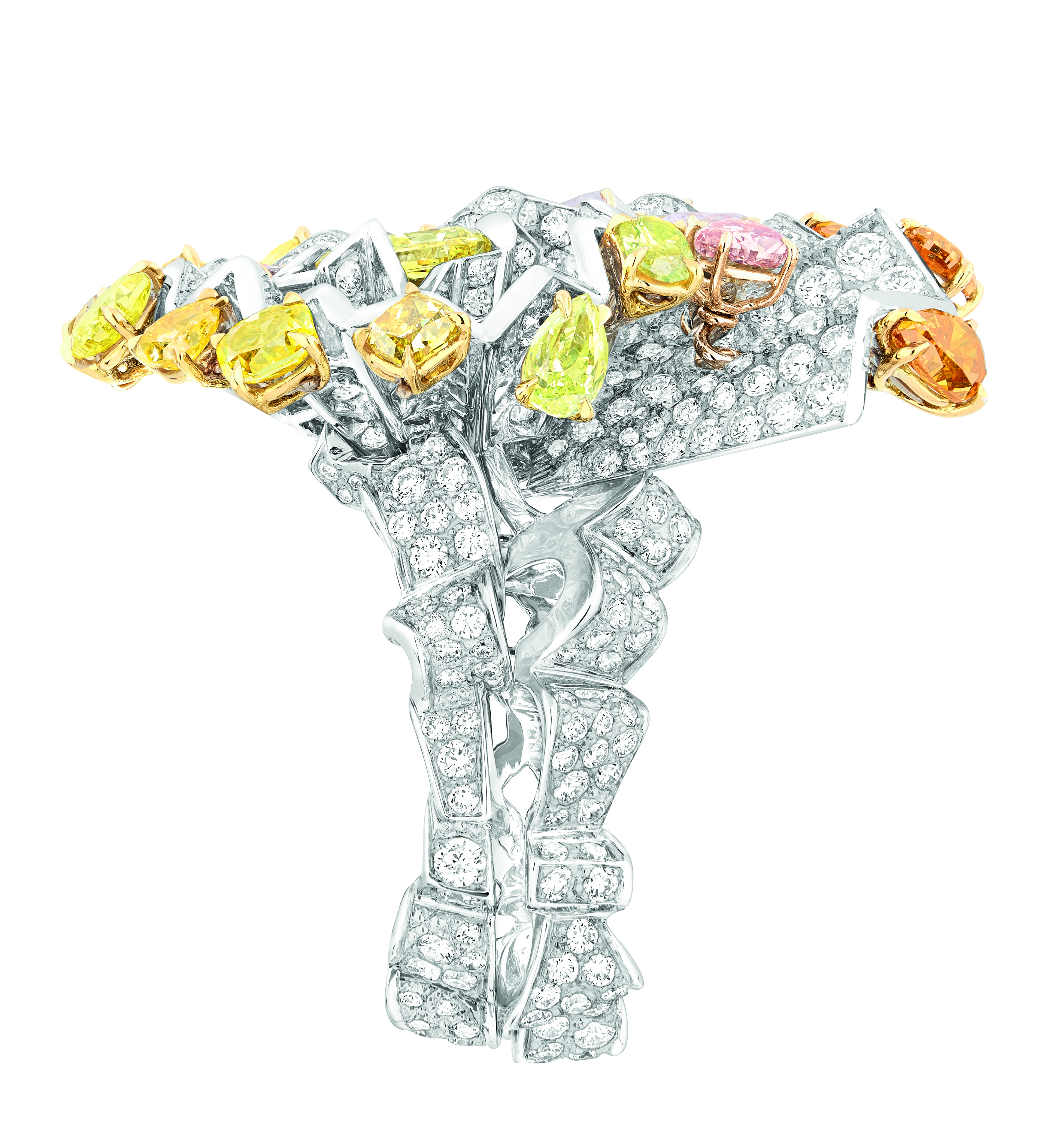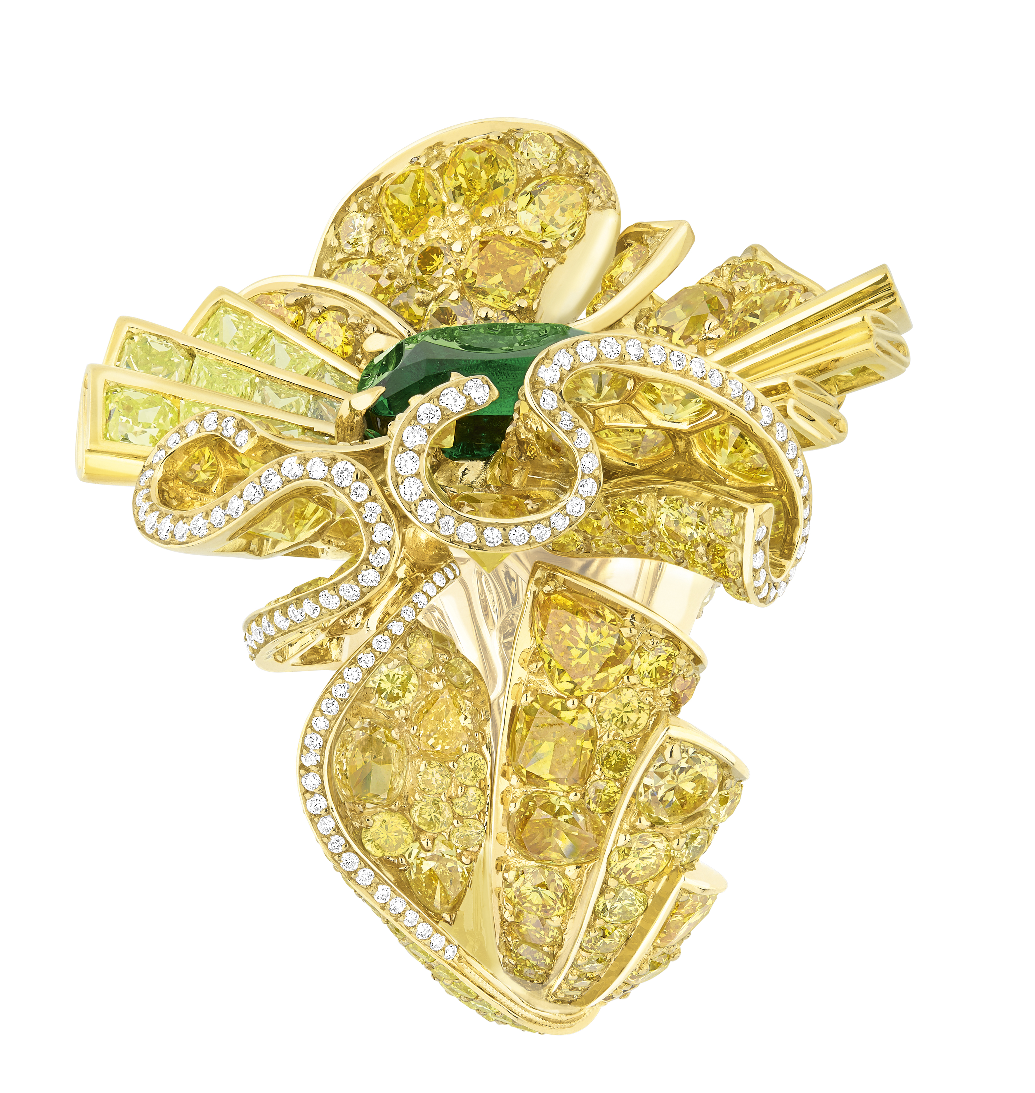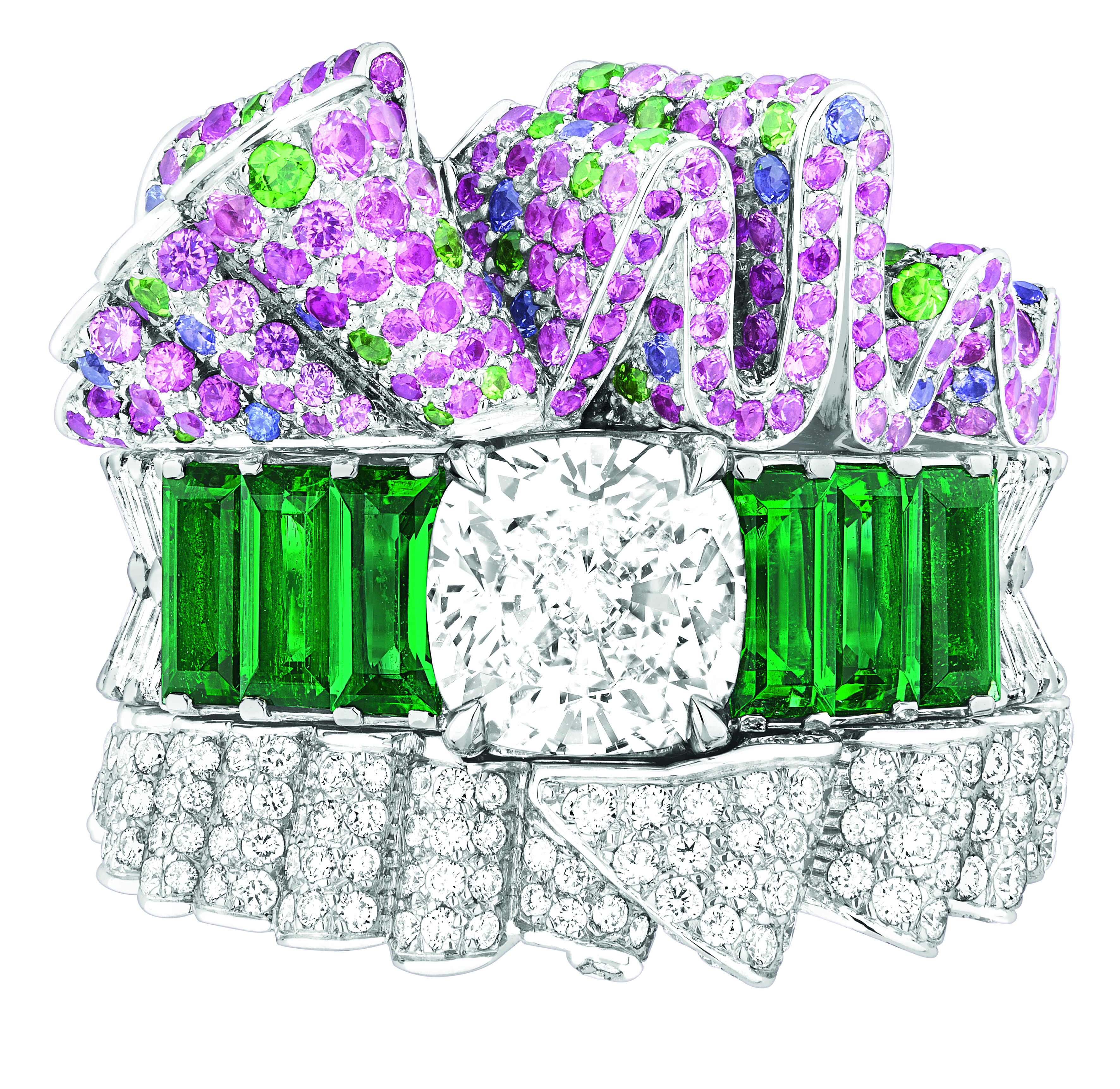 Les bijoux inspirés de la ligne Corolle apparaissent tout en volutes de diamants et d’émeraudes, puis en superpositions de jupes roses. La manchette et la bague Bar, précieux hommage au tailleur iconique de la Maison. Viennent ensuite les exubérants volumes aux incroyables dégradés de couleurs de la ligne Ailée, le drapé piqué d’un diamant jaune de la bague Envol, le tourbillon de pierres multicolores de la ligne Trompe-l’oeil et les lignes géométriques complexes des bijoux Zig-Zag. Victoire de Castellane opère la transmutation du tissu en pierre précieuses, et de la Haute Couture en Haute Joaillerie.