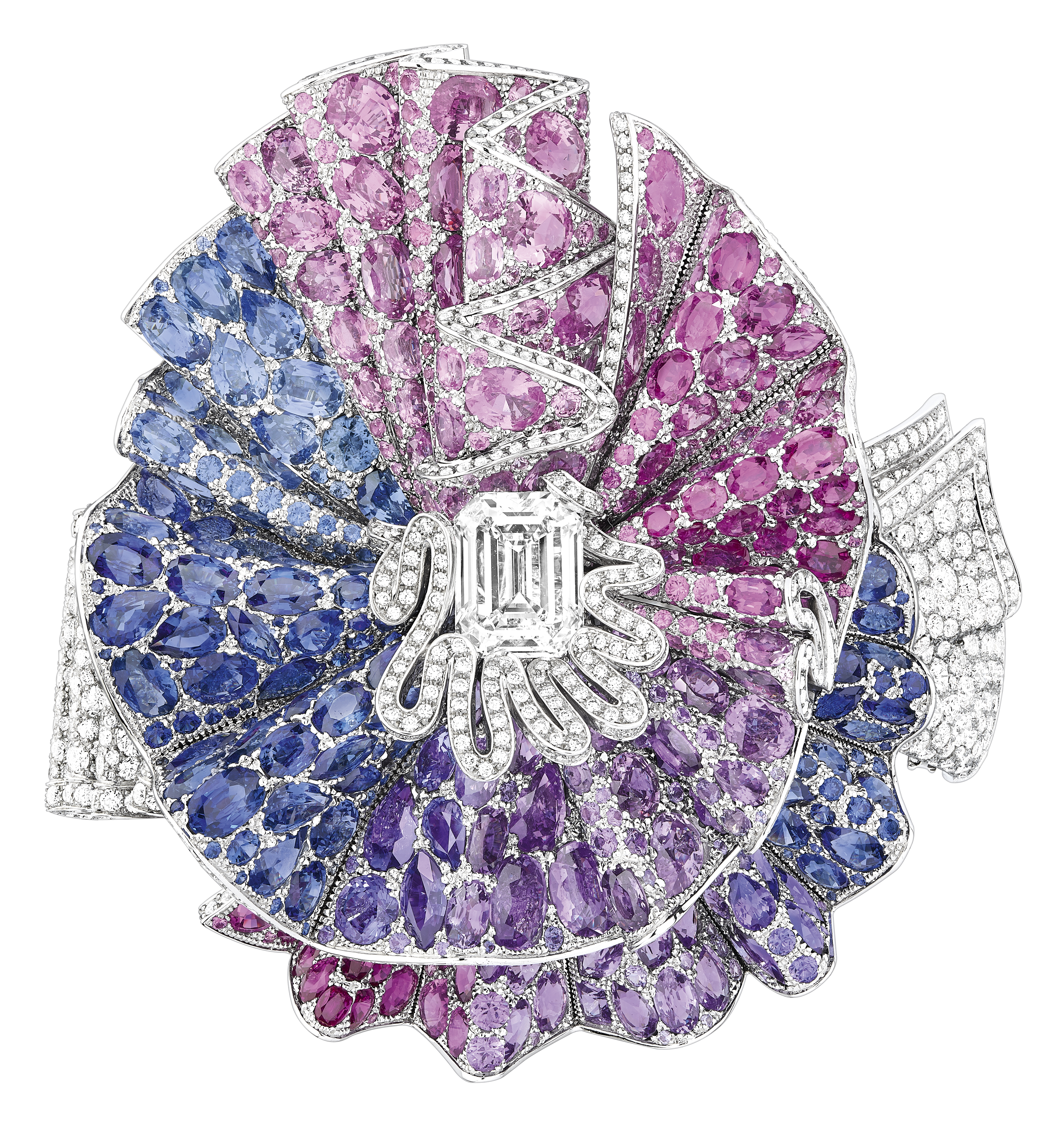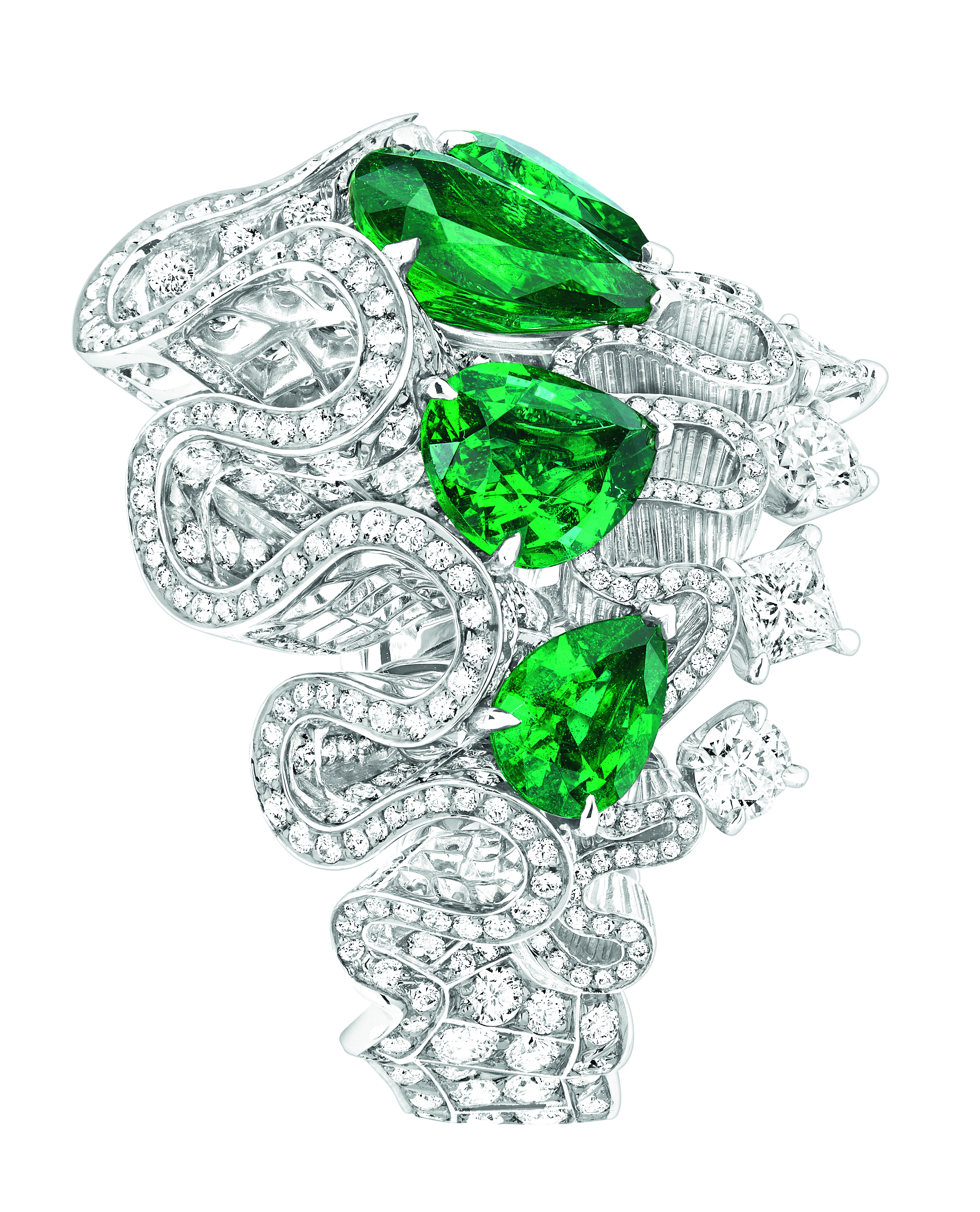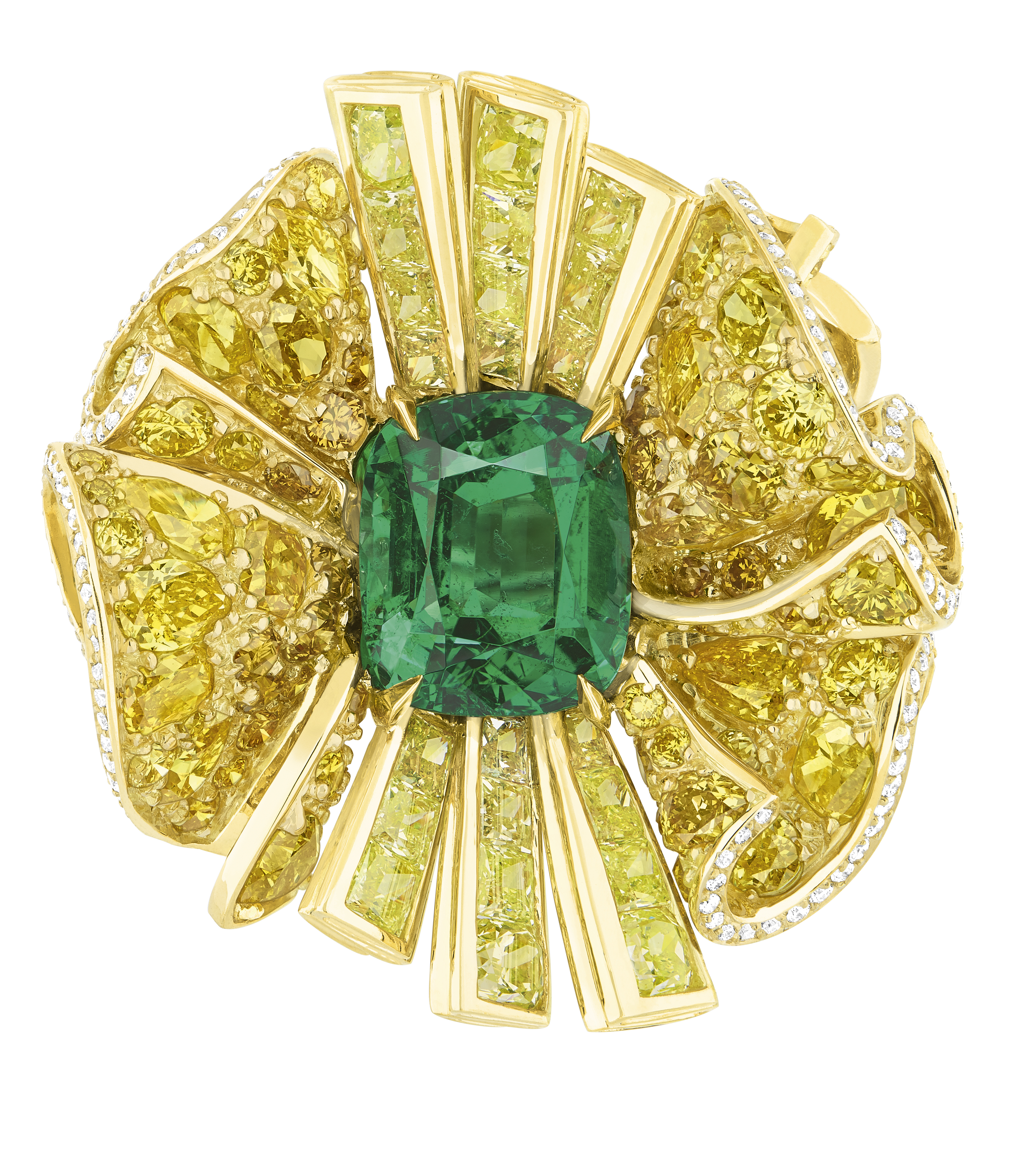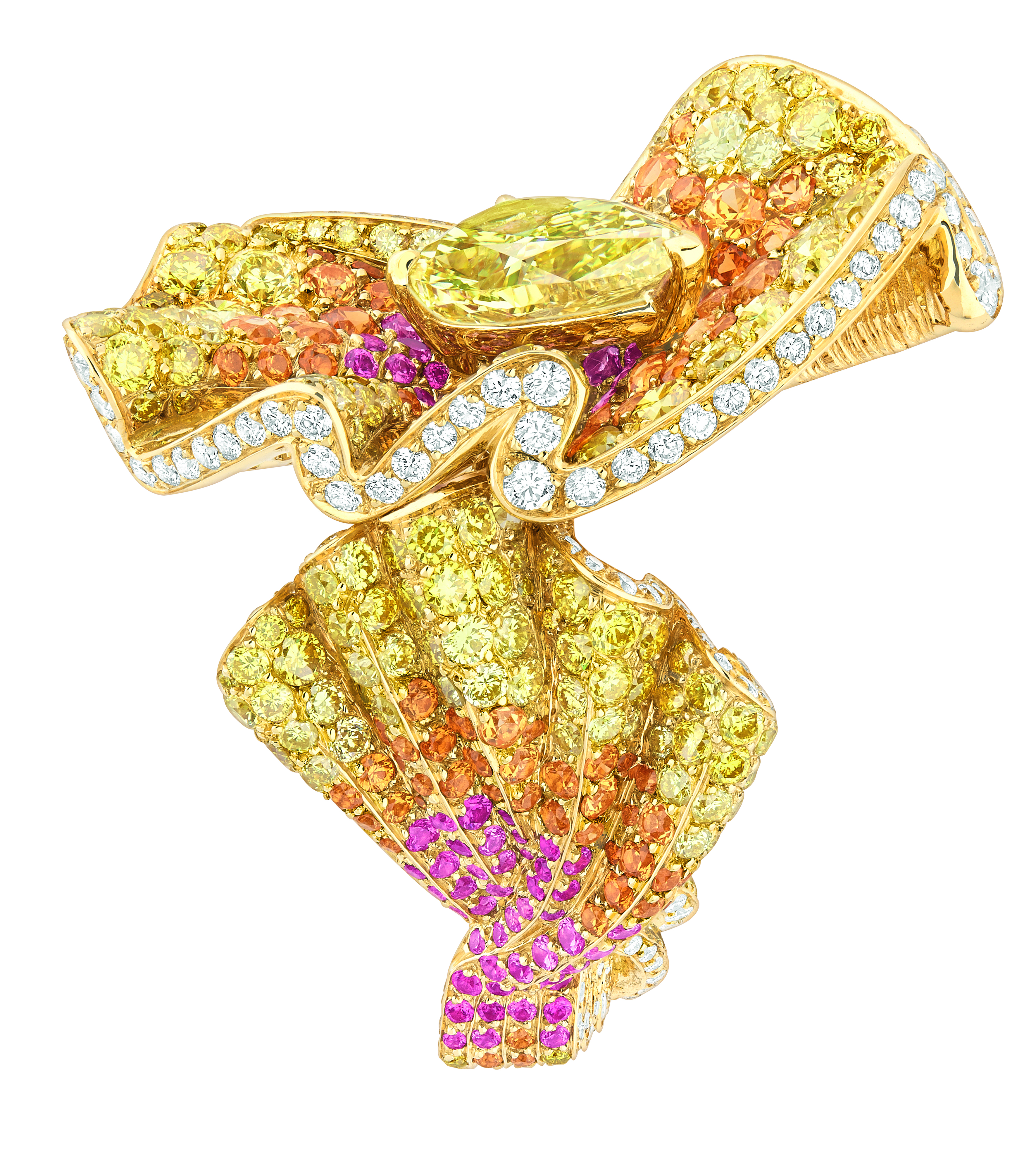 Les bijoux inspirés de la ligne Corolle apparaissent tout en volutes de diamants et d’émeraudes, puis en superpositions de jupes roses. La manchette et la bague Bar, précieux hommage au tailleur iconique de la Maison. Viennent ensuite les exubérants volumes aux incroyables dégradés de couleurs de la ligne Ailée, le drapé piqué d’un diamant jaune de la bague Envol, le tourbillon de pierres multicolores de la ligne Trompe-l’oeil et les lignes géométriques complexes des bijoux Zig-Zag. Victoire de Castellane opère la transmutation du tissu en pierre précieuses, et de la Haute Couture en Haute Joaillerie.