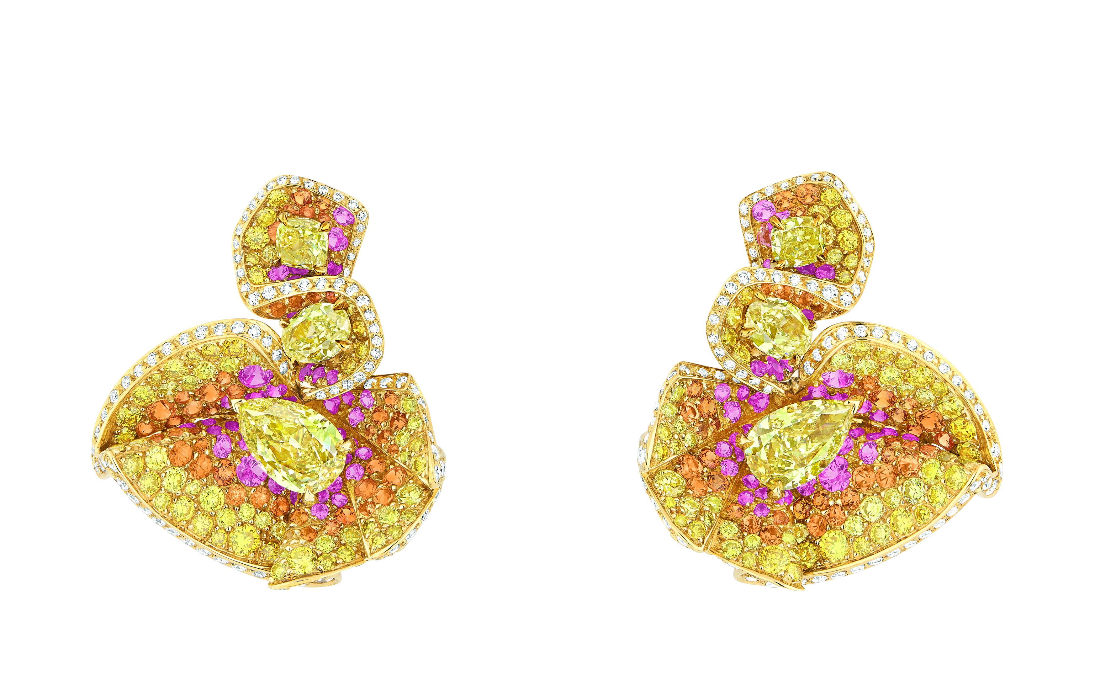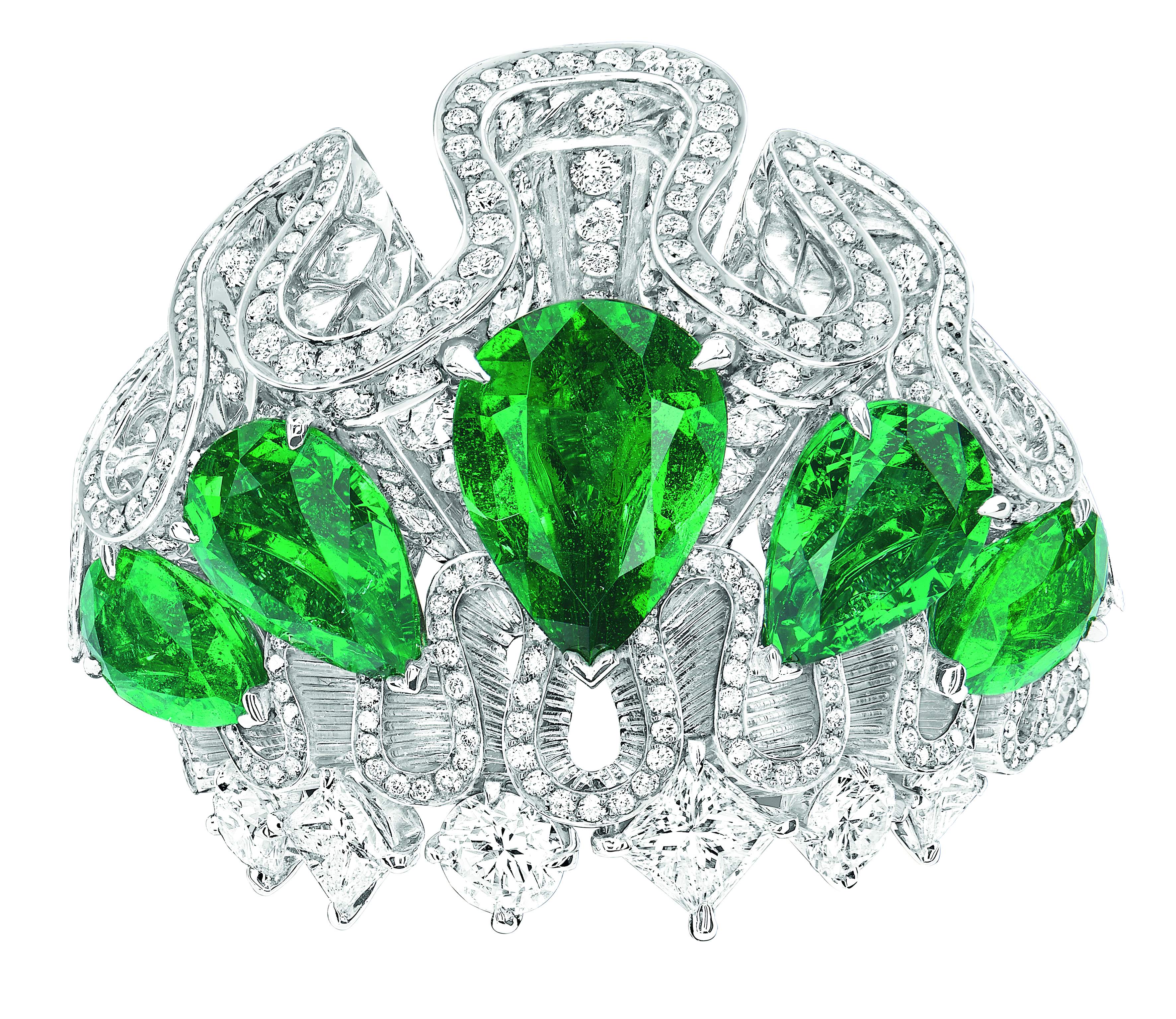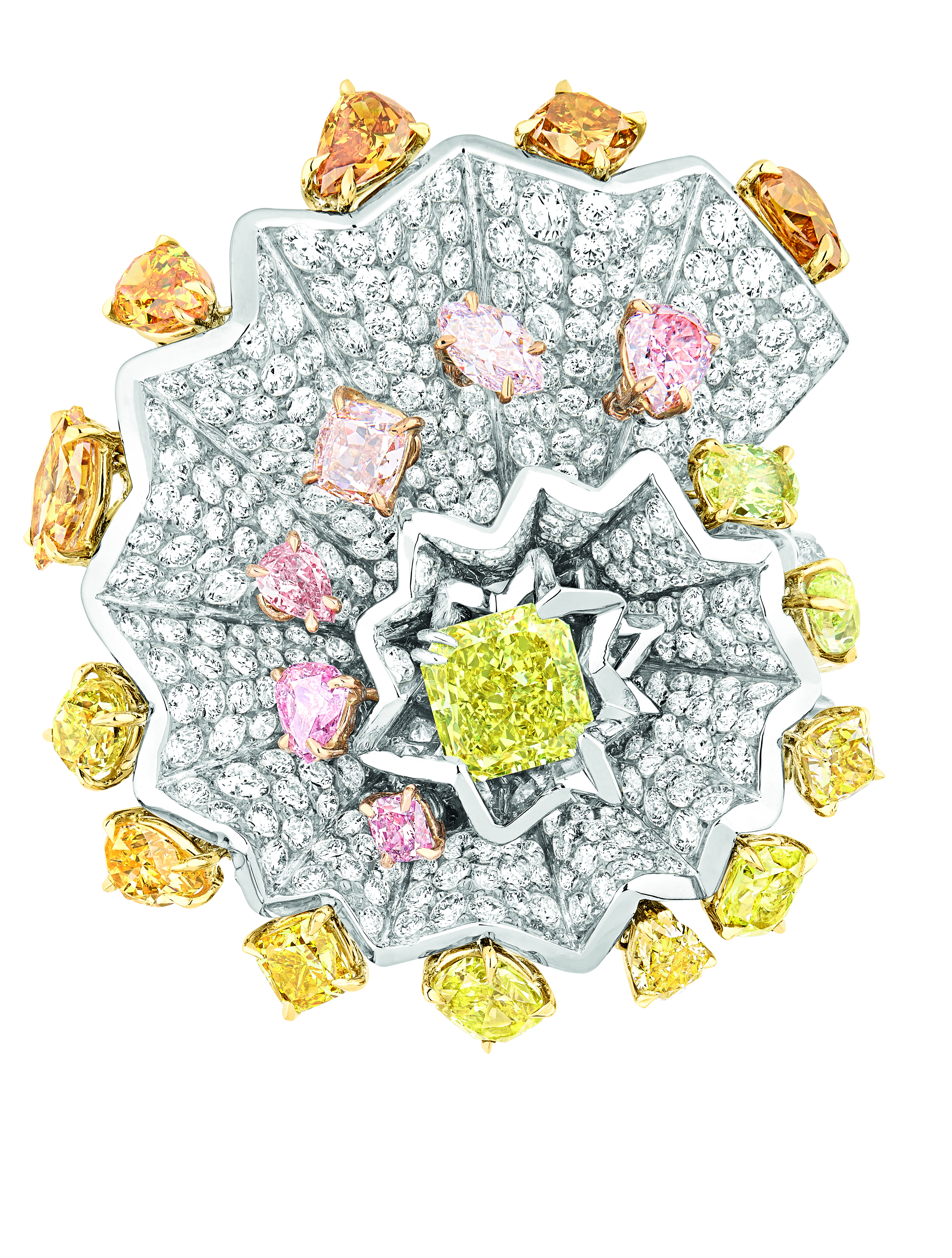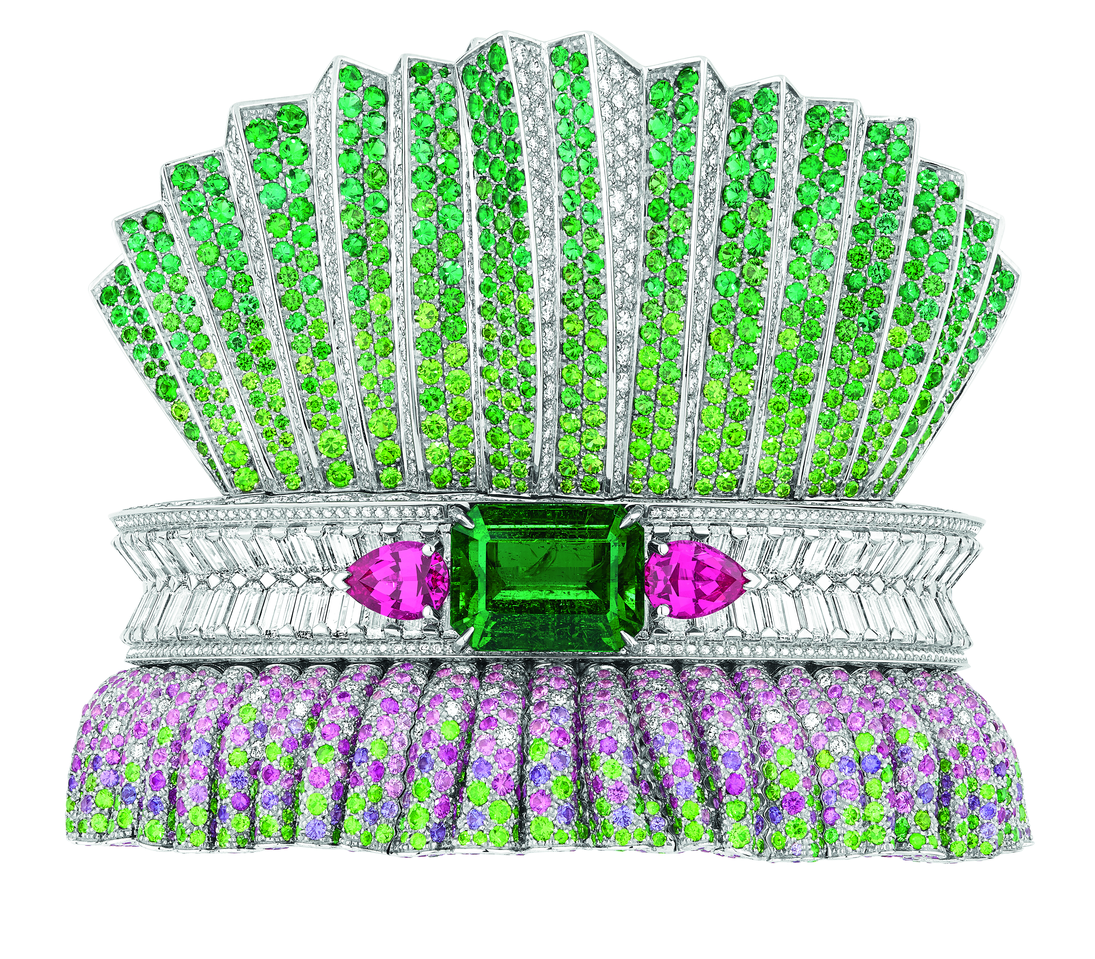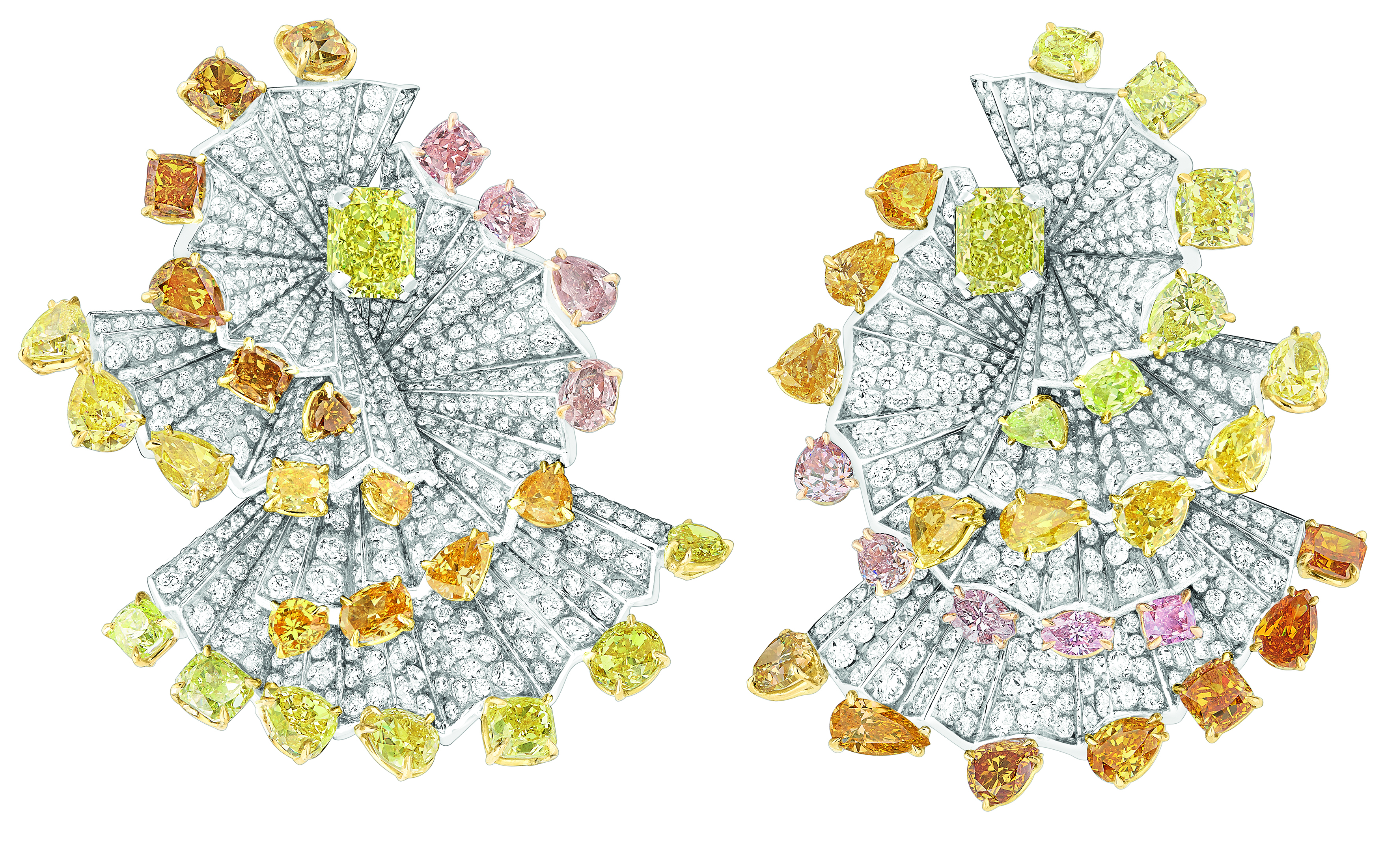 Les bijoux inspirés de la ligne Corolle apparaissent tout en volutes de diamants et d’émeraudes, puis en superpositions de jupes roses. La manchette et la bague Bar, précieux hommage au tailleur iconique de la Maison. Viennent ensuite les exubérants volumes aux incroyables dégradés de couleurs de la ligne Ailée, le drapé piqué d’un diamant jaune de la bague Envol, le tourbillon de pierres multicolores de la ligne Trompe-l’oeil et les lignes géométriques complexes des bijoux Zig-Zag. Victoire de Castellane opère la transmutation du tissu en pierre précieuses, et de la Haute Couture en Haute Joaillerie.