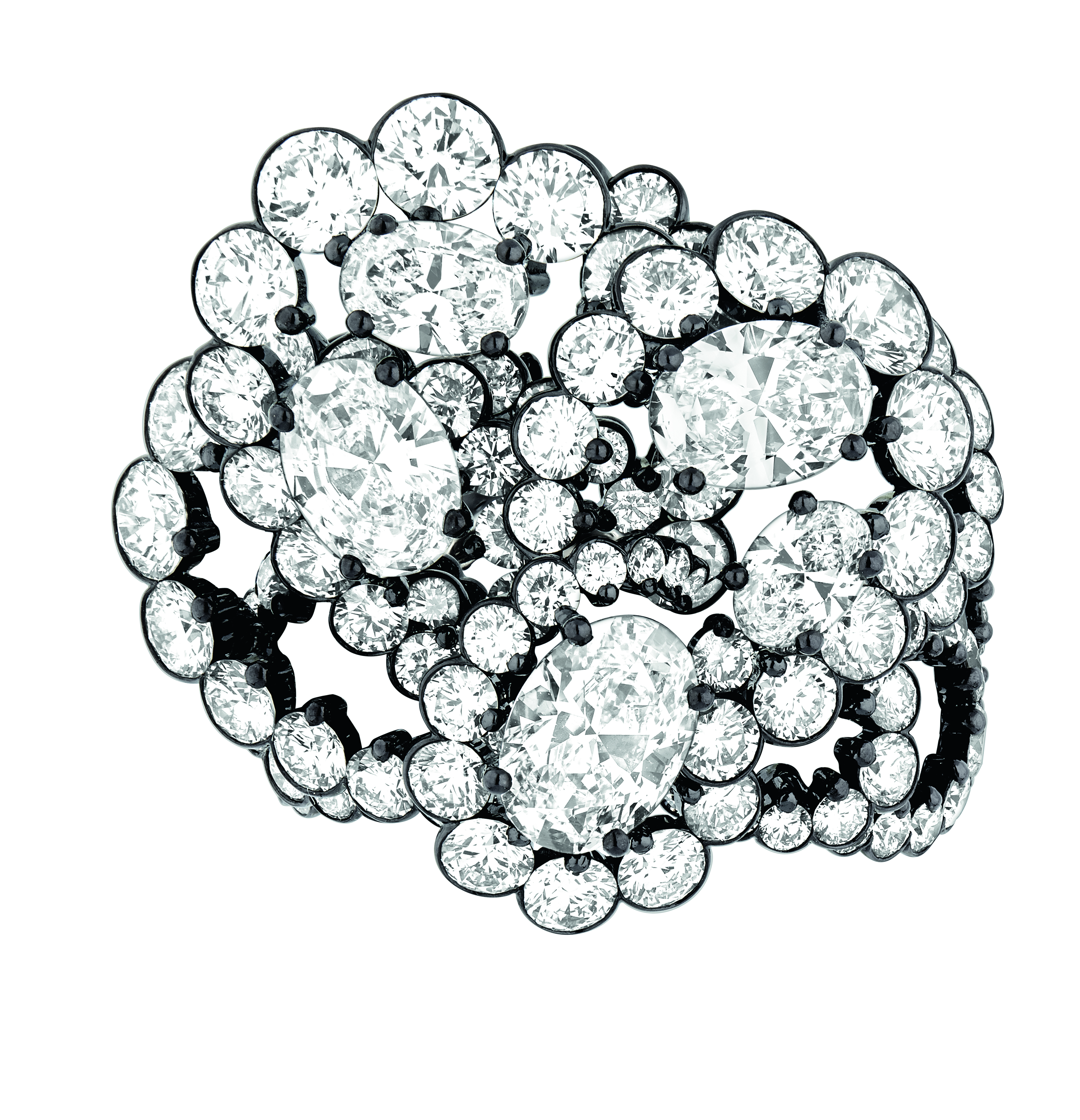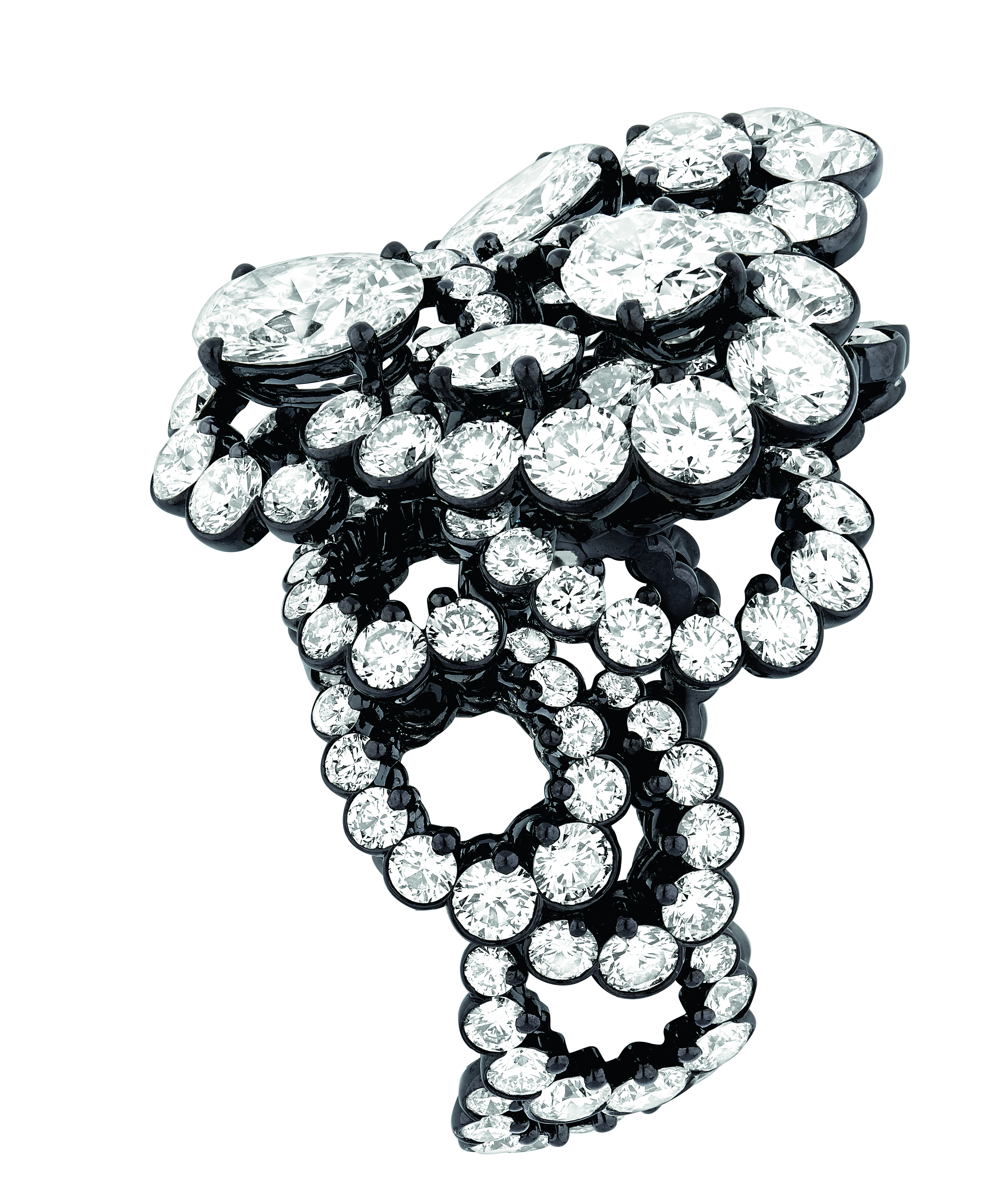 Certaines pièces imitent le mouvement du bas d’une robe qui se soulève au rythme des pas d’une femme. Ce sont des bijoux qui défilent comme des robes de bal. – Victoire de Castellane