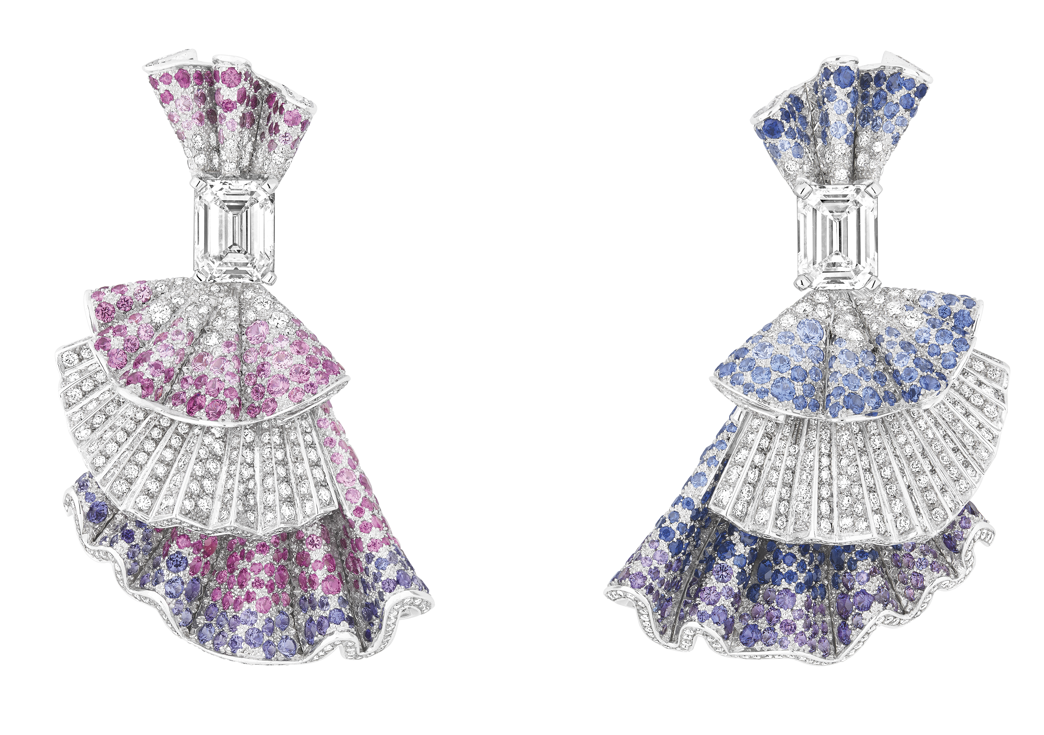 Chaque pièce de la collection emprunte ainsi le nom d’une ligne ou d’une robe iconique, adaptant le mouvement particulier des étoffes au langage de la joaillerie. Les plissés précieux offrent au regard leur silhouette ceinturée de pierreries; l’une dévoile au passage un ruban de diamants, une autre tournoie légèrement pour laisser entrevoir les volants d’un jupon de rubis.