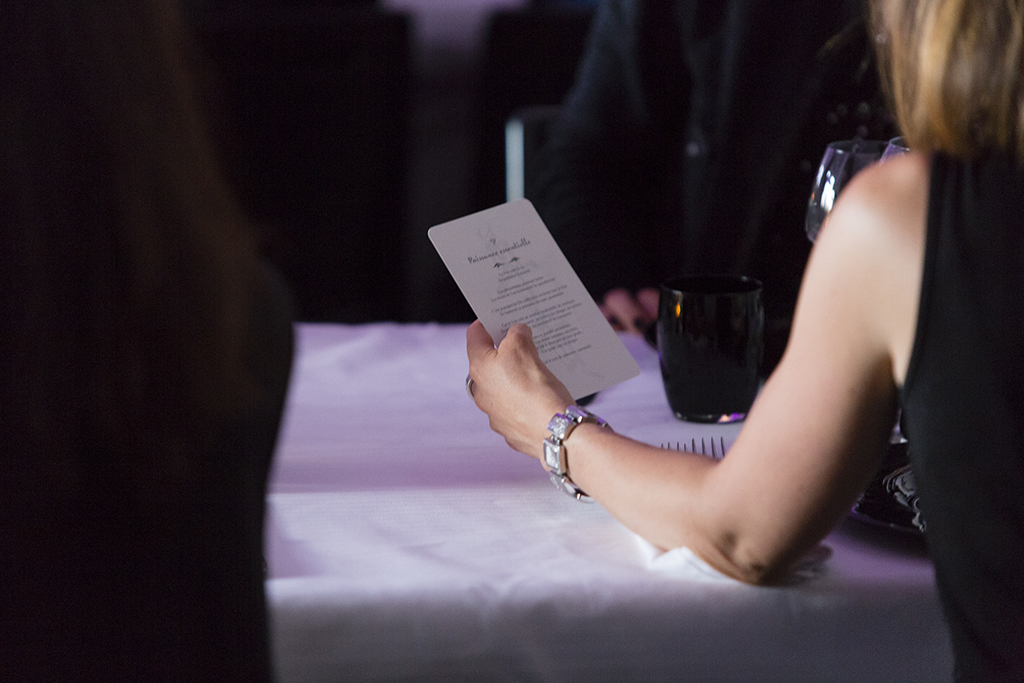 La soirée se passe donc dans le silence temps en temps interrompu par notre master of ceremony qui nous invite ça et là à des expériences de méditations, puis des moments d’opéra. Le silence gêné du début se remplace au fur et à mesure que les plats s’enchainent, les sourires remplacent les paroles. Les fous rires font parti aussi de l’instant quand le silence devient trop pesant. Tout le monde repart en échangeant sur ce qu’il vient de vivre, une expérience hors du temps.