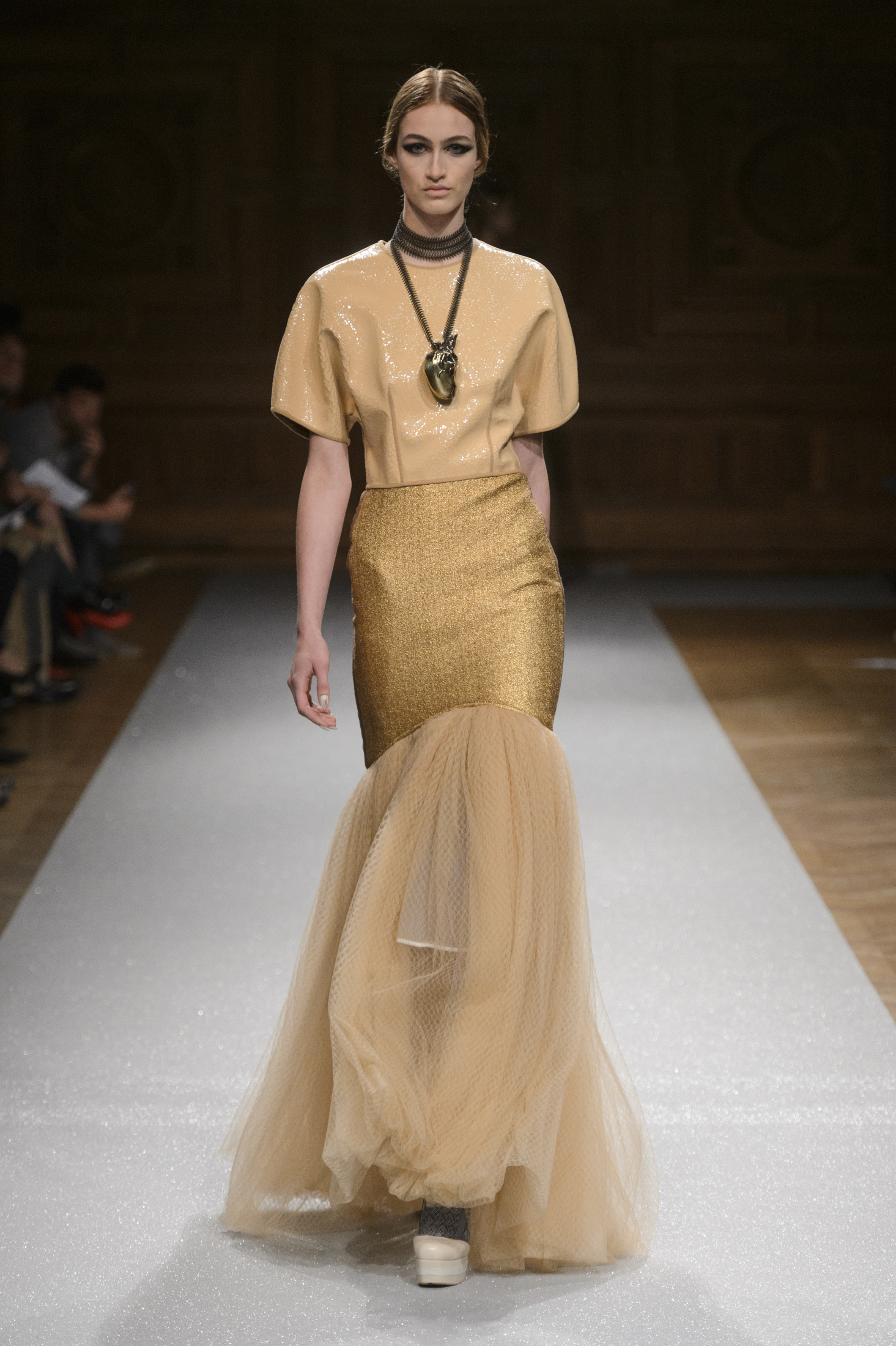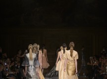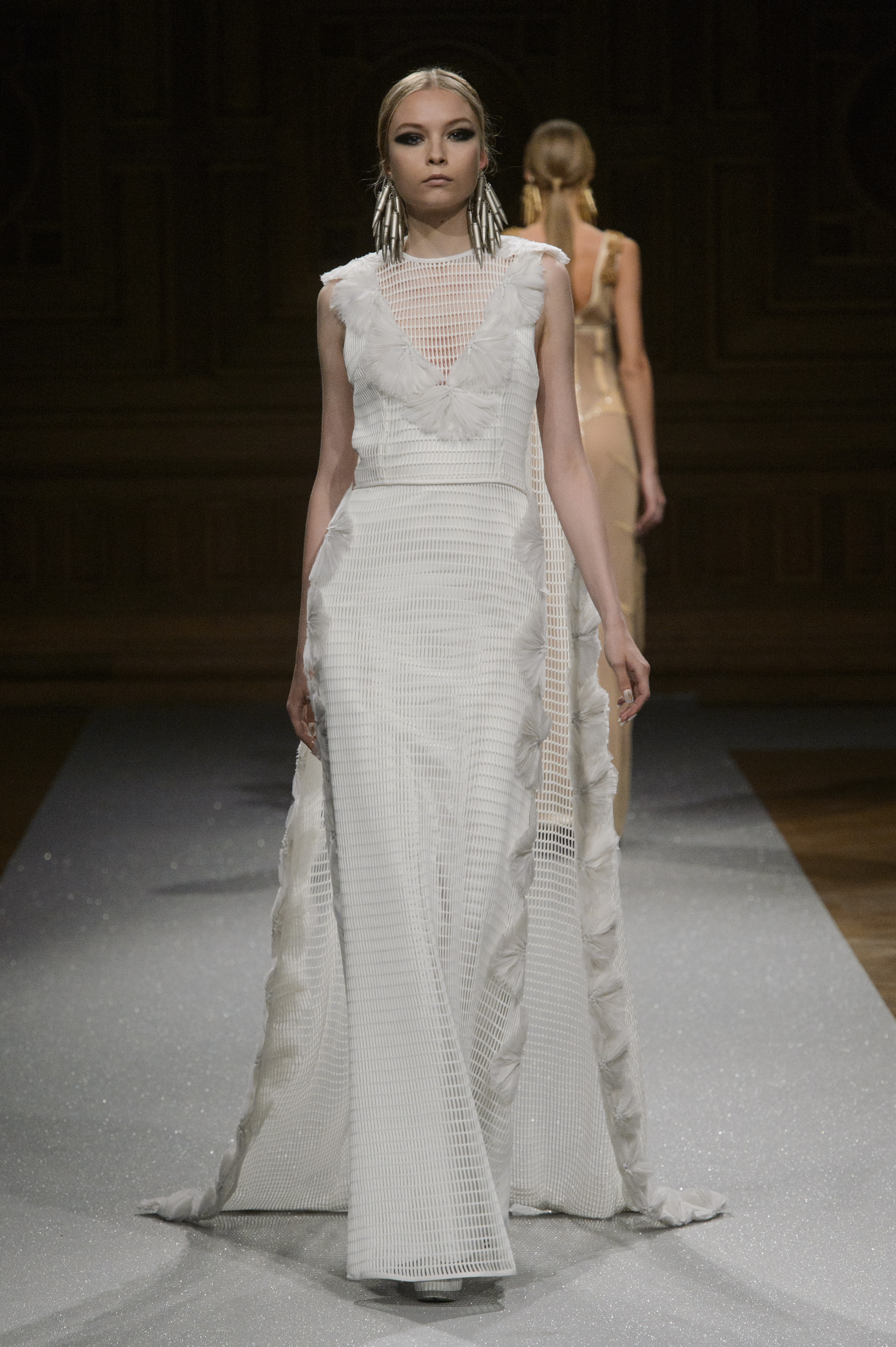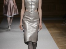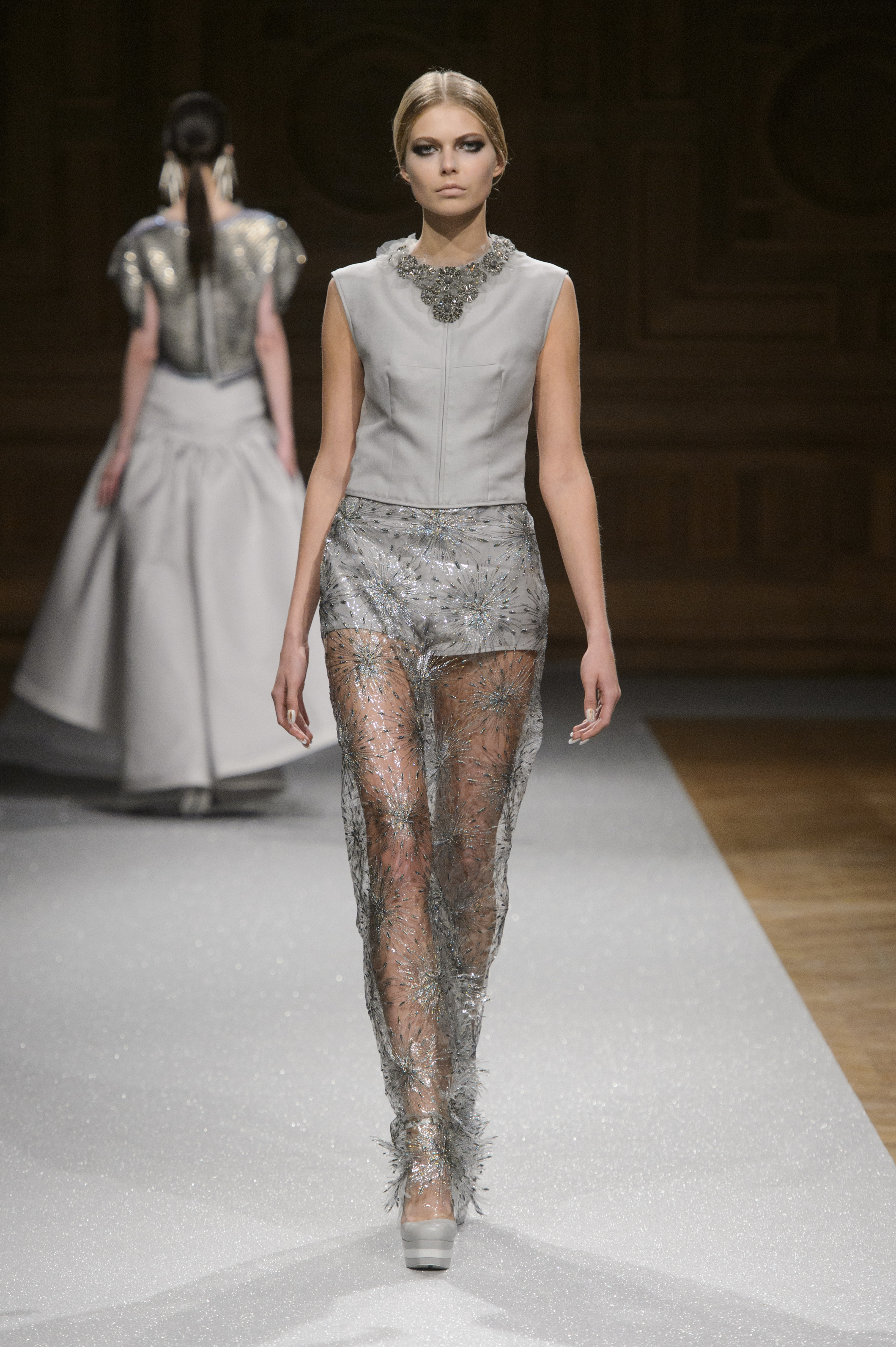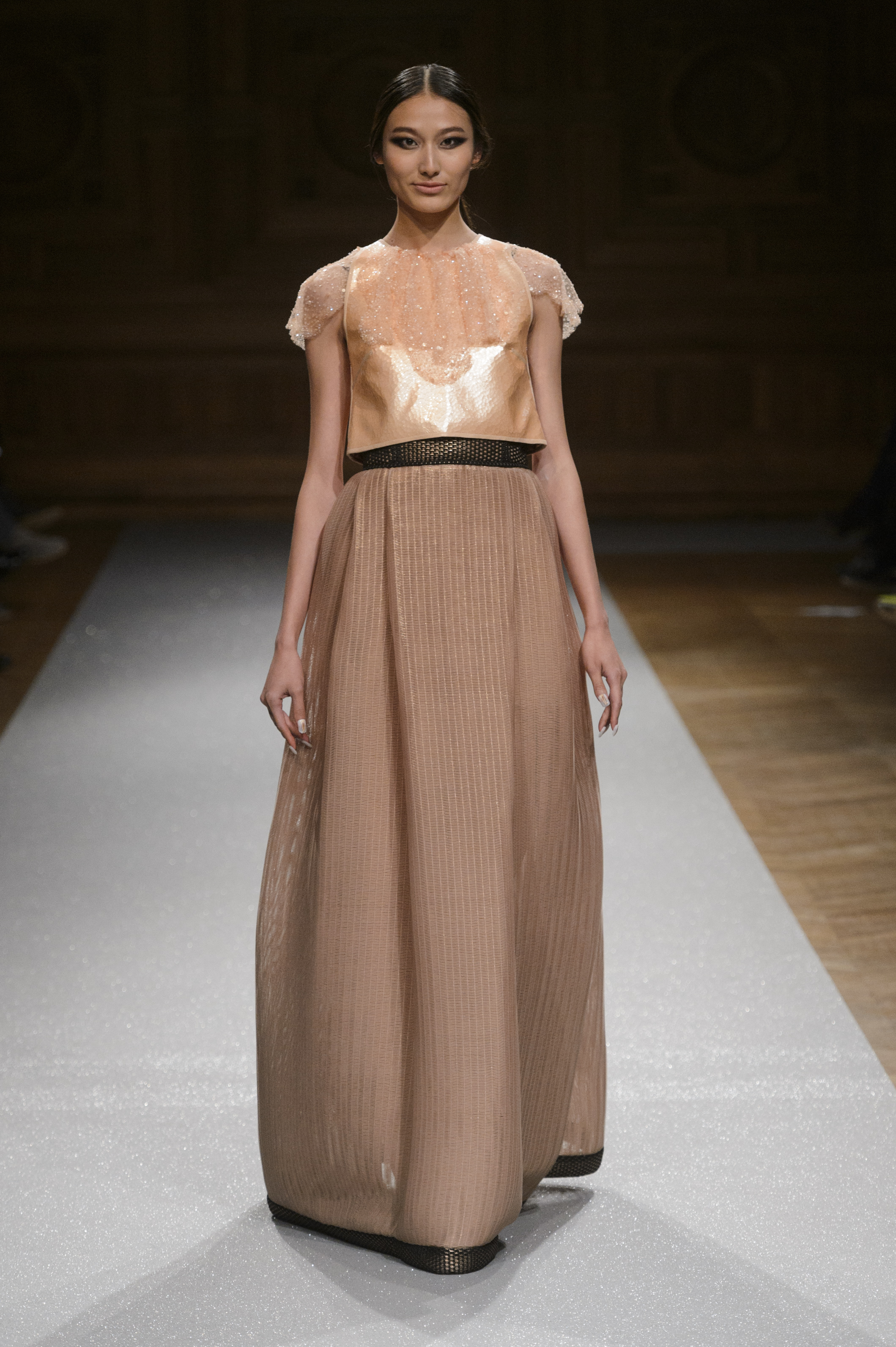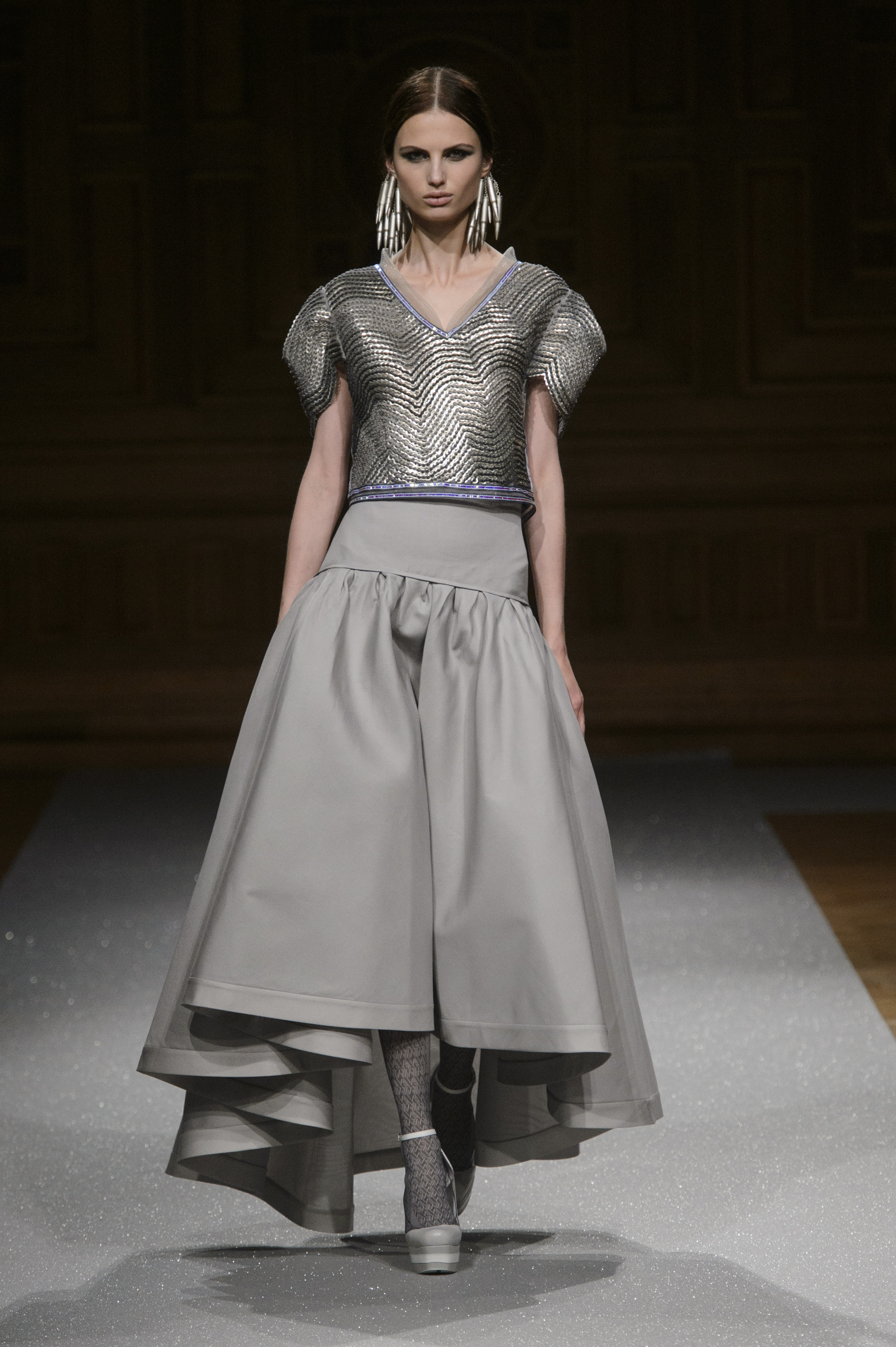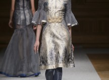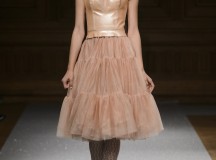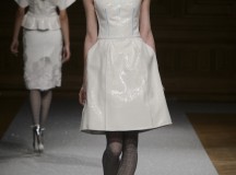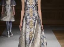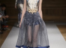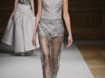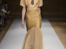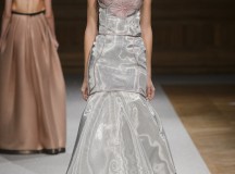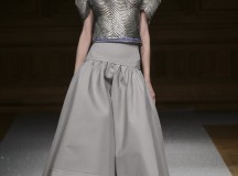 De l’innovation et la recherche de matériaux innovants qui caractérisent la Maison Carvallo, des robes de tulle, mikado et gazar de soie défilent dans des tons dorés, blancs, gris, bleus et roses, ornées de fils de crin, de perles et d’applications de cœurs brodés. Nourris d’influences futuristes, des tops et des robes courtes en cuir nacré scintillent et se fondent dans des jupes en tulle. Des bandes phosphorescentes et des robes en mesh dynamisent des silhouettes déterminées à l’allure sportive.