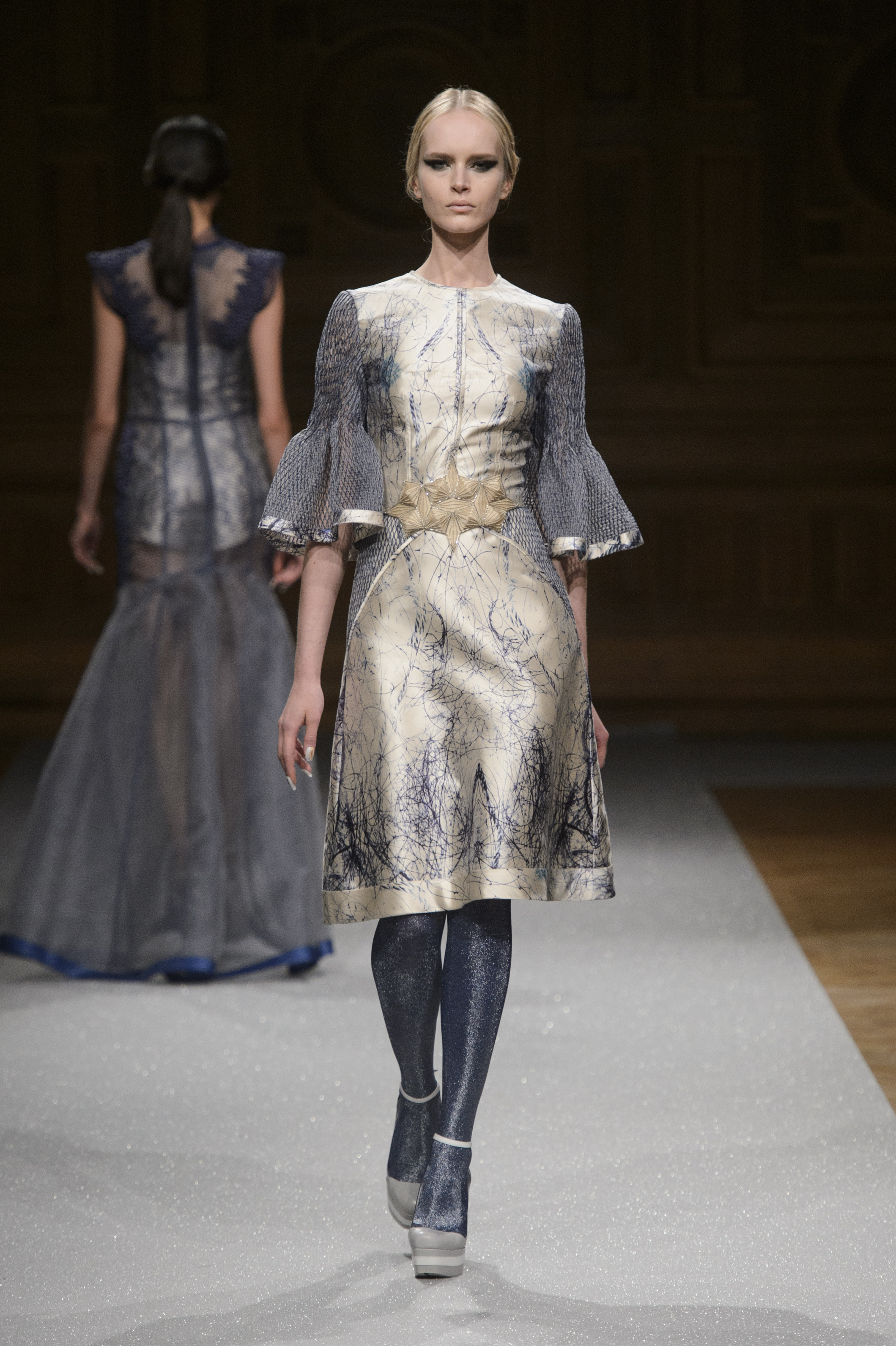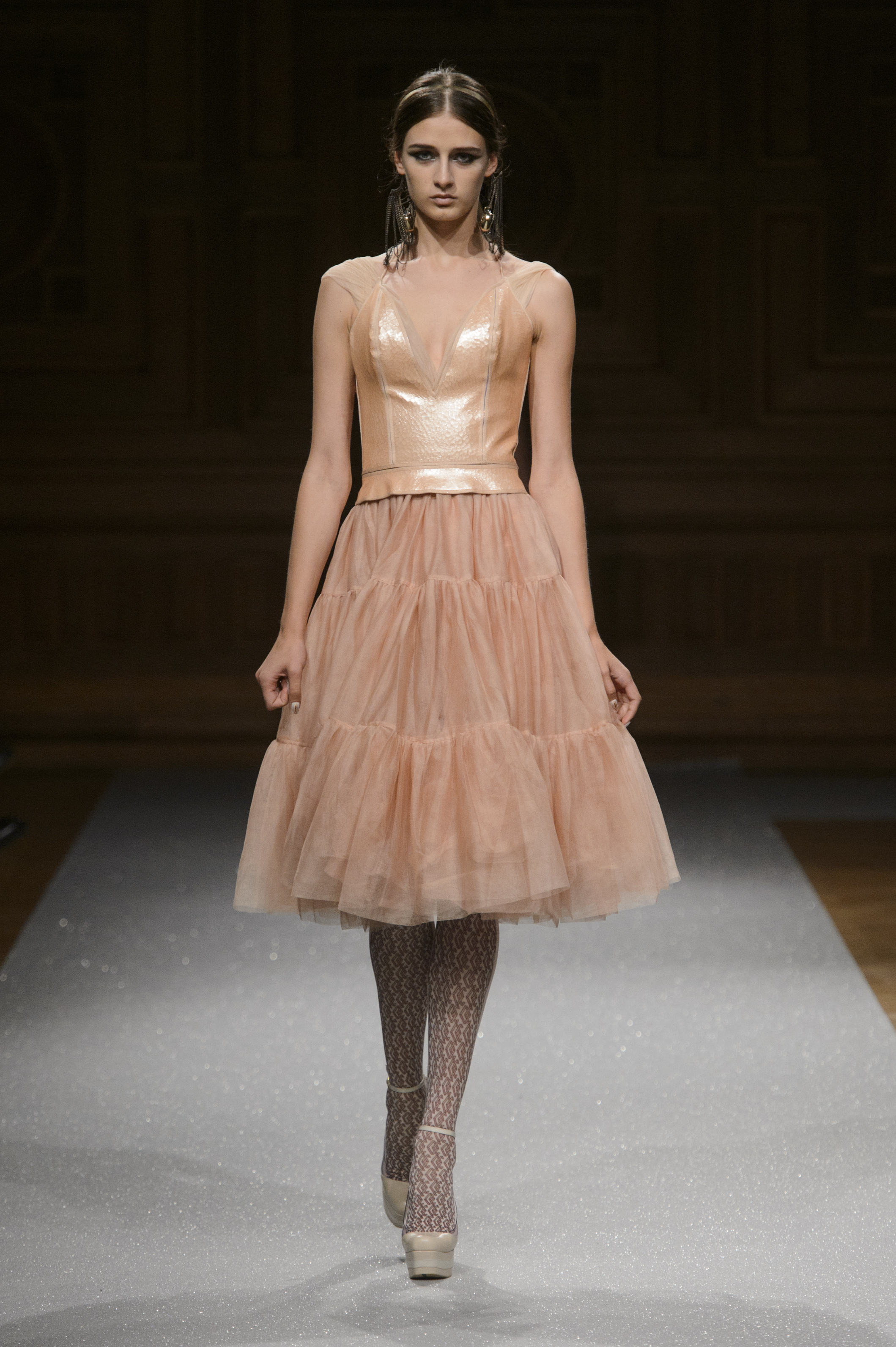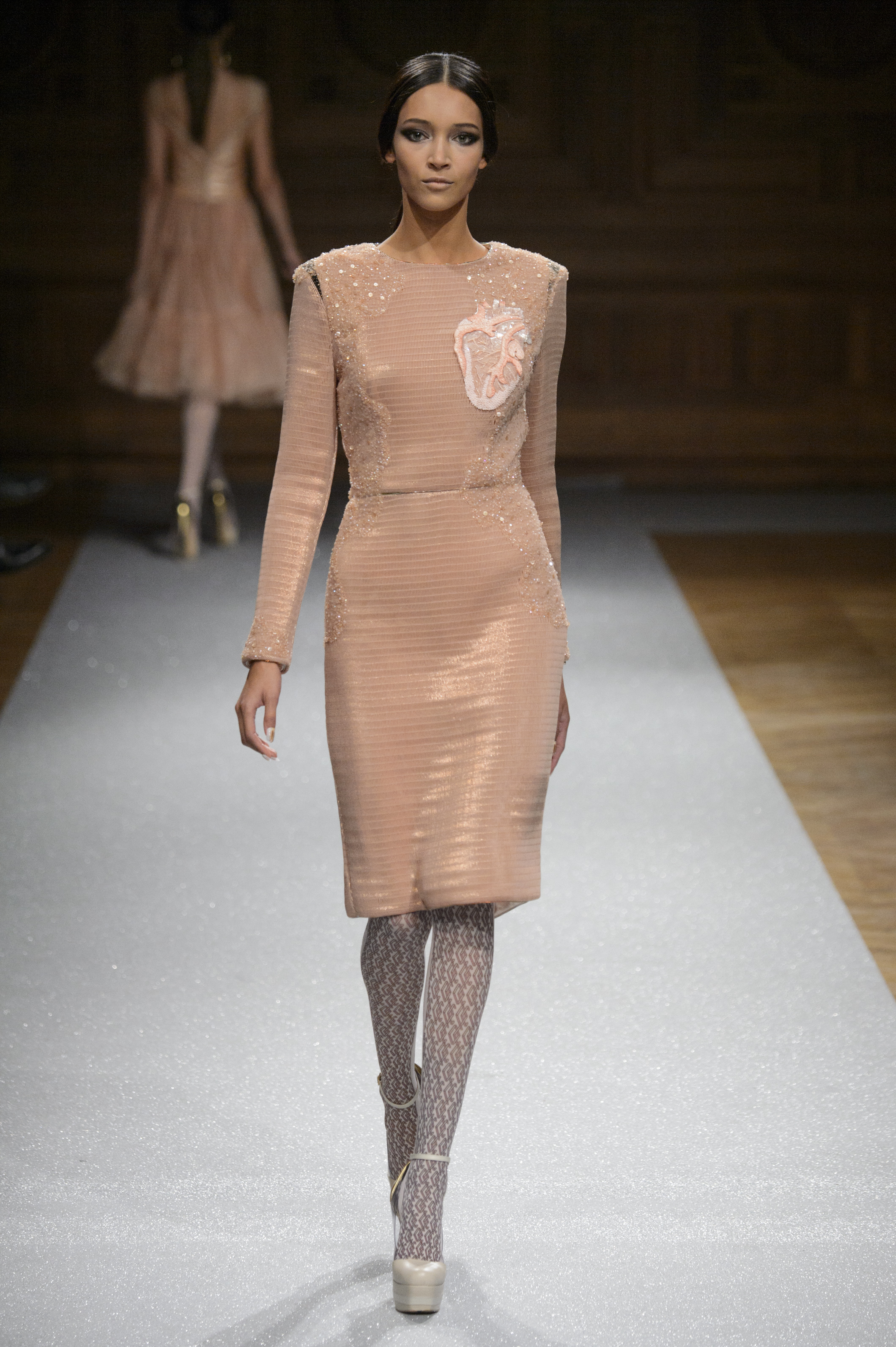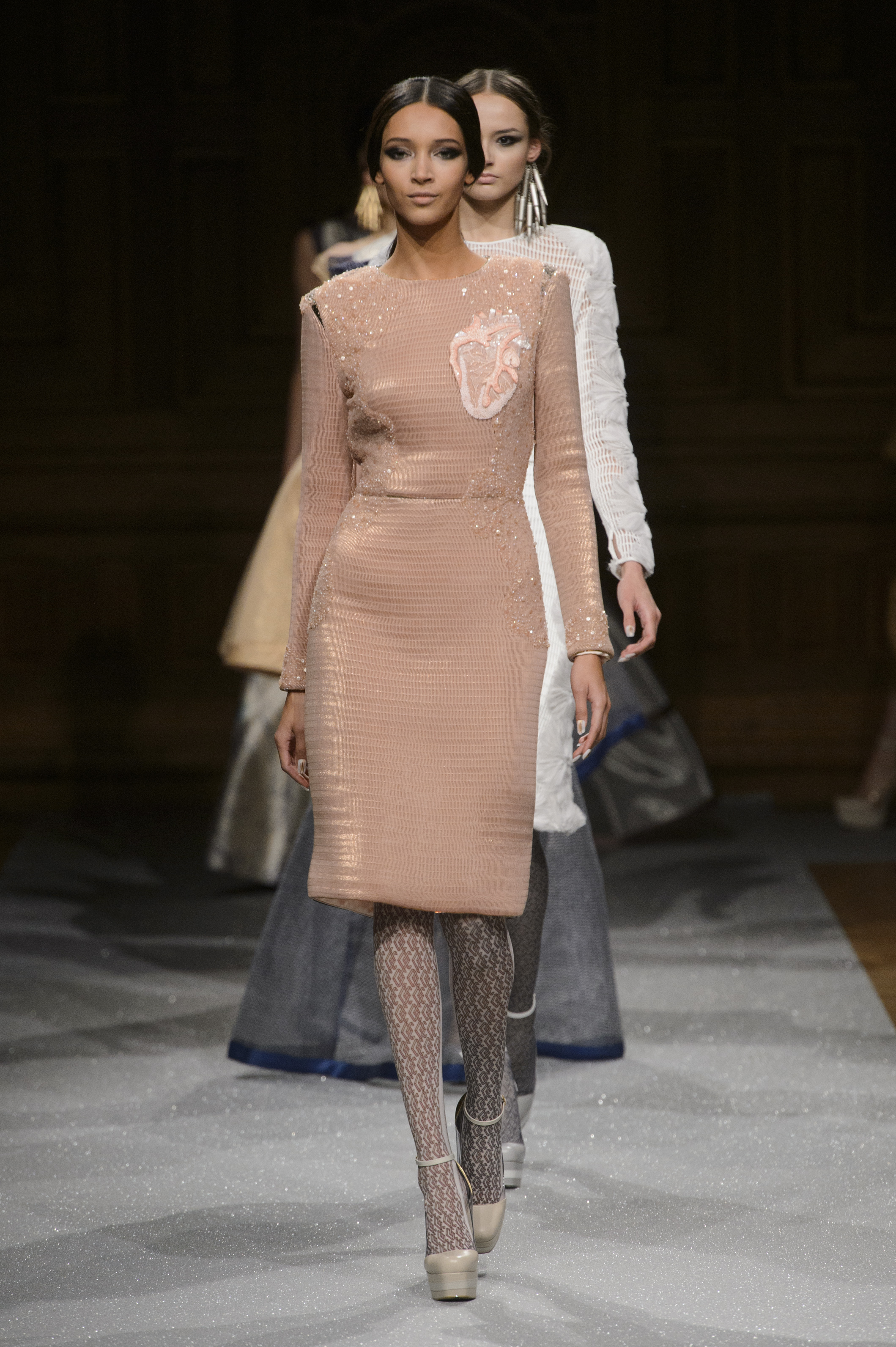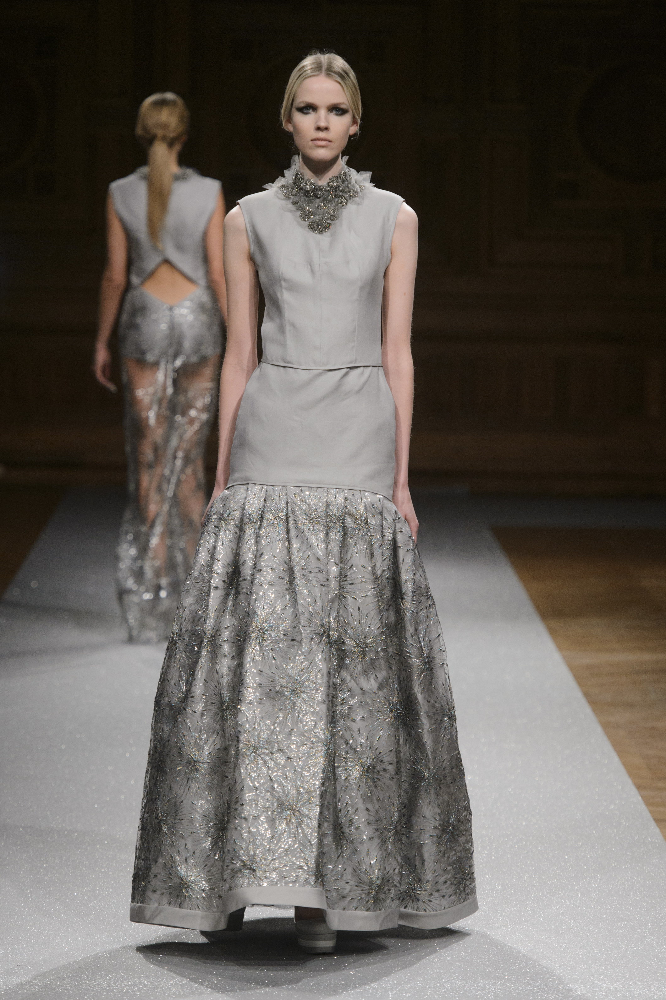 De l’innovation et la recherche de matériaux innovants qui caractérisent la Maison Carvallo, des robes de tulle, mikado et gazar de soie défilent dans des tons dorés, blancs, gris, bleus et roses, ornées de fils de crin, de perles et d’applications de cœurs brodés. Nourris d’influences futuristes, des tops et des robes courtes en cuir nacré scintillent et se fondent dans des jupes en tulle. Des bandes phosphorescentes et des robes en mesh dynamisent des silhouettes déterminées à l’allure sportive.