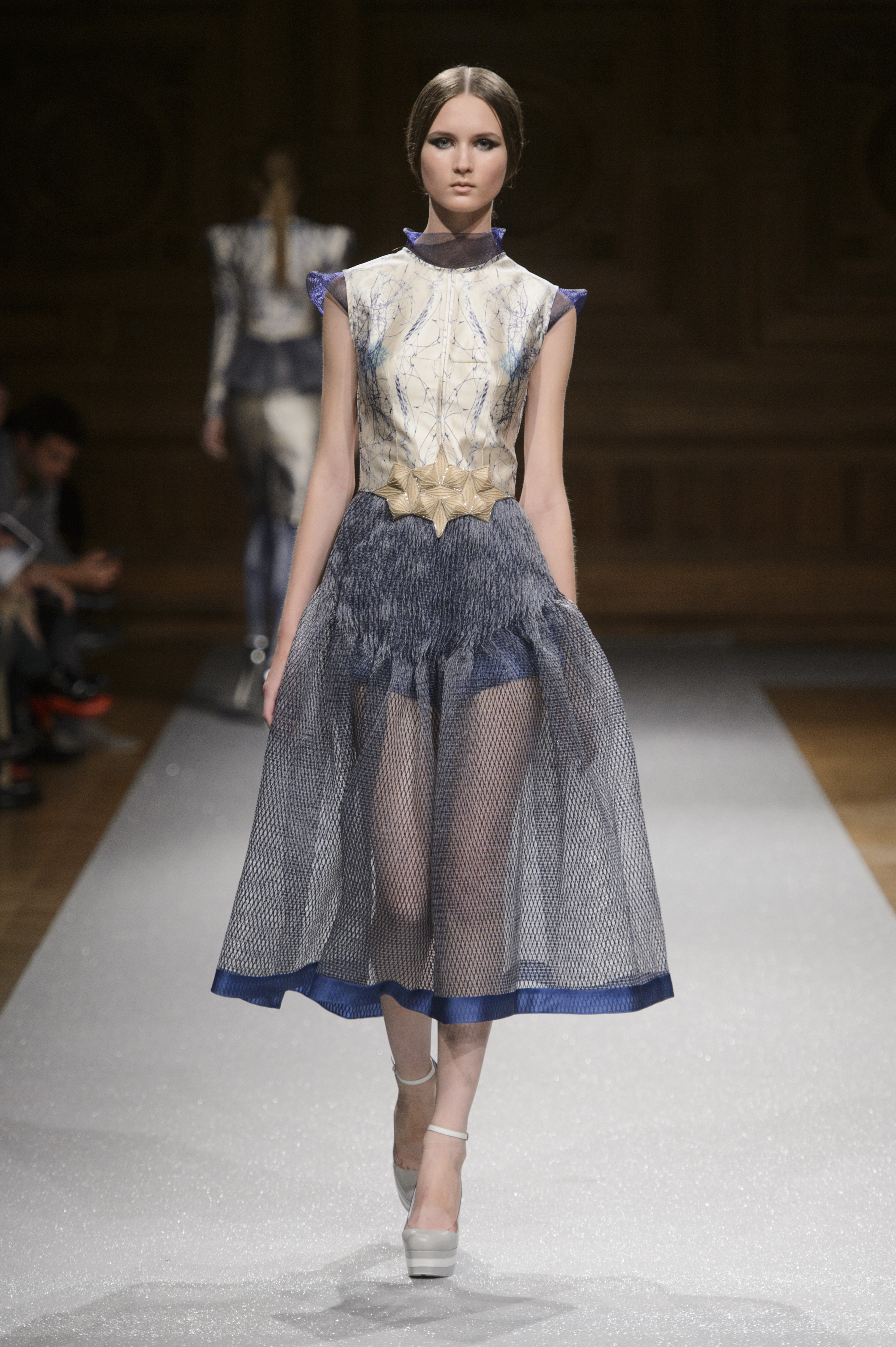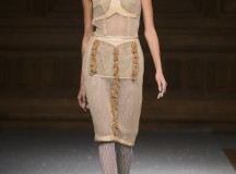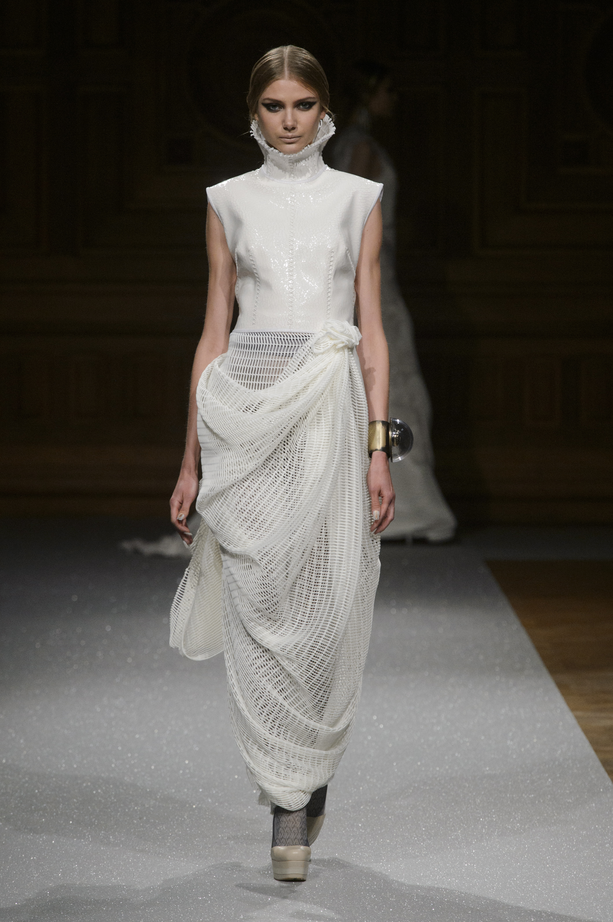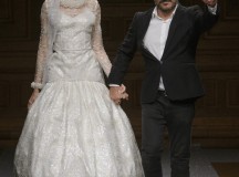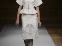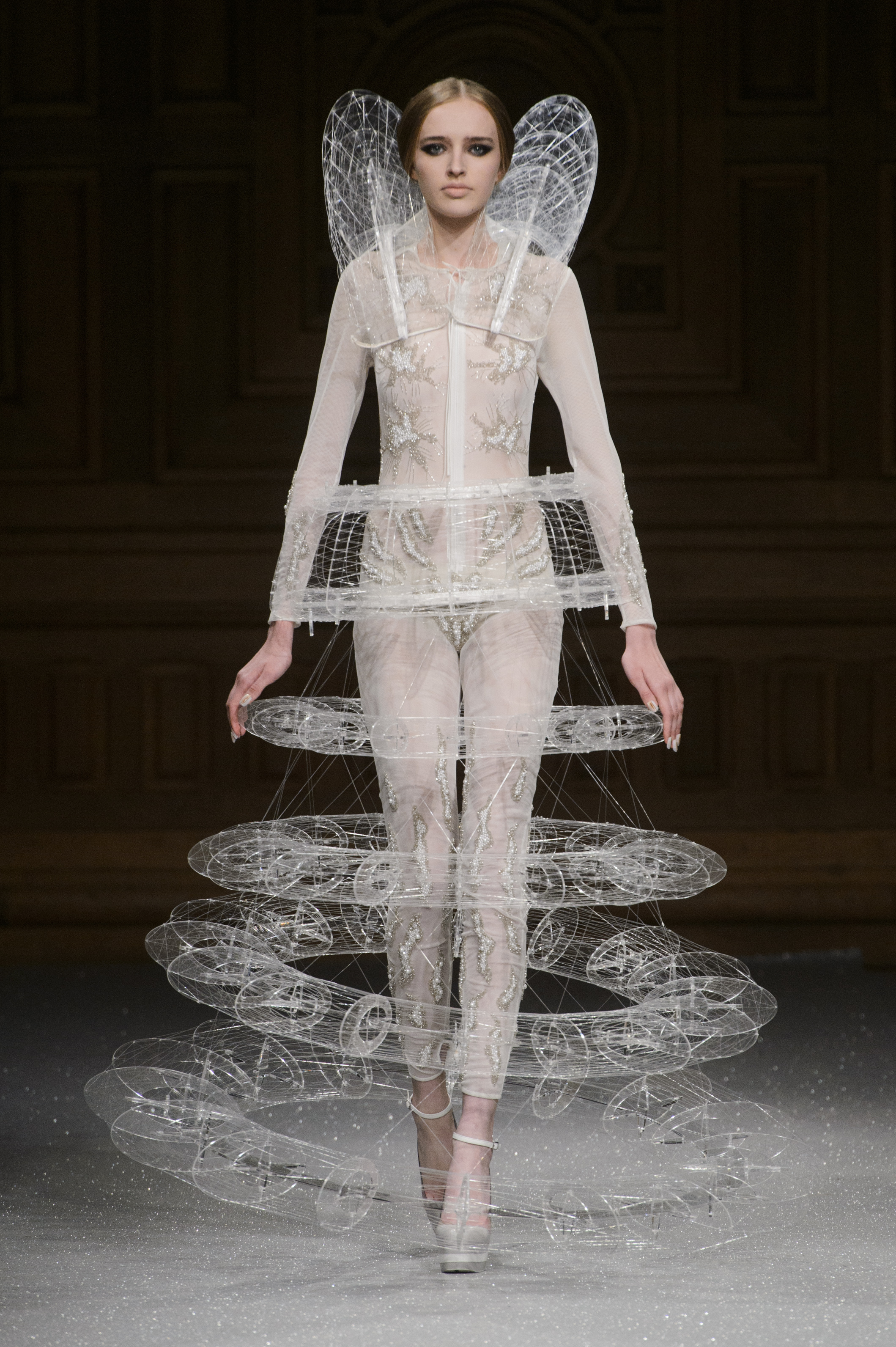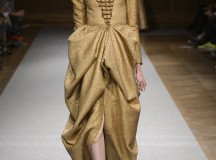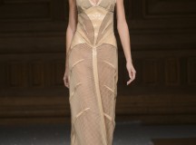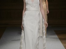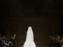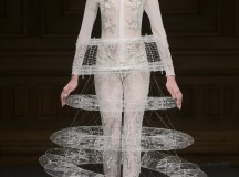 Point d’orgue de la saison, la robe de mariée, réalisée par l’artiste plasticien Pancho Quilici, clôture ce défilé qui nous élève vers d’autres sphères. Cette structure corporelle propose une piste de réflexion sur l’habit comme refuge et véhicule de survie.