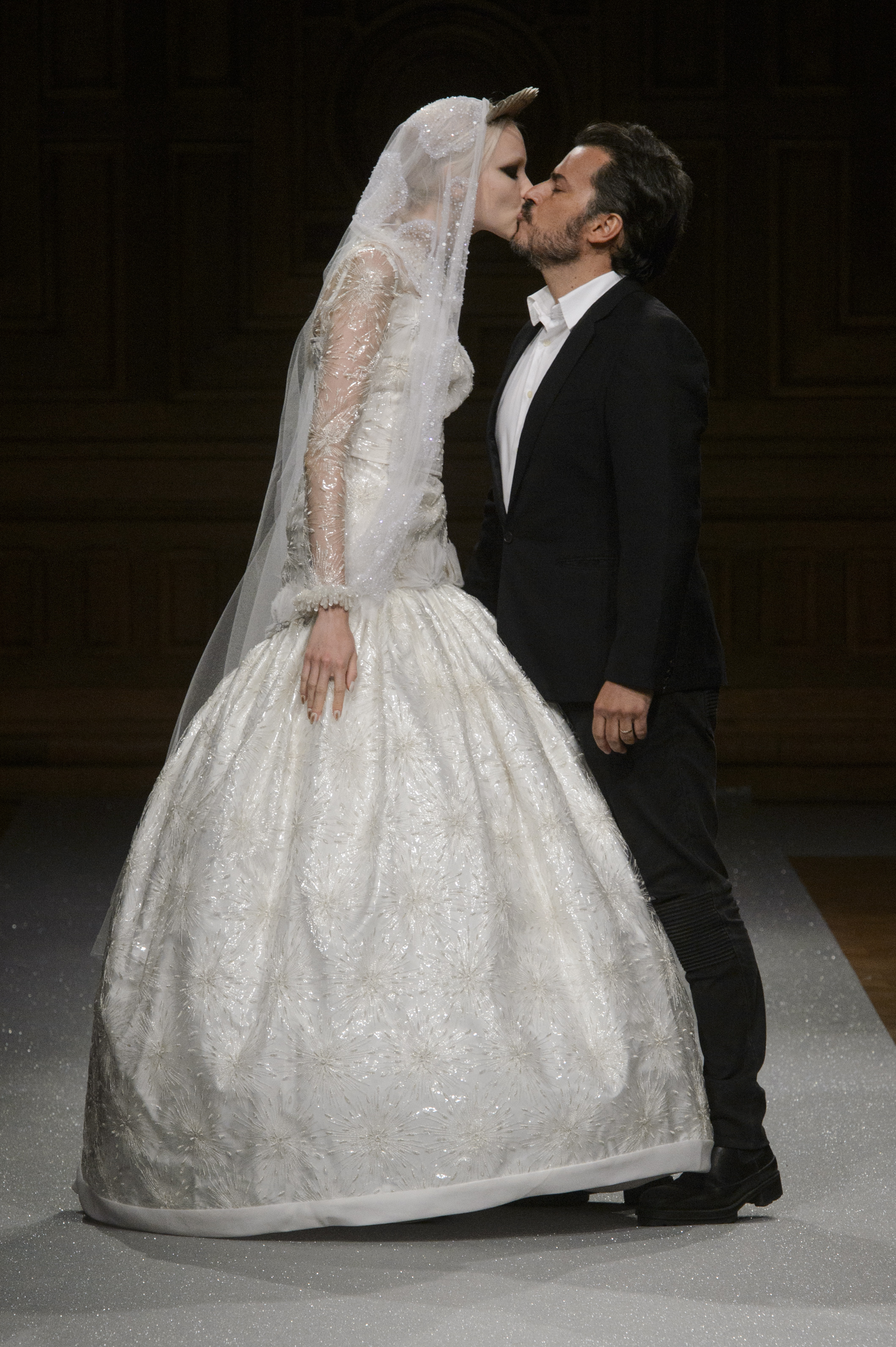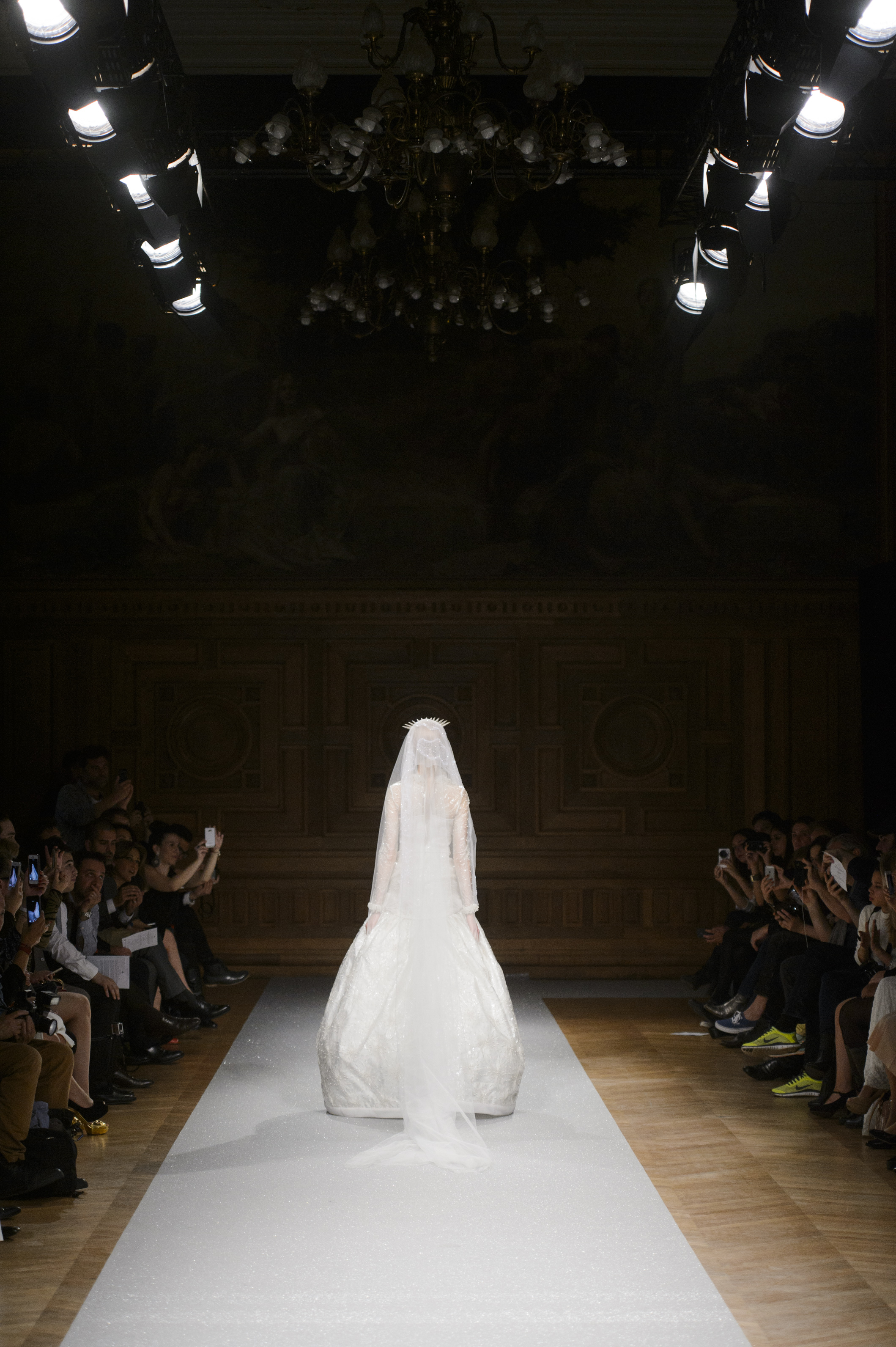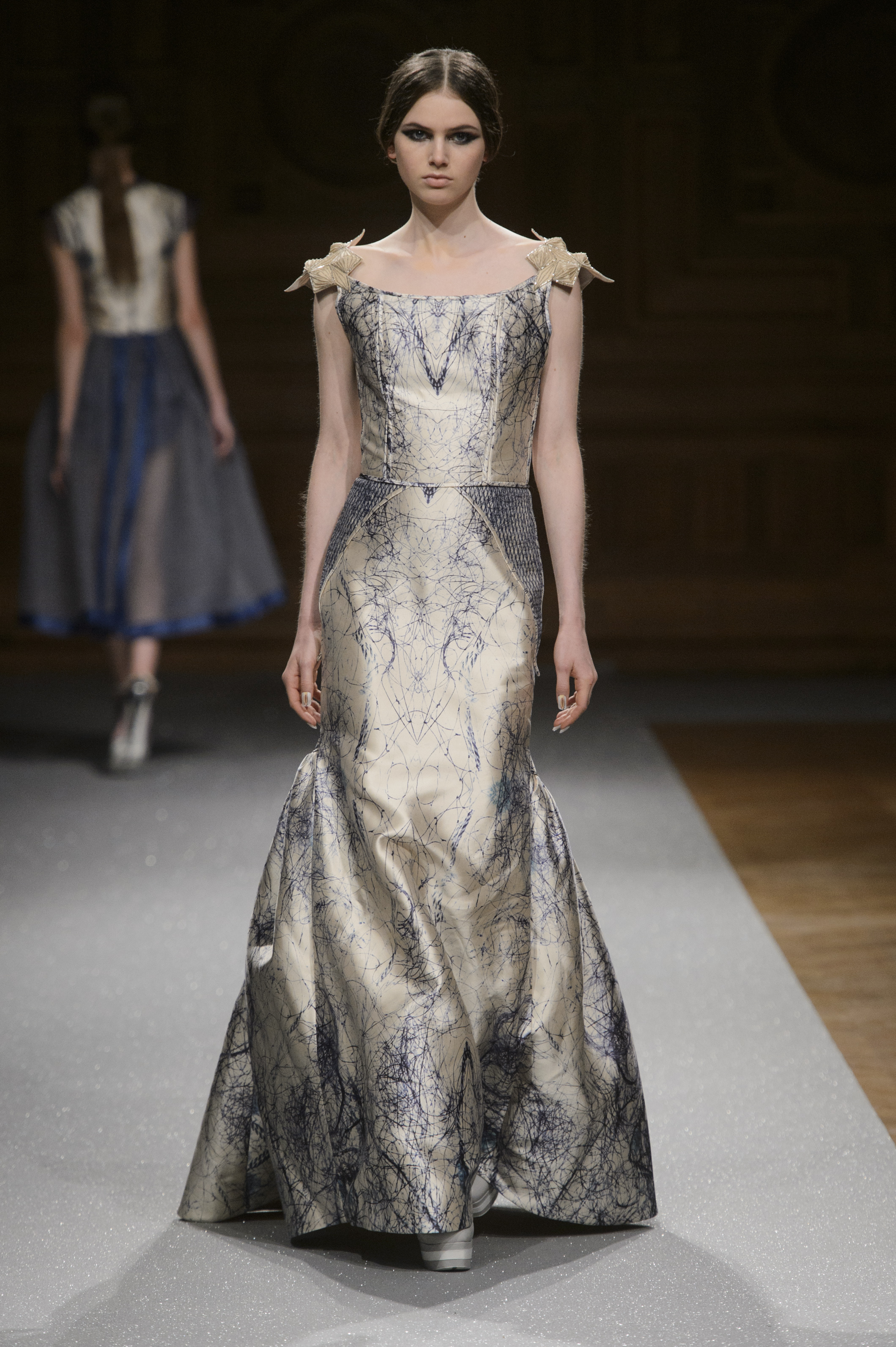 Point d’orgue de la saison, la robe de mariée, réalisée par l’artiste plasticien Pancho Quilici, clôture ce défilé qui nous élève vers d’autres sphères. Cette structure corporelle propose une piste de réflexion sur l’habit comme refuge et véhicule de survie.