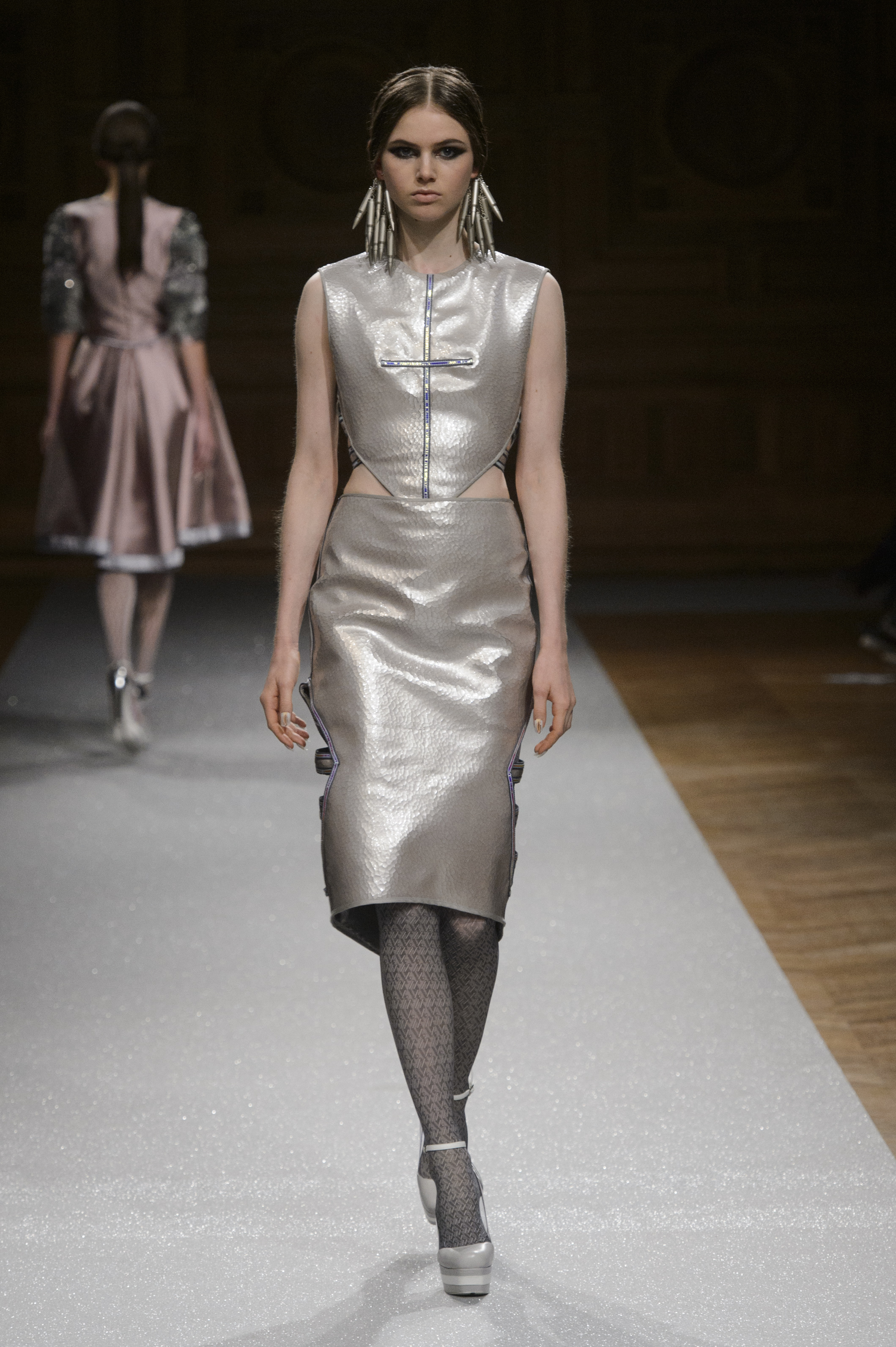 D’une atmosphère céleste et apaisée, se détachent des accessoires oxydés qui évoquent les combats passés : boucles d’oreilles, colliers et ceintures conçues avec des cartouchières et des balles authentiques, plastrons et bracelets globes siglés « SOS », et accessoires en forme de cœurs ouverts. Pièces emblématiques de la Maison Oscar Carvallo, les collants monogrammés OC accompagnent les silhouettes dans des tons rose poudré et gris anthracite.