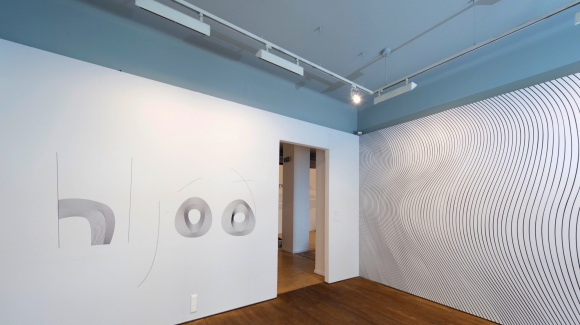 L’artiste islandaise Runa Egilsdottir a crée une œuvre murale en rapport avec l’écoute. Hljod, son ou silence en islandais, en fonction de l’interprétation, met l’accent sur la perception. Le grand mur blanc a été strié de traits fins. Le dessin devient trame à interprétation.