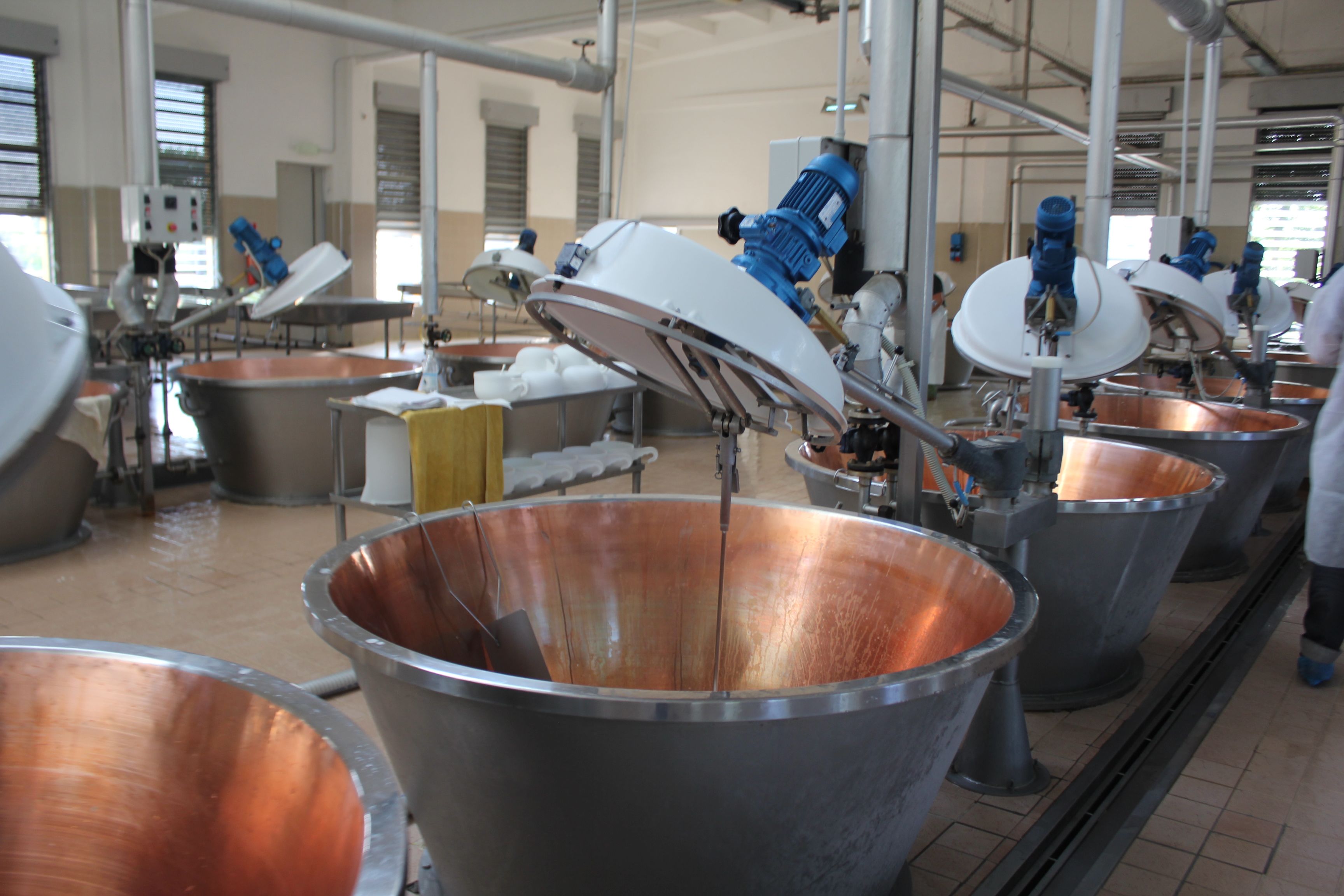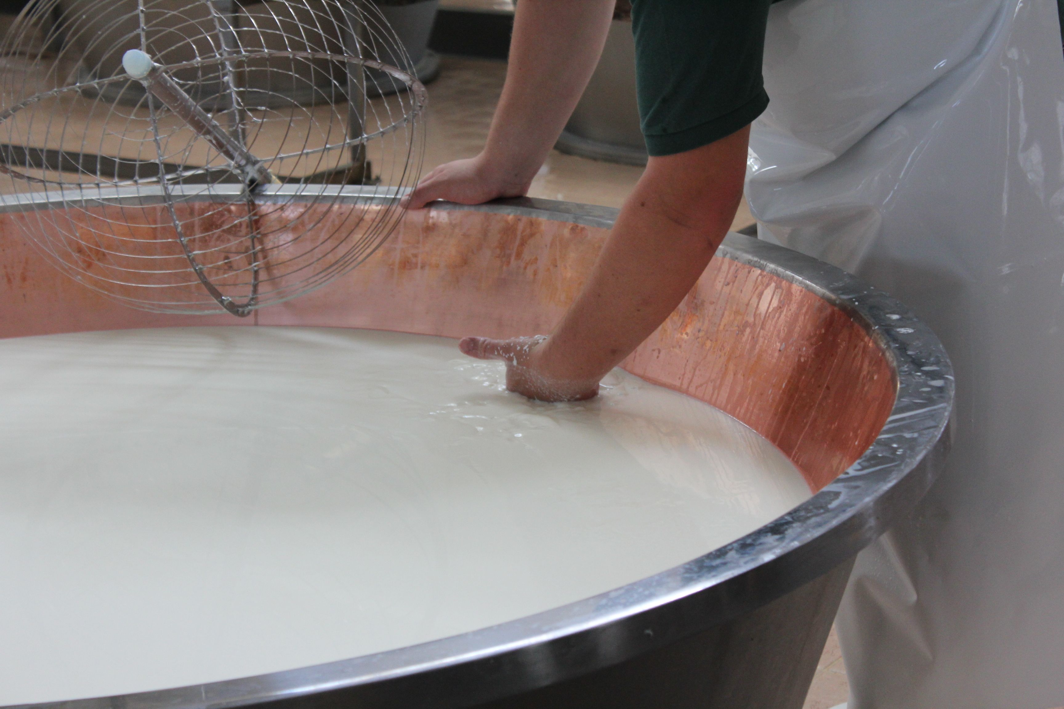 Le lait de la traite du soir, partiellement écrémé par affleurement naturel des matières grasses, est mélangé dans les chaudrons de cuivre, en forme de cloche renversée, au lait entier du matin suivant.
