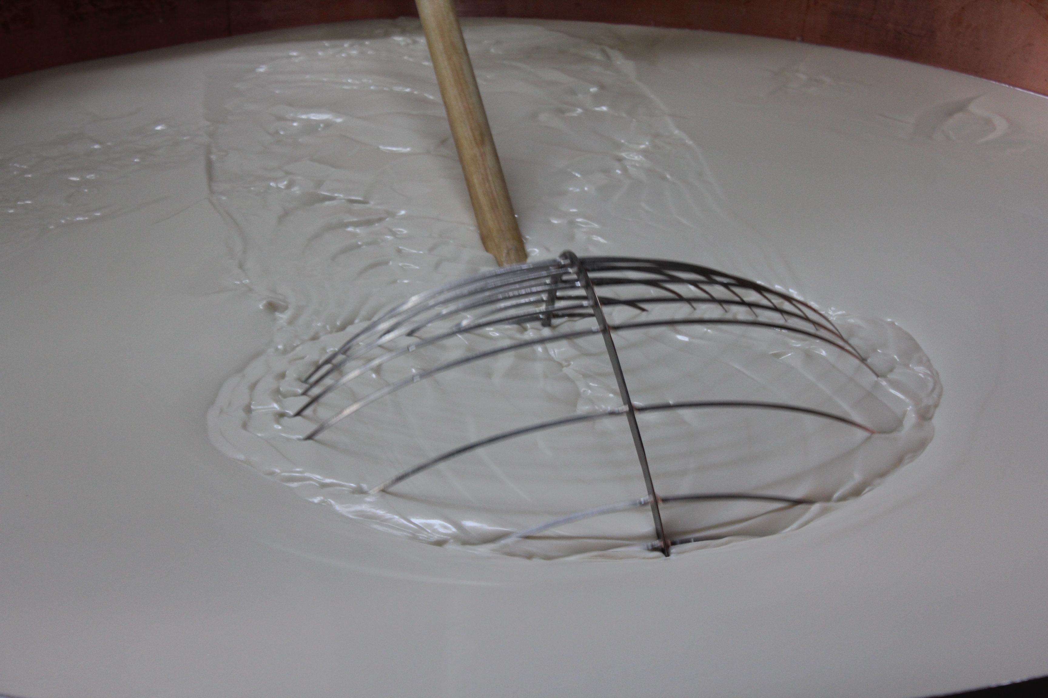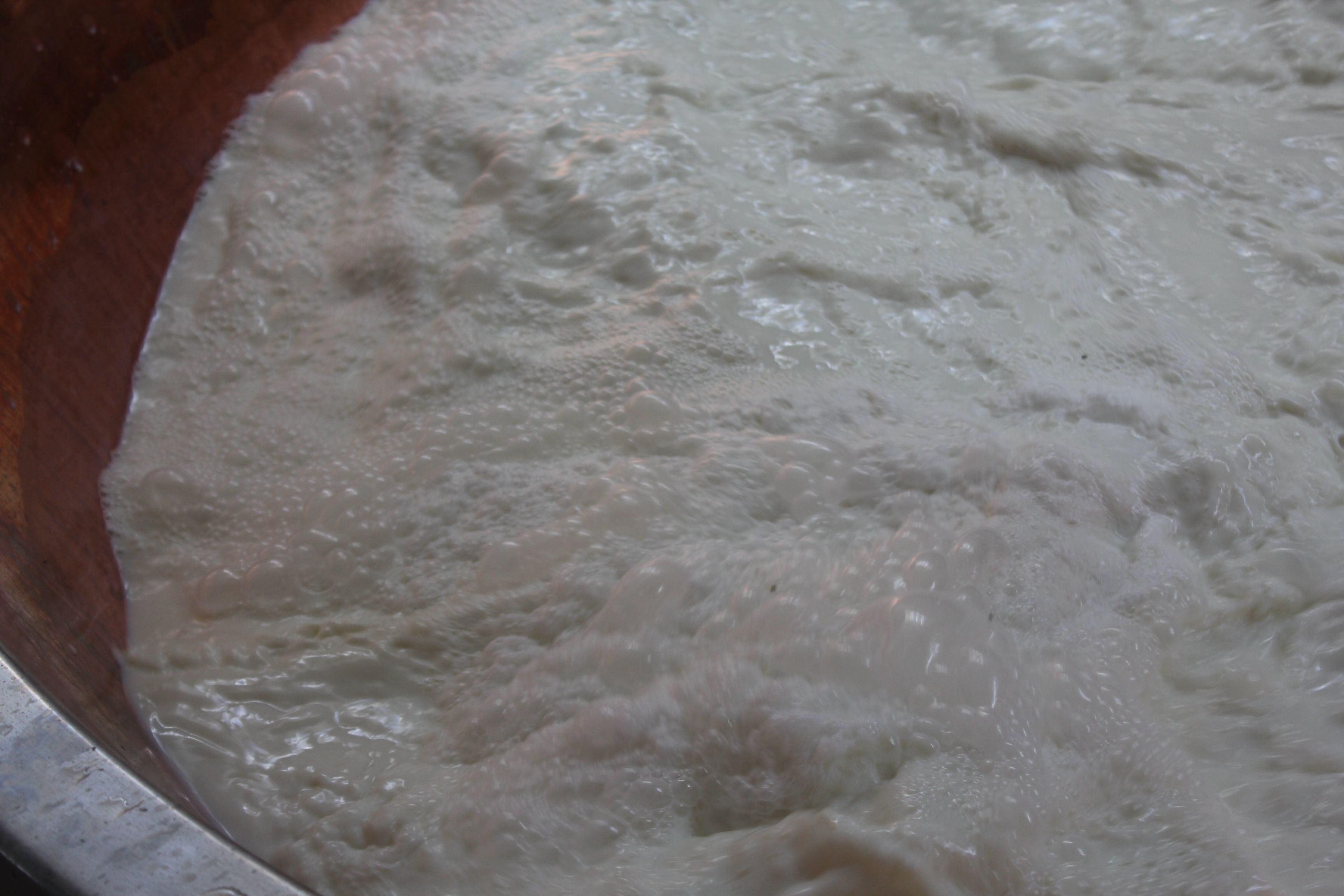 Le lait chauffé à 33-35°C reçoit le séro-ferment, culture naturelle de ferments lactiques obtenue à partir du lactosérum (petit lait) prélevé lors de la fabrication de la veille.