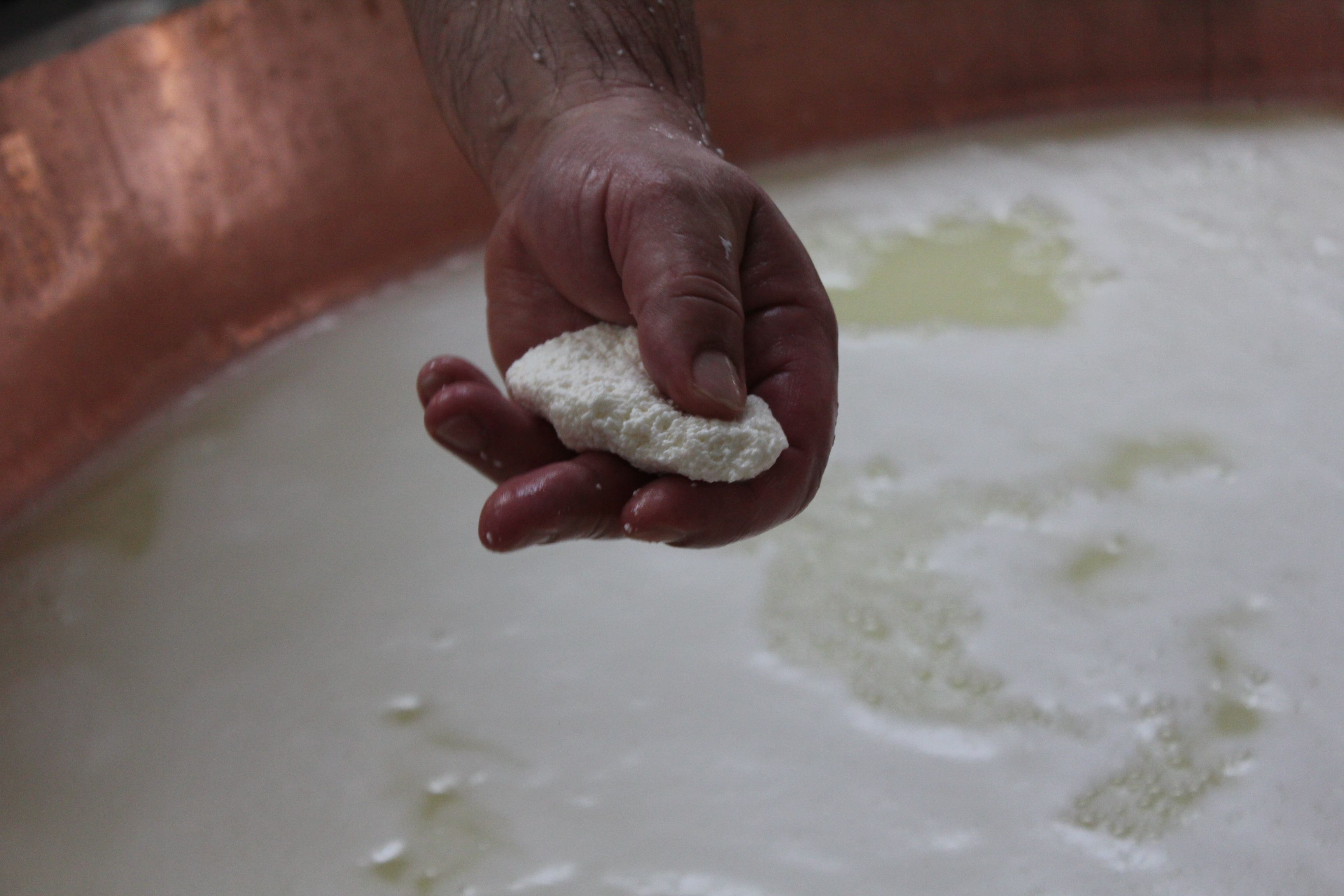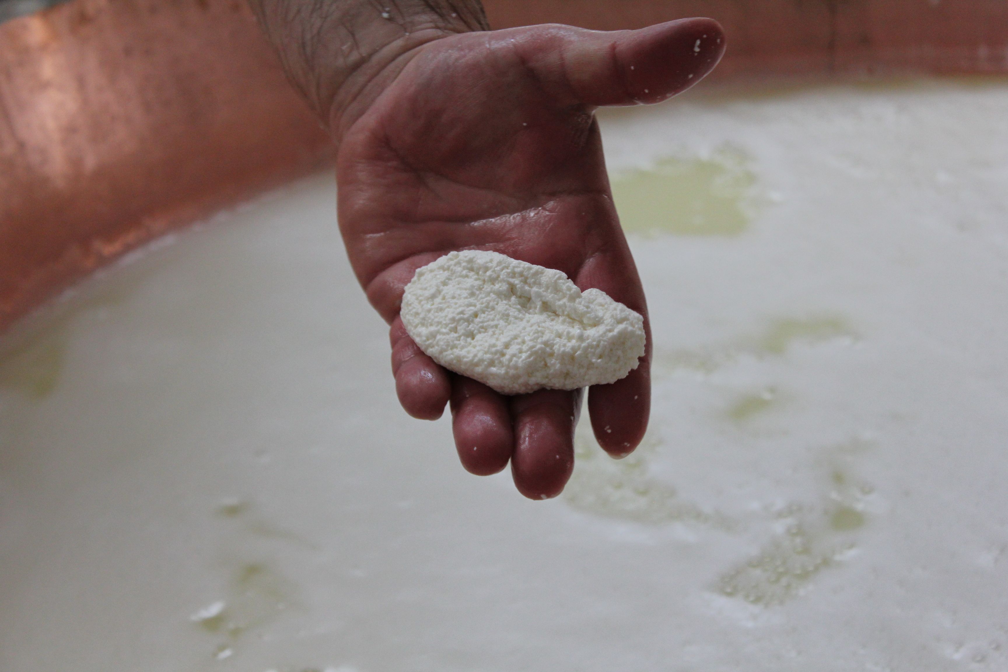 Entrée en scène de l’étonnante spinatura, tranche-caillé traditionnel, maniée avec un geste de gondolier. Le caillé est brisé en petits grains.