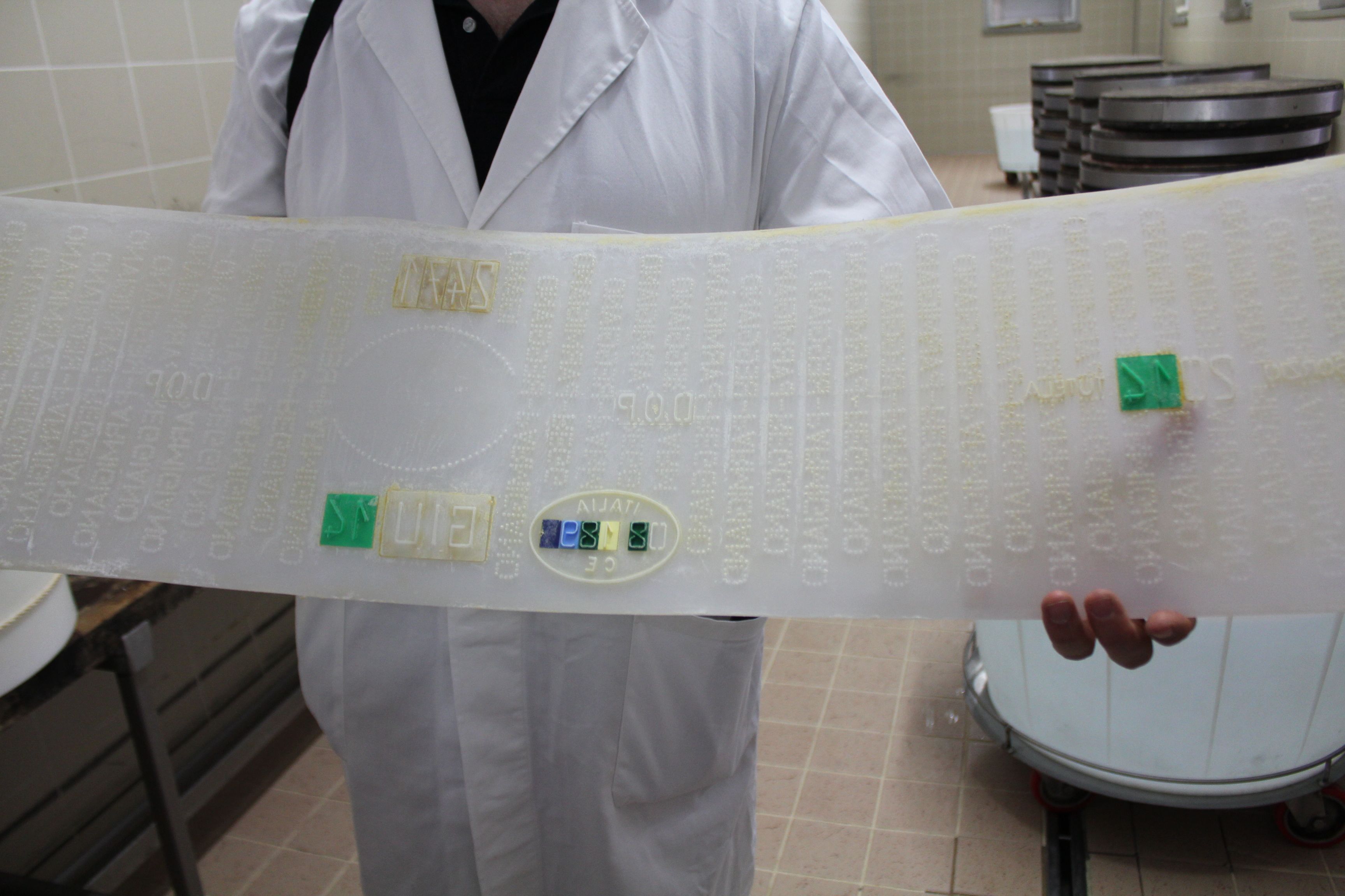 Le marquage s’effectue en deux temps. 1er marquage : la plaque de caséine apposée sur chaque meule fraîche comporte le code d’identification univoque (année de production), les lettres CFPR (Consorzio del Formaggio Parmigiano Reggiano), le code alphanumérique et/ou les flashcodes. Elle permet l’identification de la meule et assure sa traçabilité. 2e marquage : le premier jour d’égouttage, la matrice de marquage circulaire introduite entre le fromage et le moule grave sur le pourtour talon du fromage les lignes de pointillés typiques, le nom Parmigiano Reggiano, le matricule de la fromagerie, le mois et l’année de production, enfin les mentions DOP (AOP européenne) et Consorzio Tutela (Consortium de Tutelle).