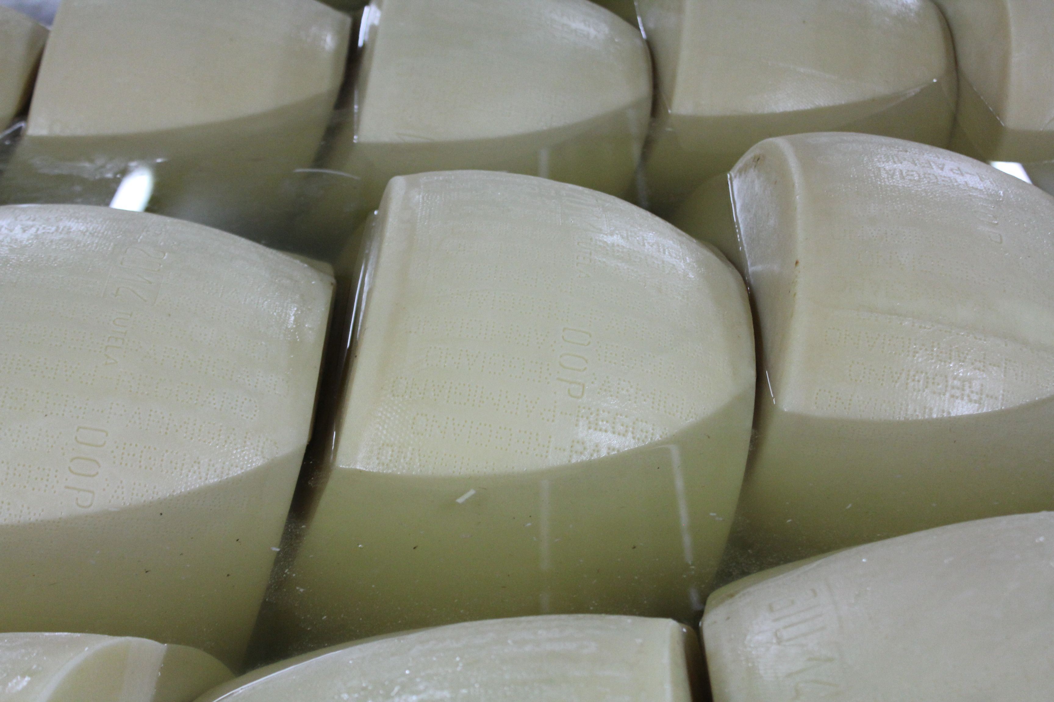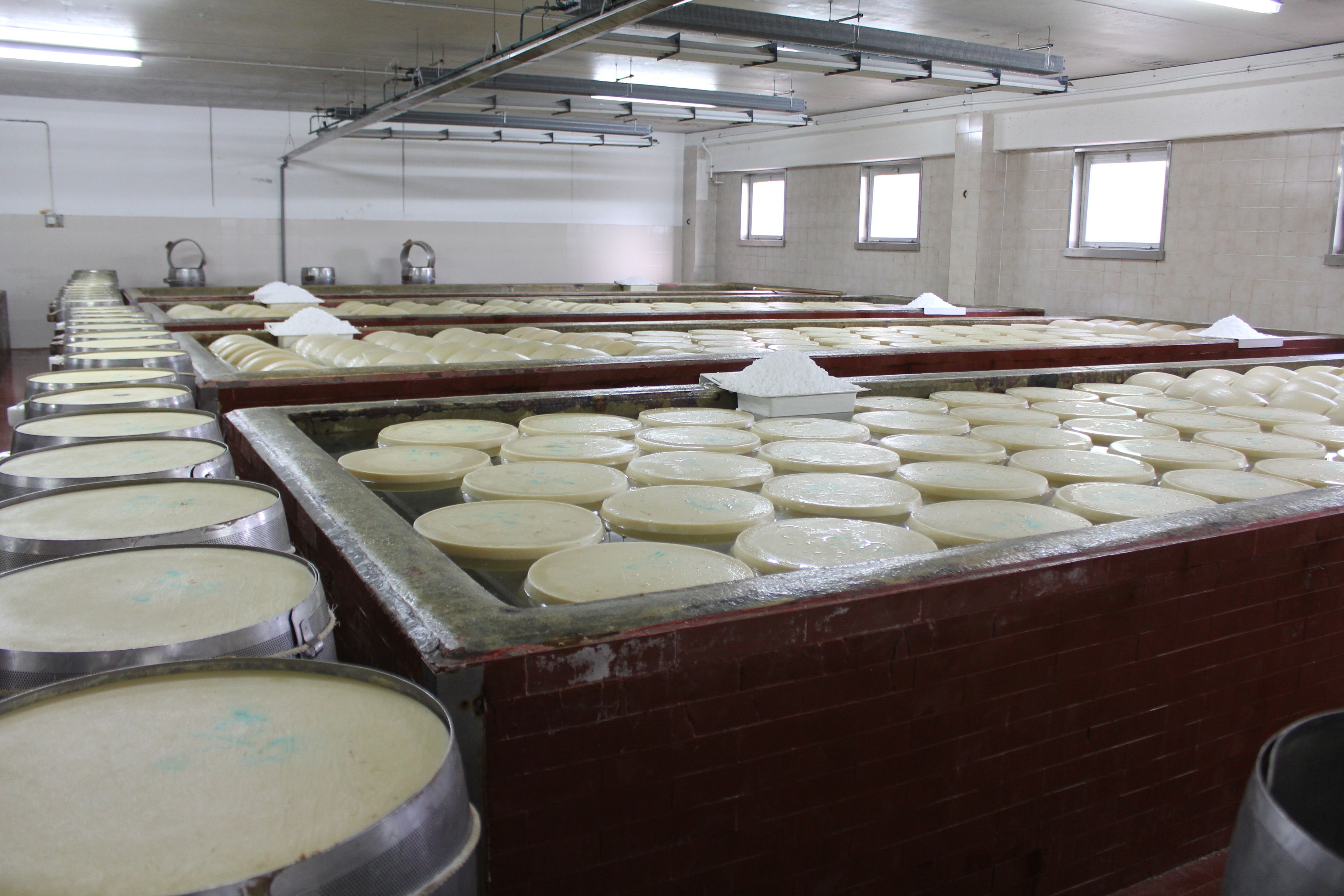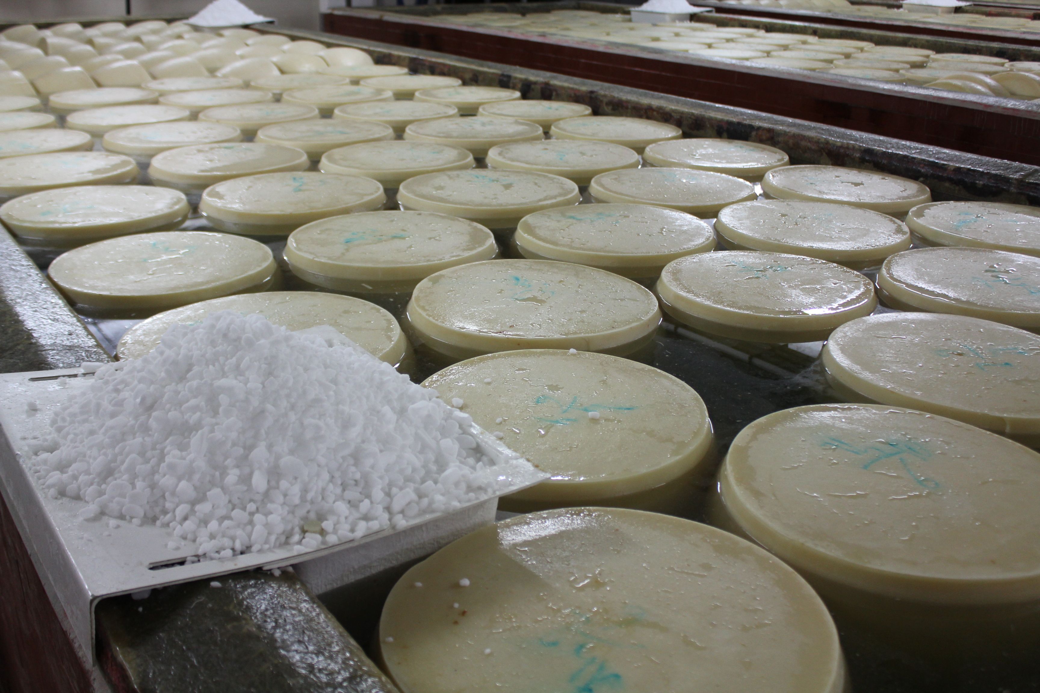 Les meules sont plongées dans une solution saturée en sel pendant 20 à 25 jours, à une température de 18°C, point de fusion du lait. Elles partent dans les caves de maturation et d’affinage.