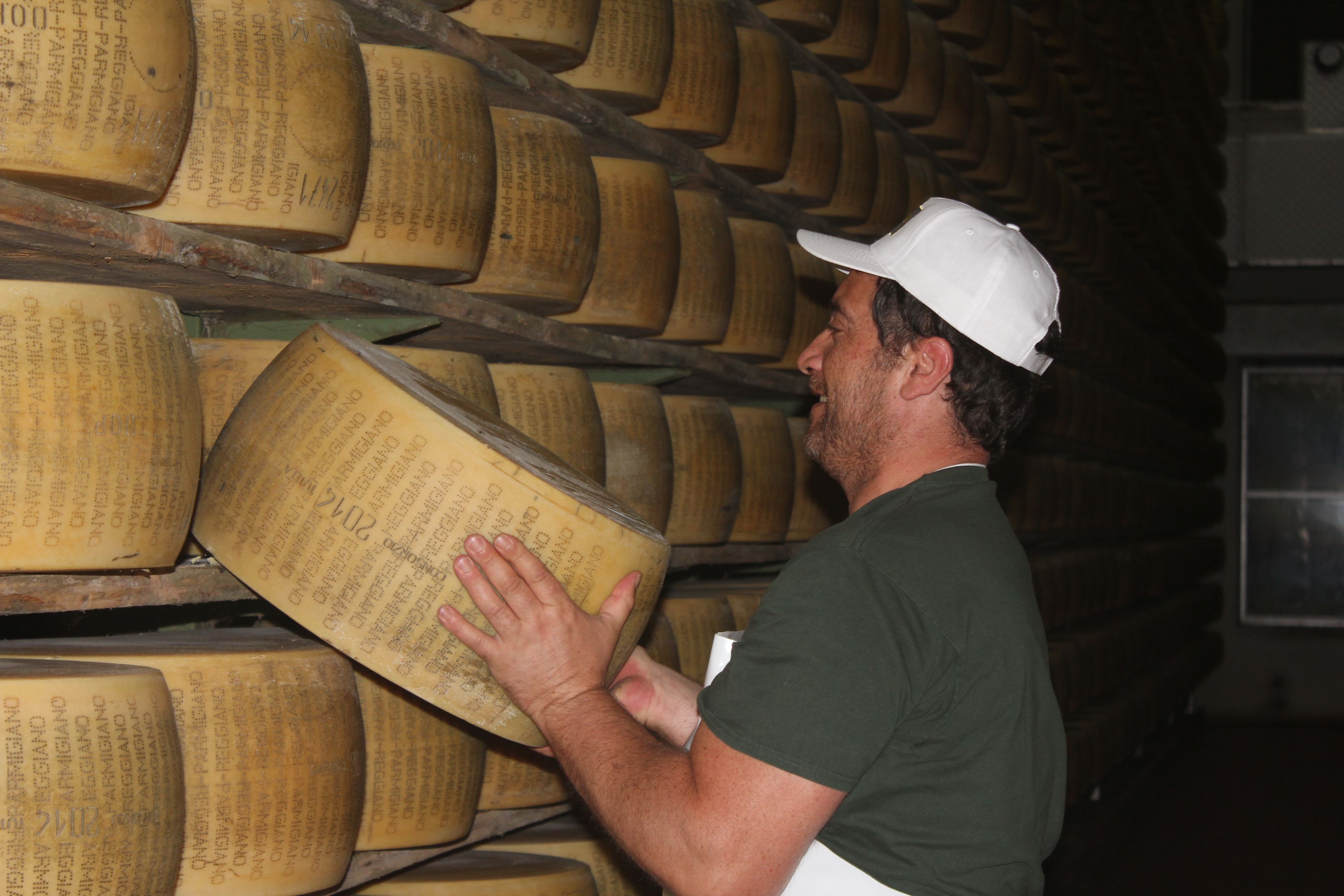 Parmigiano Reggiano acquiert sa spécificité avec l’affinage, pendant lequel le fromage se bonifie. 18 mois, 22 mois, 30 mois, sont les classes labellisées sur les marchés. Mais l’affinage peut atteindre 36, 48 mois et bien plus encore. La moyenne de maturation observée à la vente est de 24 mois. Le fromage s’affirme en complexité, en structure, en texture. Les arômes évoluent et se modifient, la friabilité et la granulosité typiques annoncent une digestibilité de plus en plus grande. Sous la croûte naturelle, le mystère opère.,Vivantes, les meules joufflues s’alignent, dans les caves d’affinage, sur des rayonnages de bois où elles sont dorlotées, retournées, brossées, caressées…