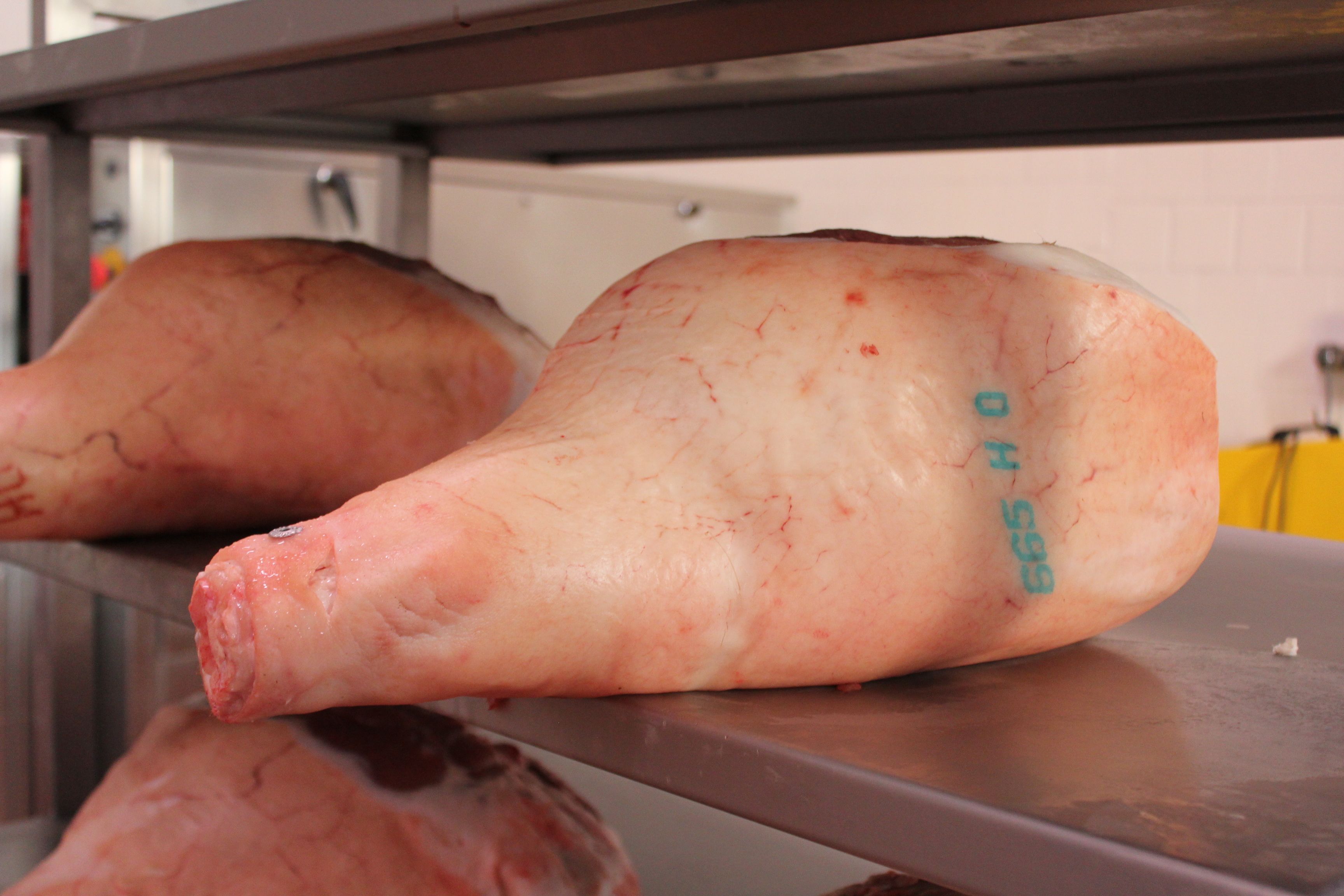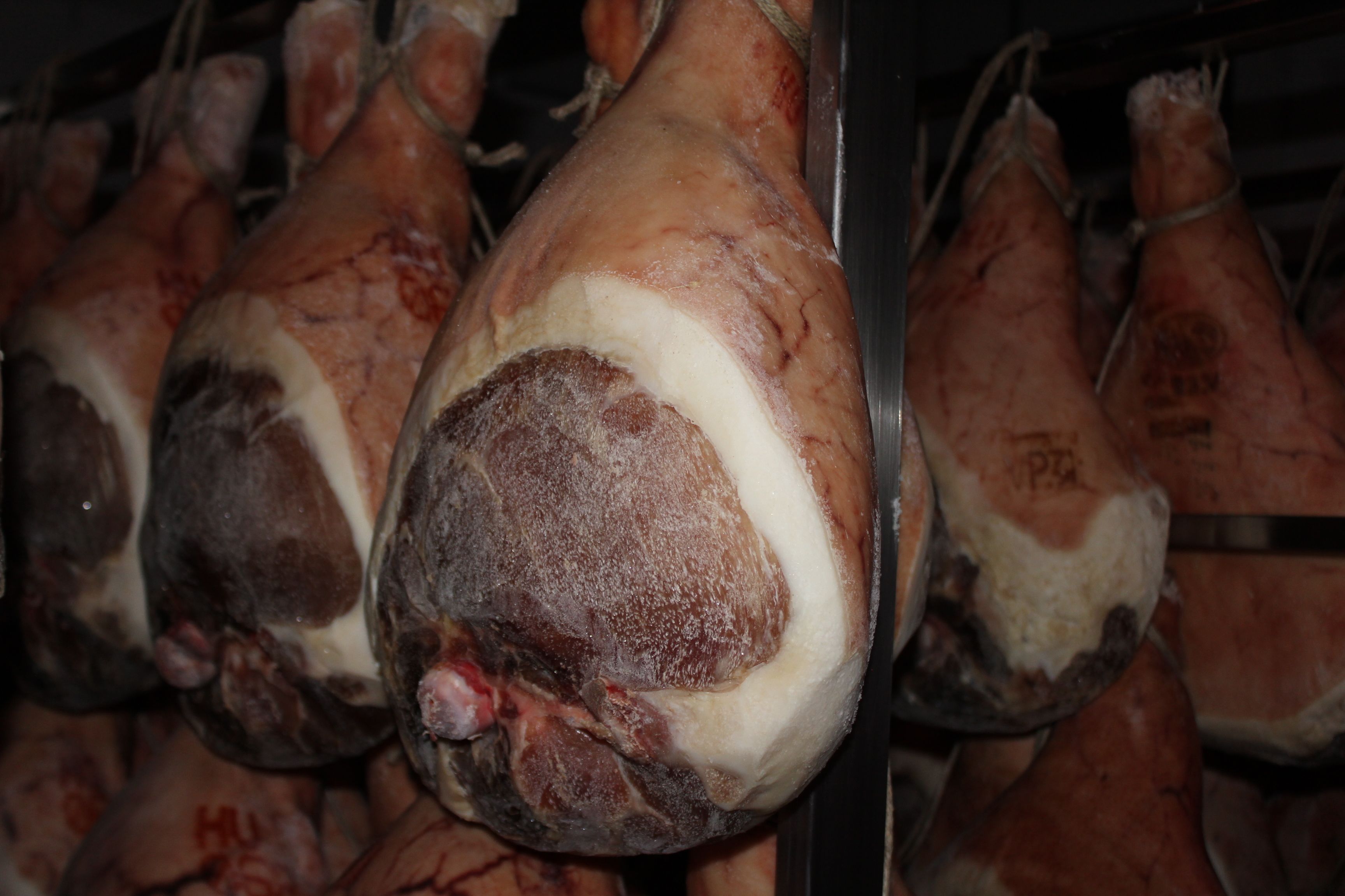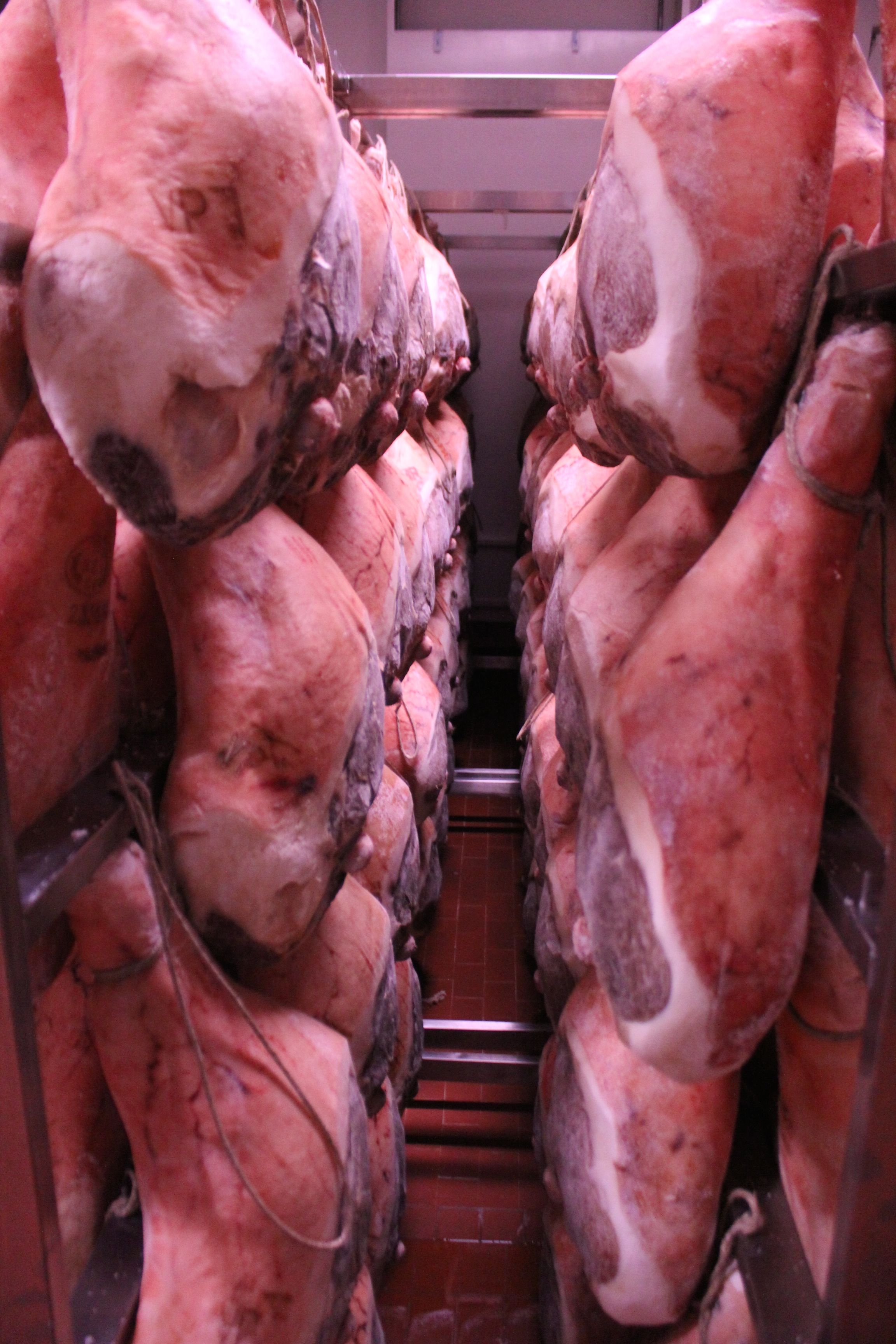 2) Salaison : les cuisses refroidies et rognées sont envoyées des abattoirs aux établissements de salaison à Parme, où elles sont sélectionnées. À ce stade, une bague mentionnant le mois et l’année du début de la maturation est apposée sur chaque jambon. Les cuisses fraîches sont recouvertes de