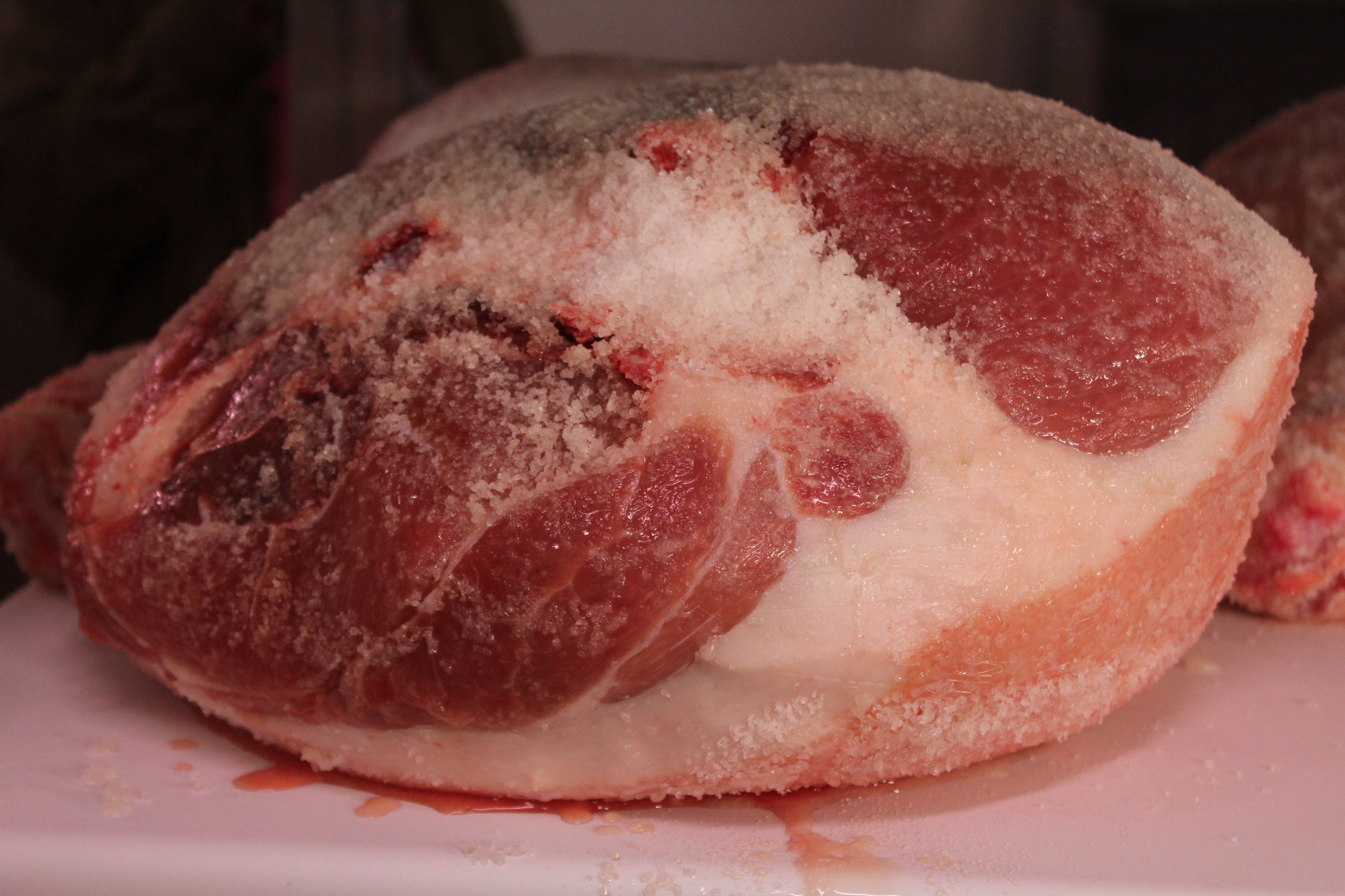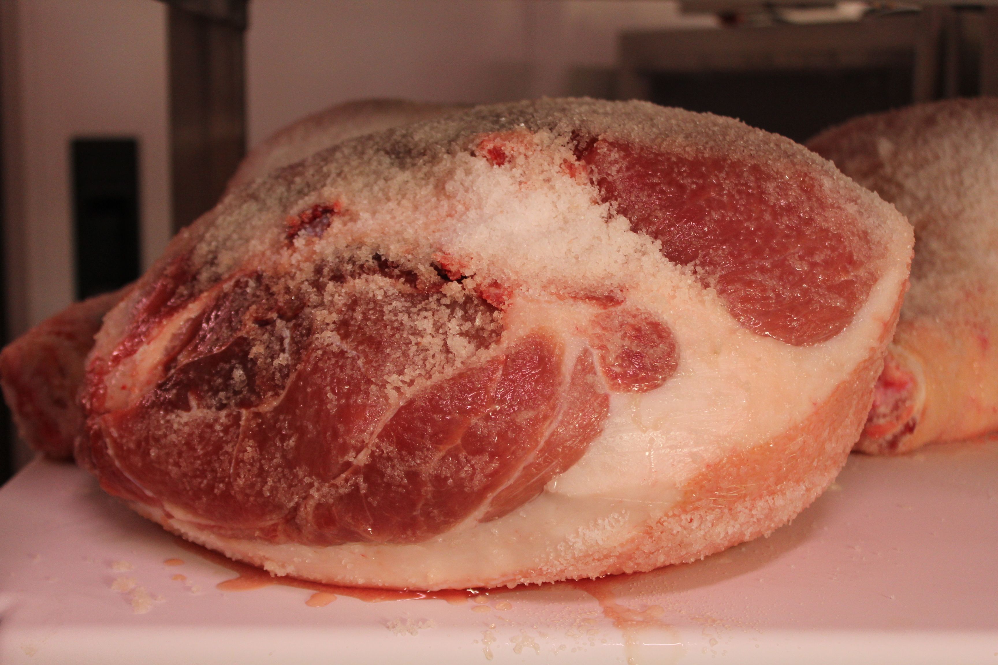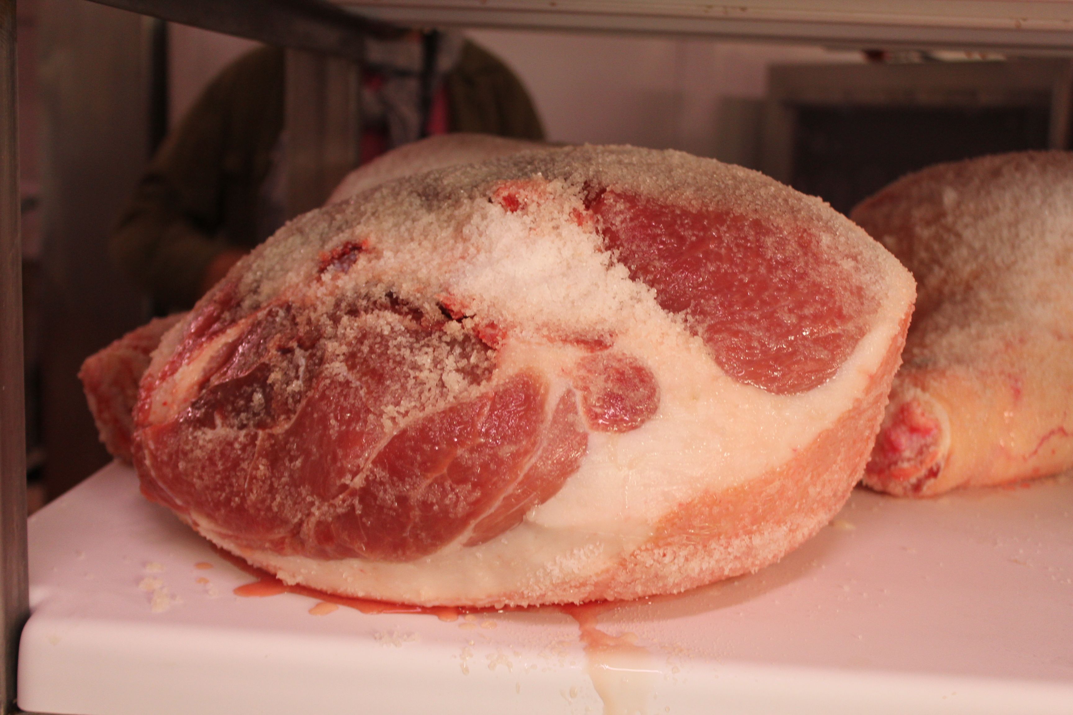 2) Salaison : les cuisses refroidies et rognées sont envoyées des abattoirs aux établissements de salaison à Parme, où elles sont sélectionnées. À ce stade, une bague mentionnant le mois et l’année du début de la maturation est apposée sur chaque jambon. Les cuisses fraîches sont recouvertes de