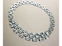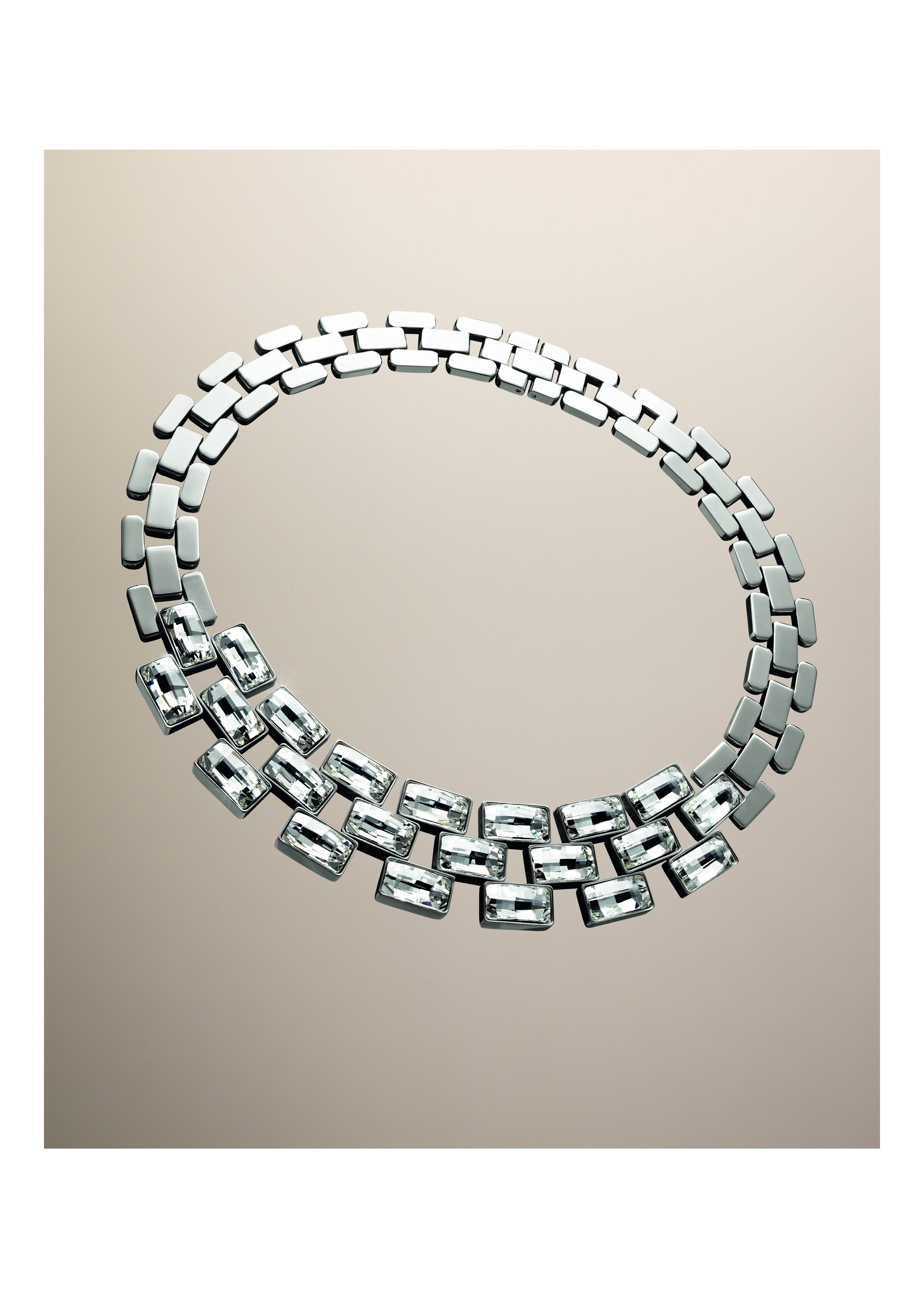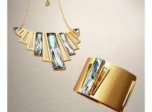 Le collier « Brancusi» présente une monture aérienne illuminée par des cristaux baguette, tandis que la manchette du même thème conjugue l’épure du PVD doré ajouré au glamour d’un maxi cristal central. En alliant des maillons en acier inoxydable et en cristal, le thème « Bonus » mise sur un design structuré, qui fait du collier et du bracelet des pièces versatiles se prêtant à différents porters.