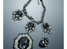 Sombre, mystérieuse et envoûtante, une lumière noire se diffuse sur la dernière partie de la collection Automne-Hiver 2014/15. Les pièces décrivent une inspiration rock romantique, avec un esprit de filigrane oxydée qui rappelle l’expertise hors paire de Swarovski. Spectaculaire et teinté d’un souffle baroque, le collier « Blacklight » est richement ornementé. D’imposants médaillons en cristaux facettés noirs sont comme brodés d’un dégradé de cristaux clairs sertis à la main. Elle aussi très travaillée, la chaîne se pare de cristaux qui apportent leur touche de lumière et de reflets changeants. A la fois rock et élégant, le collier « Blacklight » se prête à de multiples usages : le médaillon principal se détache pour être porté en broche.