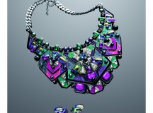 Au nude de la palette métallisée succède une ambiance hautement colorée. Les éclats chromatiques se font intenses et subliment des pièces aux lignes graphiques. Le collier « Buzz » présente une incroyable broderie de cristaux appliqués à la main selon la technique de Pointiage®, où les pierres de cristal composent un effet 3D ultra moderne et sophistiqué.