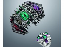En ruthénium pavé de mini cristaux, la manchette « Blossom » évoque une cage ponctuée de pierres de cristal aux teintes améthyste, rubis, émeraude et grise. Plus fluides, les longues boucles d’oreille assorties s’animent sous les reflets de cristaux mobiles, à compléter par la bague « Billion », aux lignes généreuses et racées.