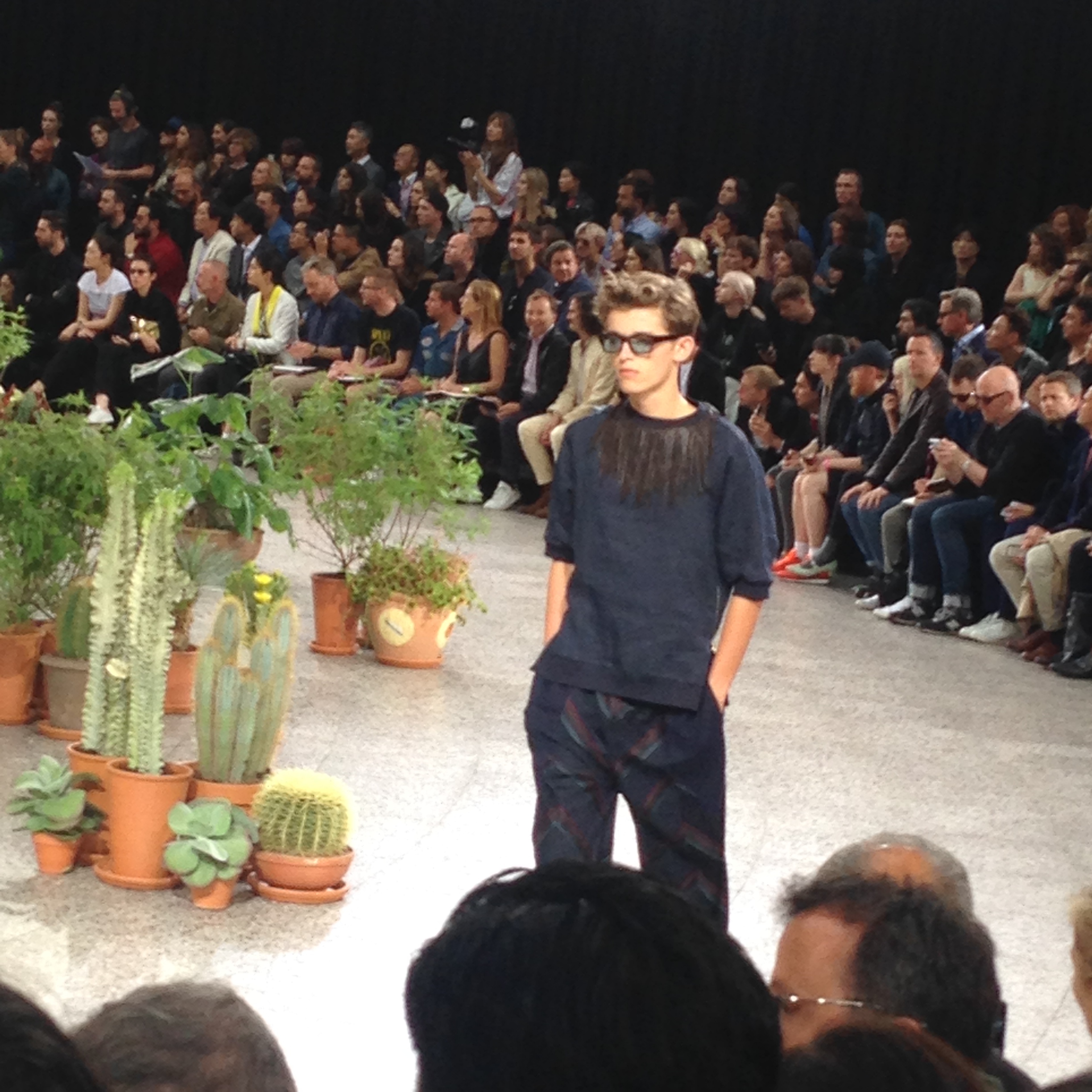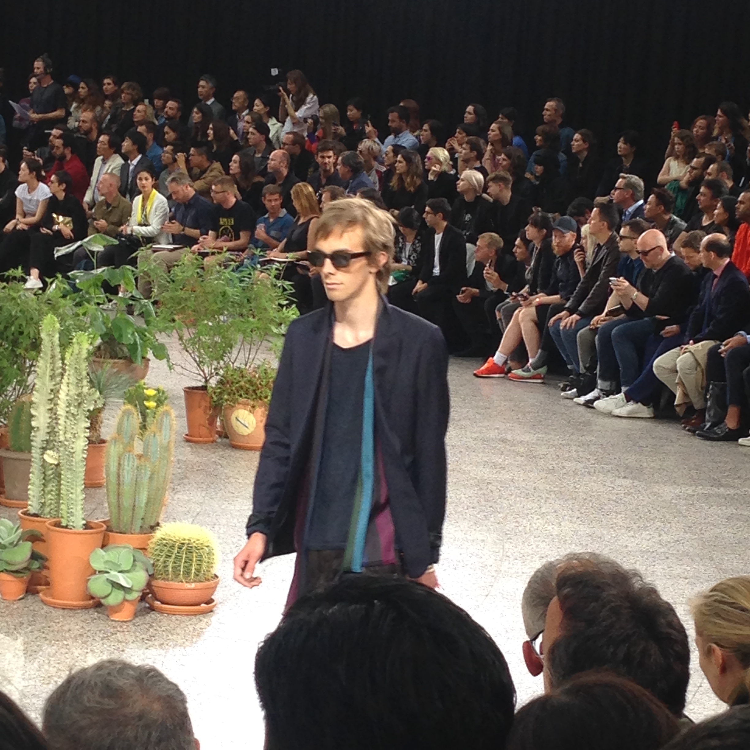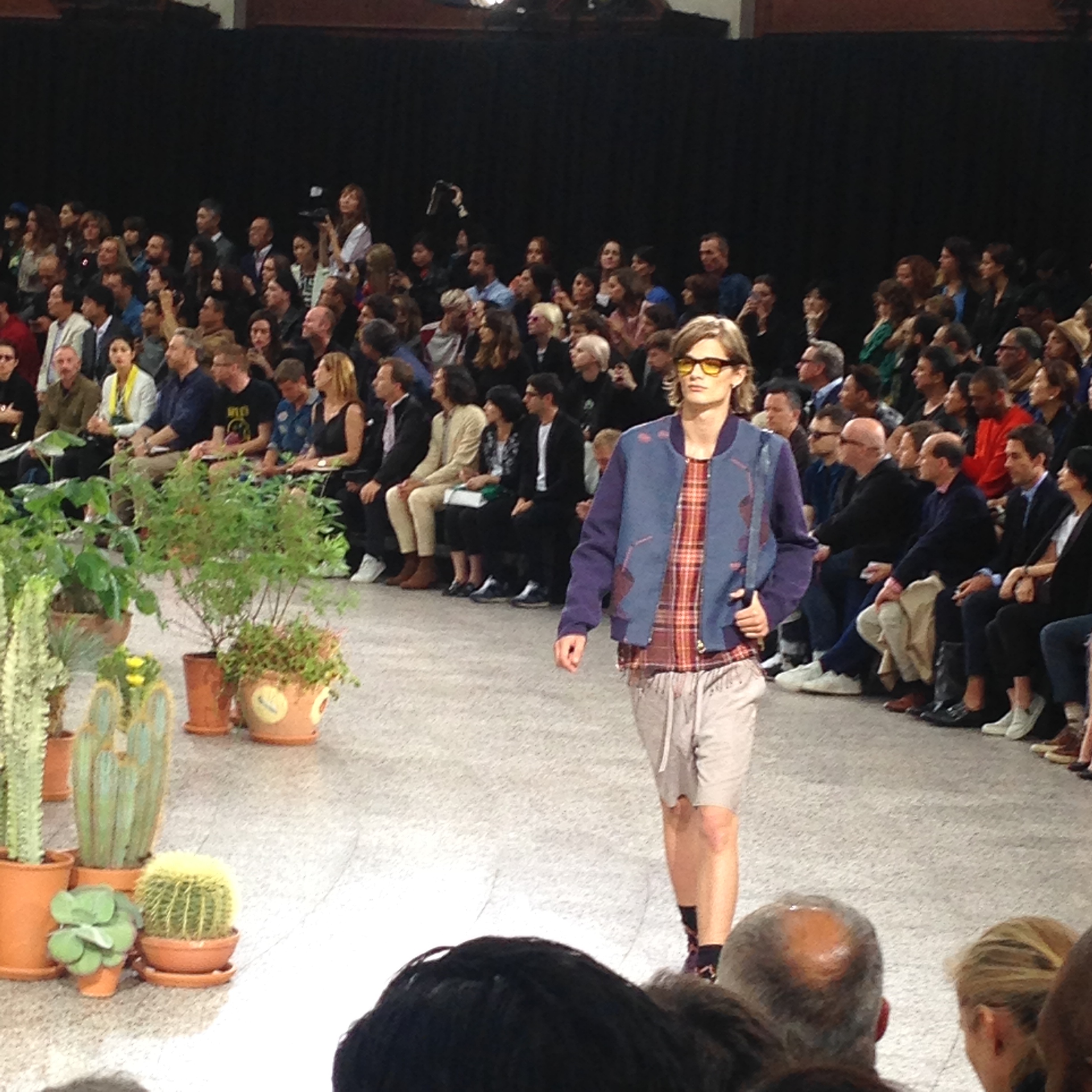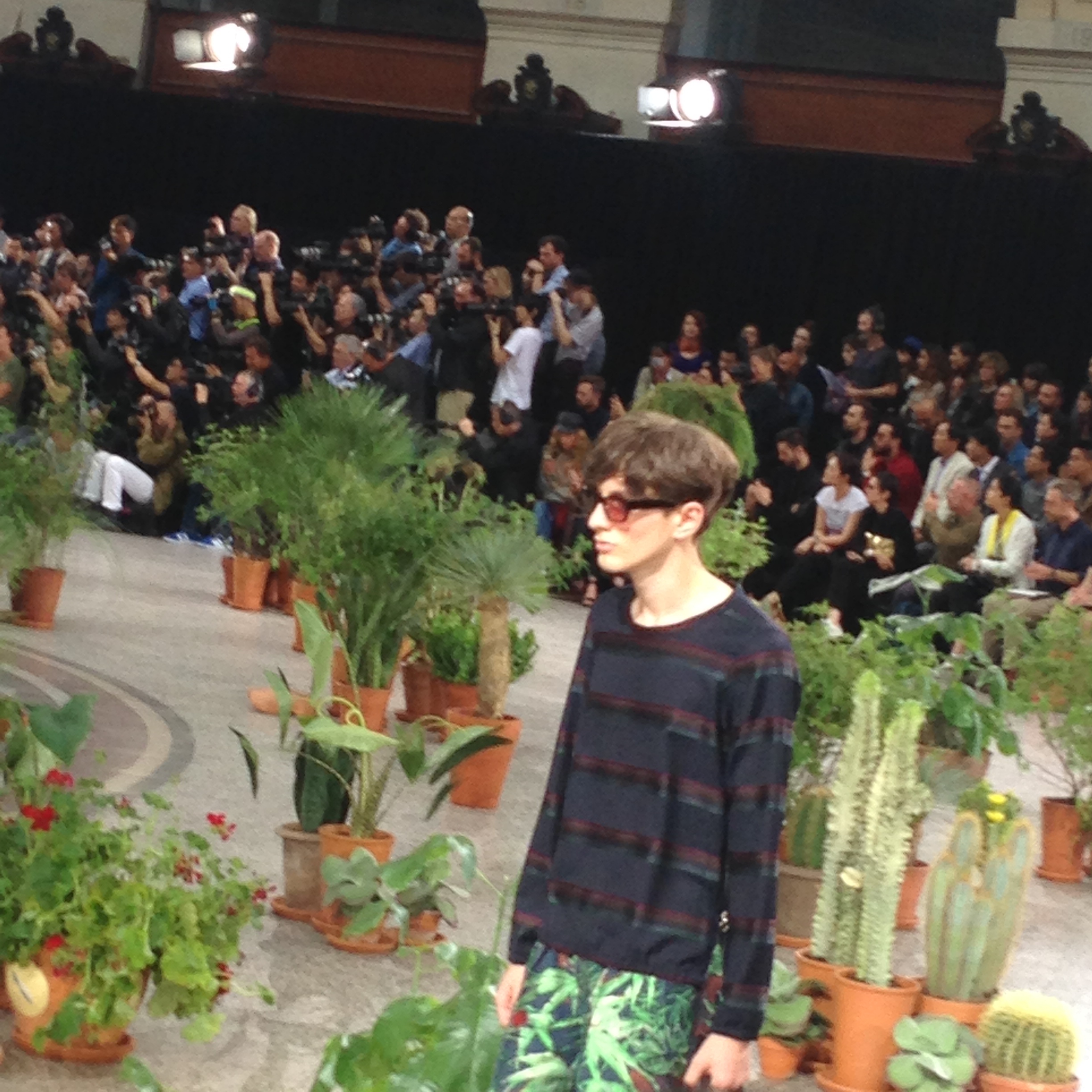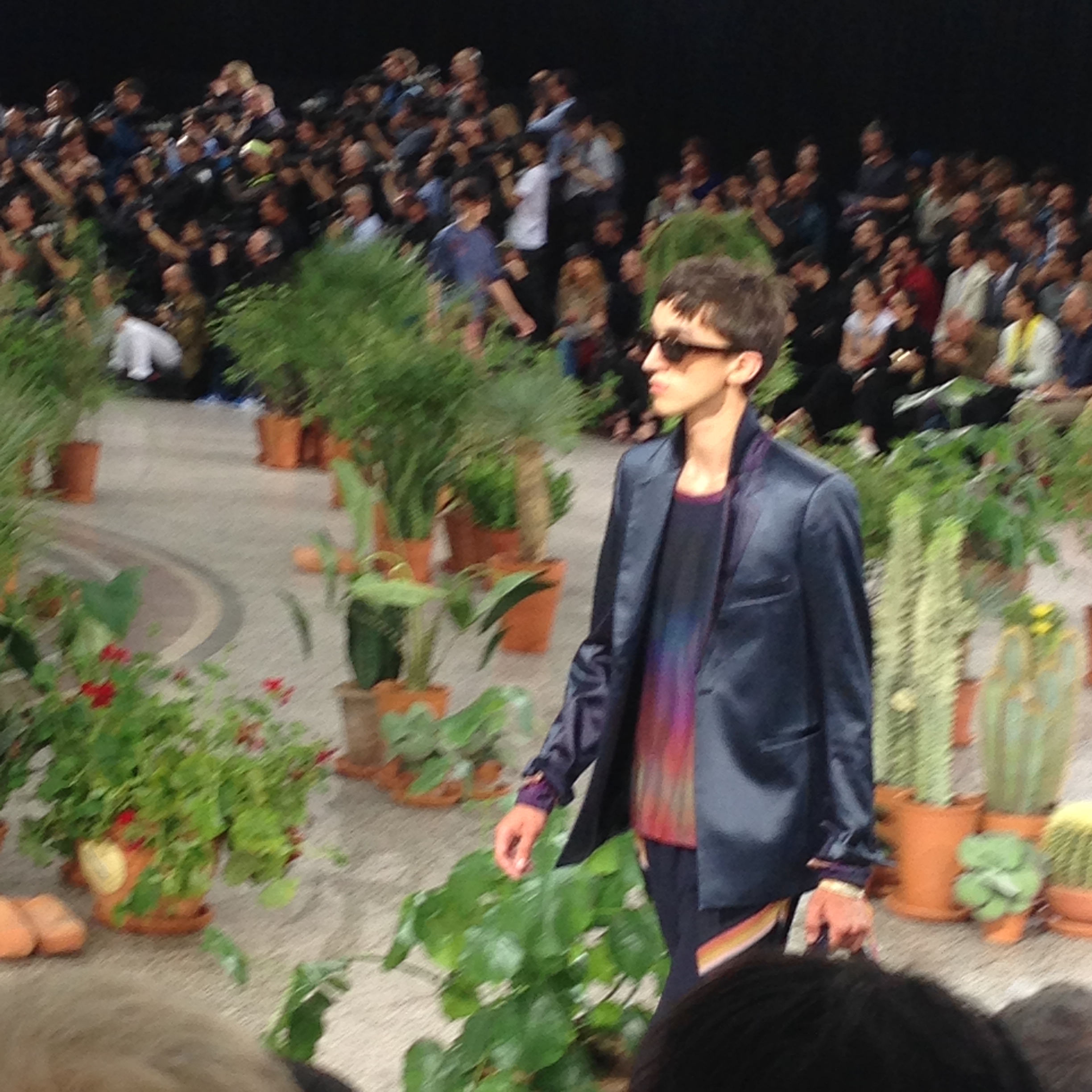Paul Smith parsème des plantes de partout, en mise en scène, comme dans sa collection… pour mettre tout simplement du vert dans le vie de chacun. Paul Smith parsème la Bourse du Commerce à Paris de plantes, pour mettre du vert dans les vies de chacun. Cela se répercute dans le vestiaire par beaucoup de fluidité et de souplesse, dans les pantalons amples, les vestes légères portées comme des chemises, les tuniques à enfiler. Bien sûr on retrouve également quelques fleurs tropicales, et même des coccinelles et des bananes, en imprimés sur les pulls, sweats et accessoires. Les franges en cuir s’invitent sur quelques pièces ou autour du cou. Les tonalités de bleu dominent, Paul ajoute des rayures formant des dégradés de couleurs sur les tee-shirts, chemises et pulls en maille légère. Le sportswear est également présent dans la collection avec des bas de jogging, des zips sur le côté des sweats. Une garde-robe « easy », facile à porter, avec de bonnes vibrations ,nous donnant envie de conclure tout simplement avec le mot « yeah », exactement comme marqué sur le dernier tee-shirt qui clôture le show.