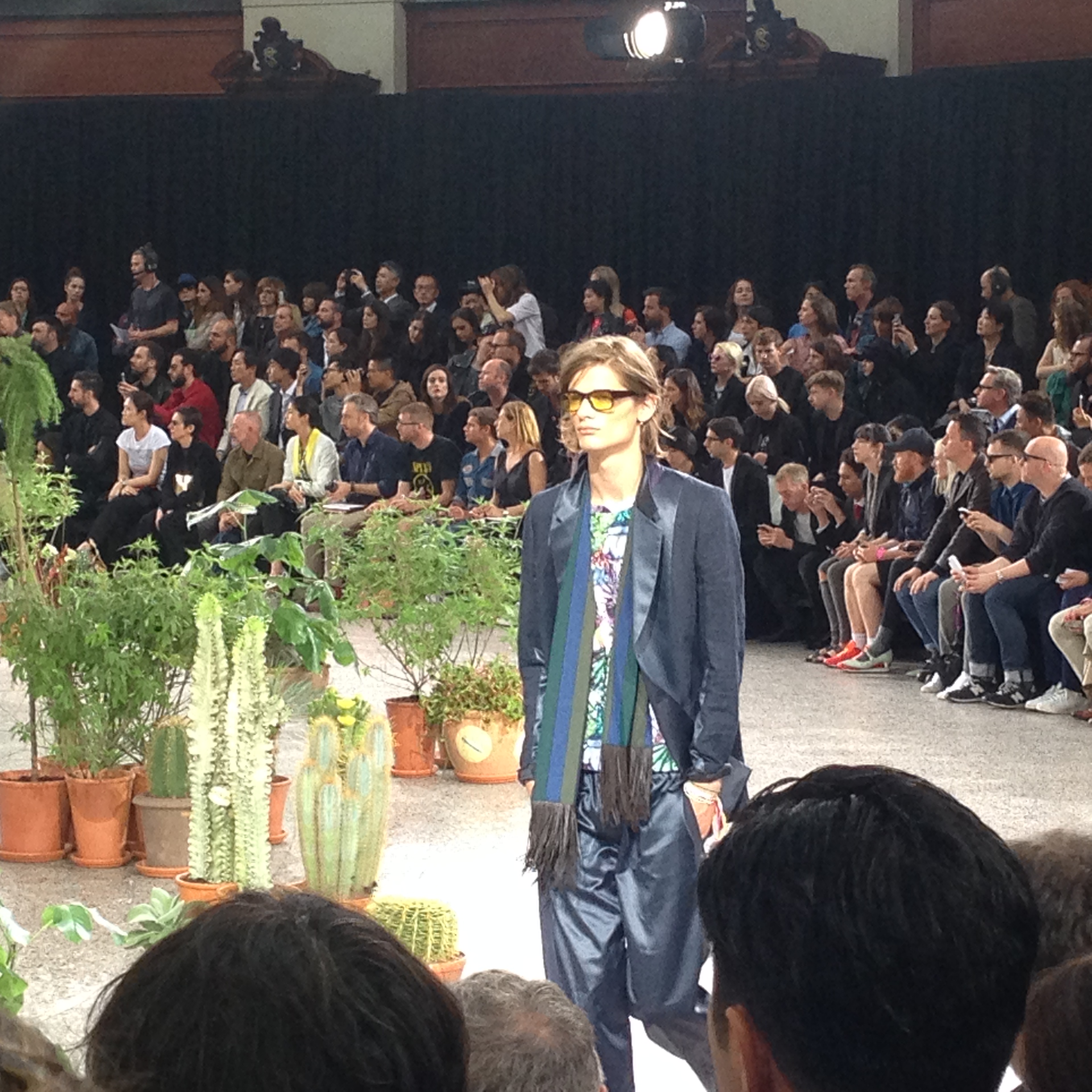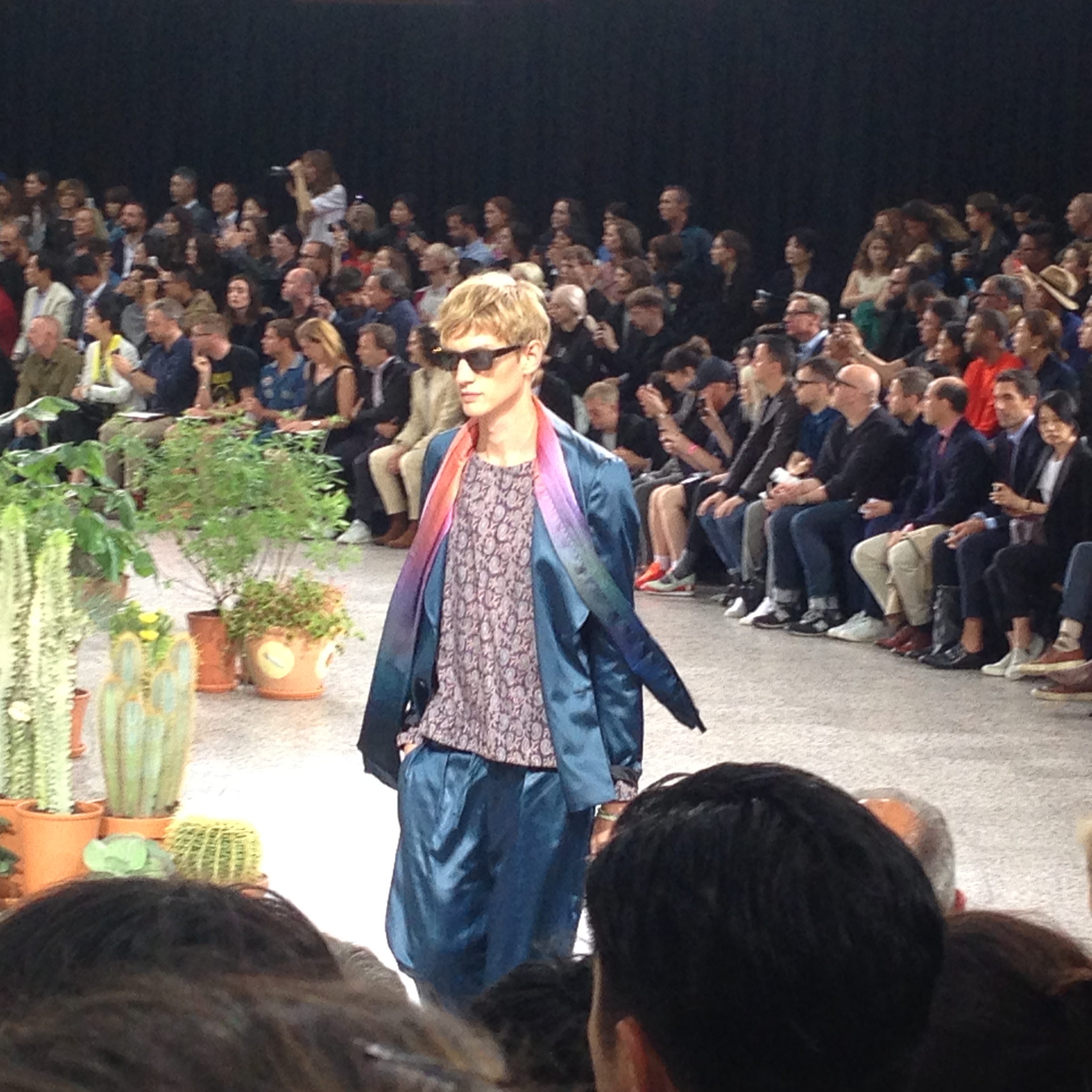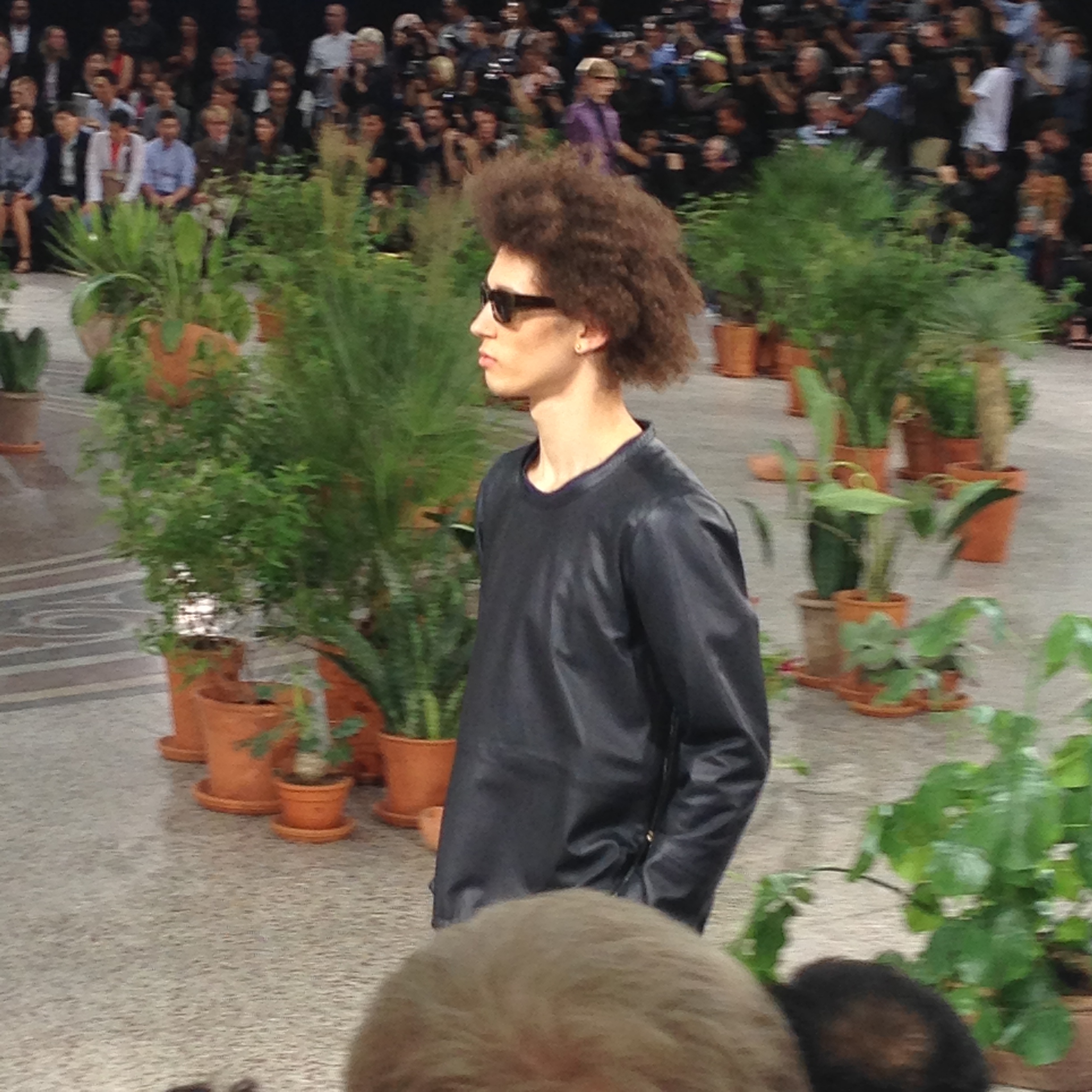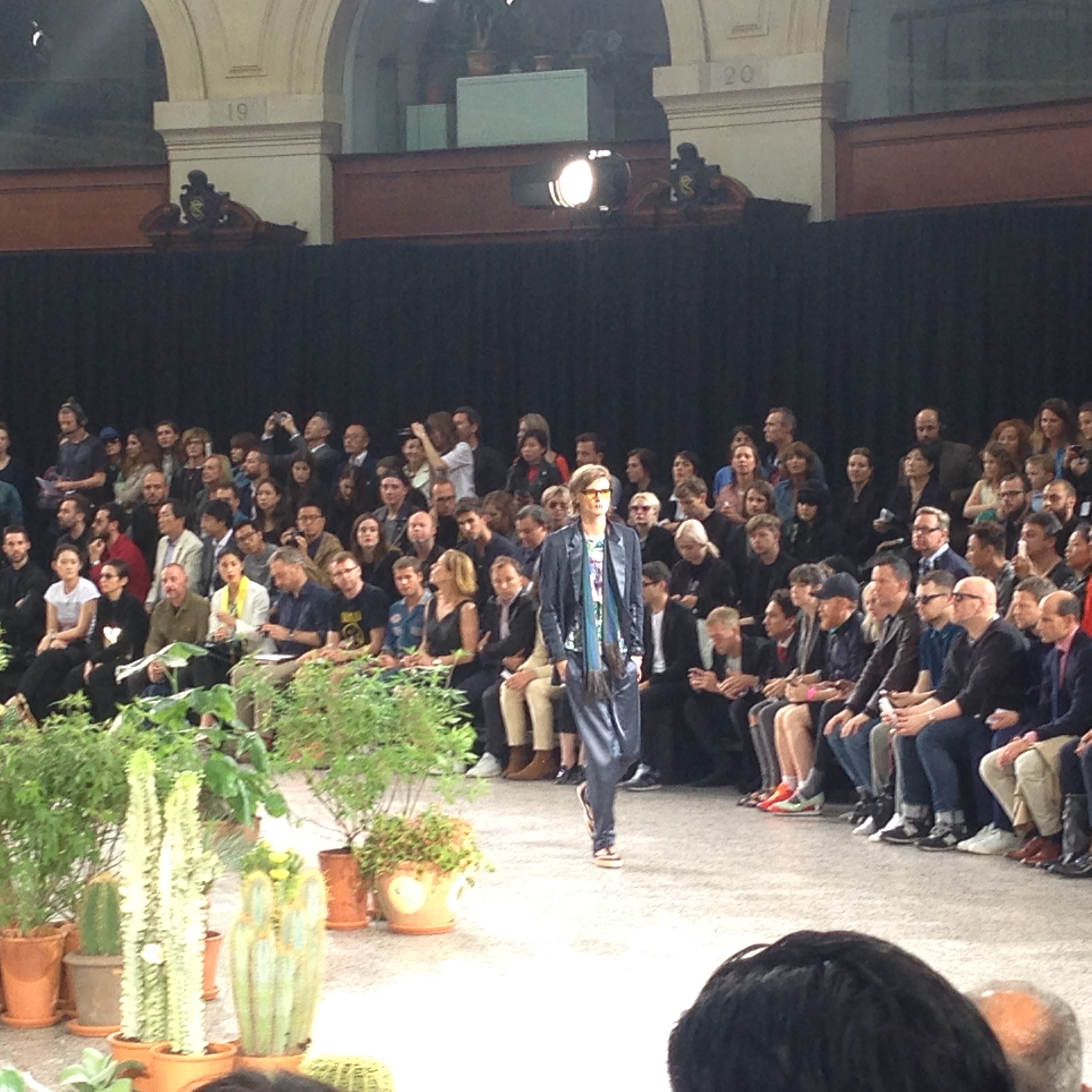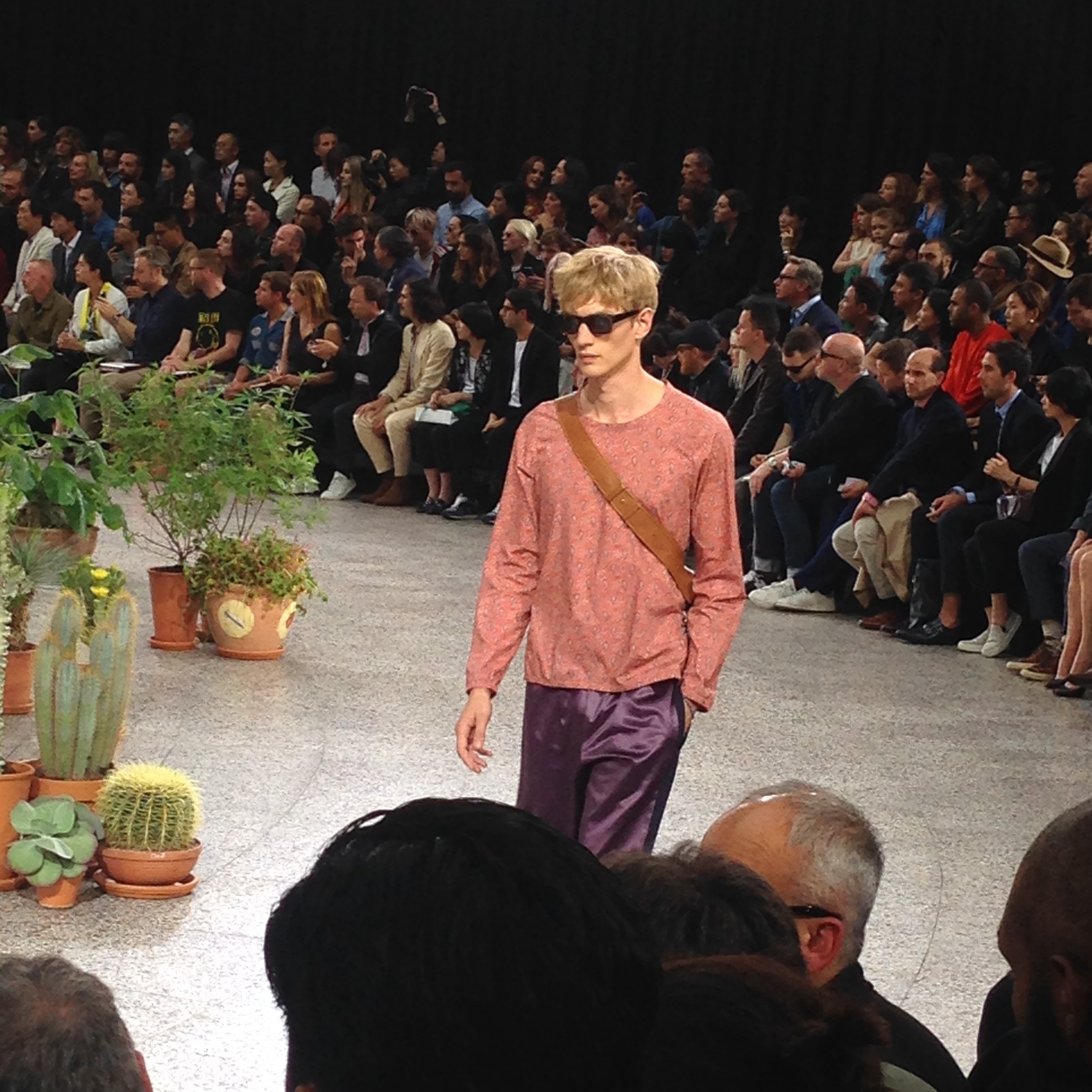 Paul Smith parsème des plantes de partout, en mise en scène, comme dans sa collection… pour mettre tout simplement du vert dans le vie de chacun. Paul Smith parsème la Bourse du Commerce à Paris de plantes, pour mettre du vert dans les vies de chacun. Cela se répercute dans le vestiaire par beaucoup de fluidité et de souplesse, dans les pantalons amples, les vestes légères portées comme des chemises, les tuniques à enfiler. Bien sûr on retrouve également quelques fleurs tropicales, et même des coccinelles et des bananes, en imprimés sur les pulls, sweats et accessoires. Les franges en cuir s’invitent sur quelques pièces ou autour du cou. Les tonalités de bleu dominent, Paul ajoute des rayures formant des dégradés de couleurs sur les tee-shirts, chemises et pulls en maille légère. Le sportswear est également présent dans la collection avec des bas de jogging, des zips sur le côté des sweats. Une garde-robe « easy », facile à porter, avec de bonnes vibrations ,nous donnant envie de conclure tout simplement avec le mot « yeah », exactement comme marqué sur le dernier tee-shirt qui clôture le show.