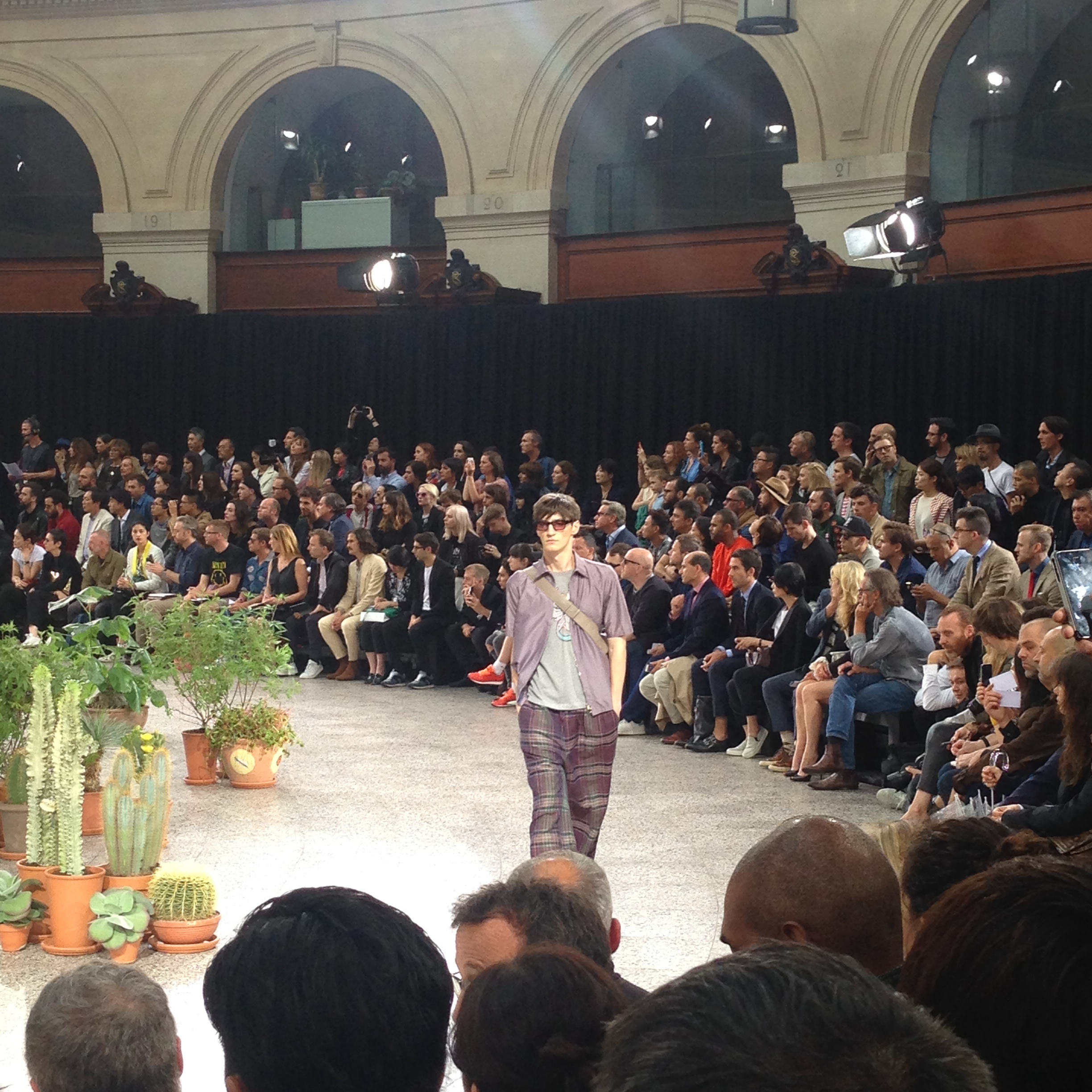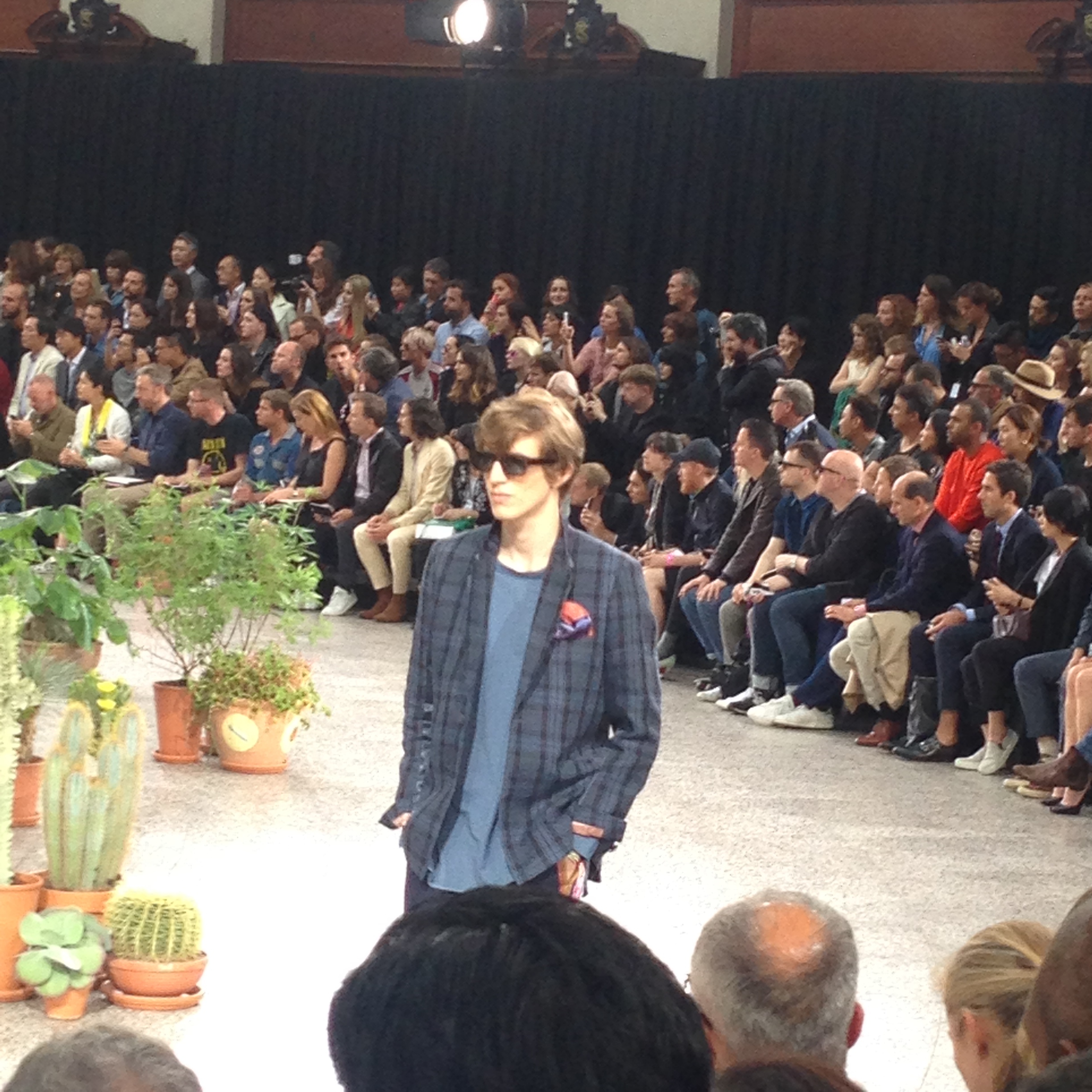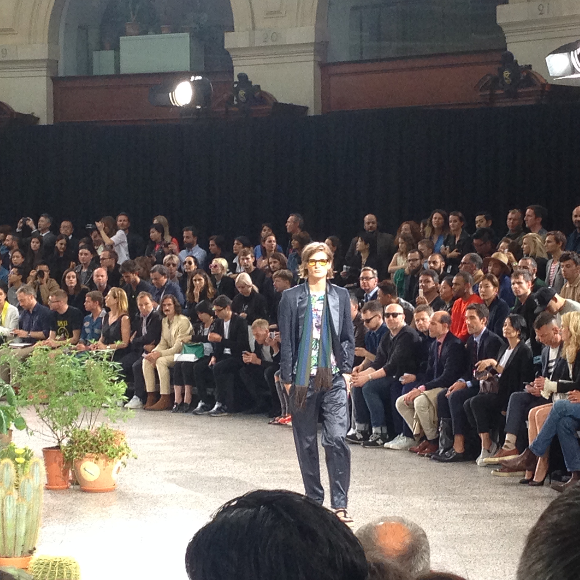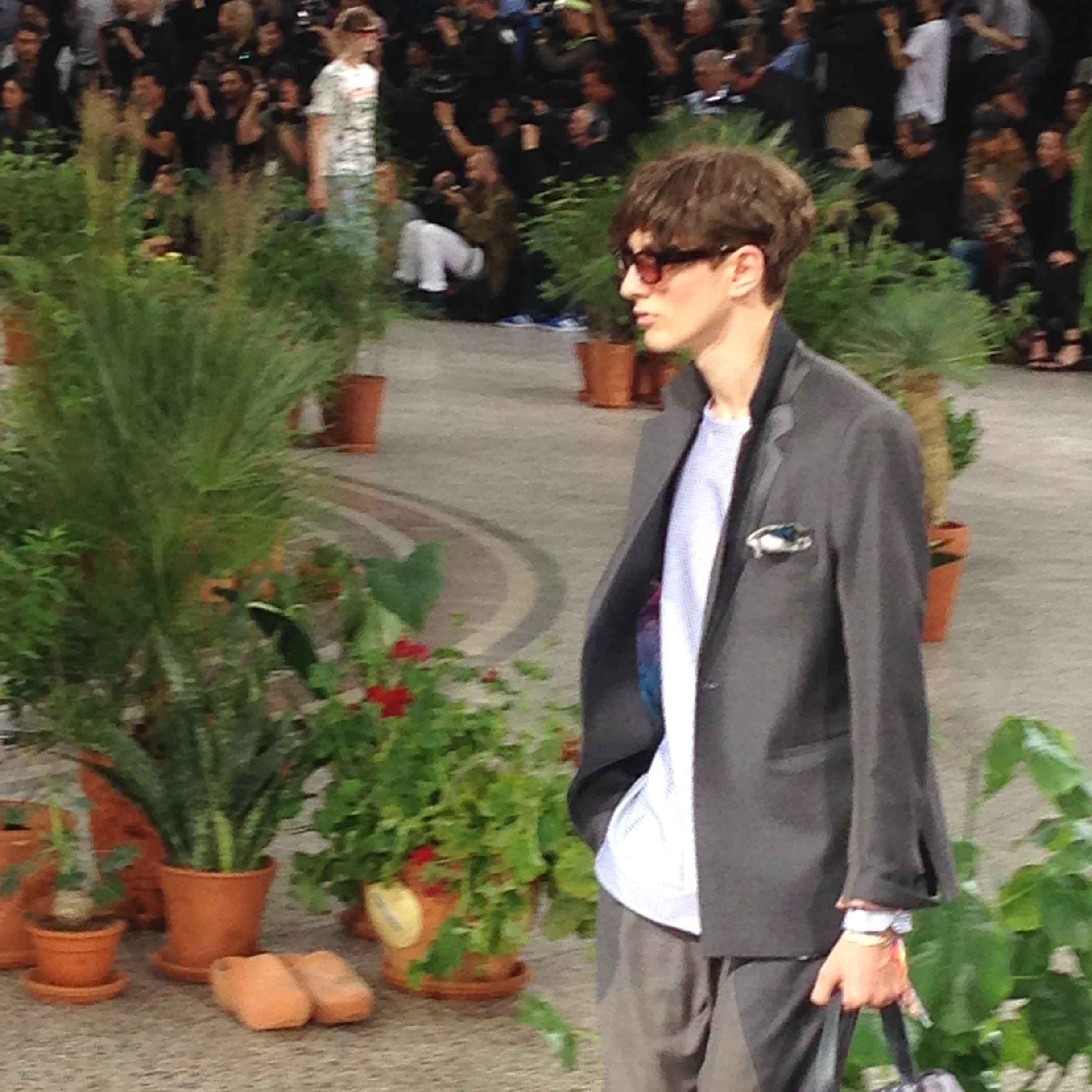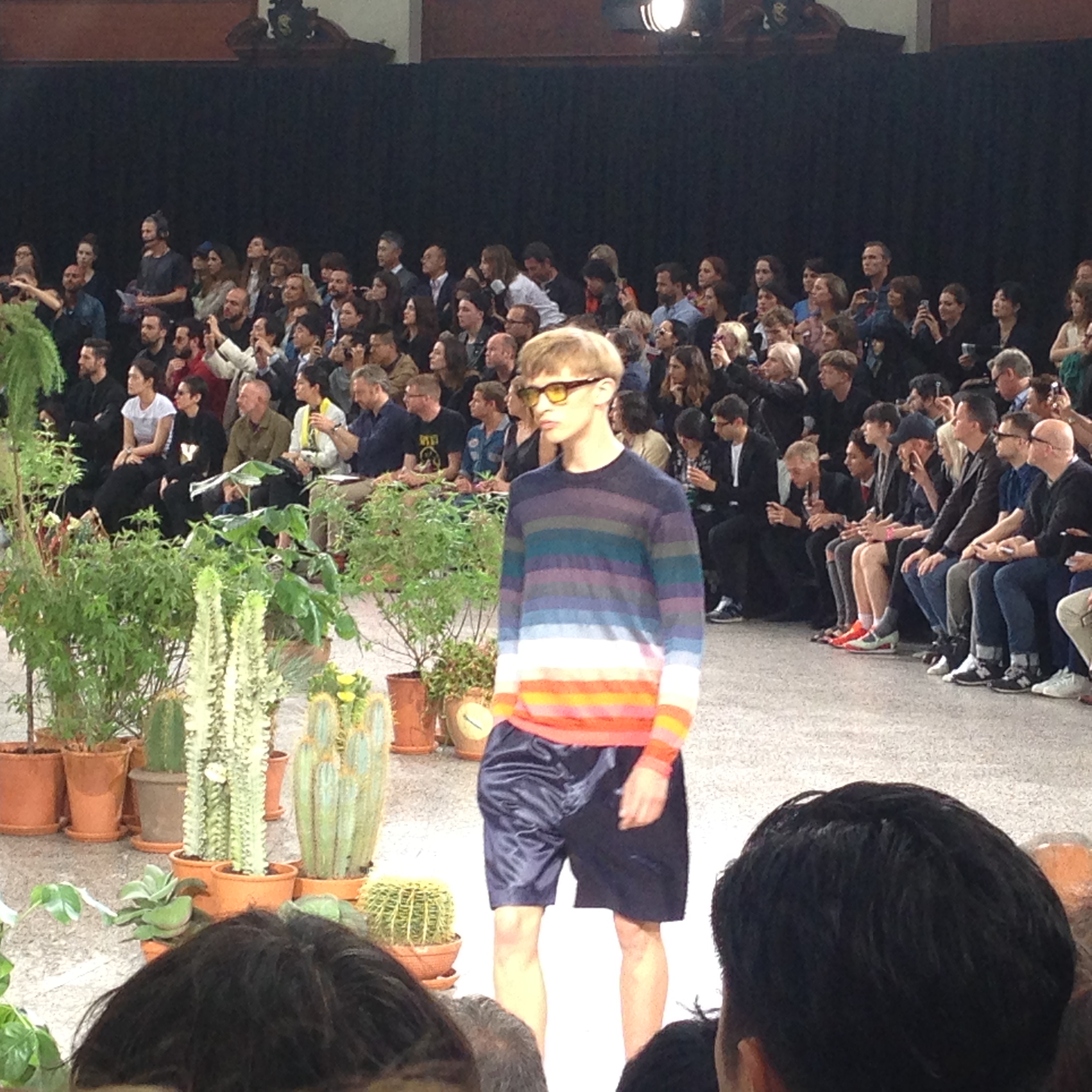 Paul Smith parsème des plantes de partout, en mise en scène, comme dans sa collection… pour mettre tout simplement du vert dans le vie de chacun. Paul Smith parsème la Bourse du Commerce à Paris de plantes, pour mettre du vert dans les vies de chacun. Cela se répercute dans le vestiaire par beaucoup de fluidité et de souplesse, dans les pantalons amples, les vestes légères portées comme des chemises, les tuniques à enfiler. Bien sûr on retrouve également quelques fleurs tropicales, et même des coccinelles et des bananes, en imprimés sur les pulls, sweats et accessoires. Les franges en cuir s’invitent sur quelques pièces ou autour du cou. Les tonalités de bleu dominent, Paul ajoute des rayures formant des dégradés de couleurs sur les tee-shirts, chemises et pulls en maille légère. Le sportswear est également présent dans la collection avec des bas de jogging, des zips sur le côté des sweats. Une garde-robe « easy », facile à porter, avec de bonnes vibrations ,nous donnant envie de conclure tout simplement avec le mot « yeah », exactement comme marqué sur le dernier tee-shirt qui clôture le show.