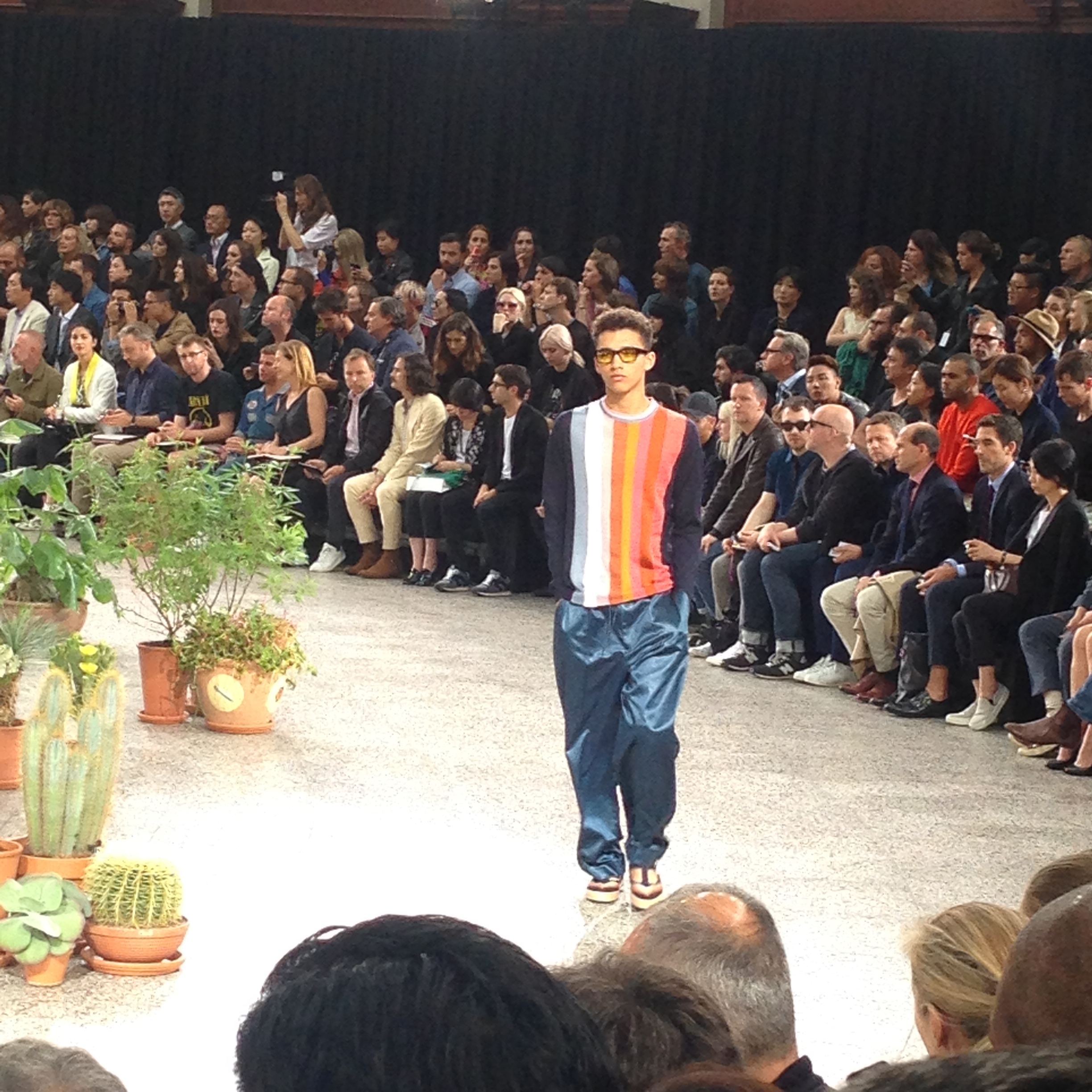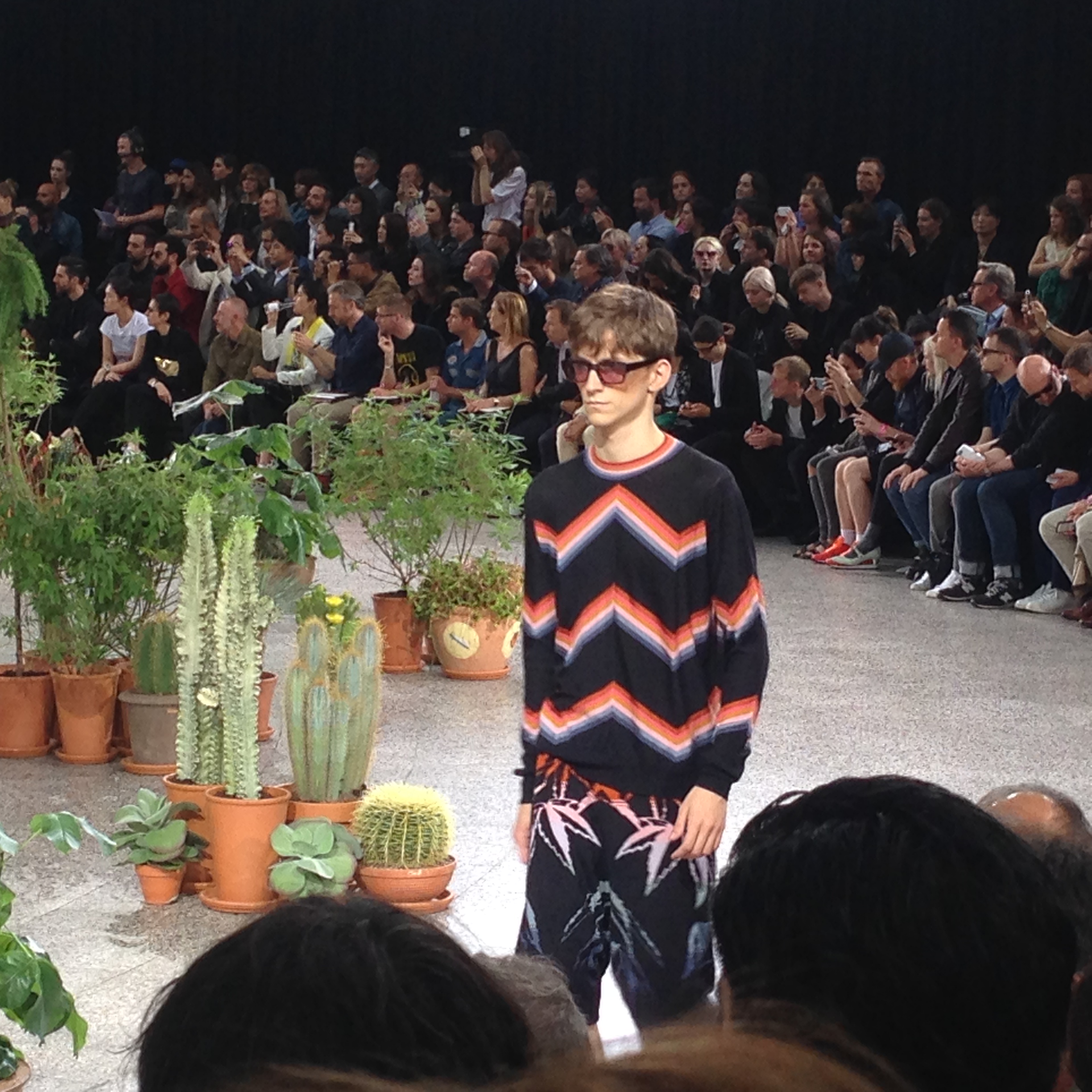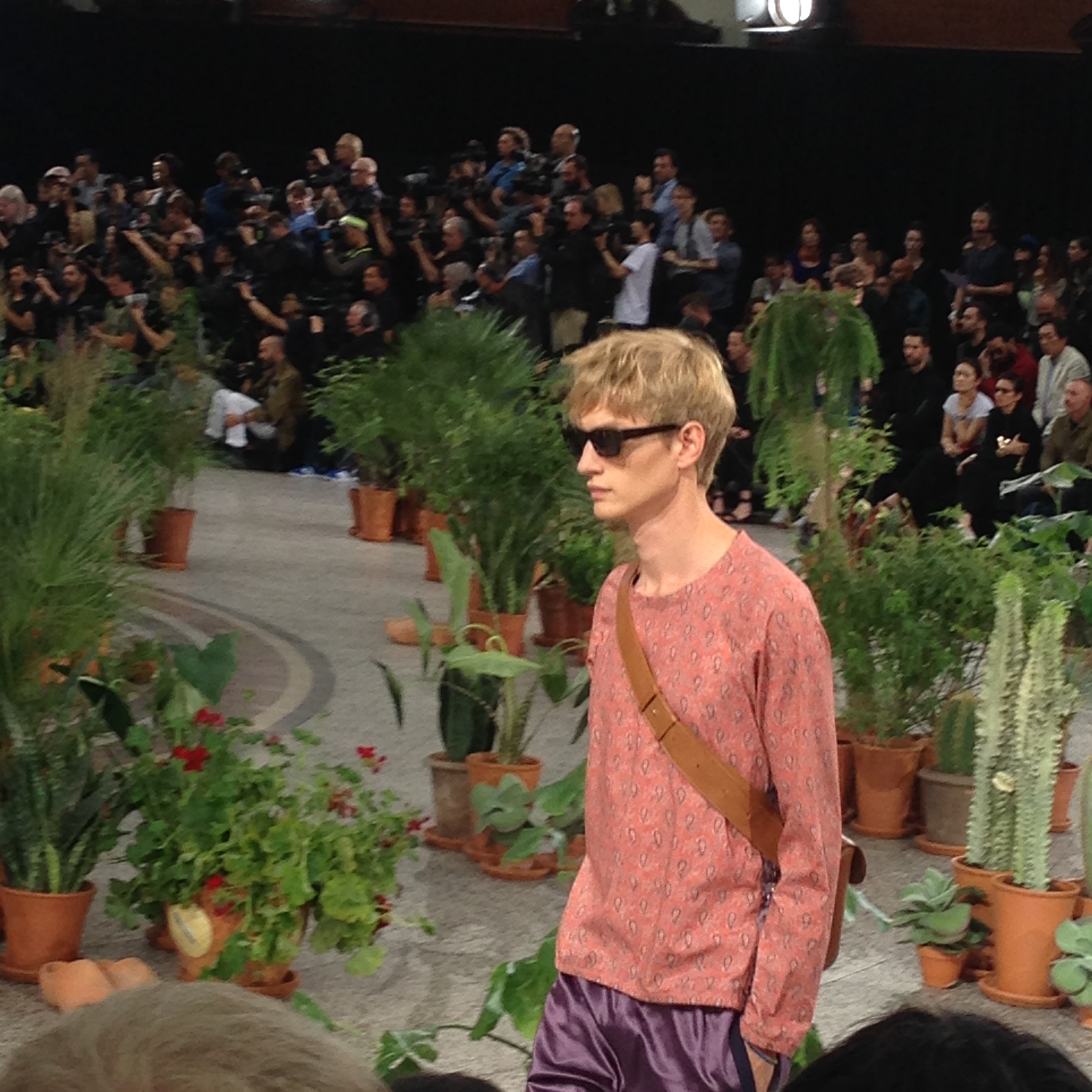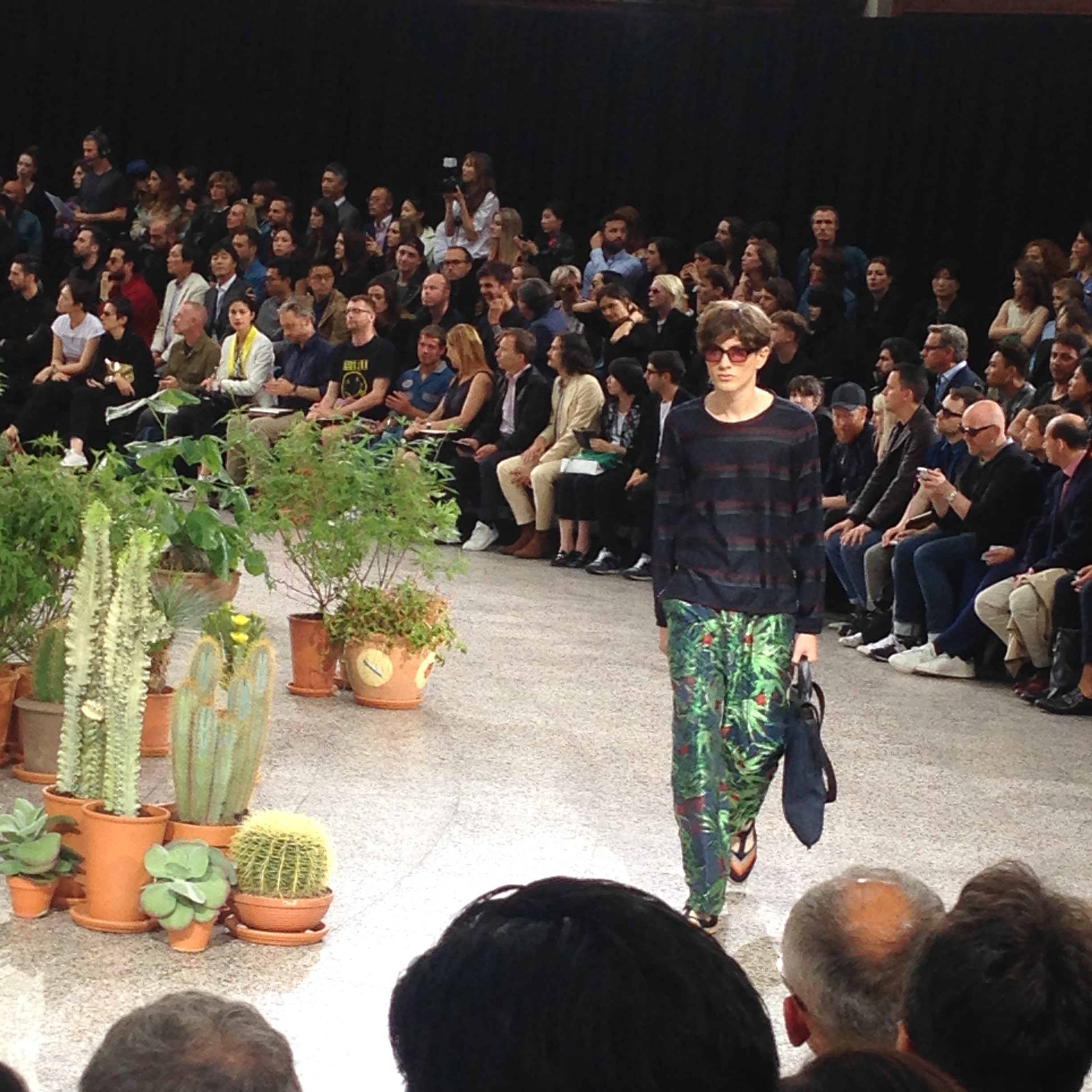Paul Smith parsème des plantes de partout, en mise en scène, comme dans sa collection… pour mettre tout simplement du vert dans le vie de chacun. Paul Smith parsème la Bourse du Commerce à Paris de plantes, pour mettre du vert dans les vies de chacun. Cela se répercute dans le vestiaire par beaucoup de fluidité et de souplesse, dans les pantalons amples, les vestes légères portées comme des chemises, les tuniques à enfiler. Bien sûr on retrouve également quelques fleurs tropicales, et même des coccinelles et des bananes, en imprimés sur les pulls, sweats et accessoires. Les franges en cuir s’invitent sur quelques pièces ou autour du cou. Les tonalités de bleu dominent, Paul ajoute des rayures formant des dégradés de couleurs sur les tee-shirts, chemises et pulls en maille légère. Le sportswear est également présent dans la collection avec des bas de jogging, des zips sur le côté des sweats. Une garde-robe « easy », facile à porter, avec de bonnes vibrations ,nous donnant envie de conclure tout simplement avec le mot « yeah », exactement comme marqué sur le dernier tee-shirt qui clôture le show.