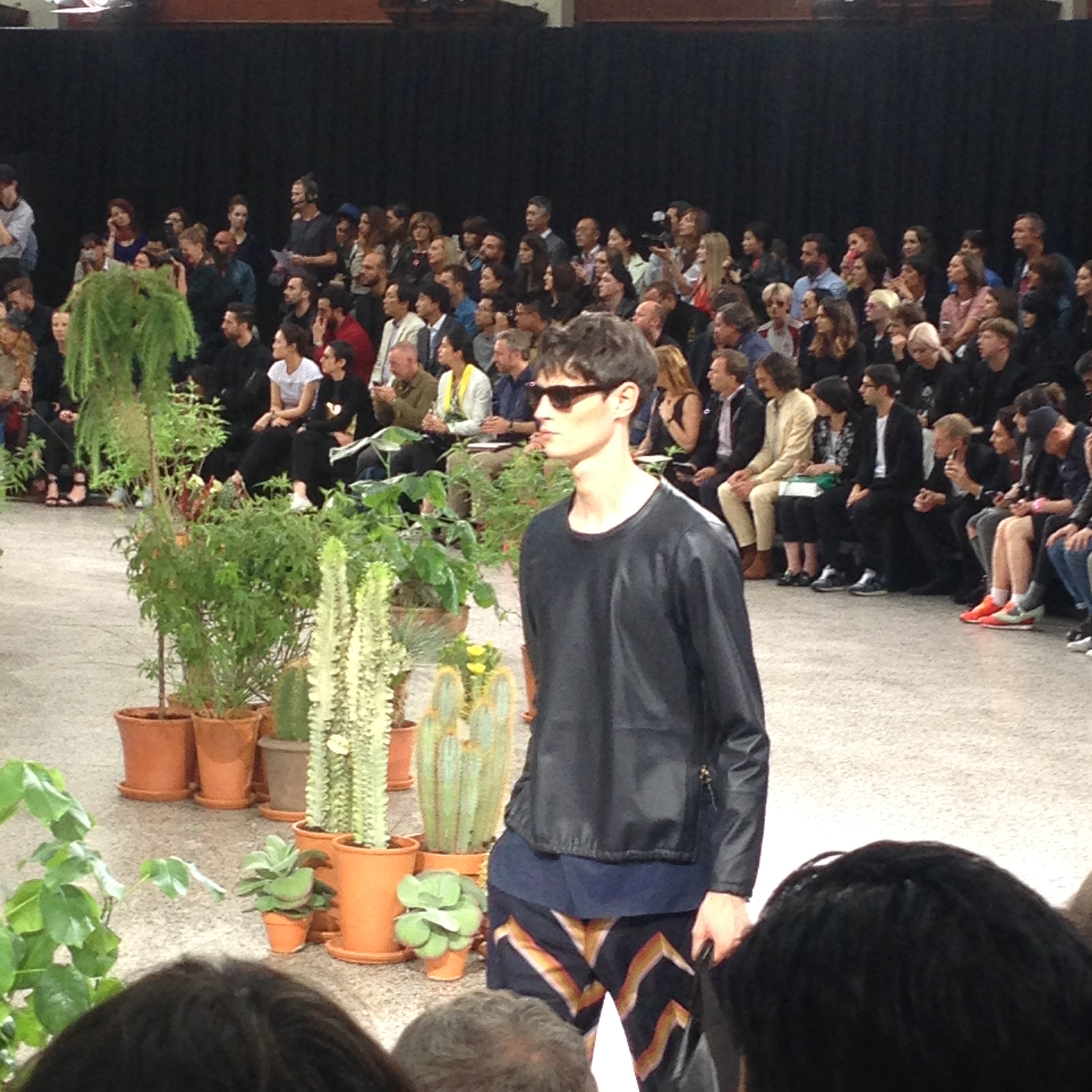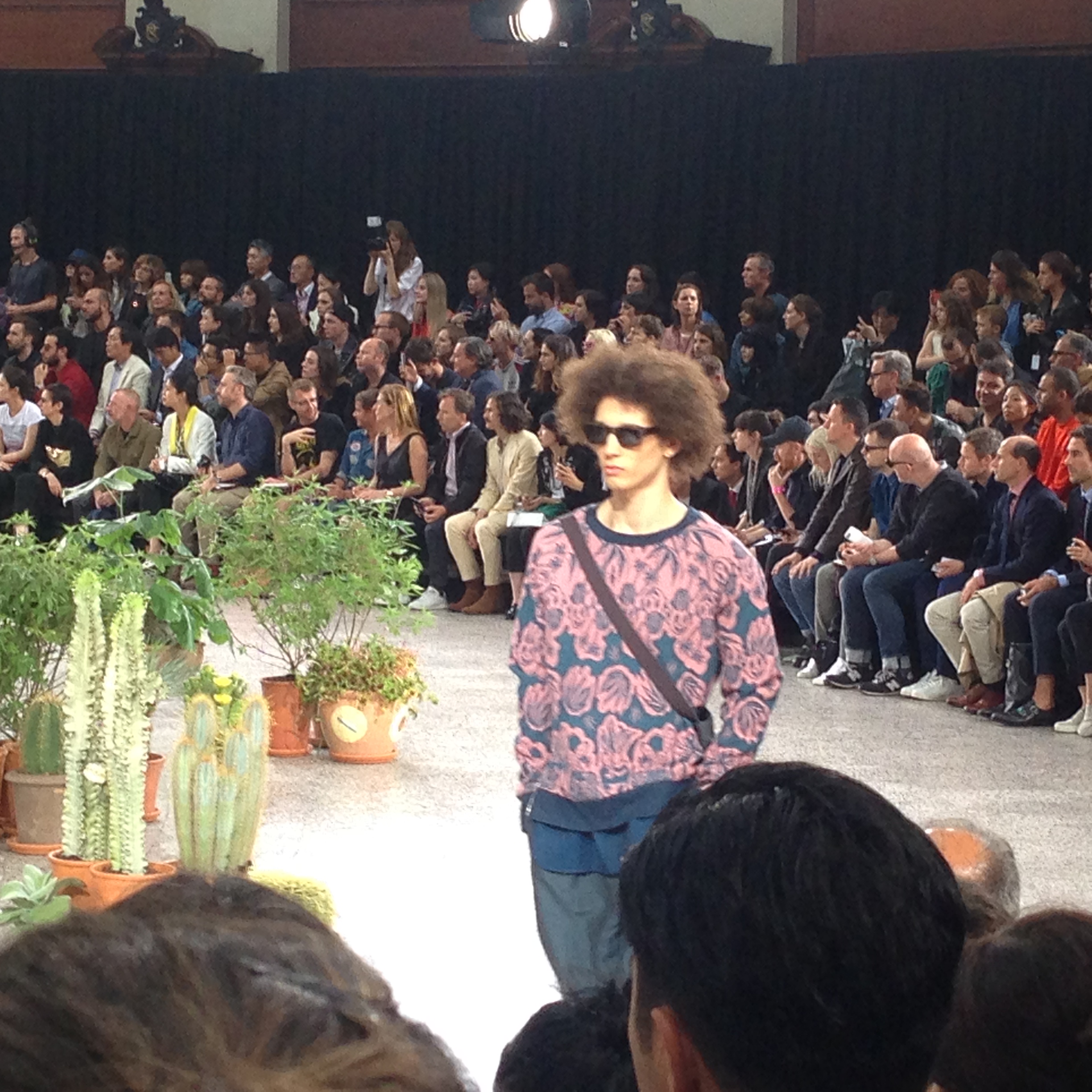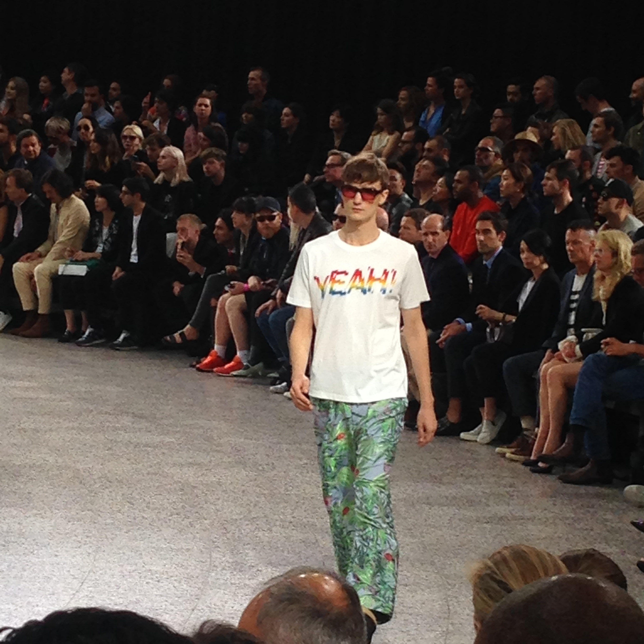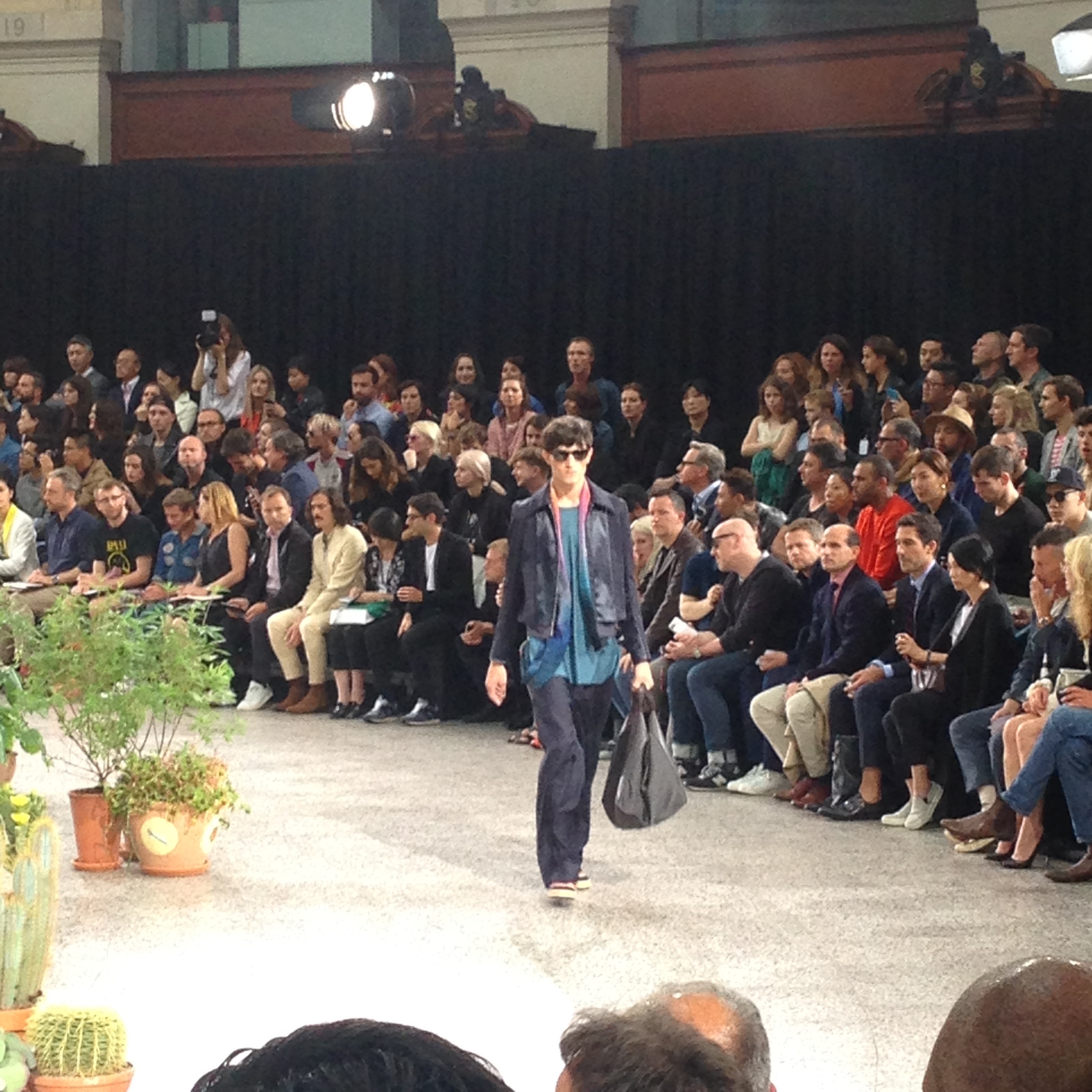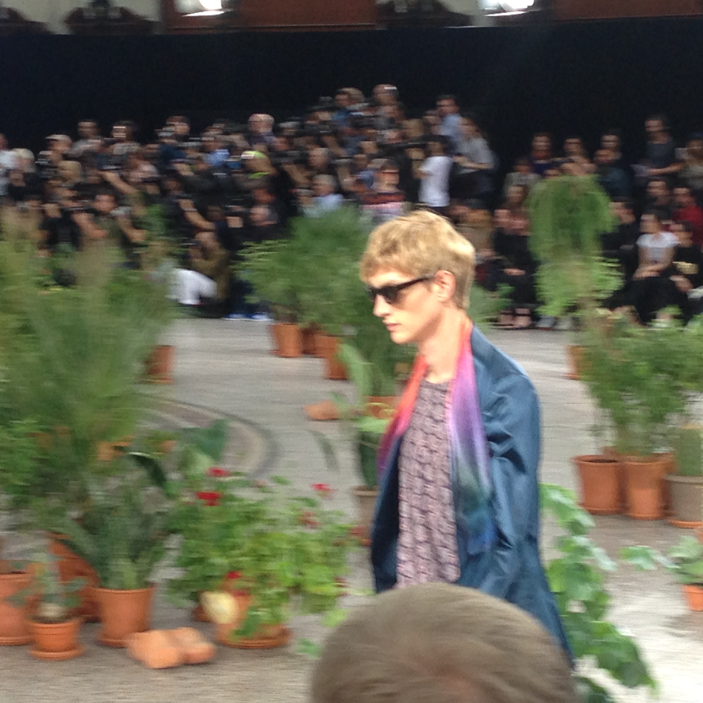 Paul Smith parsème des plantes de partout, en mise en scène, comme dans sa collection… pour mettre tout simplement du vert dans le vie de chacun. Paul Smith parsème la Bourse du Commerce à Paris de plantes, pour mettre du vert dans les vies de chacun. Cela se répercute dans le vestiaire par beaucoup de fluidité et de souplesse, dans les pantalons amples, les vestes légères portées comme des chemises, les tuniques à enfiler. Bien sûr on retrouve également quelques fleurs tropicales, et même des coccinelles et des bananes, en imprimés sur les pulls, sweats et accessoires. Les franges en cuir s’invitent sur quelques pièces ou autour du cou. Les tonalités de bleu dominent, Paul ajoute des rayures formant des dégradés de couleurs sur les tee-shirts, chemises et pulls en maille légère. Le sportswear est également présent dans la collection avec des bas de jogging, des zips sur le côté des sweats. Une garde-robe « easy », facile à porter, avec de bonnes vibrations ,nous donnant envie de conclure tout simplement avec le mot « yeah », exactement comme marqué sur le dernier tee-shirt qui clôture le show.