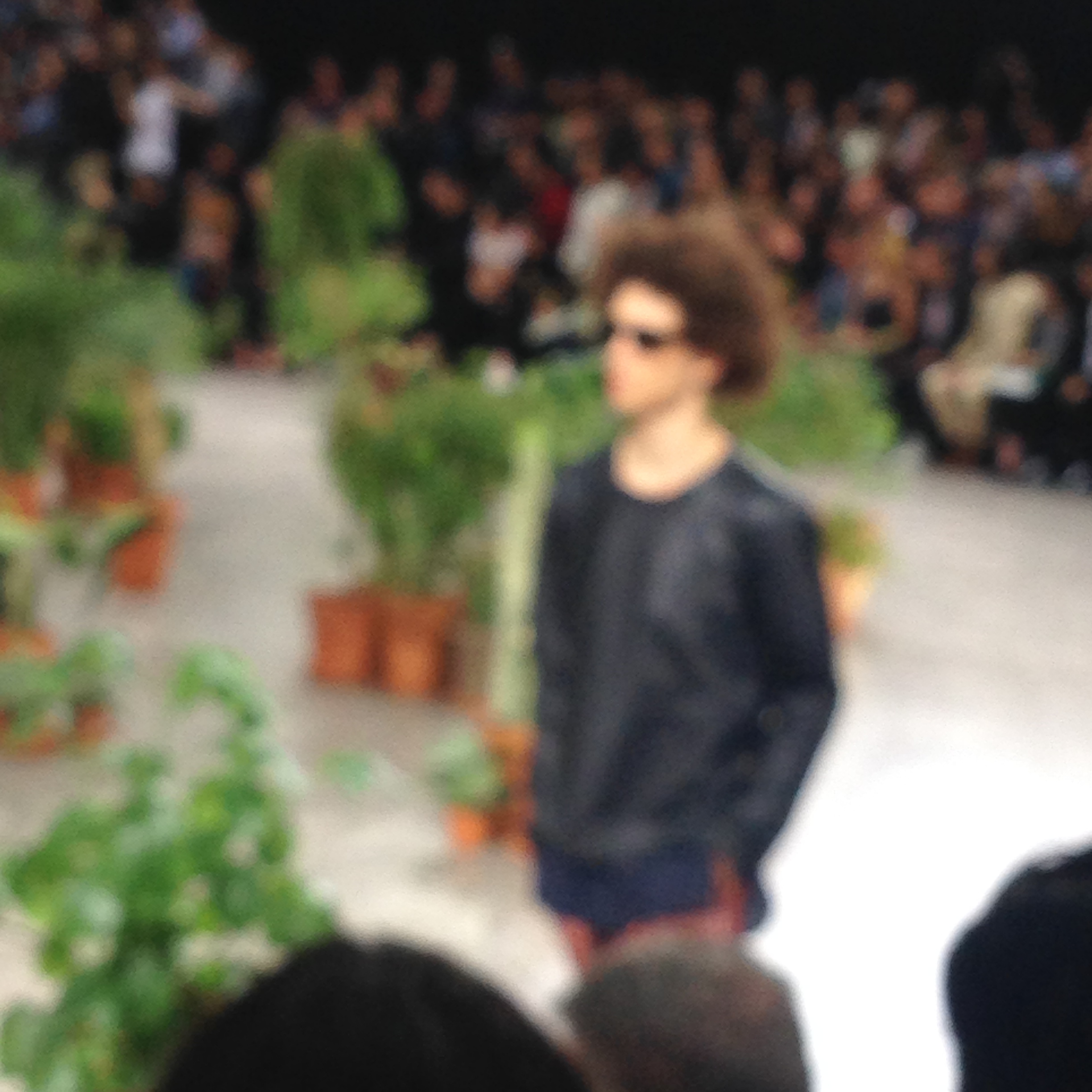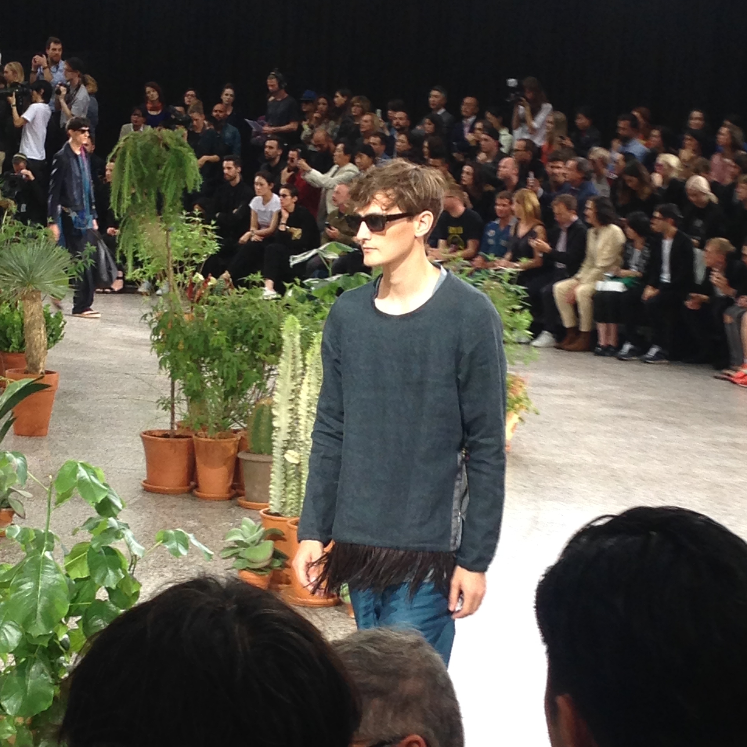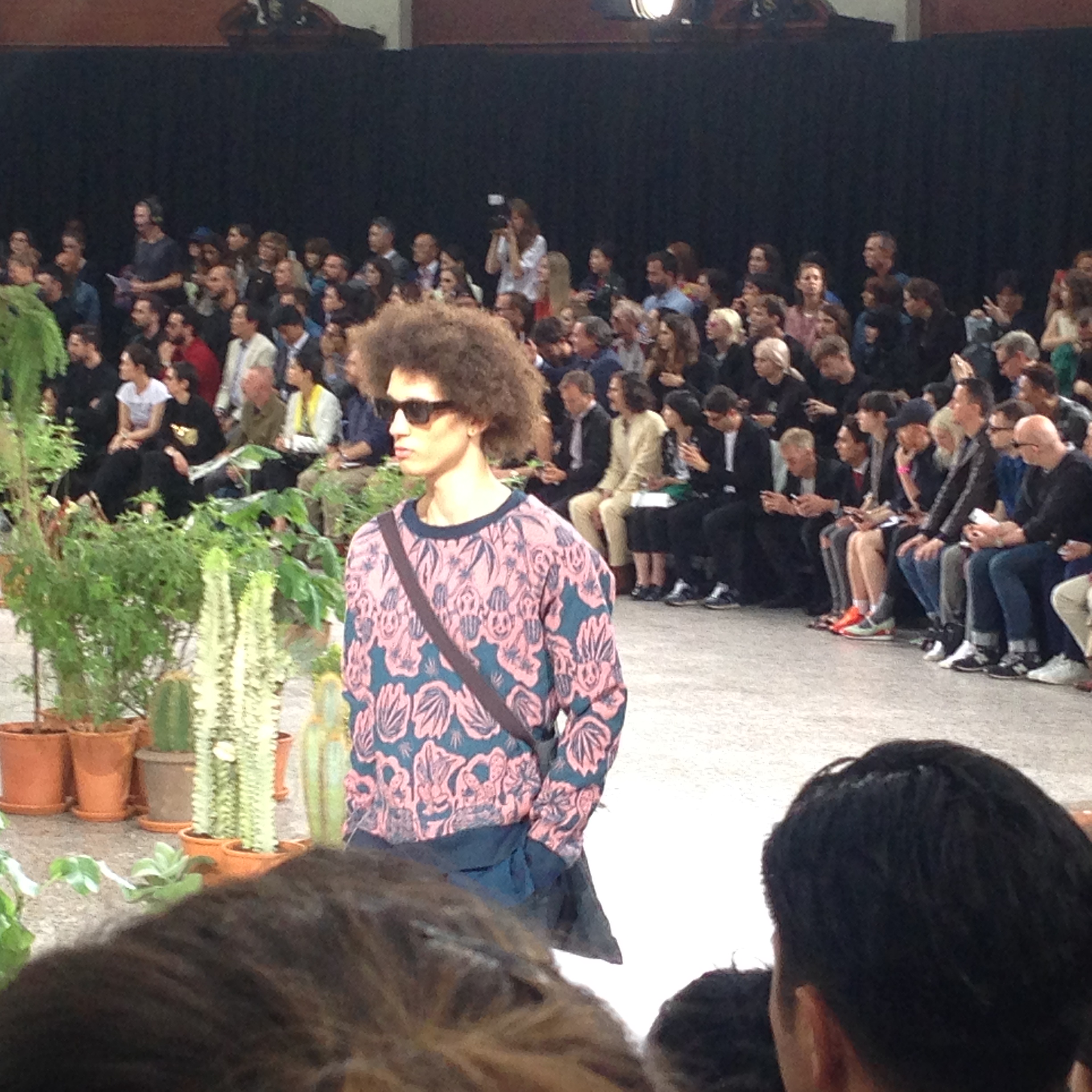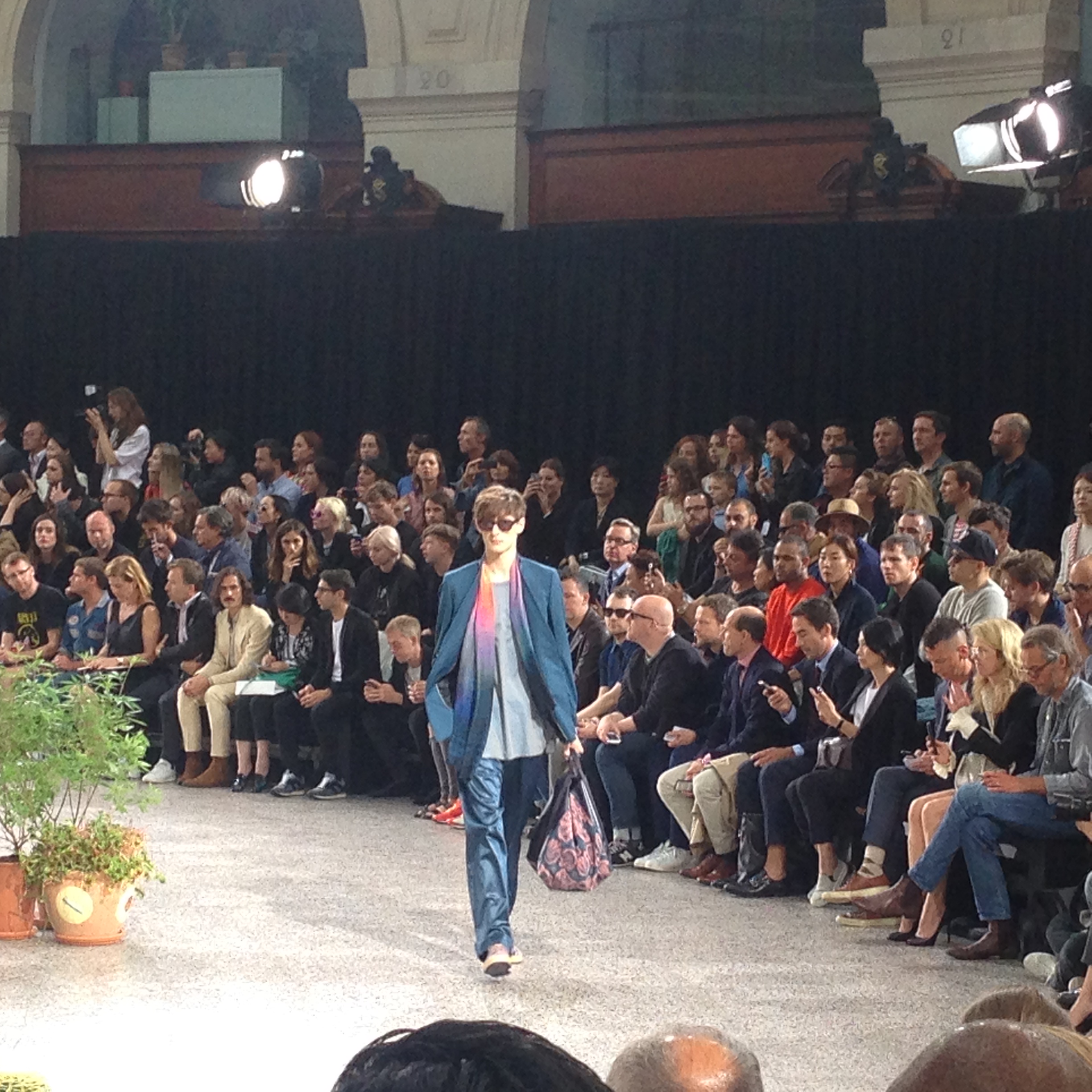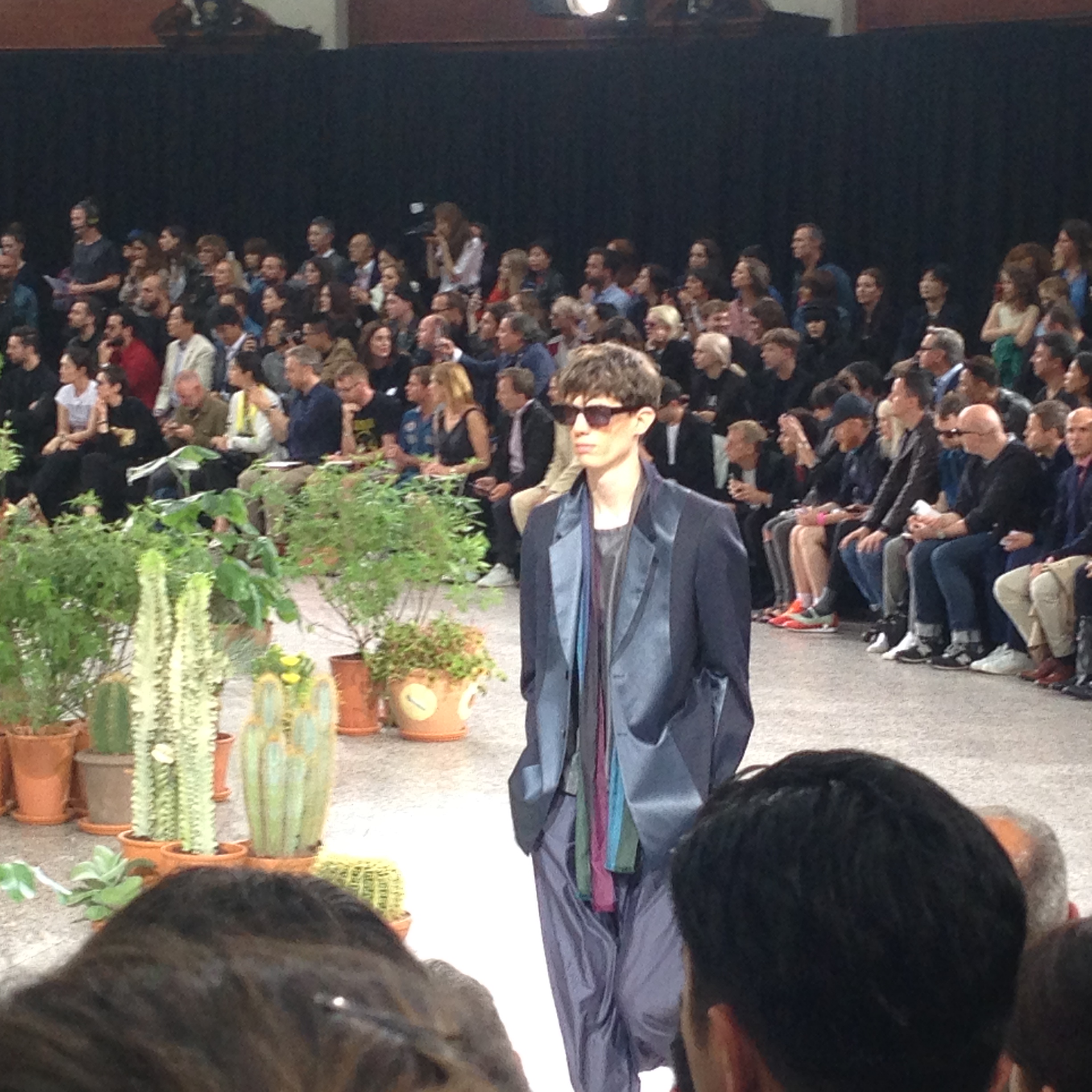 Paul Smith parsème des plantes de partout, en mise en scène, comme dans sa collection… pour mettre tout simplement du vert dans le vie de chacun. Paul Smith parsème la Bourse du Commerce à Paris de plantes, pour mettre du vert dans les vies de chacun. Cela se répercute dans le vestiaire par beaucoup de fluidité et de souplesse, dans les pantalons amples, les vestes légères portées comme des chemises, les tuniques à enfiler. Bien sûr on retrouve également quelques fleurs tropicales, et même des coccinelles et des bananes, en imprimés sur les pulls, sweats et accessoires. Les franges en cuir s’invitent sur quelques pièces ou autour du cou. Les tonalités de bleu dominent, Paul ajoute des rayures formant des dégradés de couleurs sur les tee-shirts, chemises et pulls en maille légère. Le sportswear est également présent dans la collection avec des bas de jogging, des zips sur le côté des sweats. Une garde-robe « easy », facile à porter, avec de bonnes vibrations ,nous donnant envie de conclure tout simplement avec le mot « yeah », exactement comme marqué sur le dernier tee-shirt qui clôture le show.
