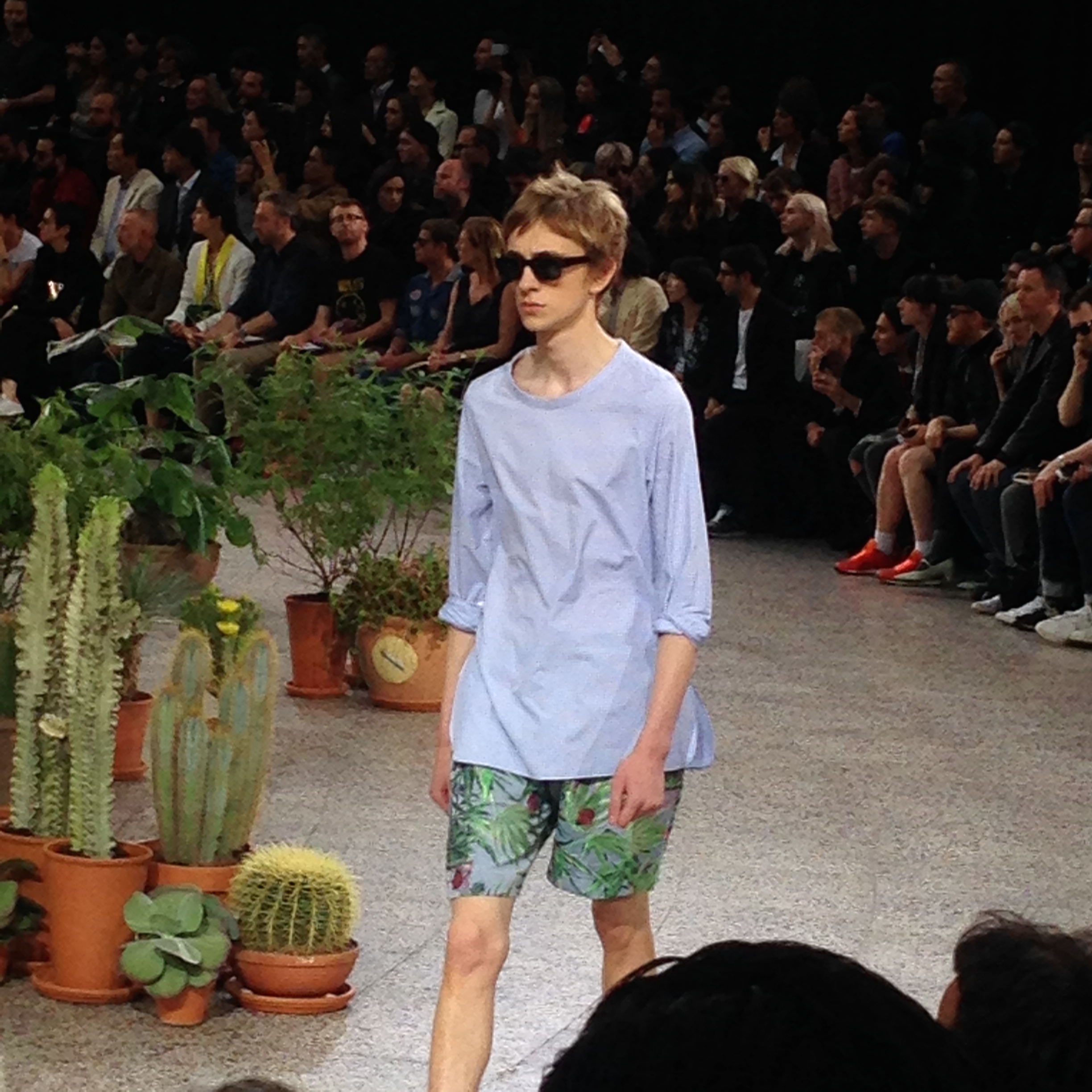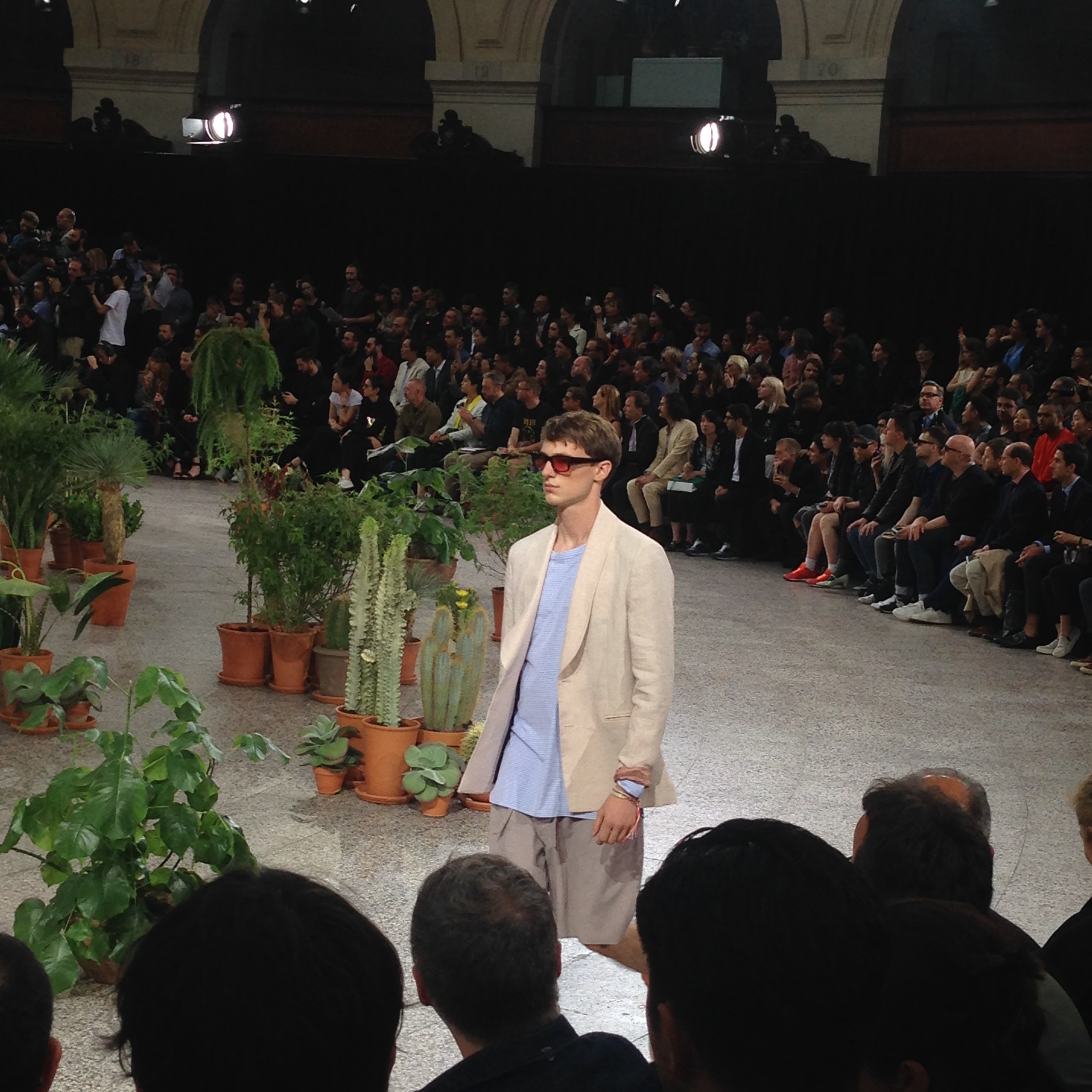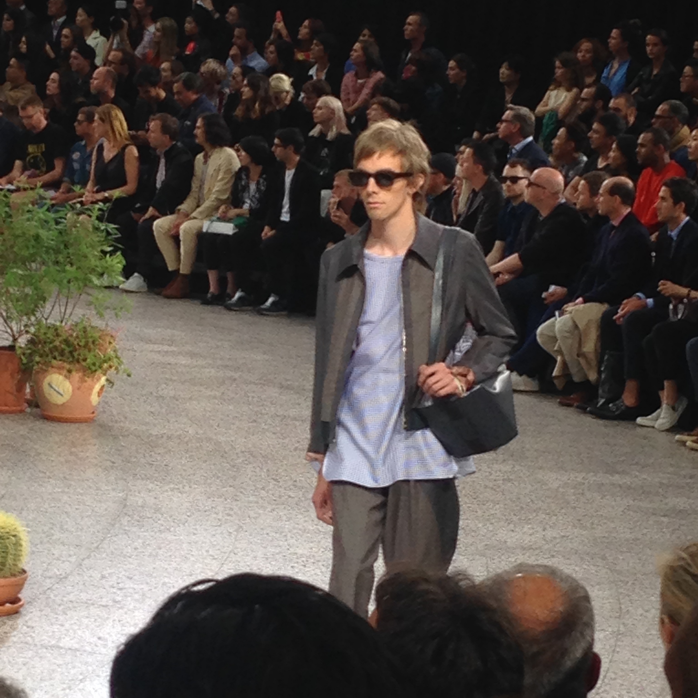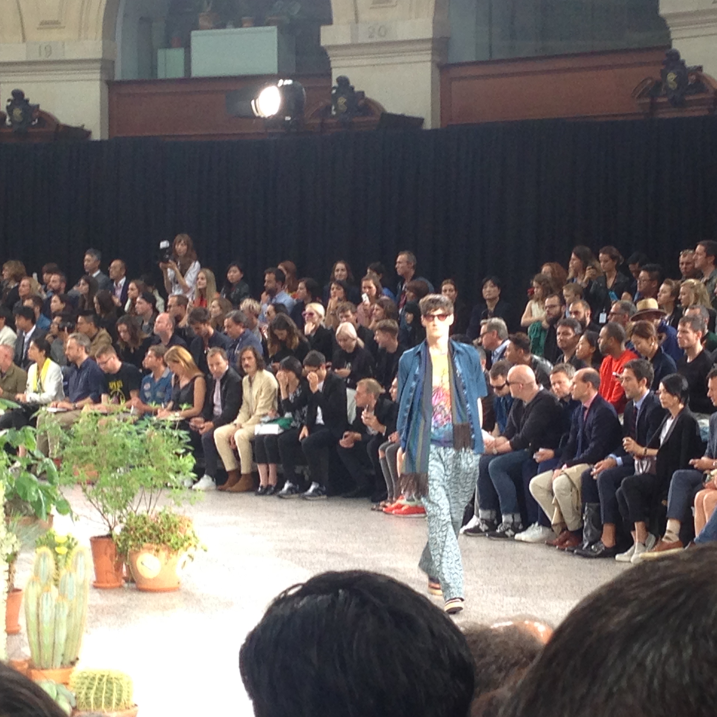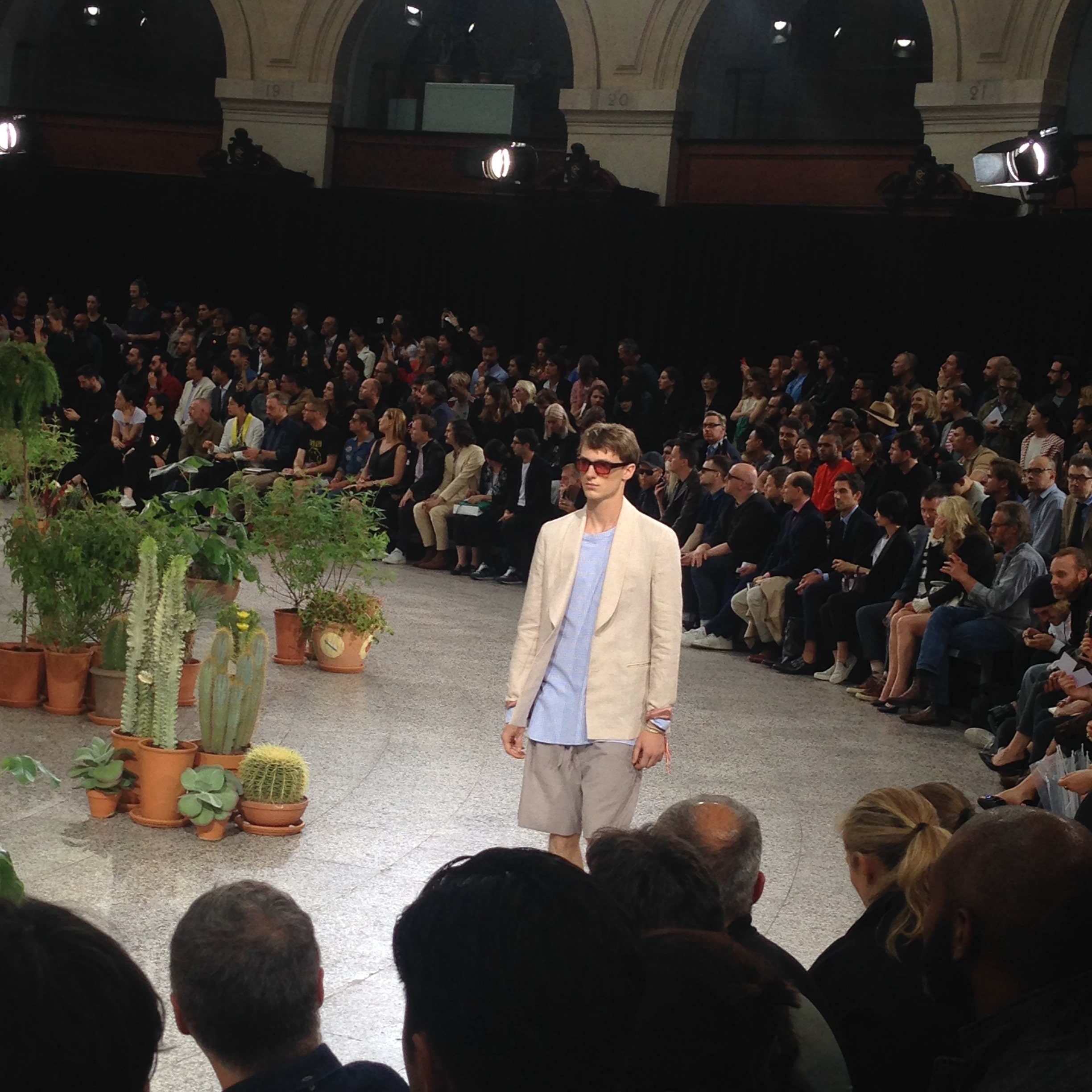 Paul Smith parsème des plantes de partout, en mise en scène, comme dans sa collection… pour mettre tout simplement du vert dans le vie de chacun. Paul Smith parsème la Bourse du Commerce à Paris de plantes, pour mettre du vert dans les vies de chacun. Cela se répercute dans le vestiaire par beaucoup de fluidité et de souplesse, dans les pantalons amples, les vestes légères portées comme des chemises, les tuniques à enfiler. Bien sûr on retrouve également quelques fleurs tropicales, et même des coccinelles et des bananes, en imprimés sur les pulls, sweats et accessoires. Les franges en cuir s’invitent sur quelques pièces ou autour du cou. Les tonalités de bleu dominent, Paul ajoute des rayures formant des dégradés de couleurs sur les tee-shirts, chemises et pulls en maille légère. Le sportswear est également présent dans la collection avec des bas de jogging, des zips sur le côté des sweats. Une garde-robe « easy », facile à porter, avec de bonnes vibrations ,nous donnant envie de conclure tout simplement avec le mot « yeah », exactement comme marqué sur le dernier tee-shirt qui clôture le show.
