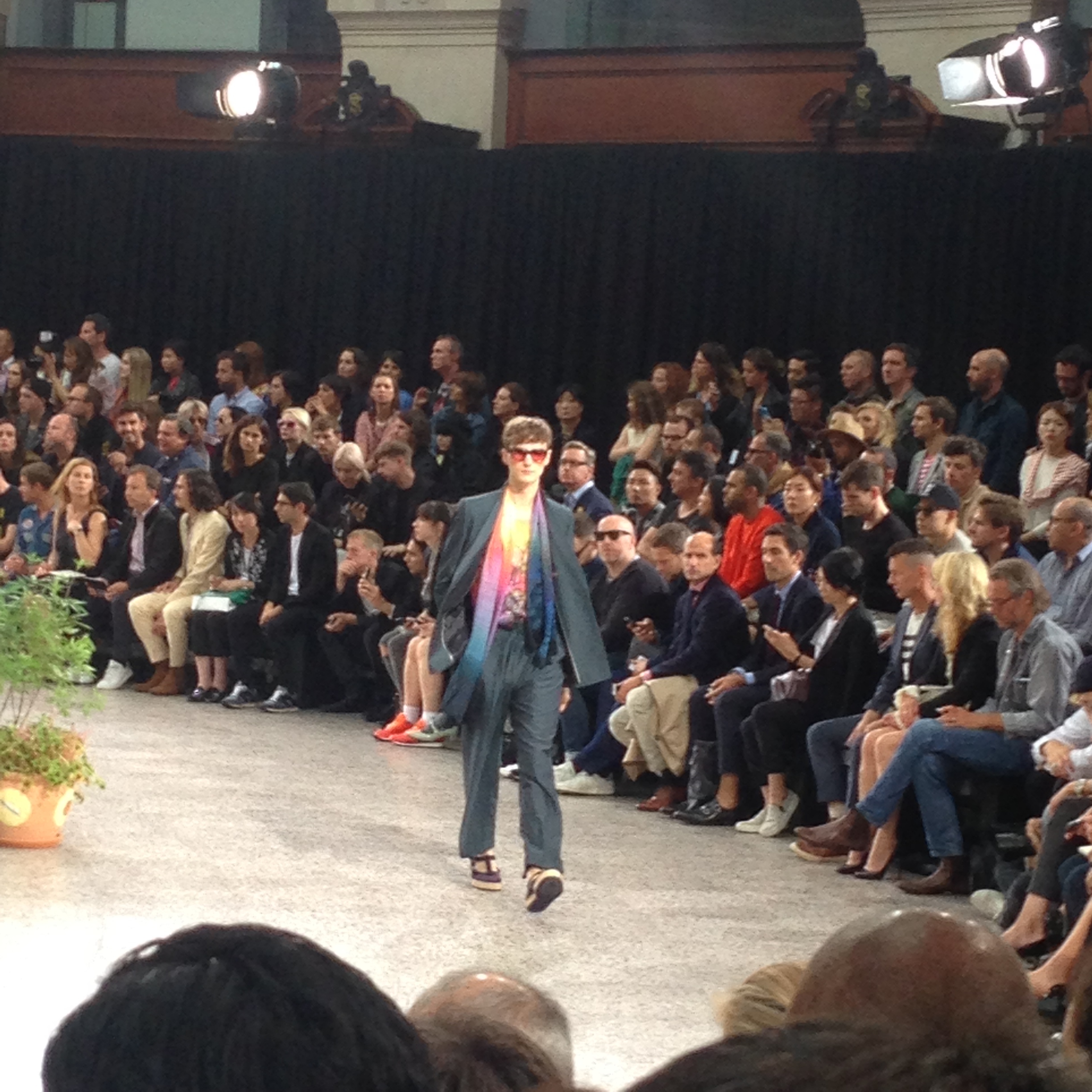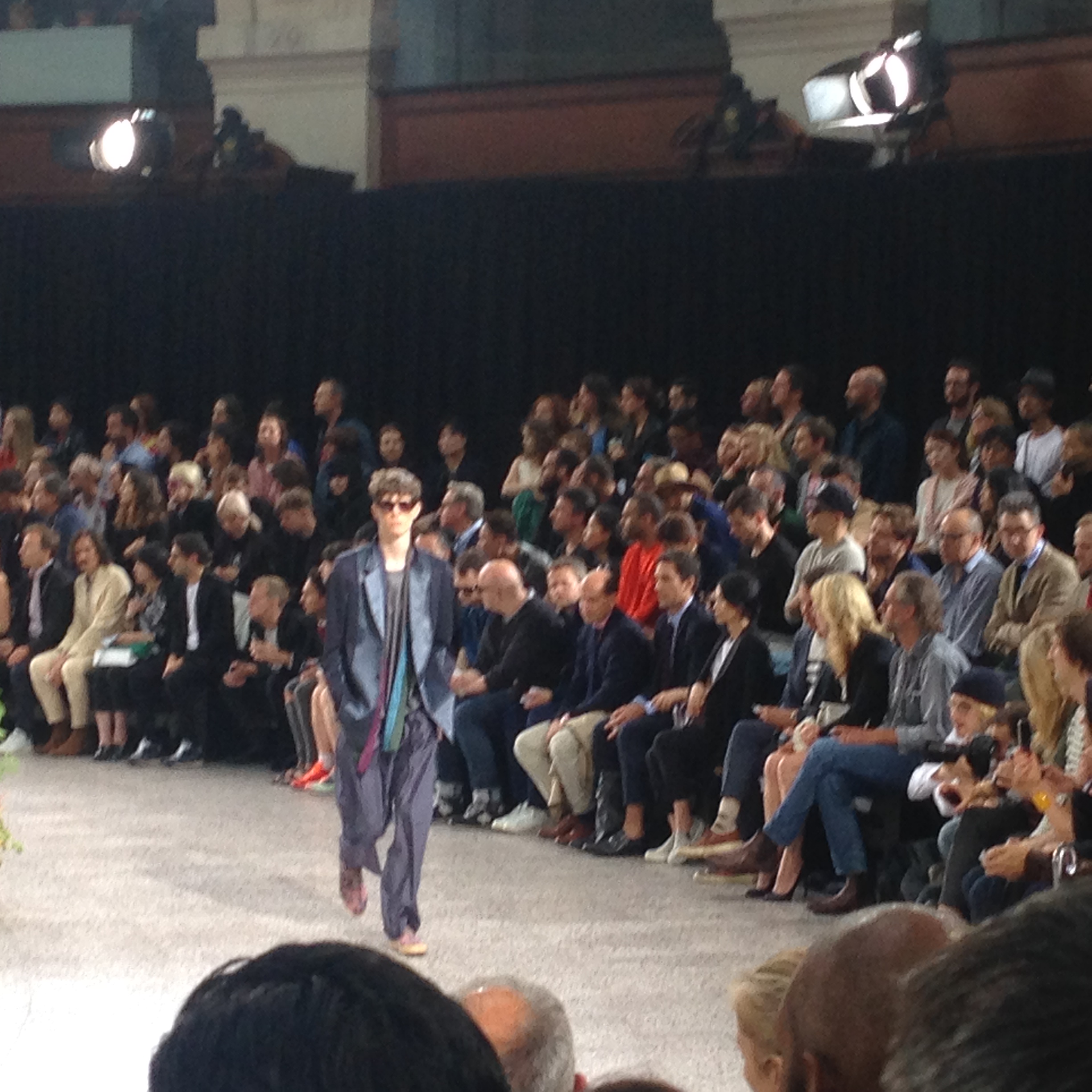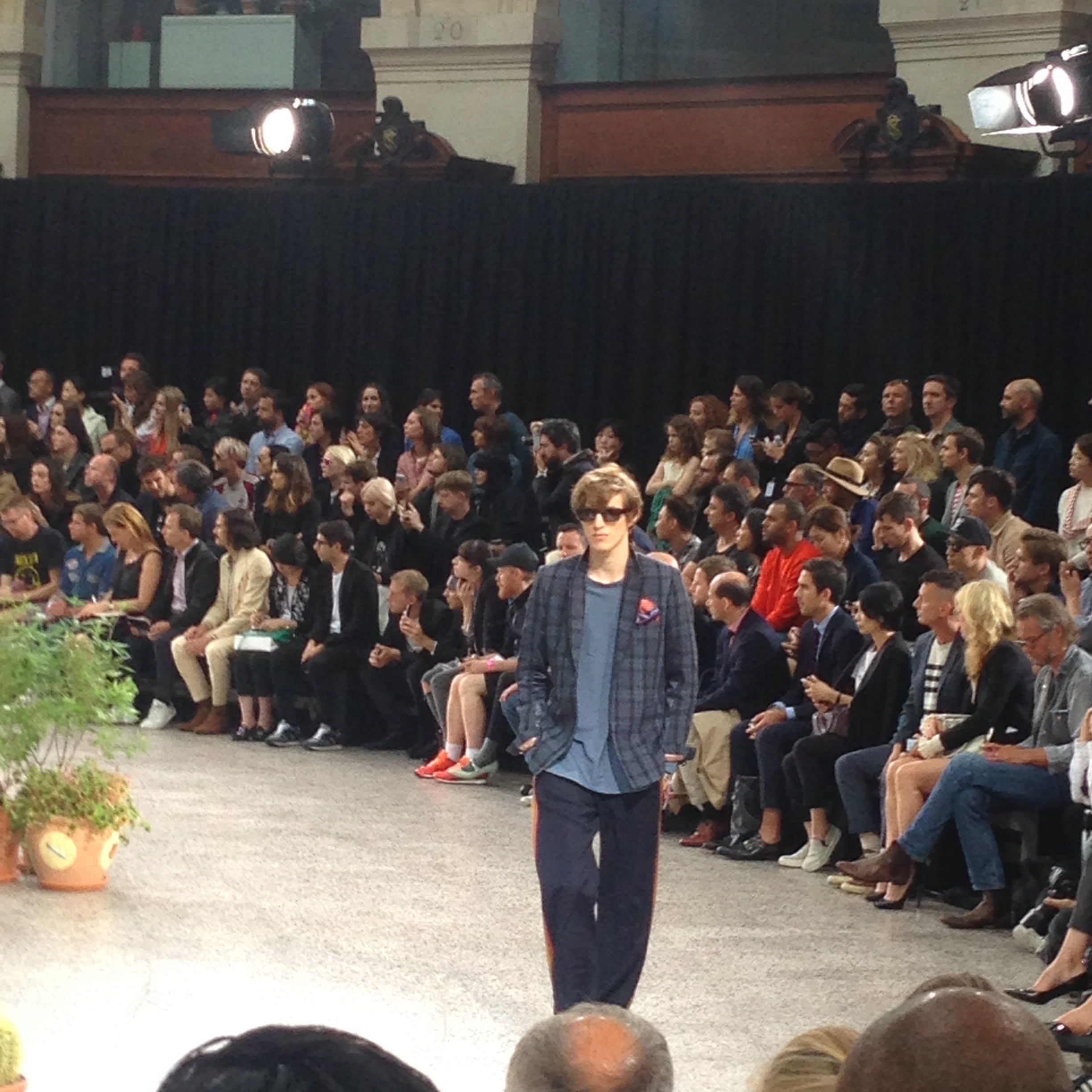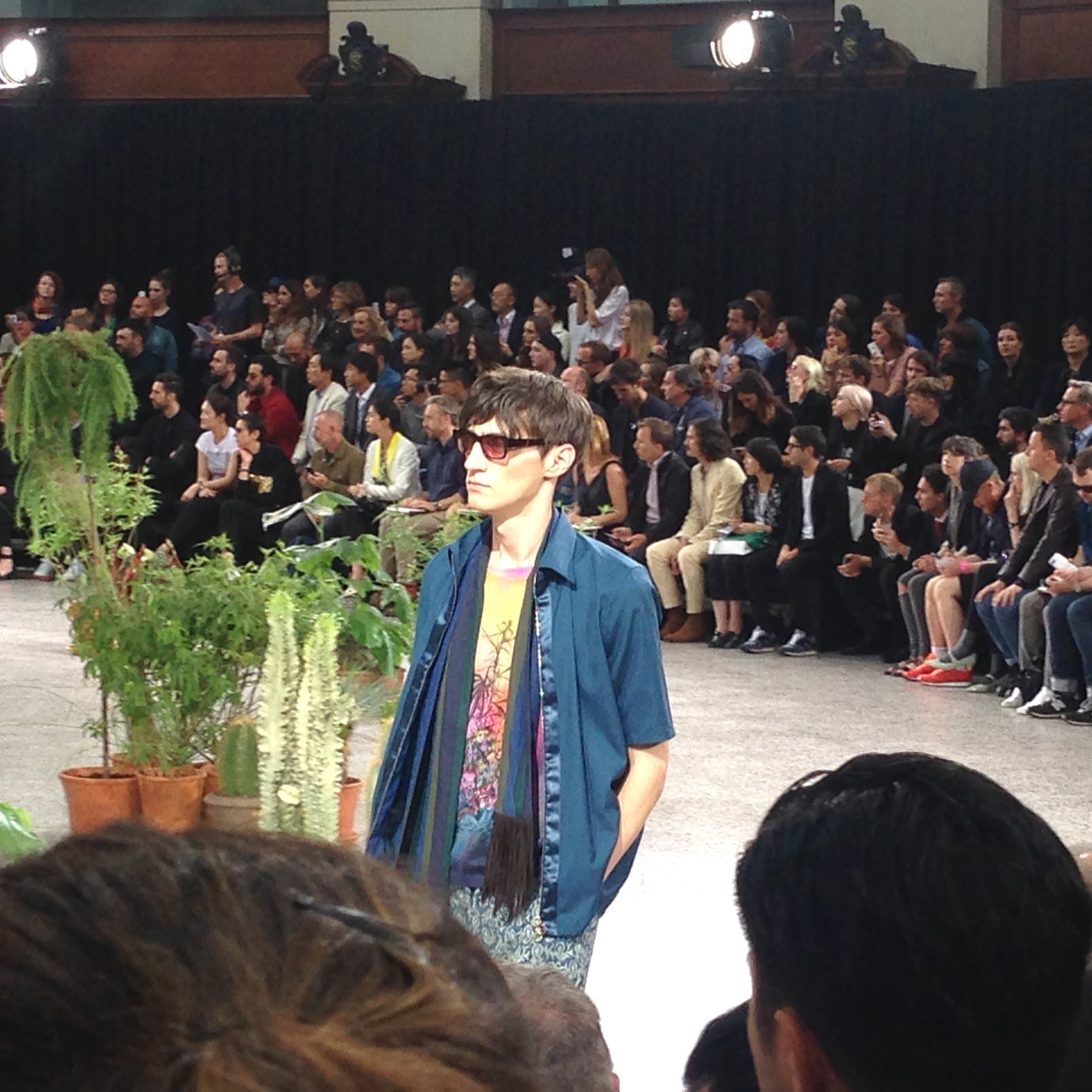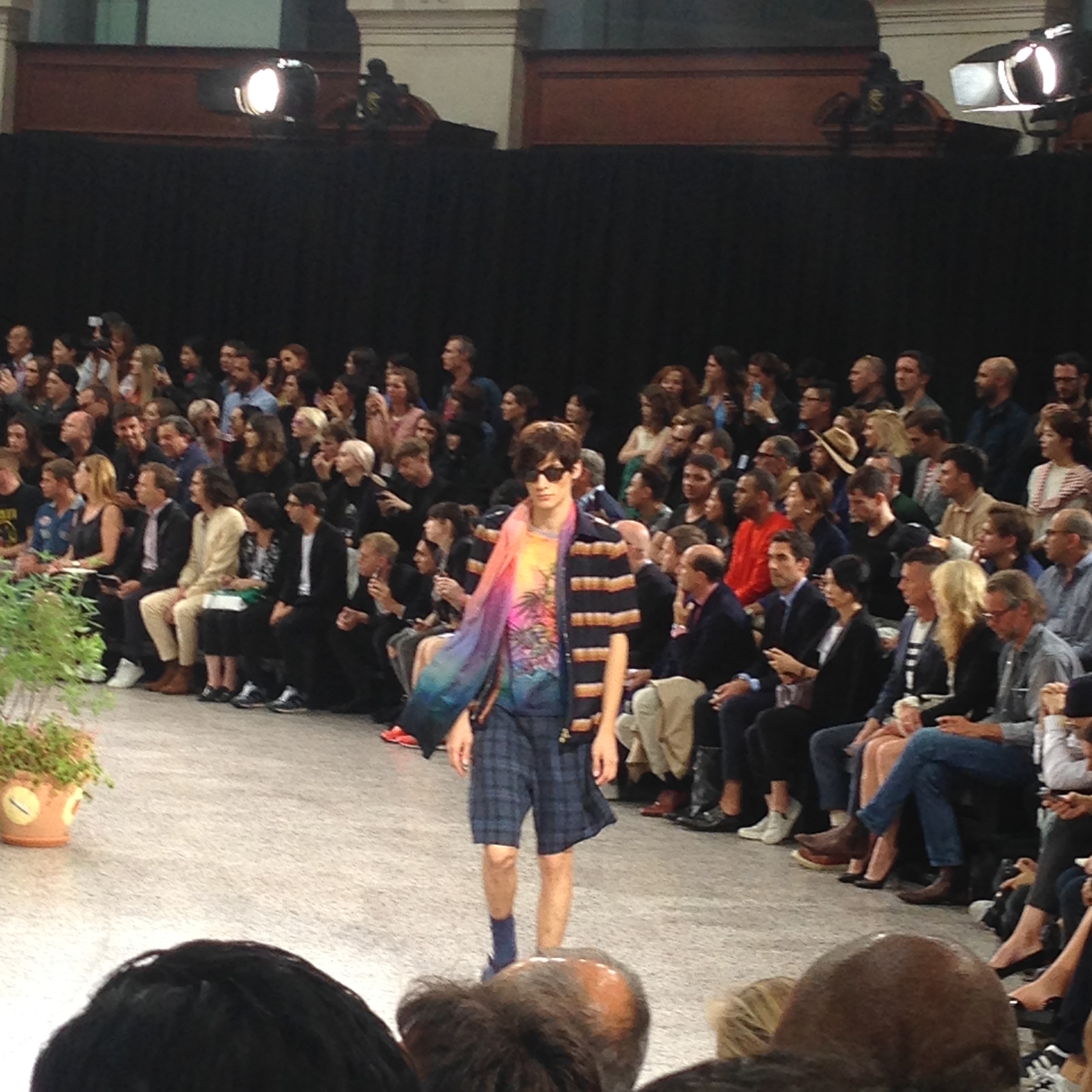 Paul Smith parsème des plantes de partout, en mise en scène, comme dans sa collection… pour mettre tout simplement du vert dans le vie de chacun. Paul Smith parsème la Bourse du Commerce à Paris de plantes, pour mettre du vert dans les vies de chacun. Cela se répercute dans le vestiaire par beaucoup de fluidité et de souplesse, dans les pantalons amples, les vestes légères portées comme des chemises, les tuniques à enfiler. Bien sûr on retrouve également quelques fleurs tropicales, et même des coccinelles et des bananes, en imprimés sur les pulls, sweats et accessoires. Les franges en cuir s’invitent sur quelques pièces ou autour du cou. Les tonalités de bleu dominent, Paul ajoute des rayures formant des dégradés de couleurs sur les tee-shirts, chemises et pulls en maille légère. Le sportswear est également présent dans la collection avec des bas de jogging, des zips sur le côté des sweats. Une garde-robe « easy », facile à porter, avec de bonnes vibrations ,nous donnant envie de conclure tout simplement avec le mot « yeah », exactement comme marqué sur le dernier tee-shirt qui clôture le show.