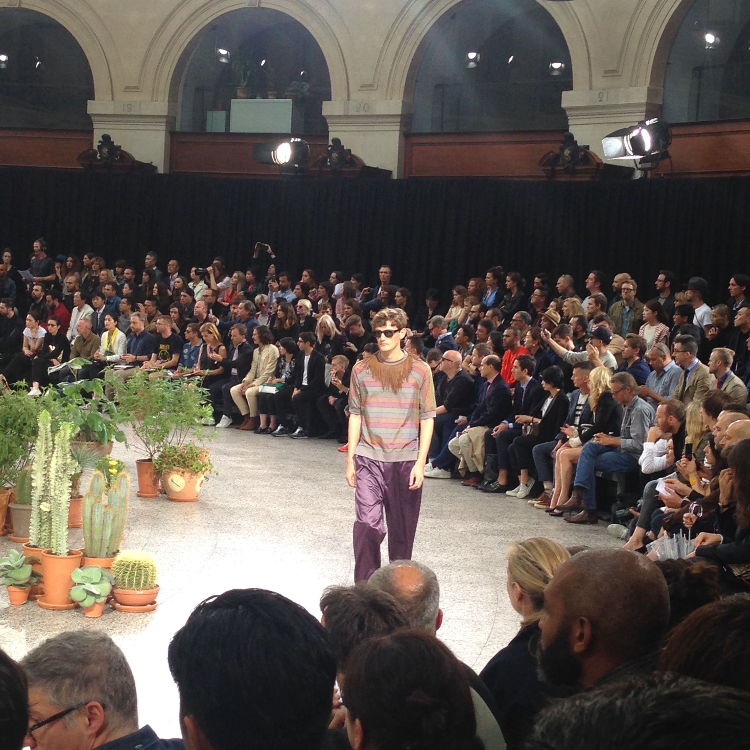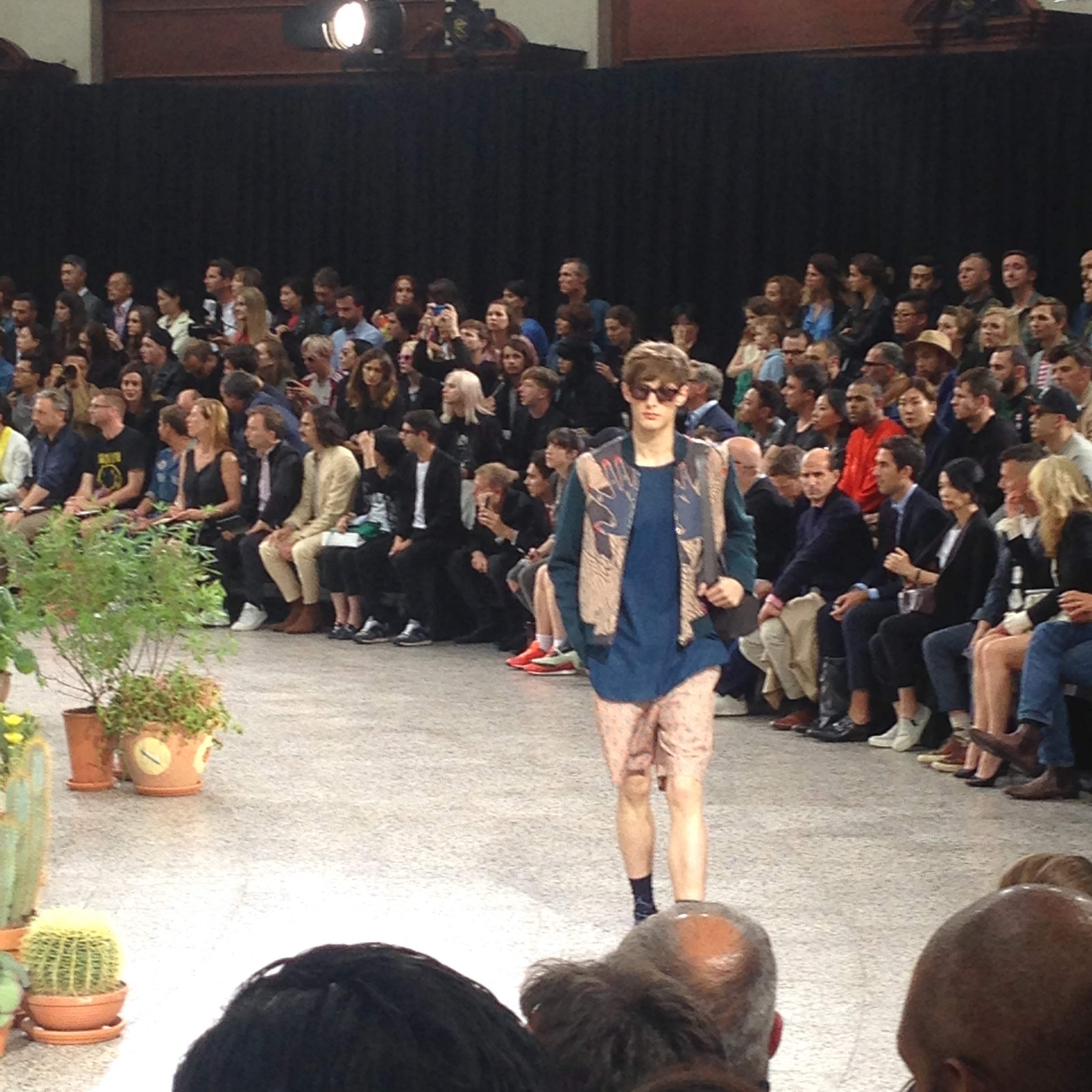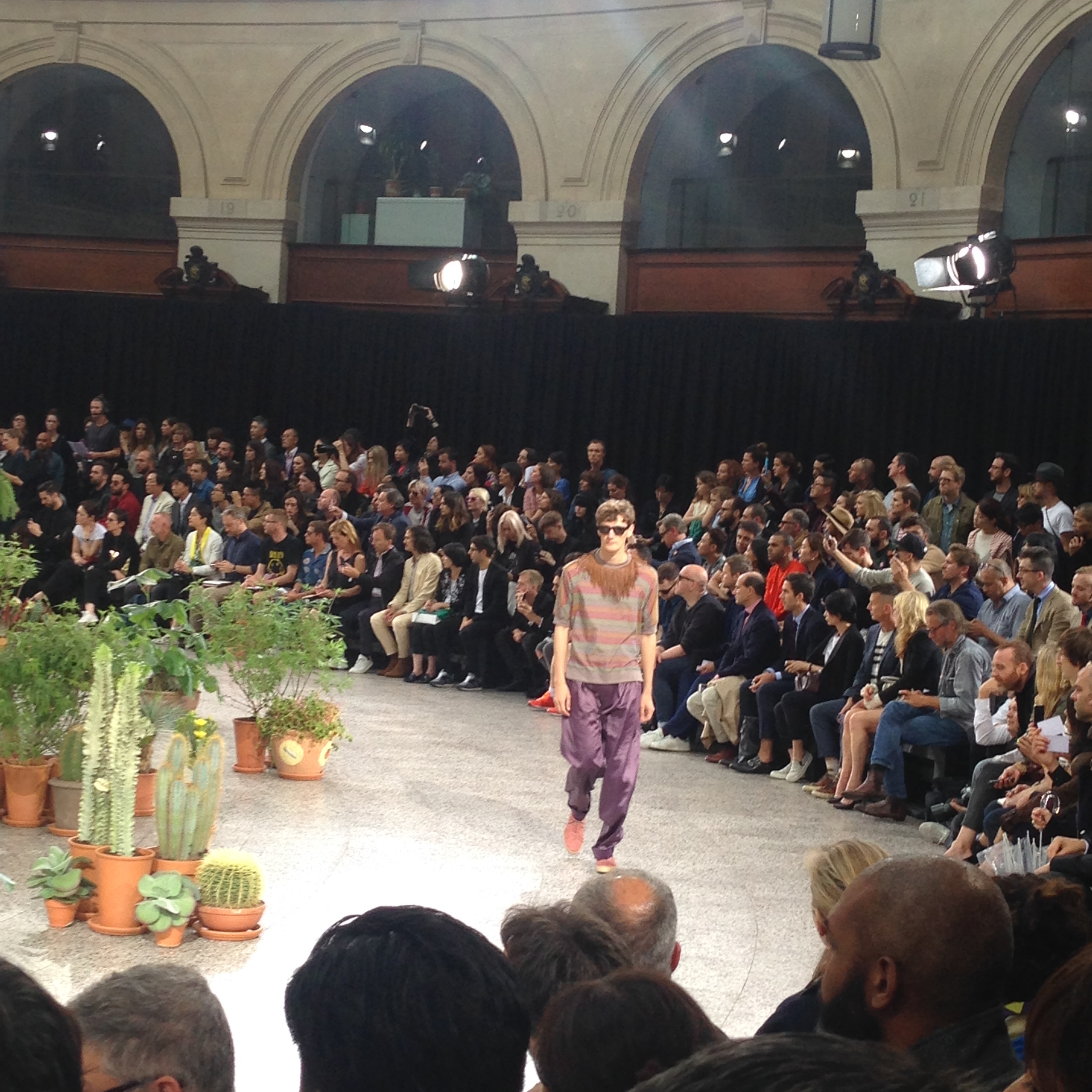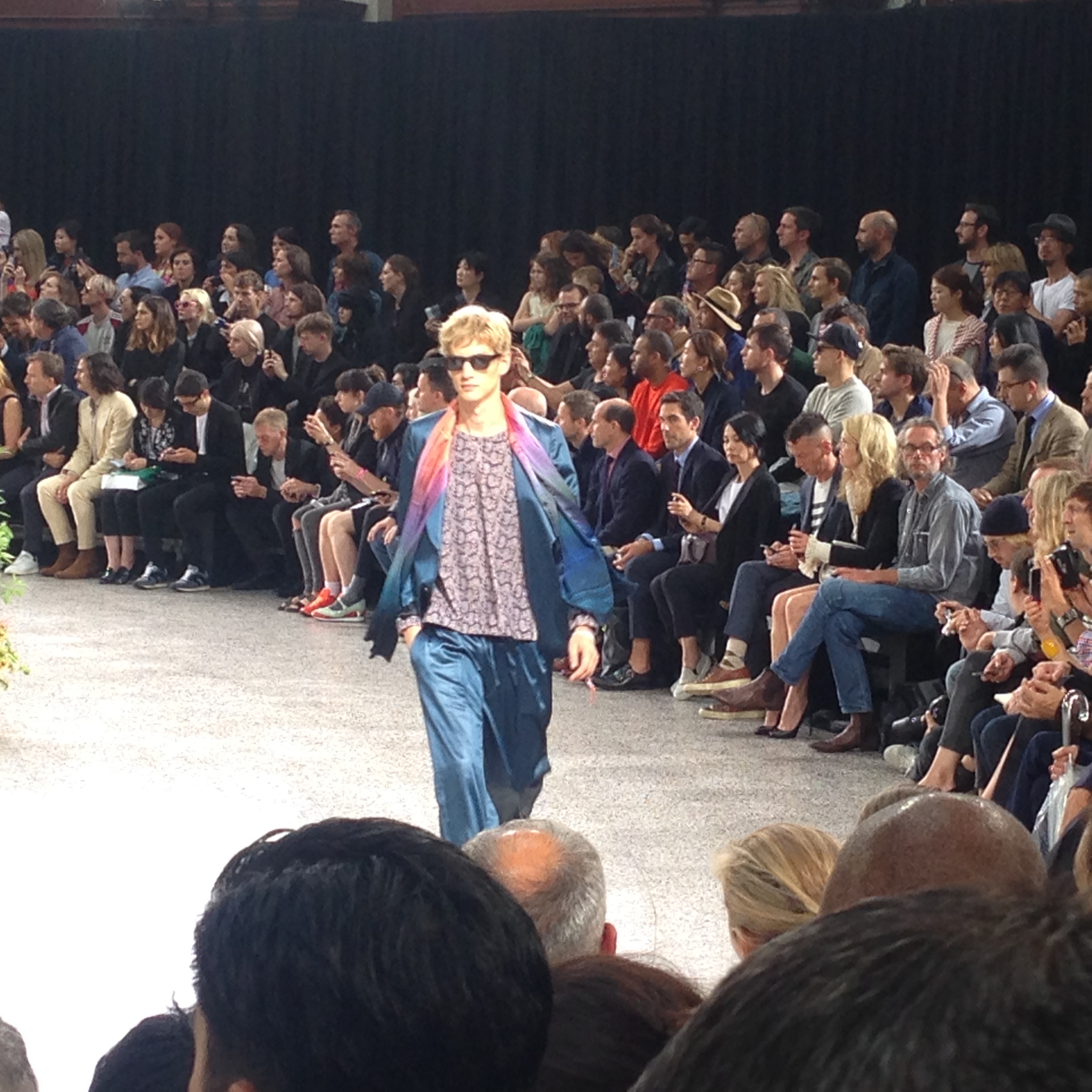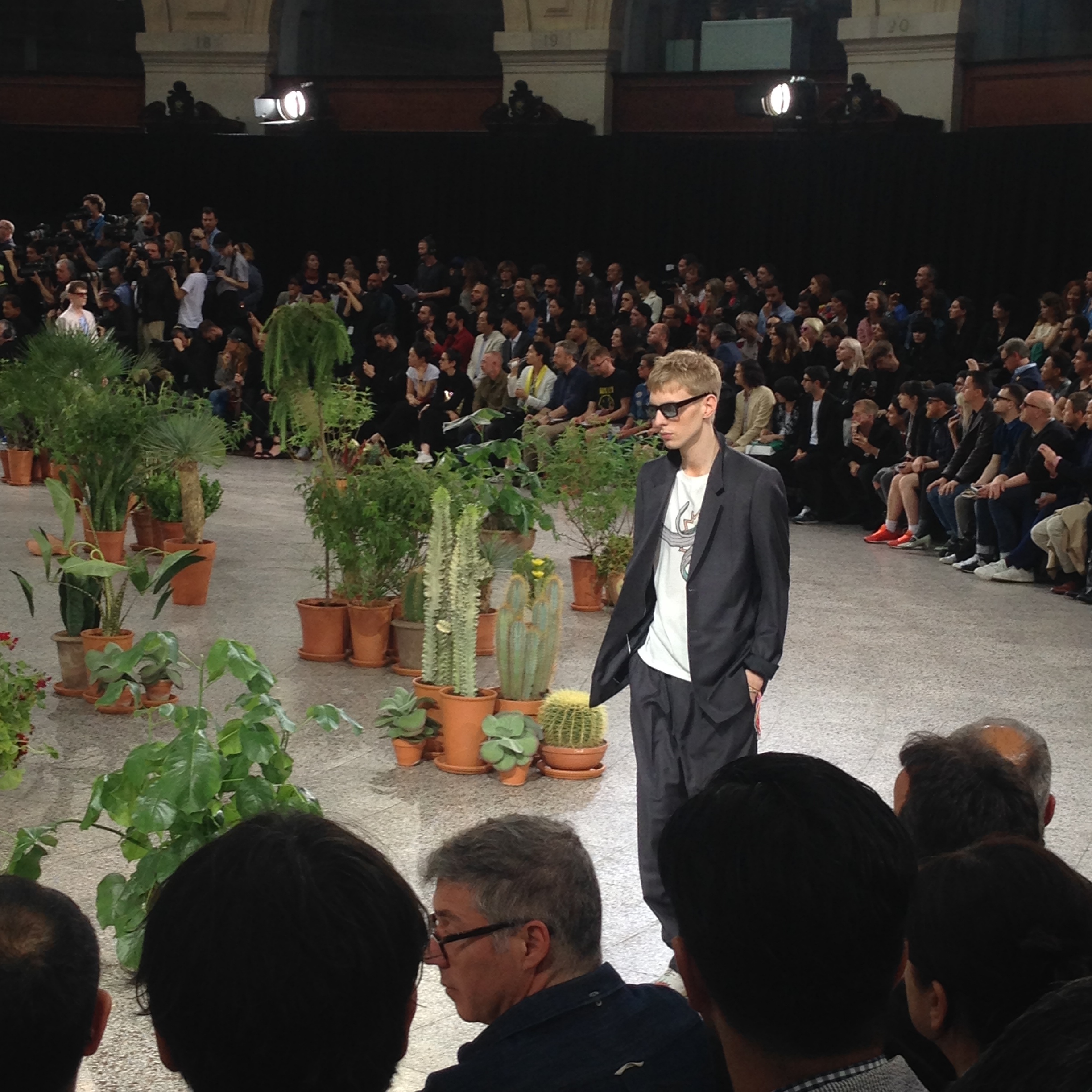 Paul Smith parsème des plantes de partout, en mise en scène, comme dans sa collection… pour mettre tout simplement du vert dans le vie de chacun. Paul Smith parsème la Bourse du Commerce à Paris de plantes, pour mettre du vert dans les vies de chacun. Cela se répercute dans le vestiaire par beaucoup de fluidité et de souplesse, dans les pantalons amples, les vestes légères portées comme des chemises, les tuniques à enfiler. Bien sûr on retrouve également quelques fleurs tropicales, et même des coccinelles et des bananes, en imprimés sur les pulls, sweats et accessoires. Les franges en cuir s’invitent sur quelques pièces ou autour du cou. Les tonalités de bleu dominent, Paul ajoute des rayures formant des dégradés de couleurs sur les tee-shirts, chemises et pulls en maille légère. Le sportswear est également présent dans la collection avec des bas de jogging, des zips sur le côté des sweats. Une garde-robe « easy », facile à porter, avec de bonnes vibrations ,nous donnant envie de conclure tout simplement avec le mot « yeah », exactement comme marqué sur le dernier tee-shirt qui clôture le show.