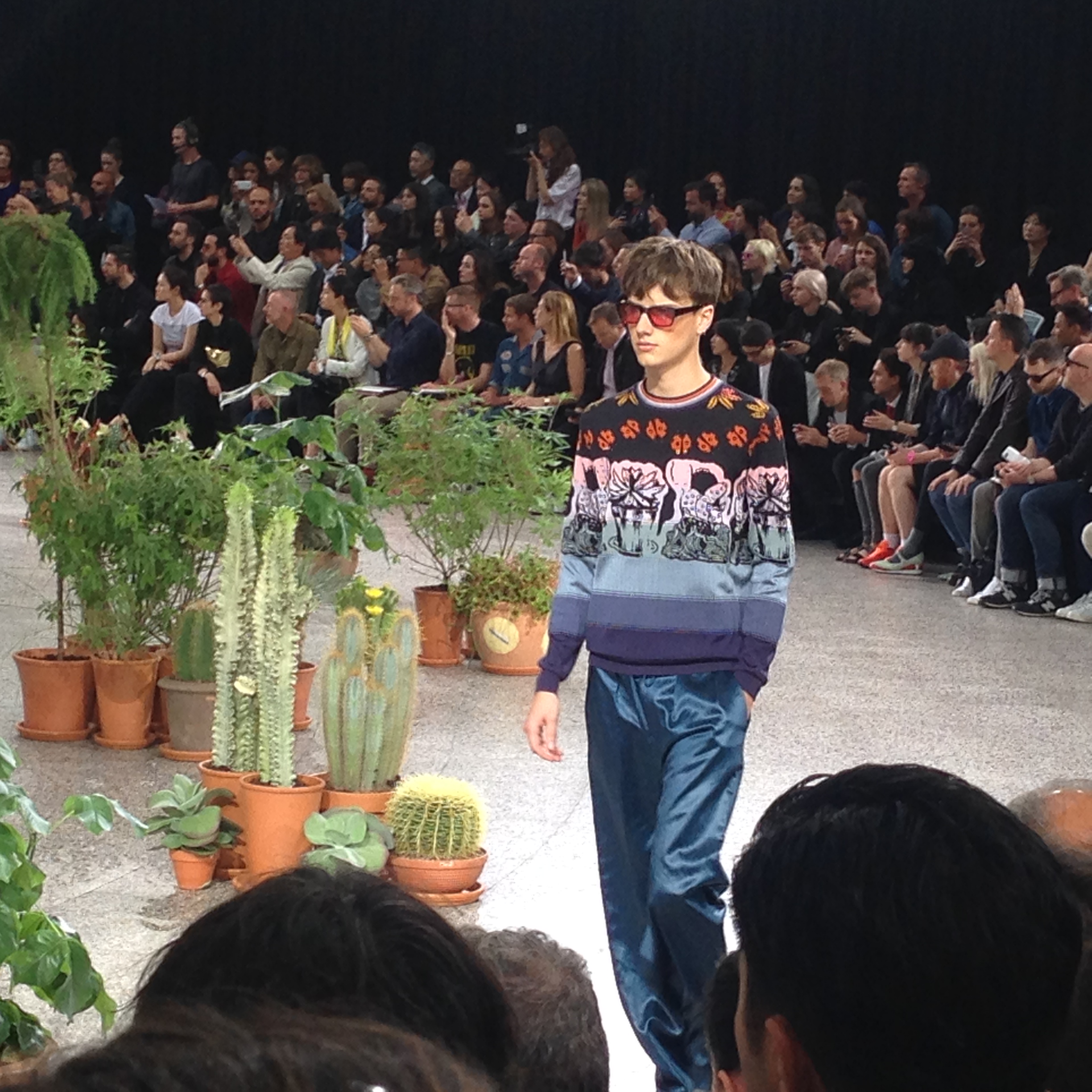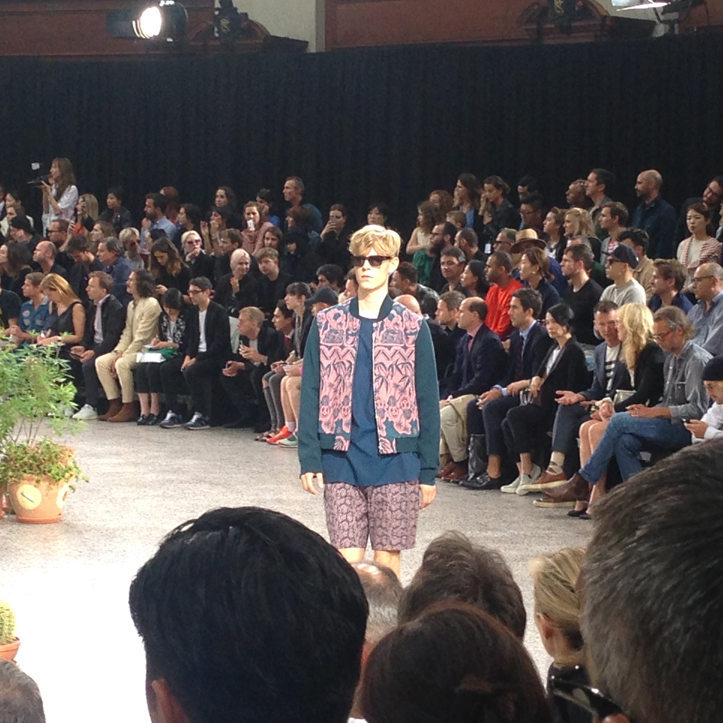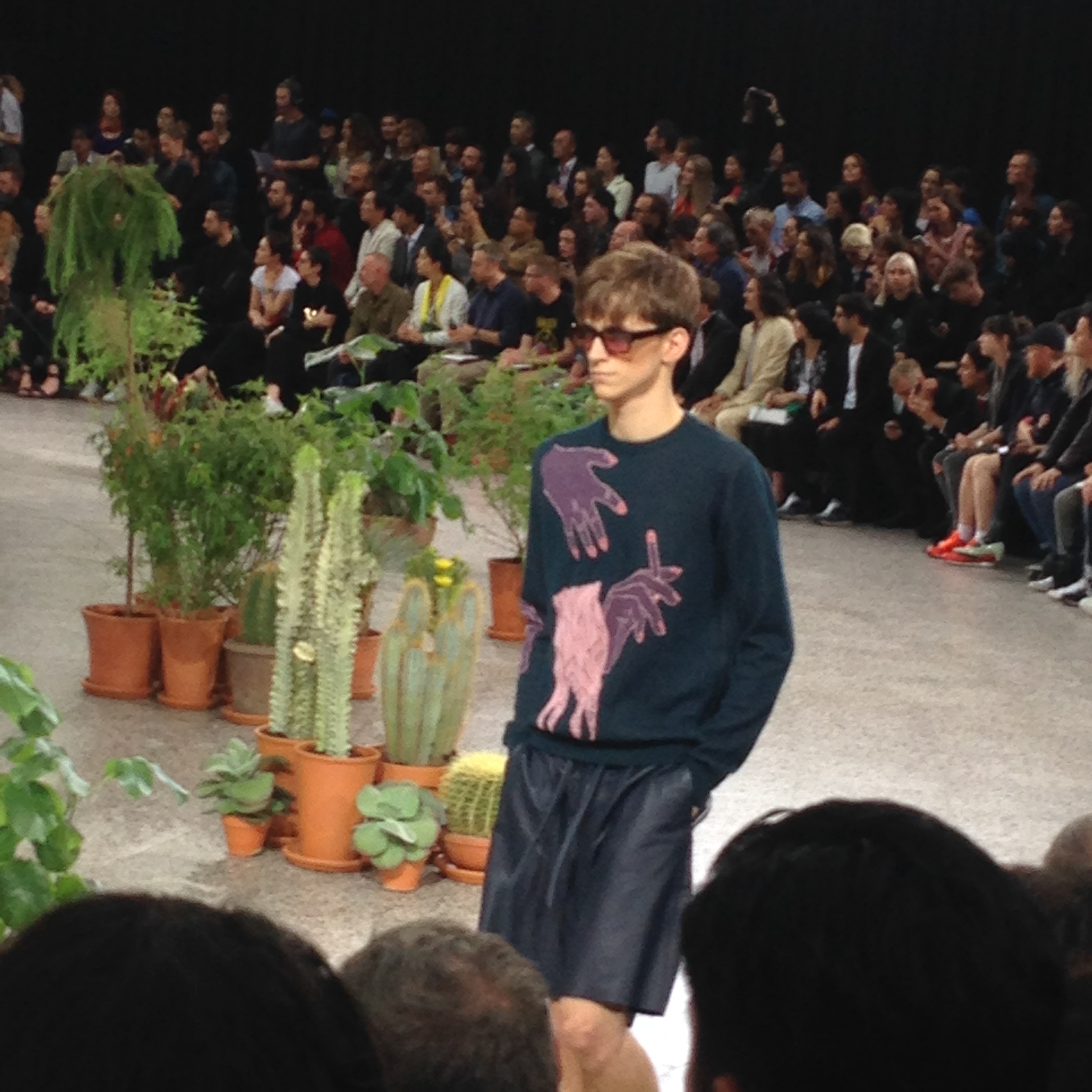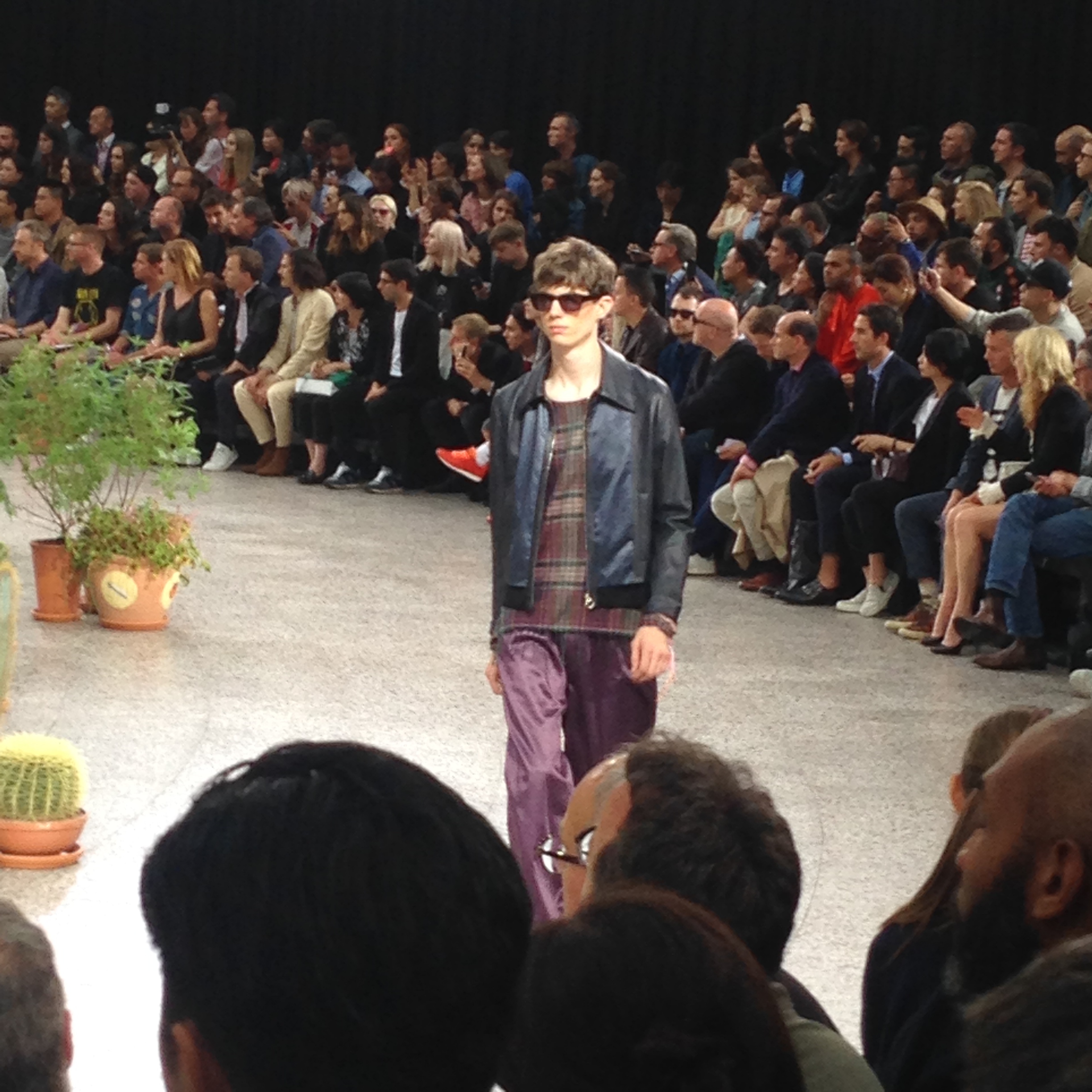 Paul Smith parsème des plantes de partout, en mise en scène, comme dans sa collection… pour mettre tout simplement du vert dans le vie de chacun. Paul Smith parsème la Bourse du Commerce à Paris de plantes, pour mettre du vert dans les vies de chacun. Cela se répercute dans le vestiaire par beaucoup de fluidité et de souplesse, dans les pantalons amples, les vestes légères portées comme des chemises, les tuniques à enfiler. Bien sûr on retrouve également quelques fleurs tropicales, et même des coccinelles et des bananes, en imprimés sur les pulls, sweats et accessoires. Les franges en cuir s’invitent sur quelques pièces ou autour du cou. Les tonalités de bleu dominent, Paul ajoute des rayures formant des dégradés de couleurs sur les tee-shirts, chemises et pulls en maille légère. Le sportswear est également présent dans la collection avec des bas de jogging, des zips sur le côté des sweats. Une garde-robe « easy », facile à porter, avec de bonnes vibrations ,nous donnant envie de conclure tout simplement avec le mot « yeah », exactement comme marqué sur le dernier tee-shirt qui clôture le show.